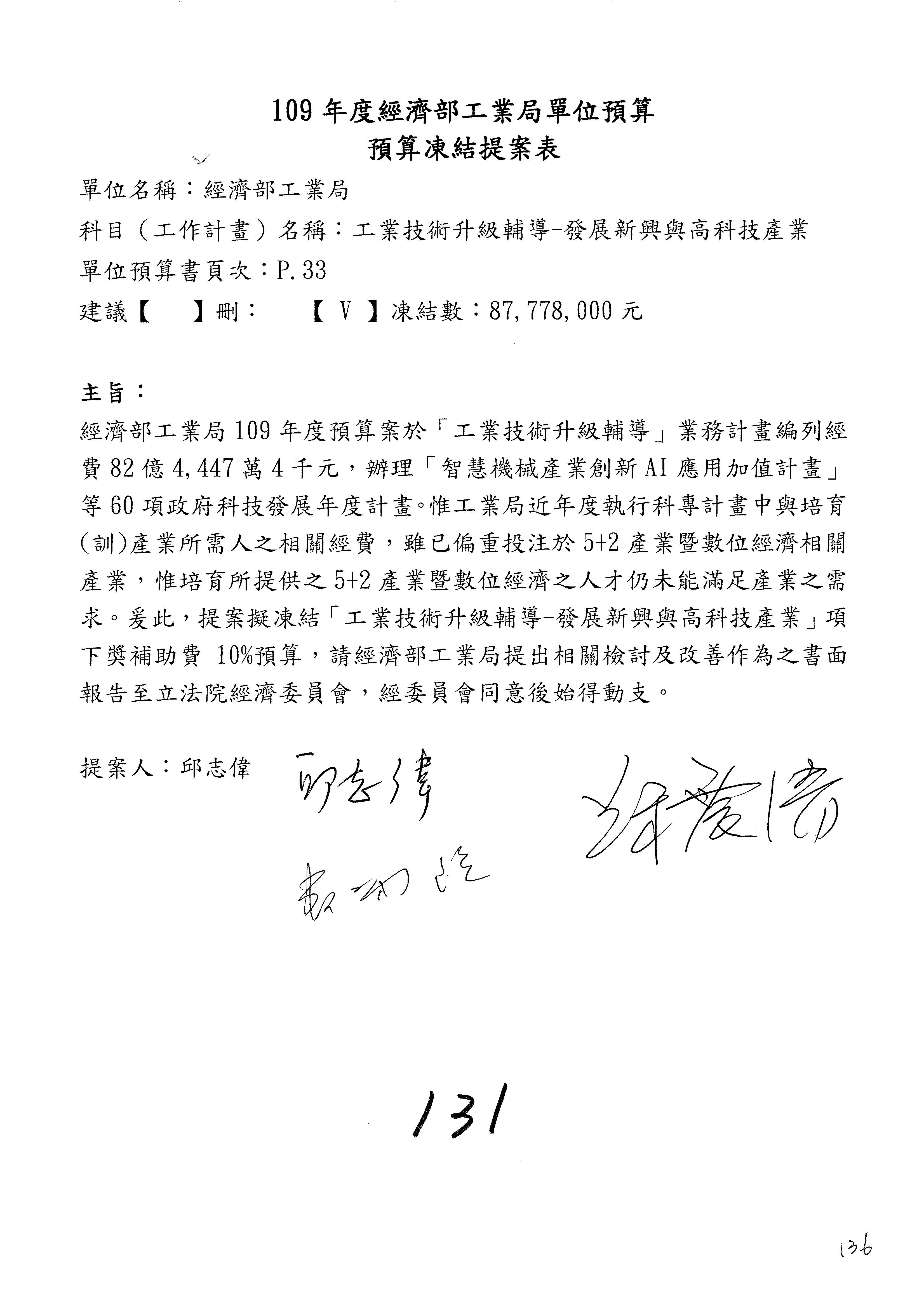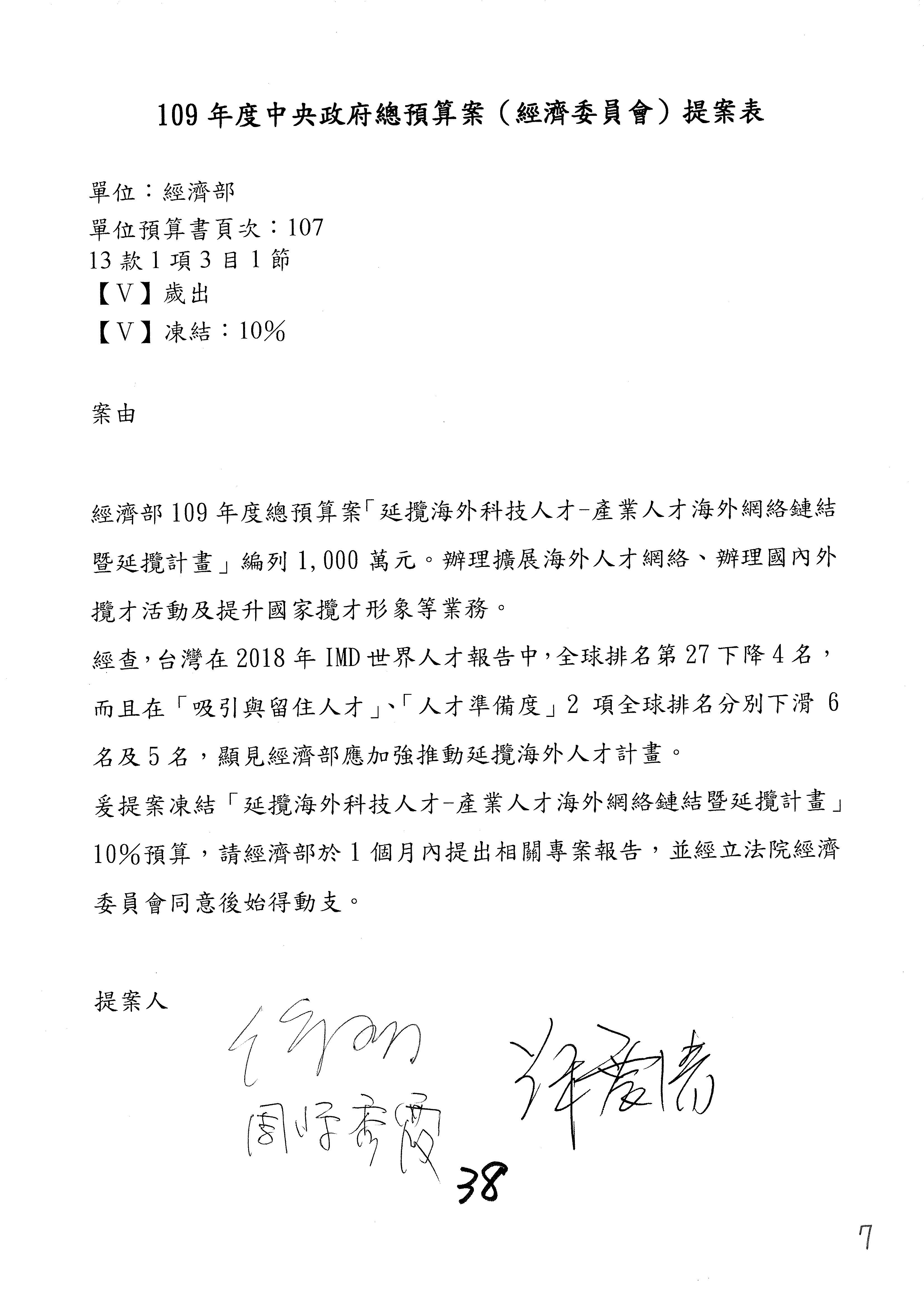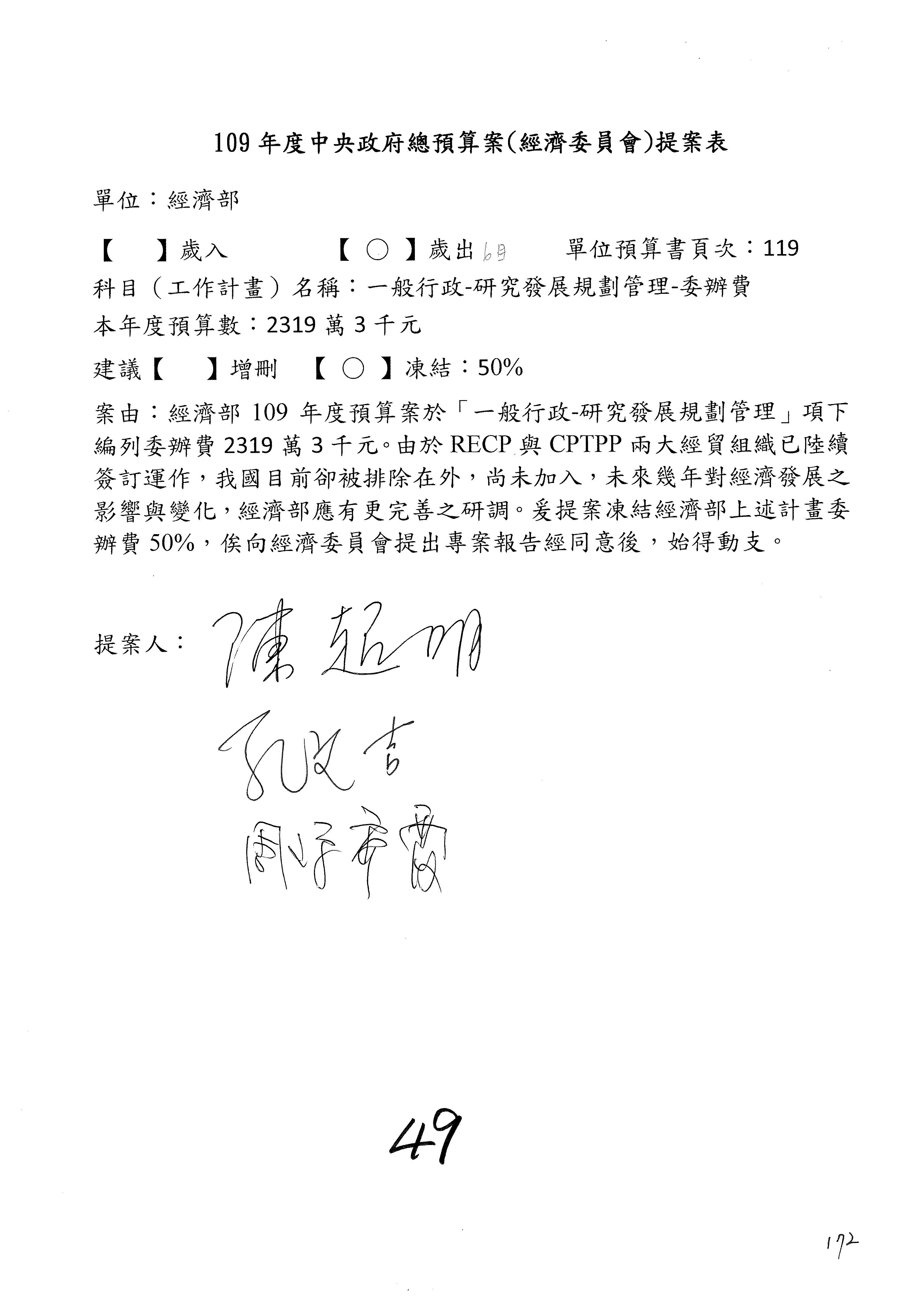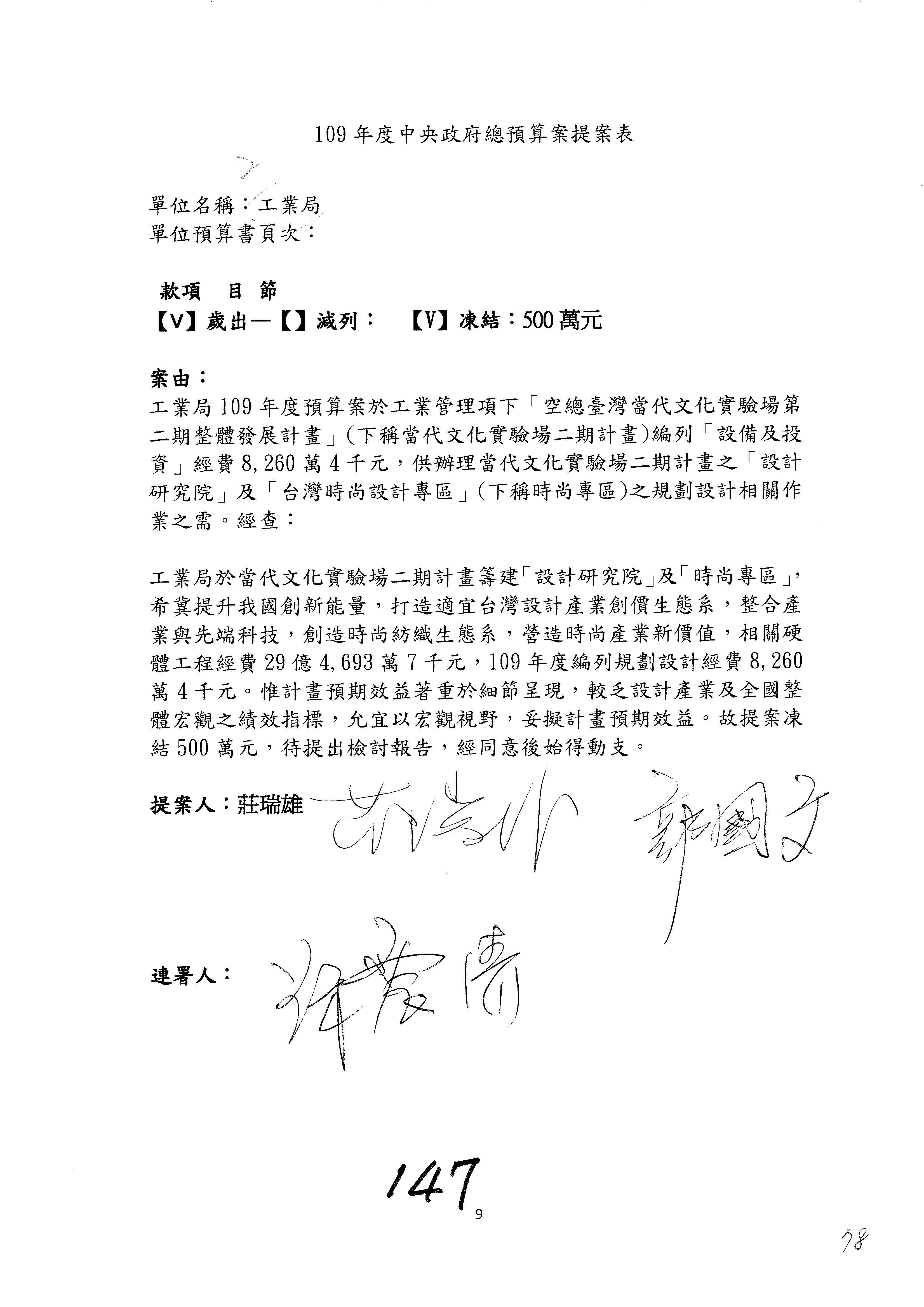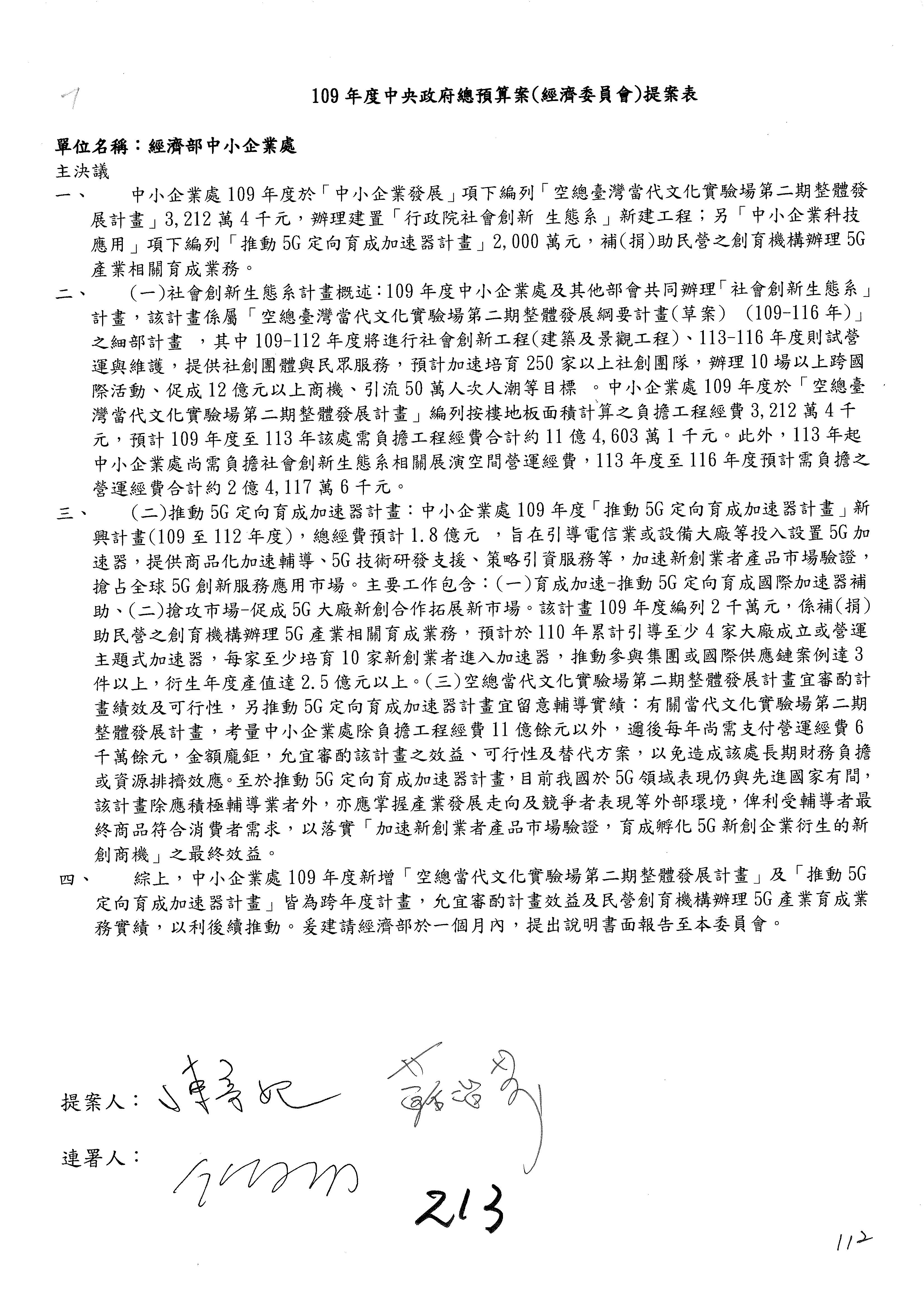 (一)國家發展委員會109年度歲出預算第3目「研擬經濟政策、協調推動財經措施」編列1,773萬3千元,凍結5%,俟向立法院經濟委員會提出書面報告後,始得動支。