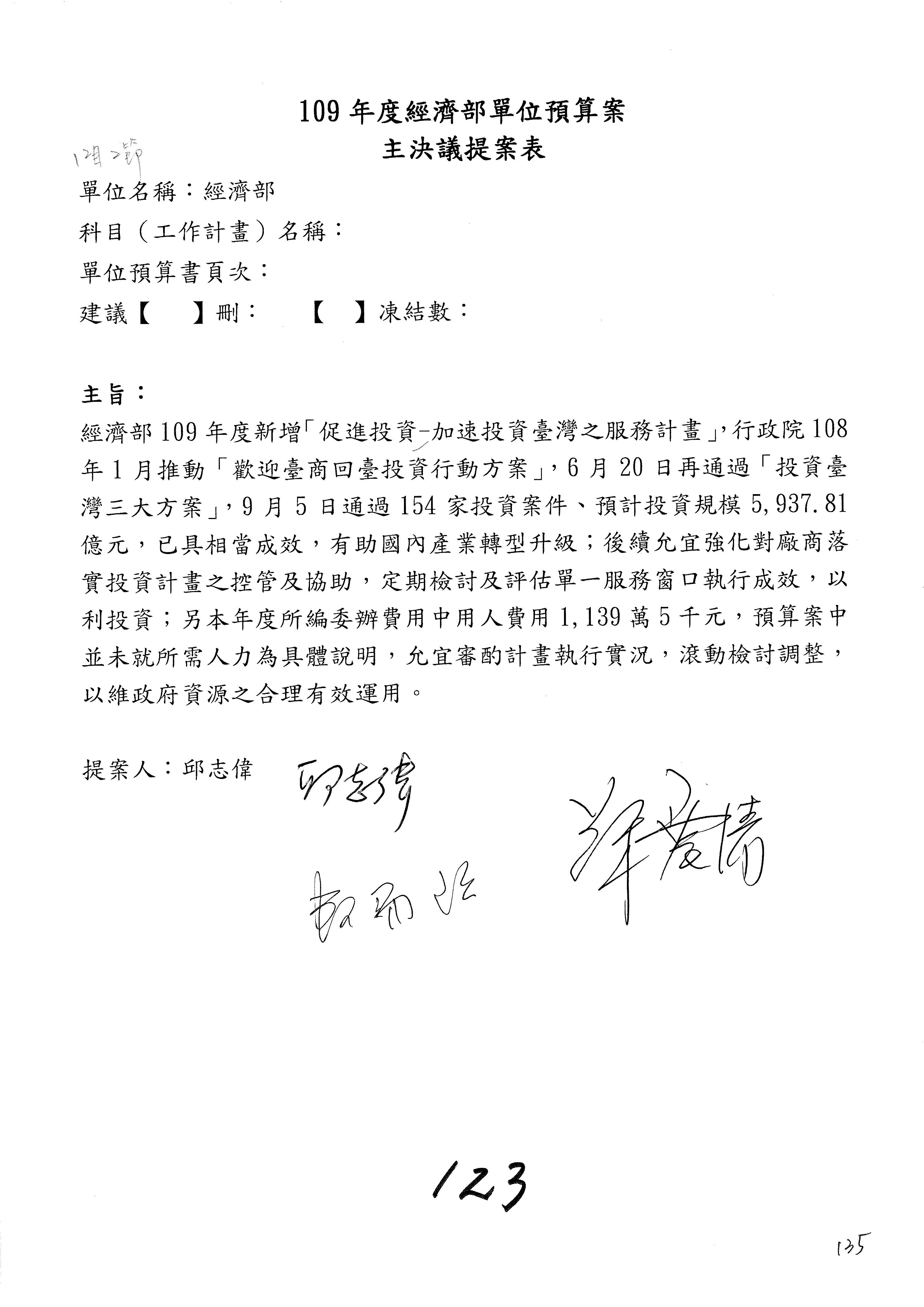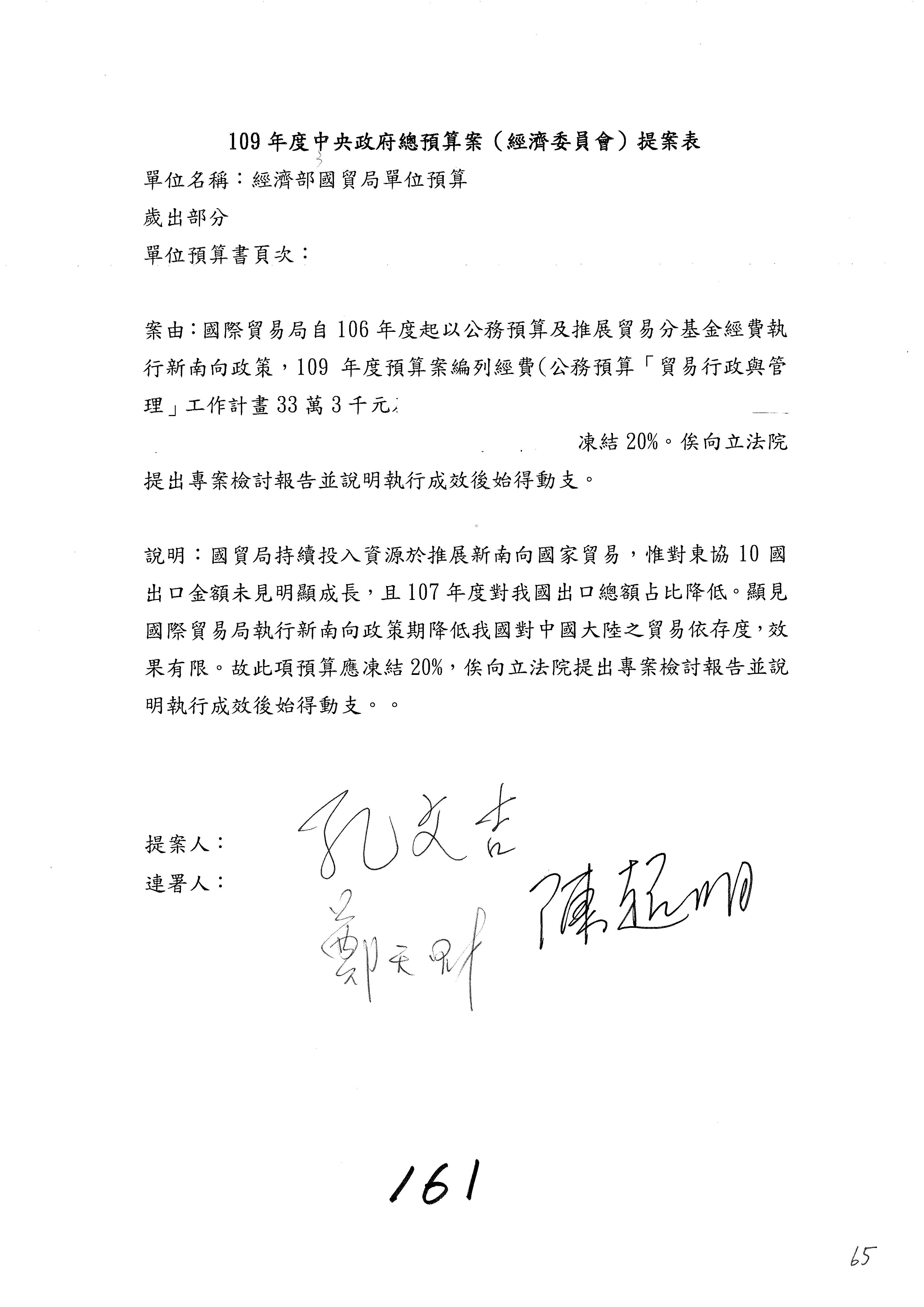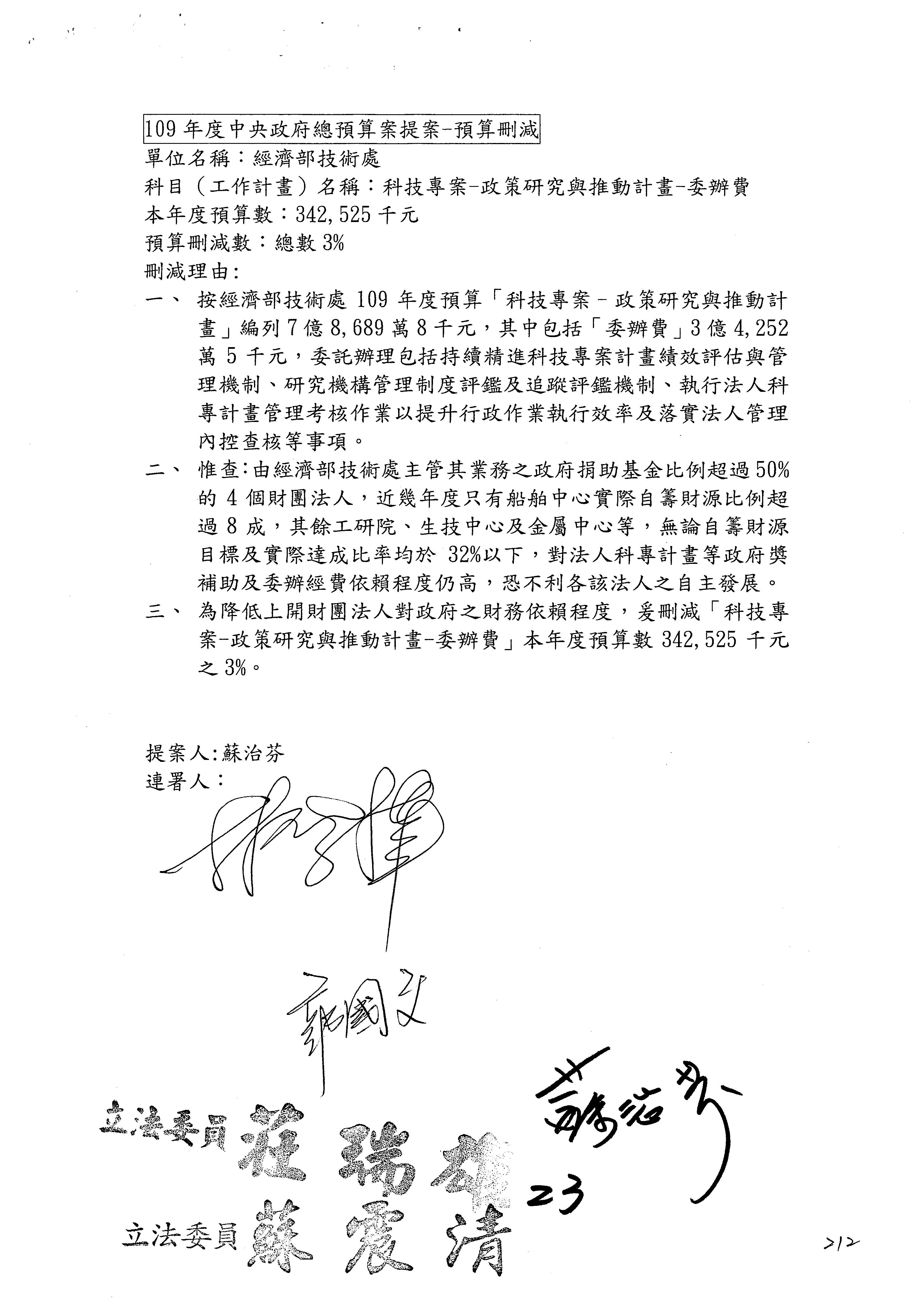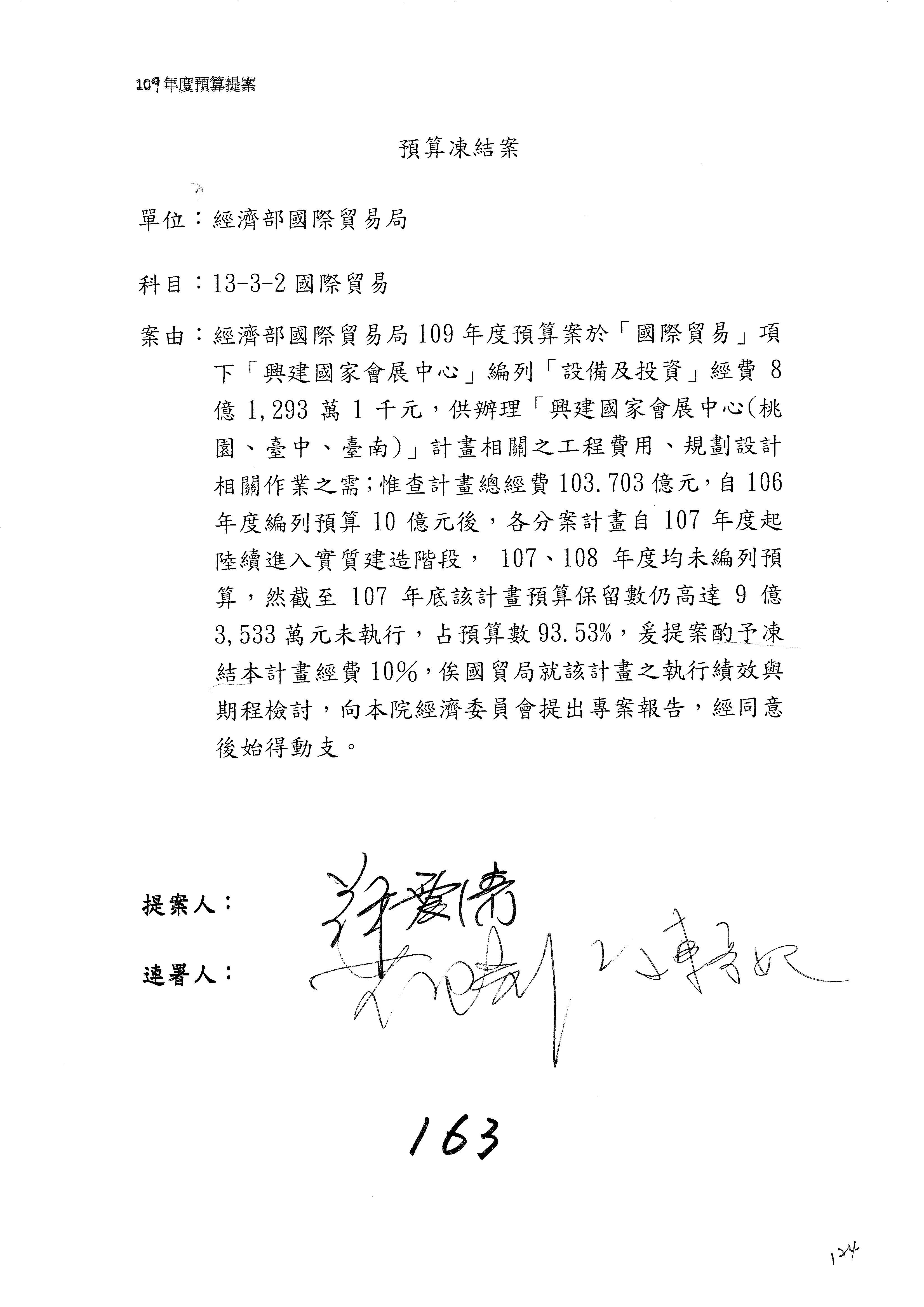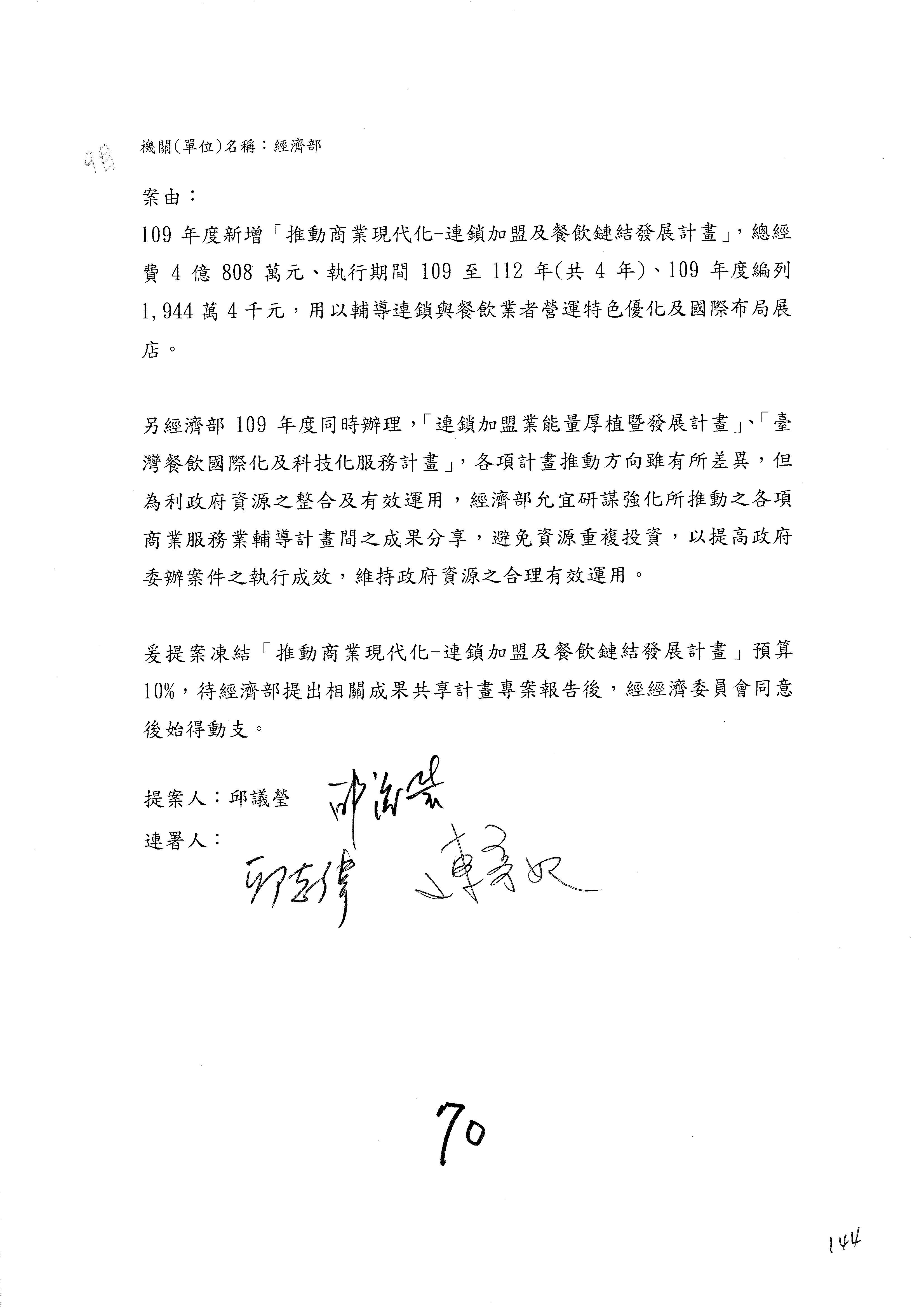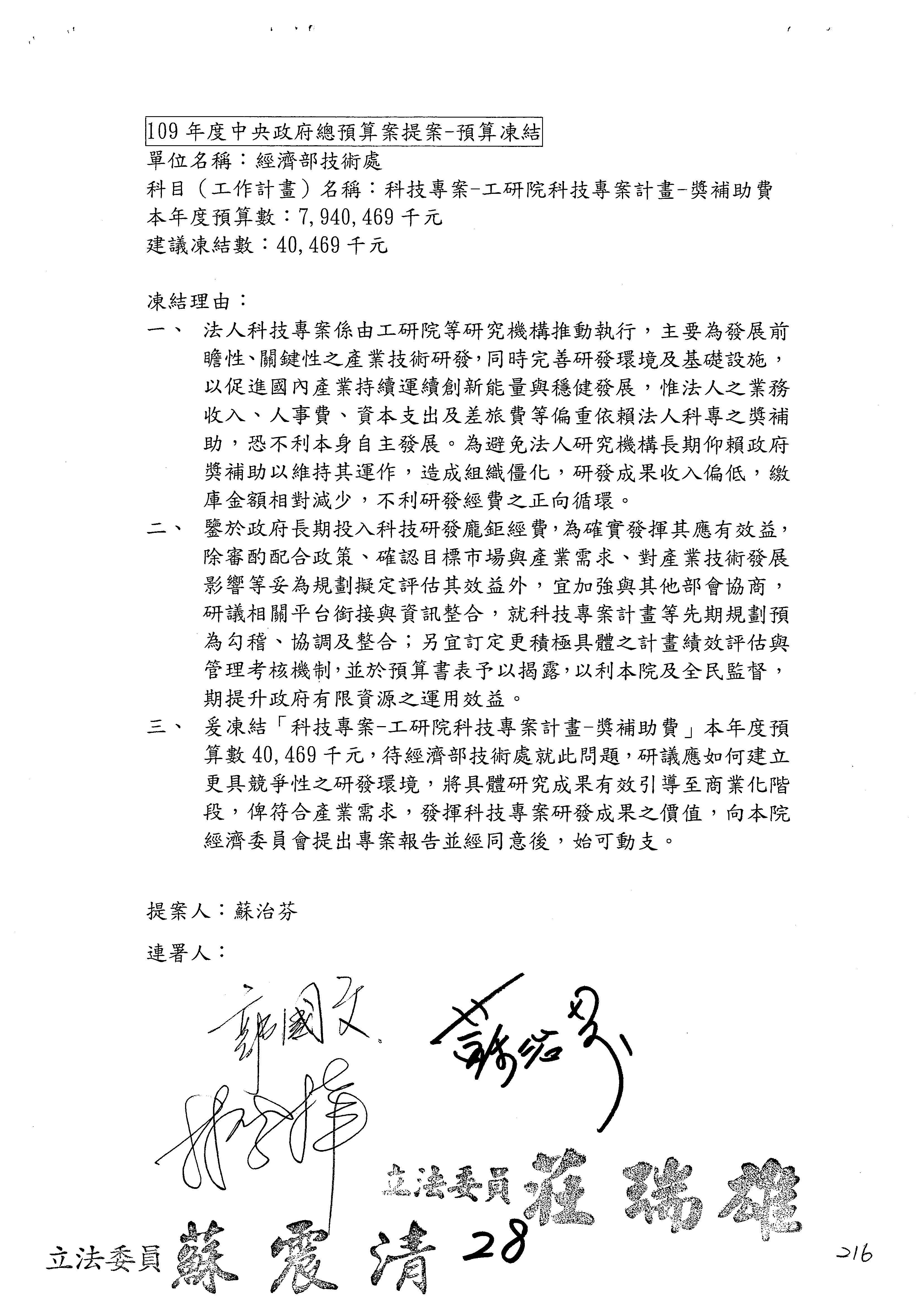 (一)國家發展委員會109年度歲出預算第3目「研擬經濟政策、協調推動財經措施」編列1,773萬3千元,凍結5%,俟向立法院經濟委員會提出書面報告後,始得動支。