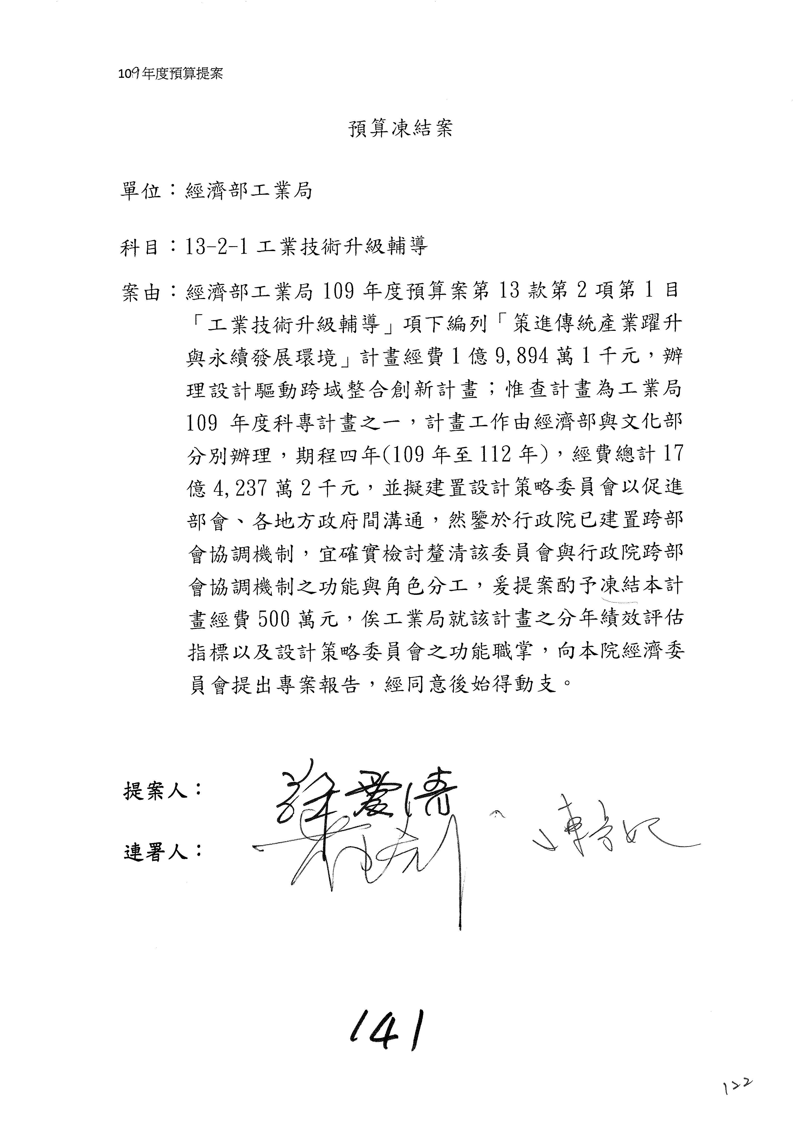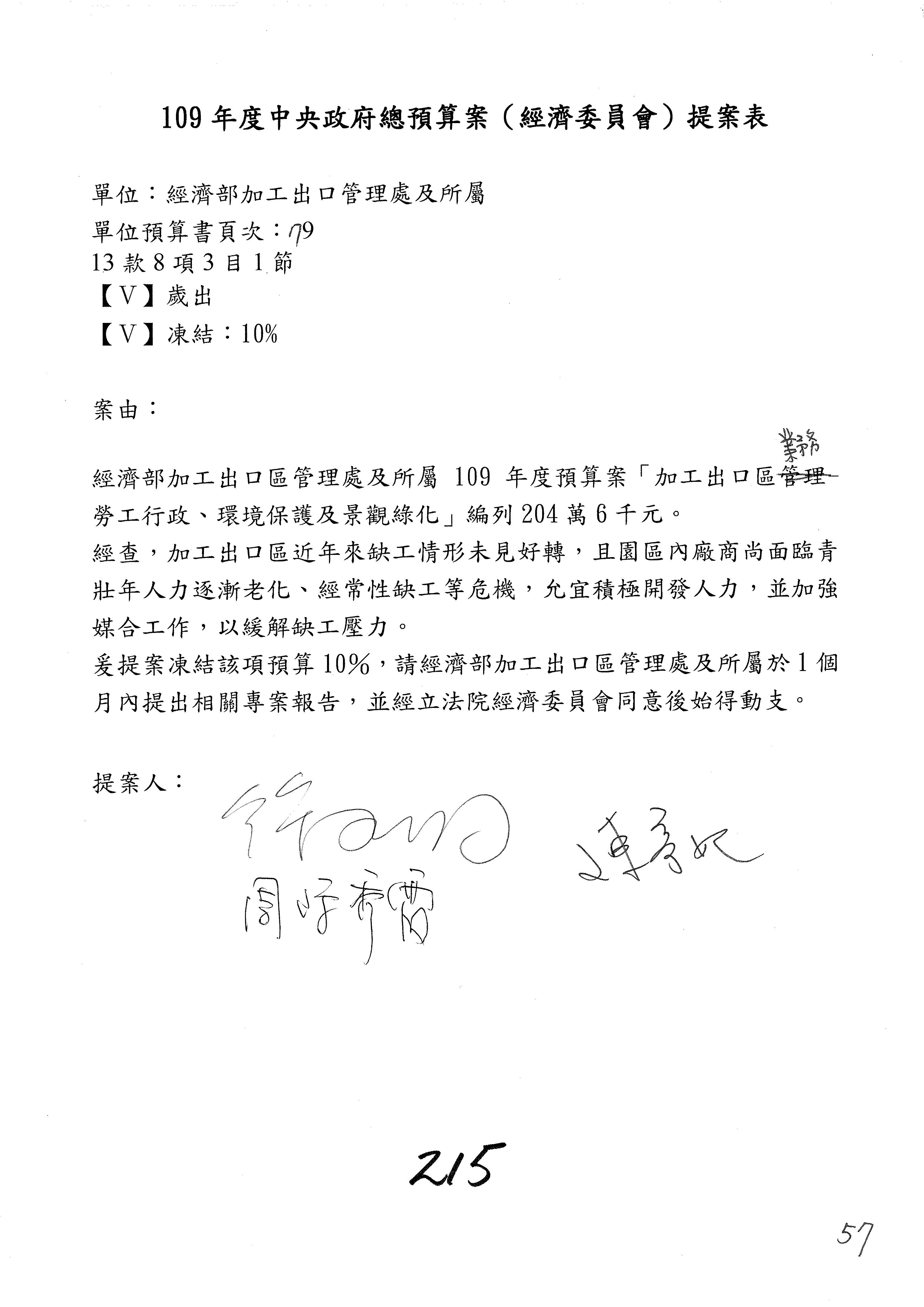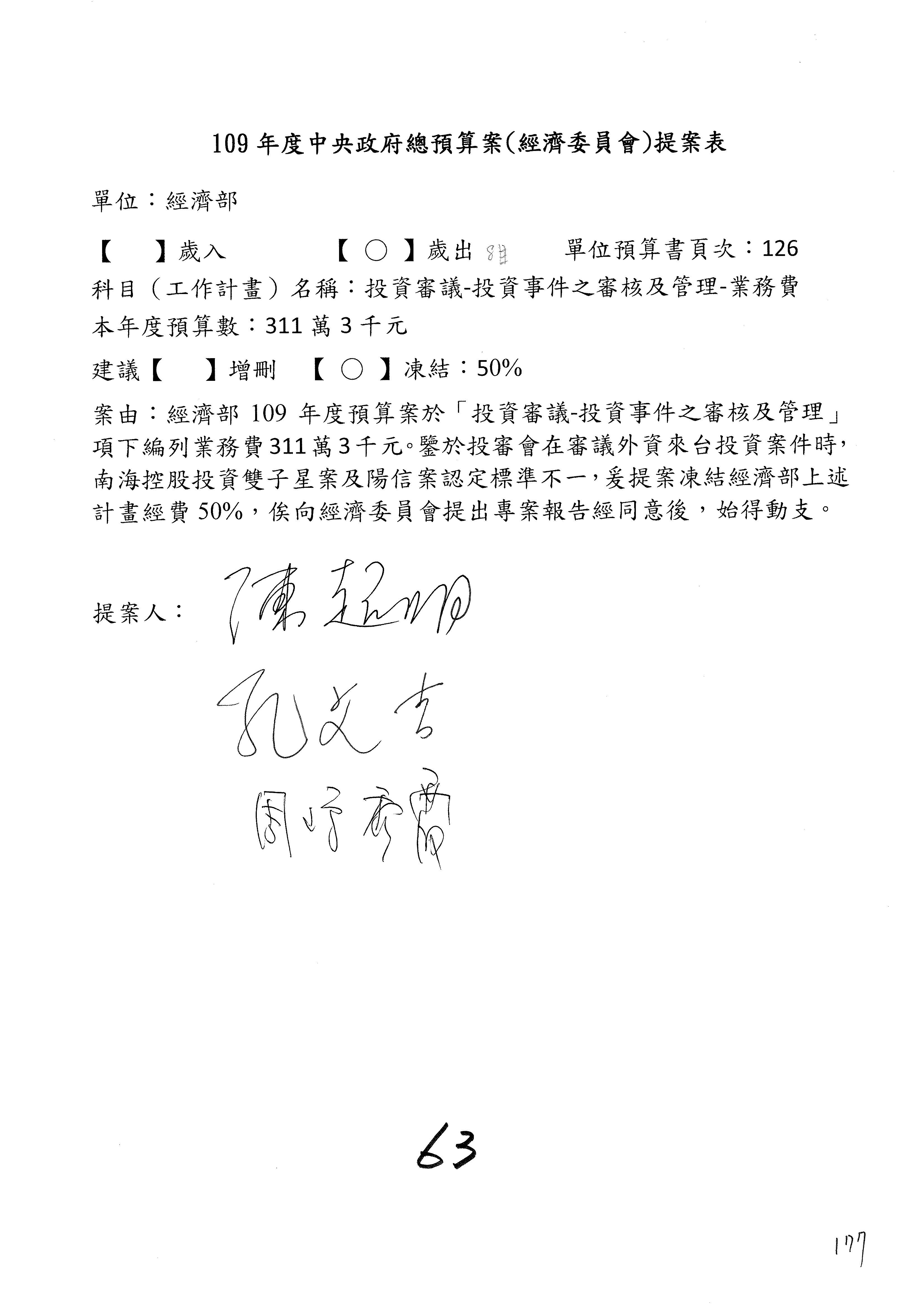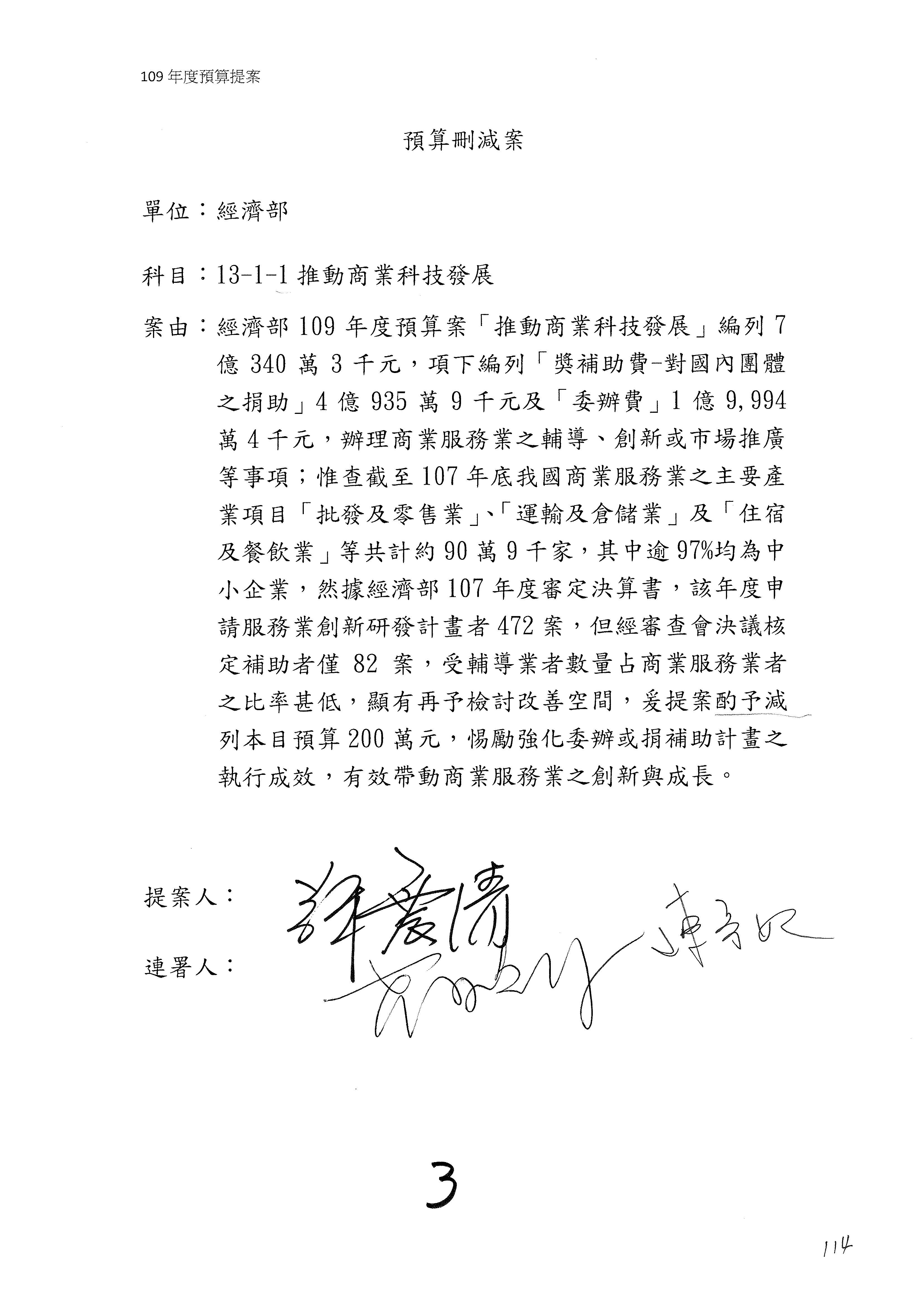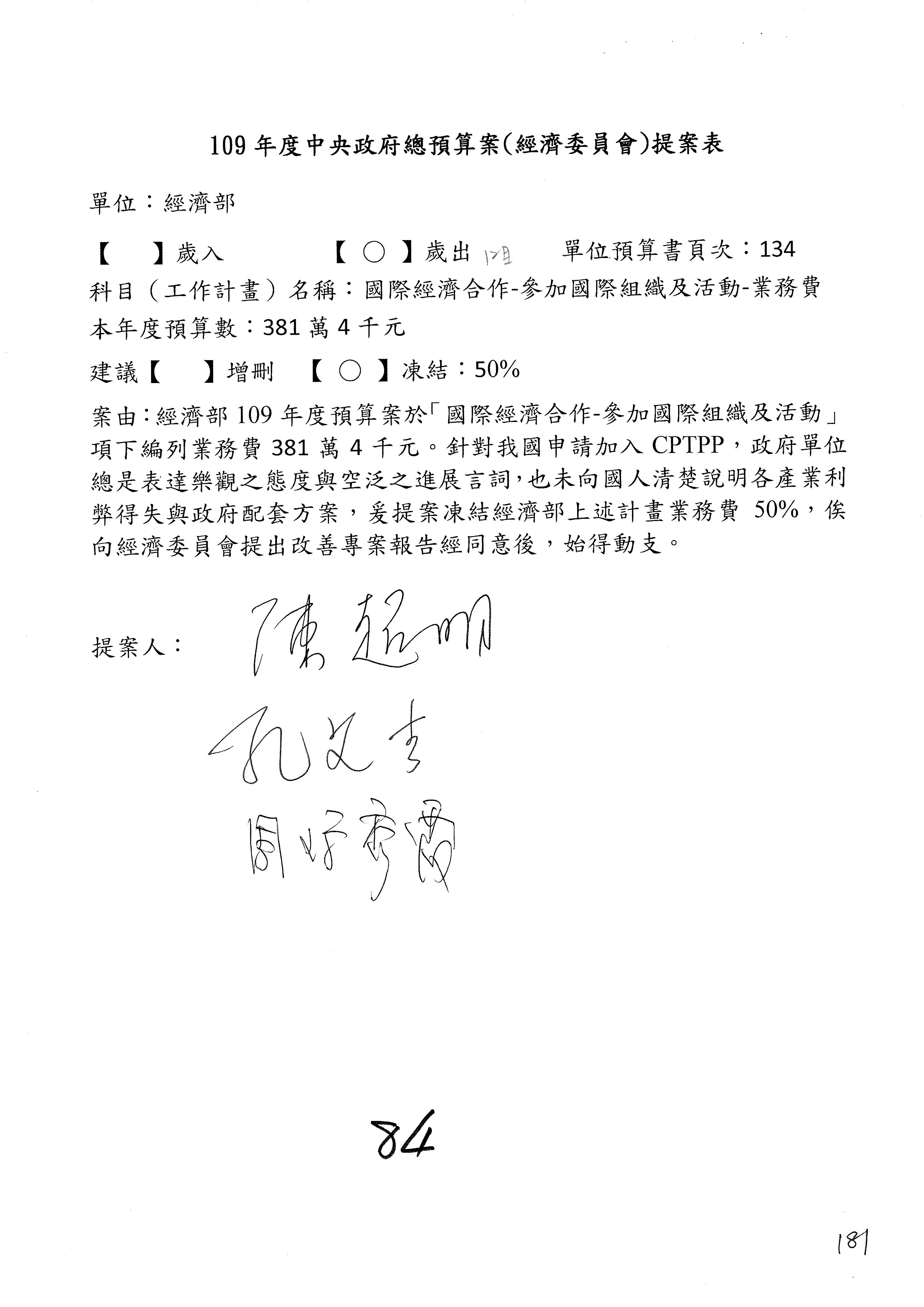(一)國家發展委員會109年度歲出預算第3目「研擬經濟政策、協調推動財經措施」編列1,773萬3千元,凍結5%,俟向立法院經濟委員會提出書面報告後,始得動支。