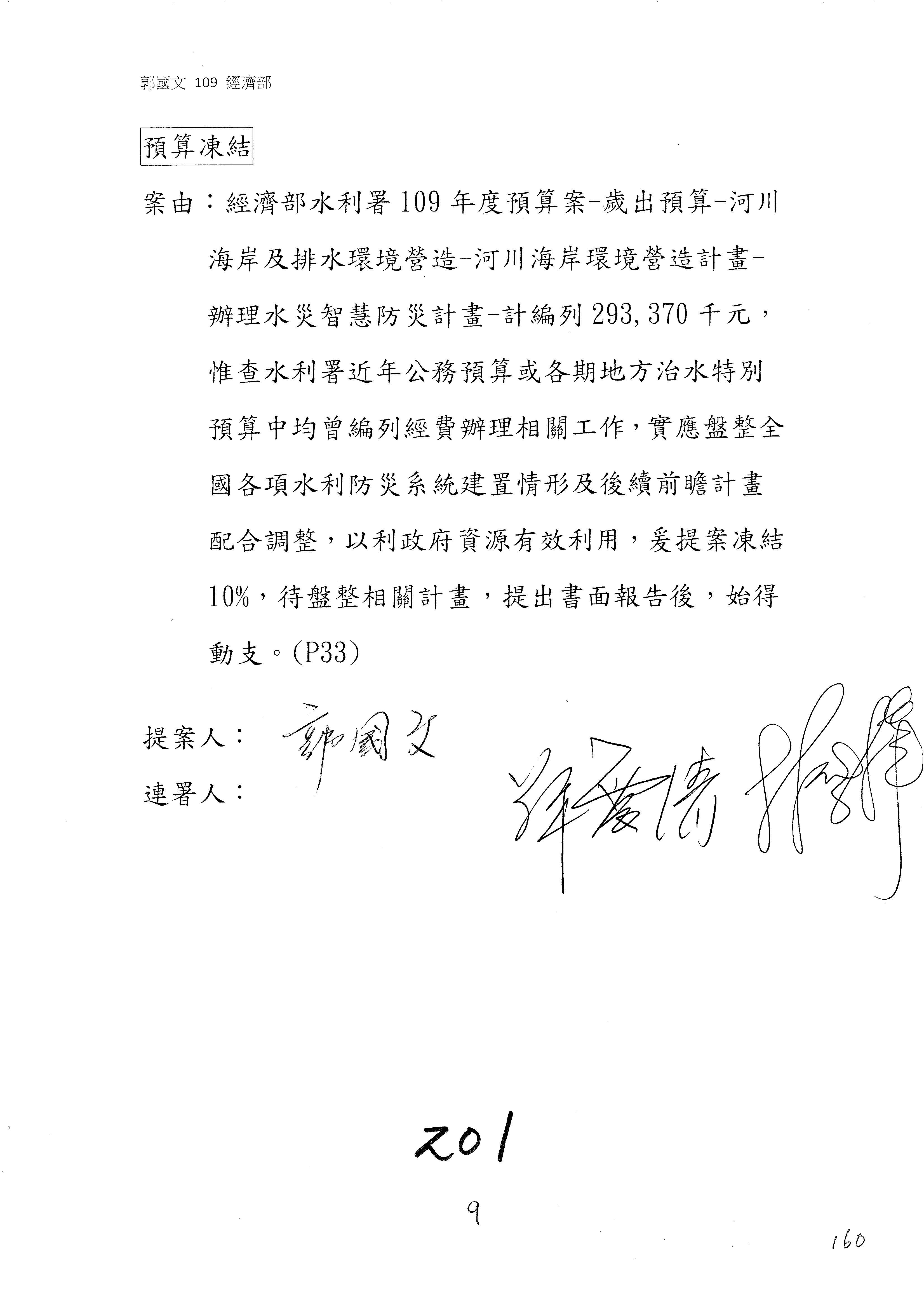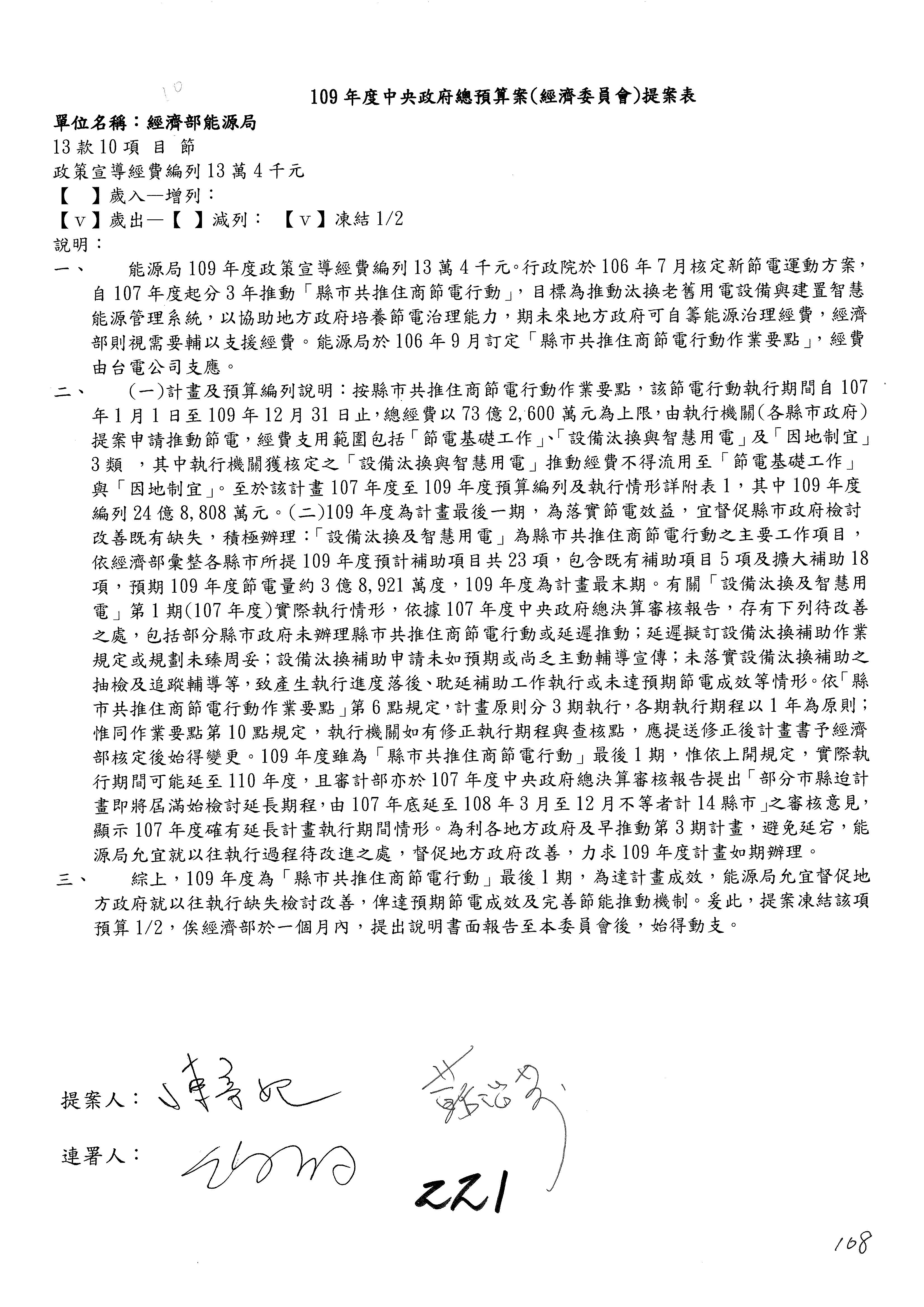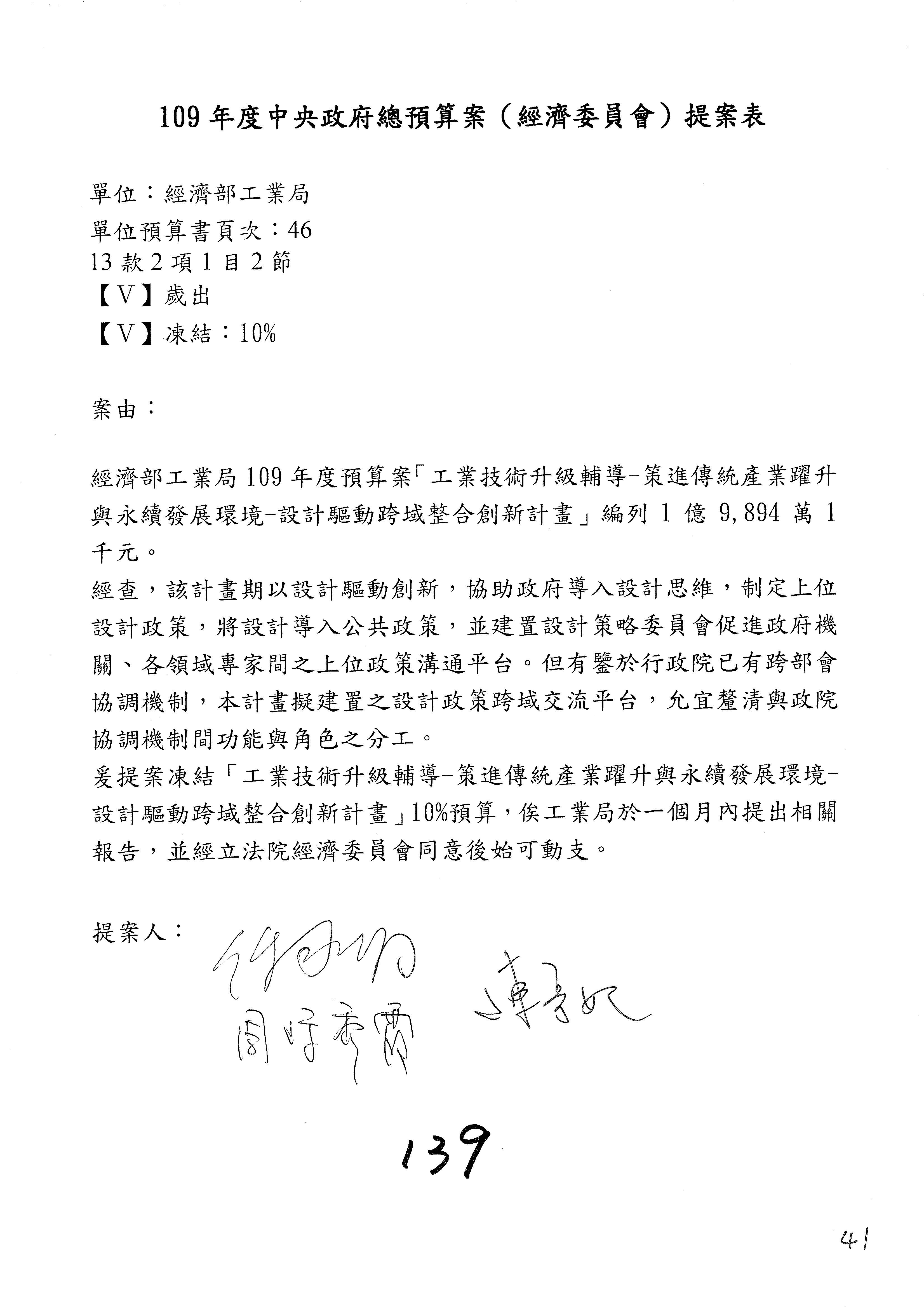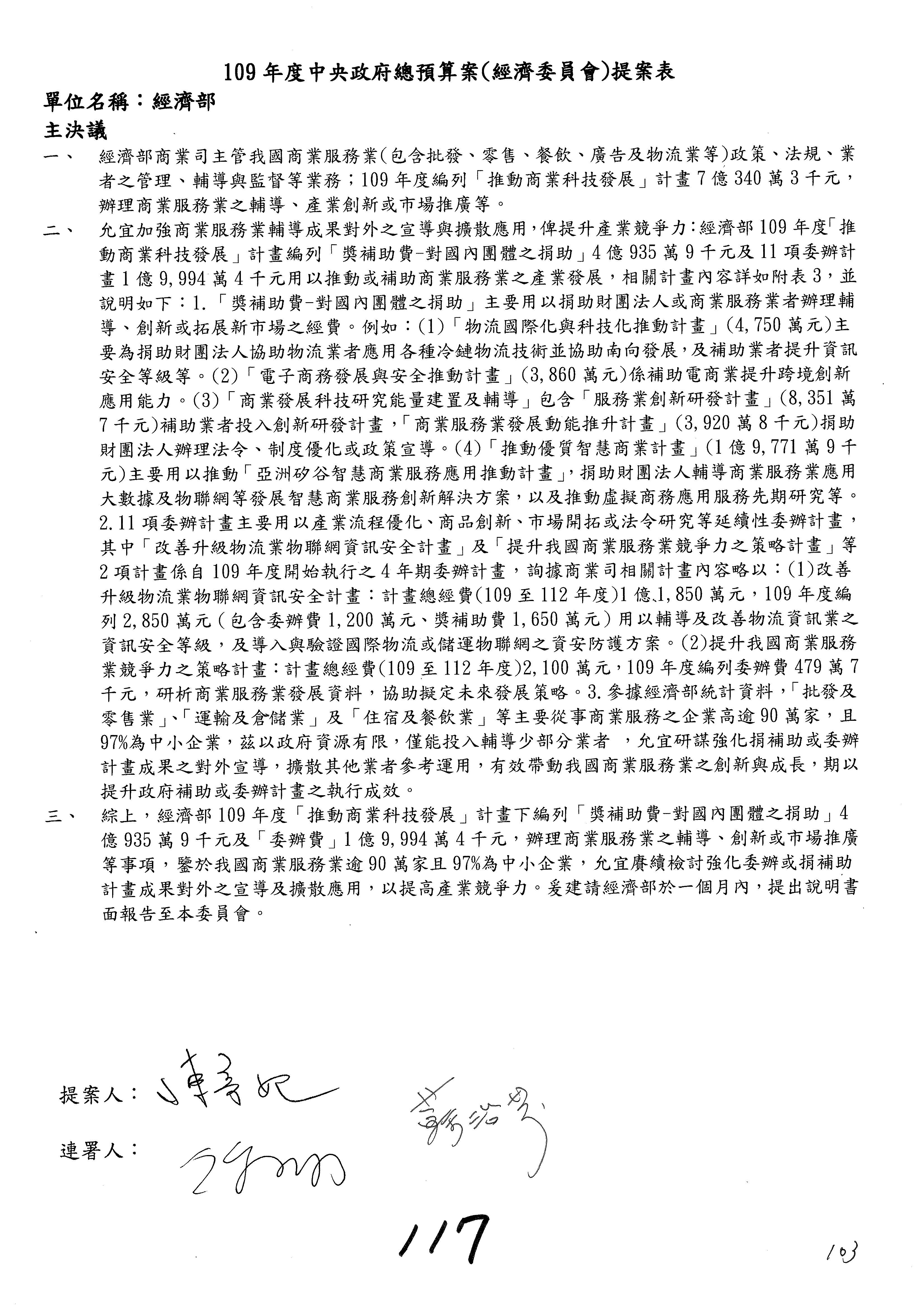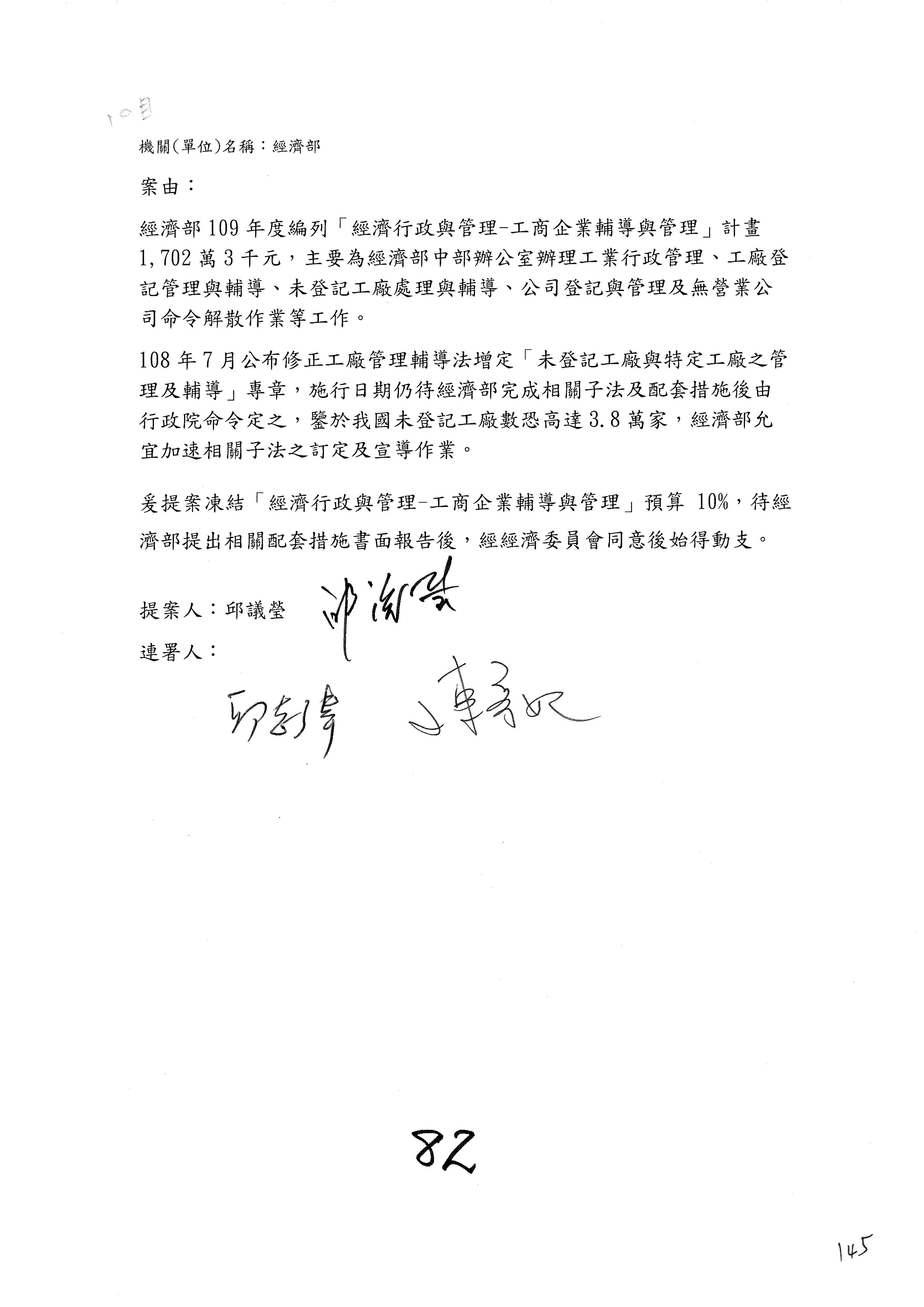 (一)國家發展委員會109年度歲出預算第3目「研擬經濟政策、協調推動財經措施」編列1,773萬3千元,凍結5%,俟向立法院經濟委員會提出書面報告後,始得動支。