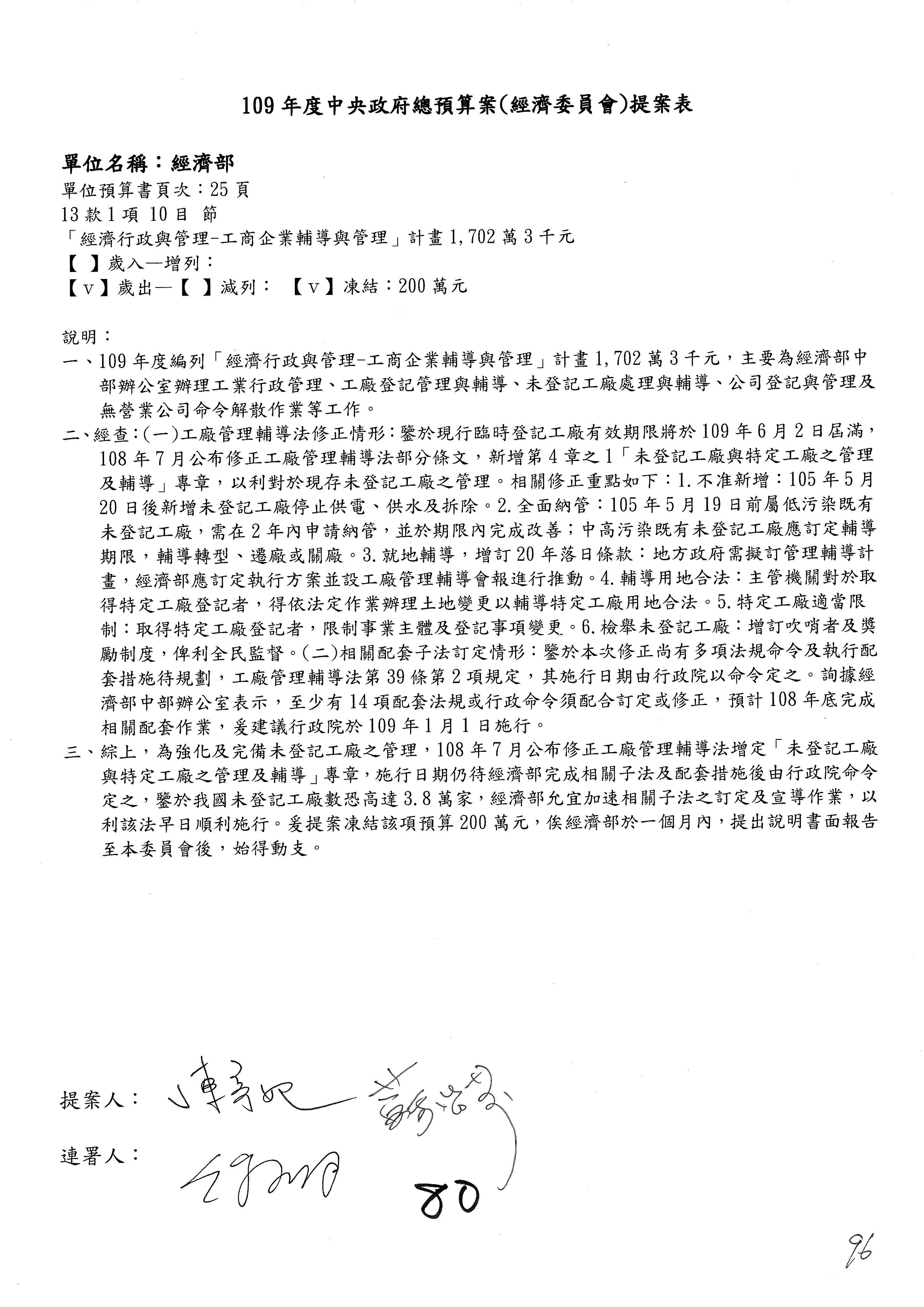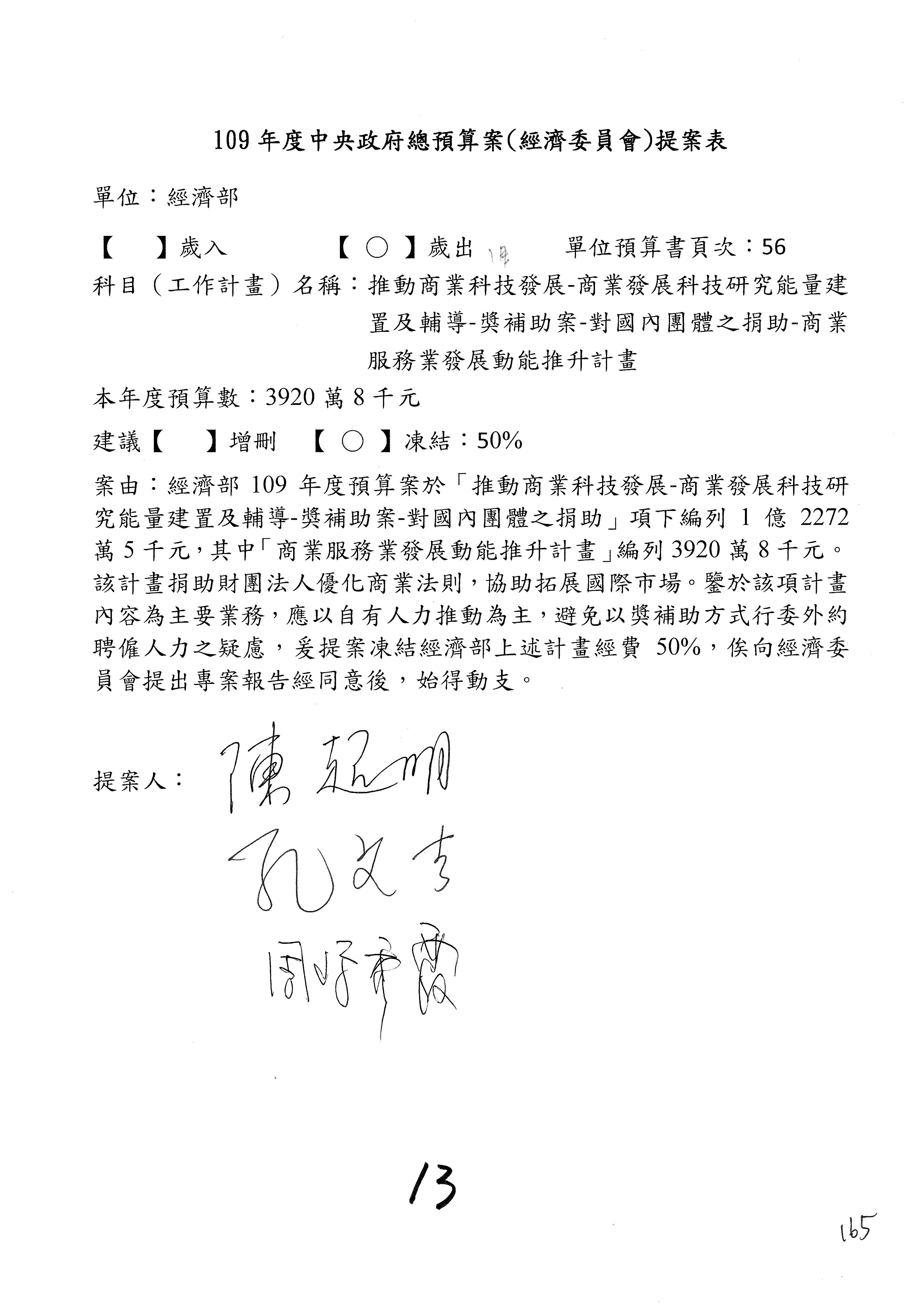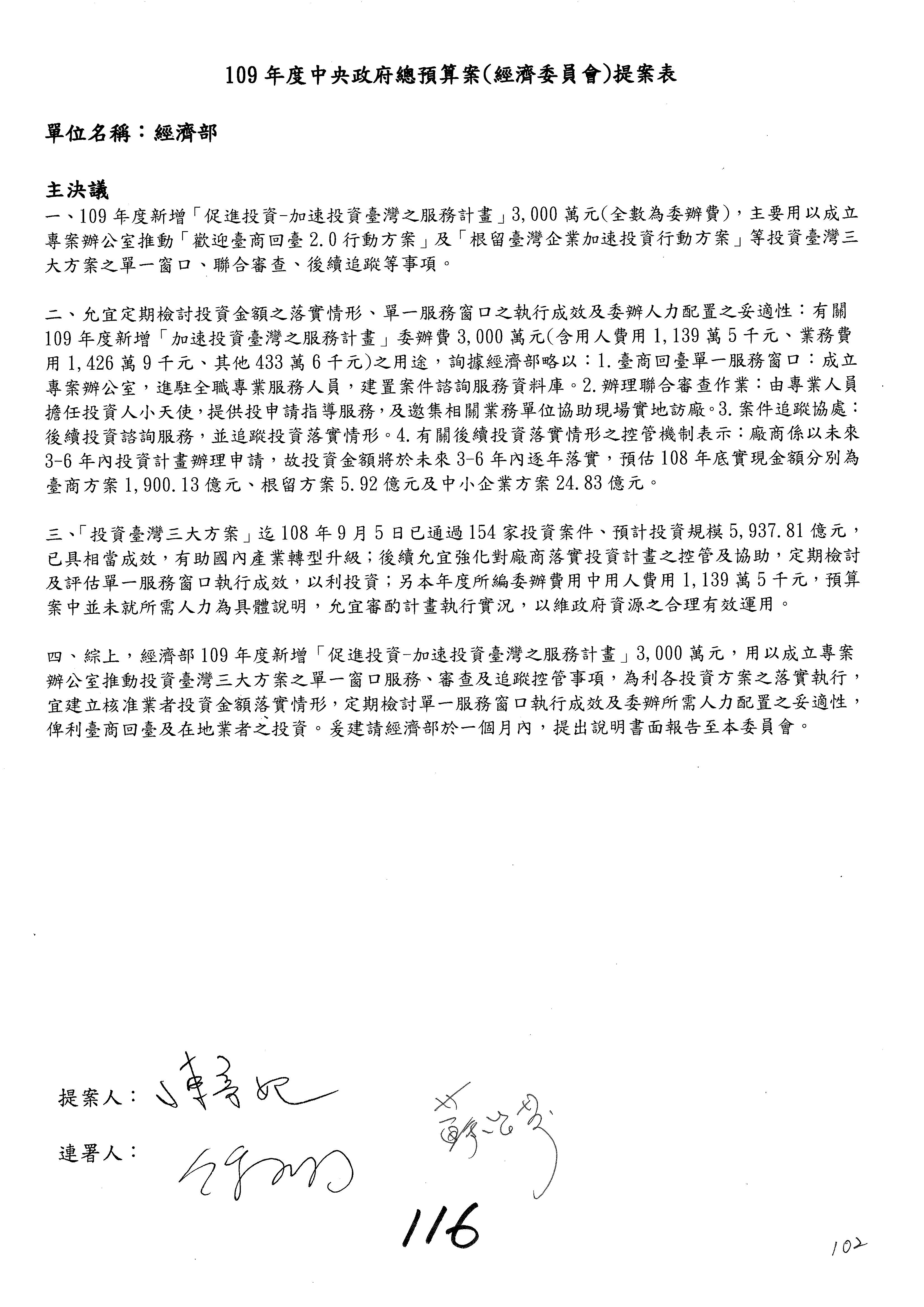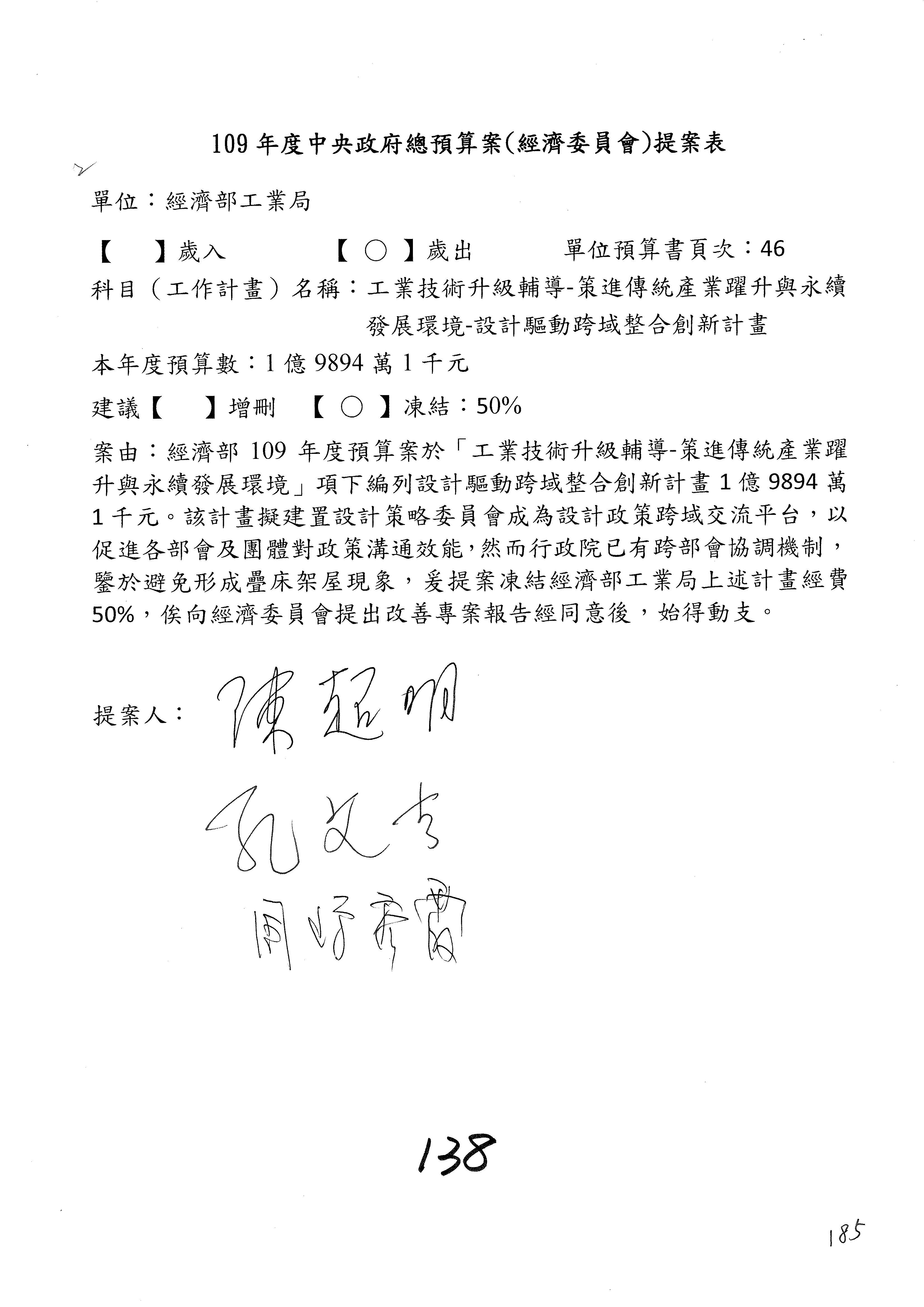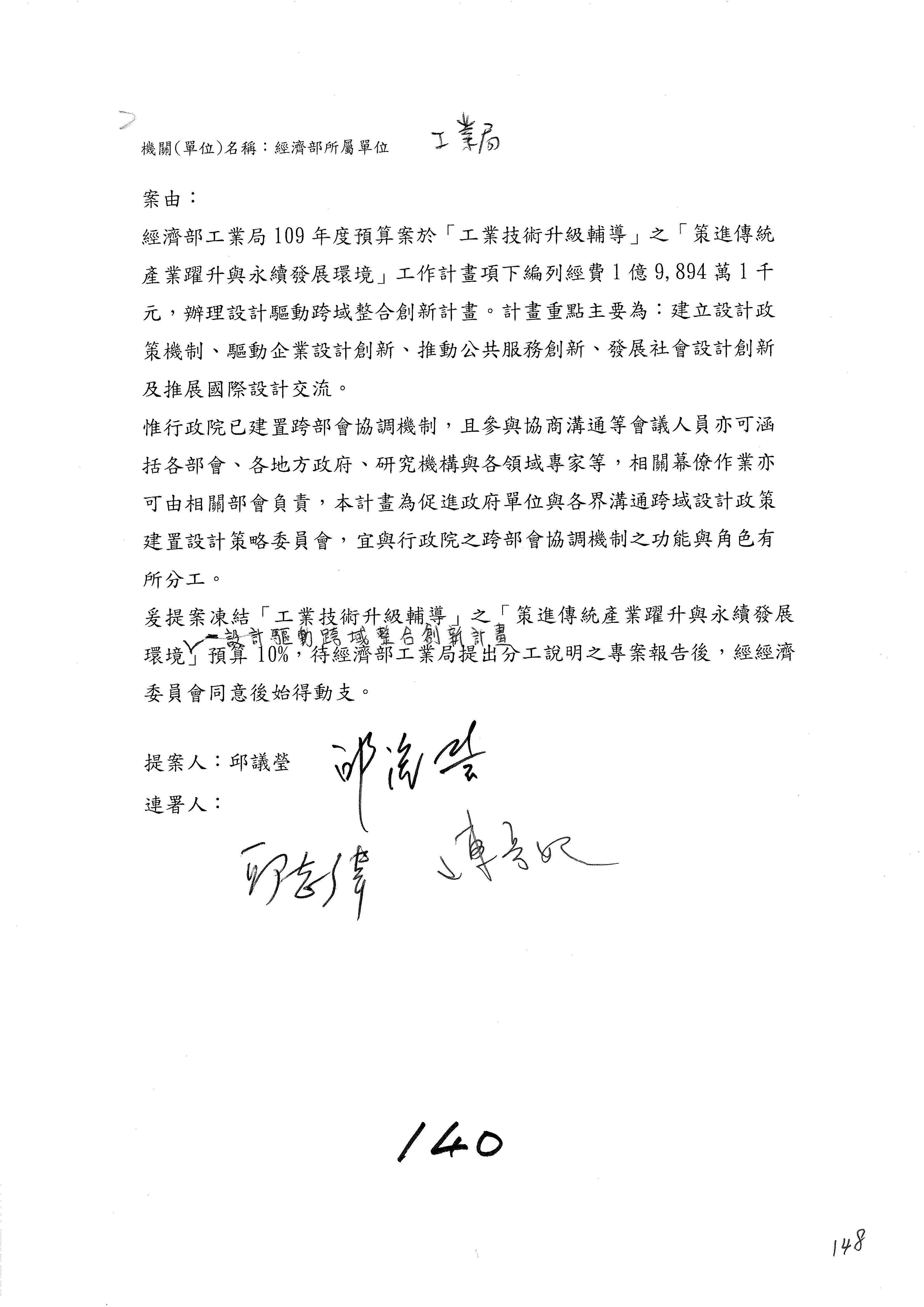 (一)國家發展委員會109年度歲出預算第3目「研擬經濟政策、協調推動財經措施」編列1,773萬3千元,凍結5%,俟向立法院經濟委員會提出書面報告後,始得動支。