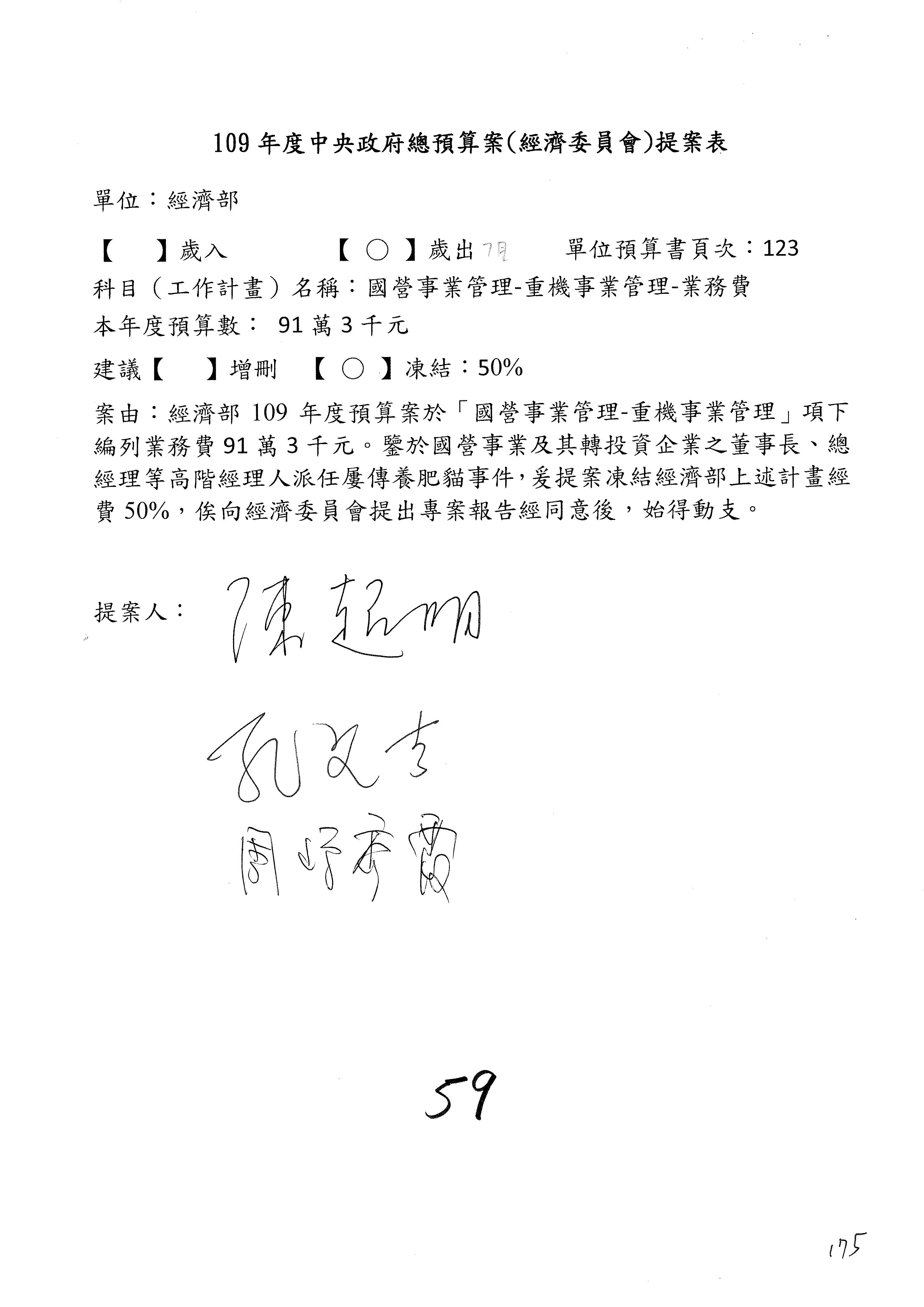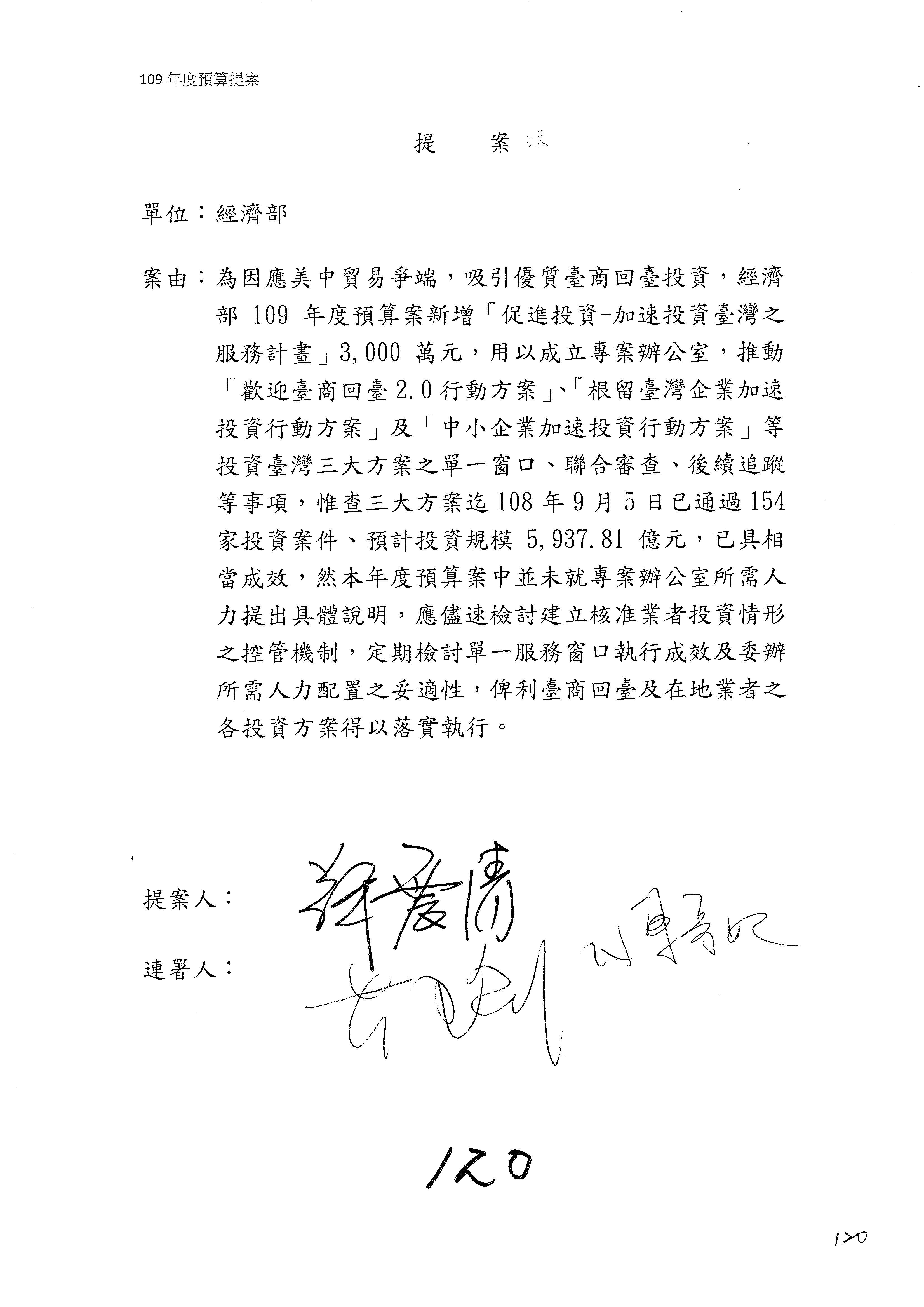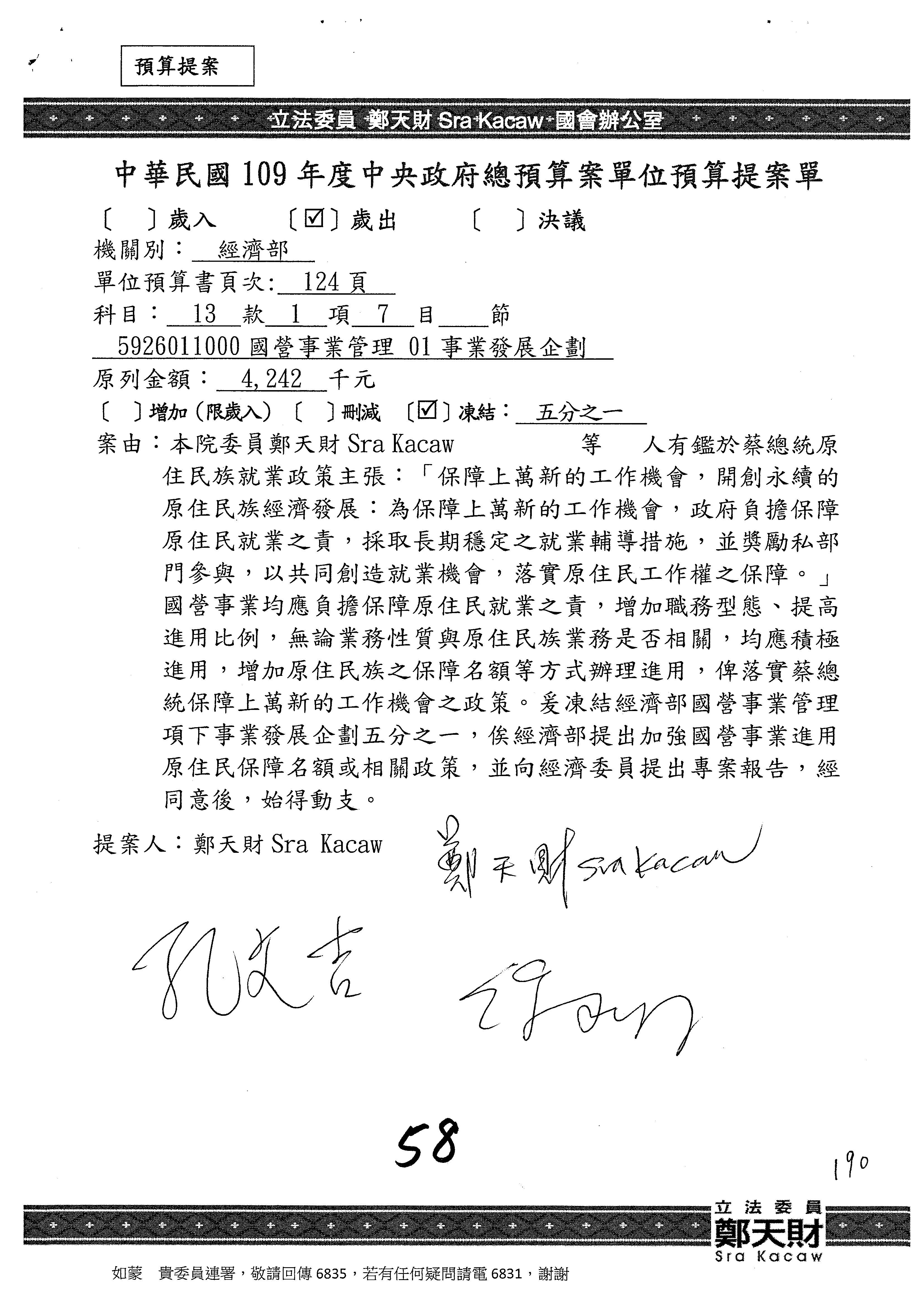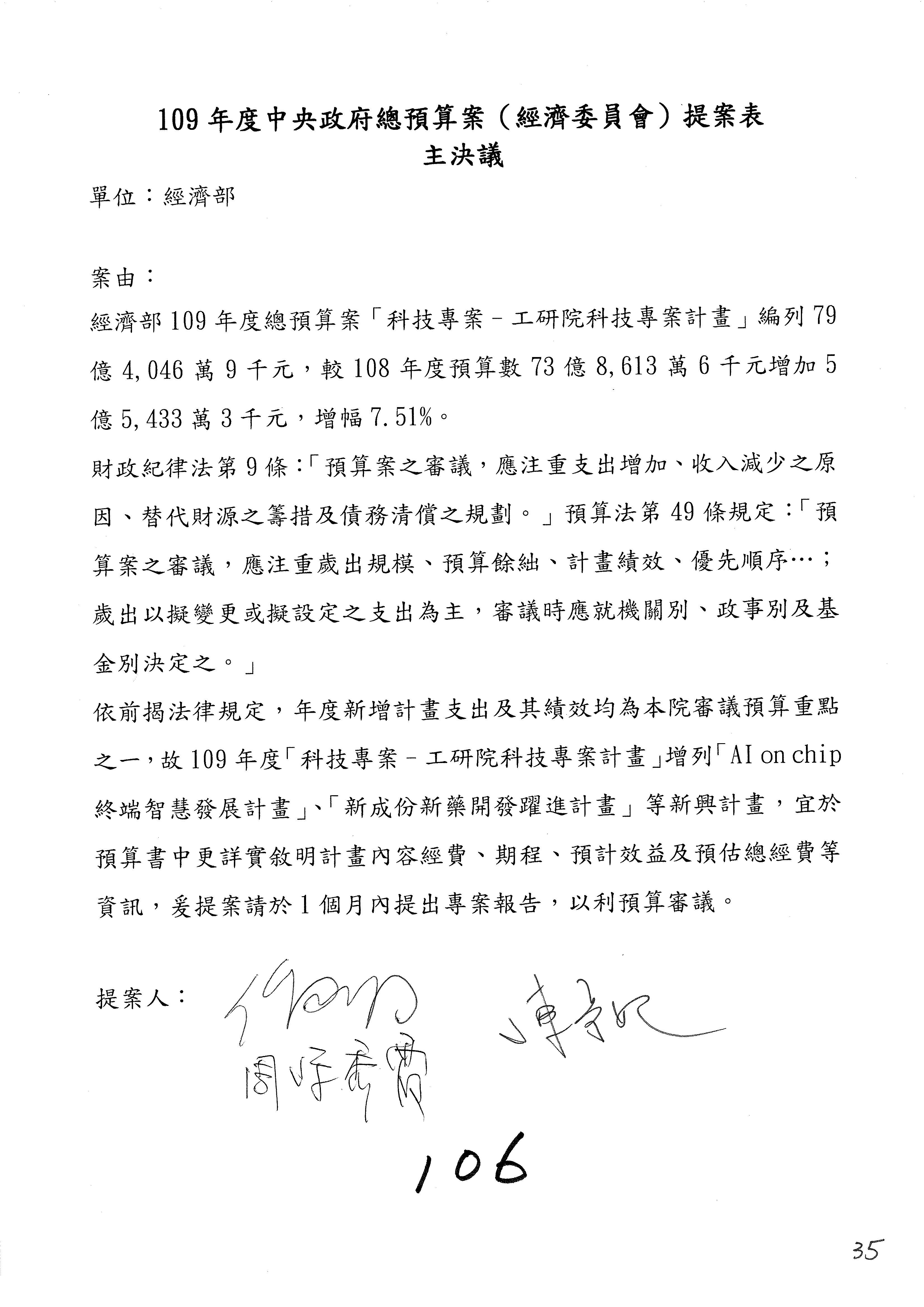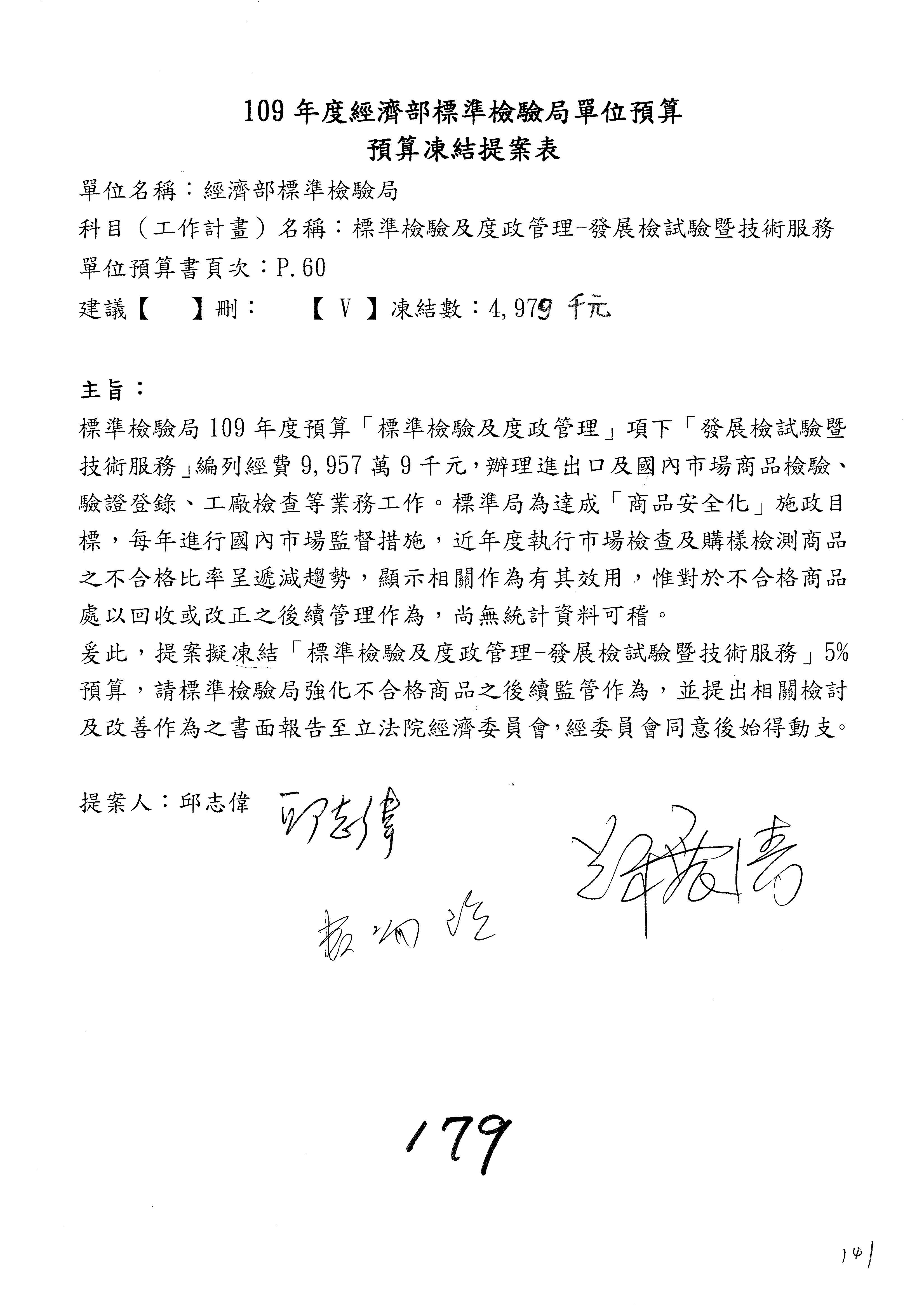 (一)國家發展委員會109年度歲出預算第3目「研擬經濟政策、協調推動財經措施」編列1,773萬3千元,凍結5%,俟向立法院經濟委員會提出書面報告後,始得動支。