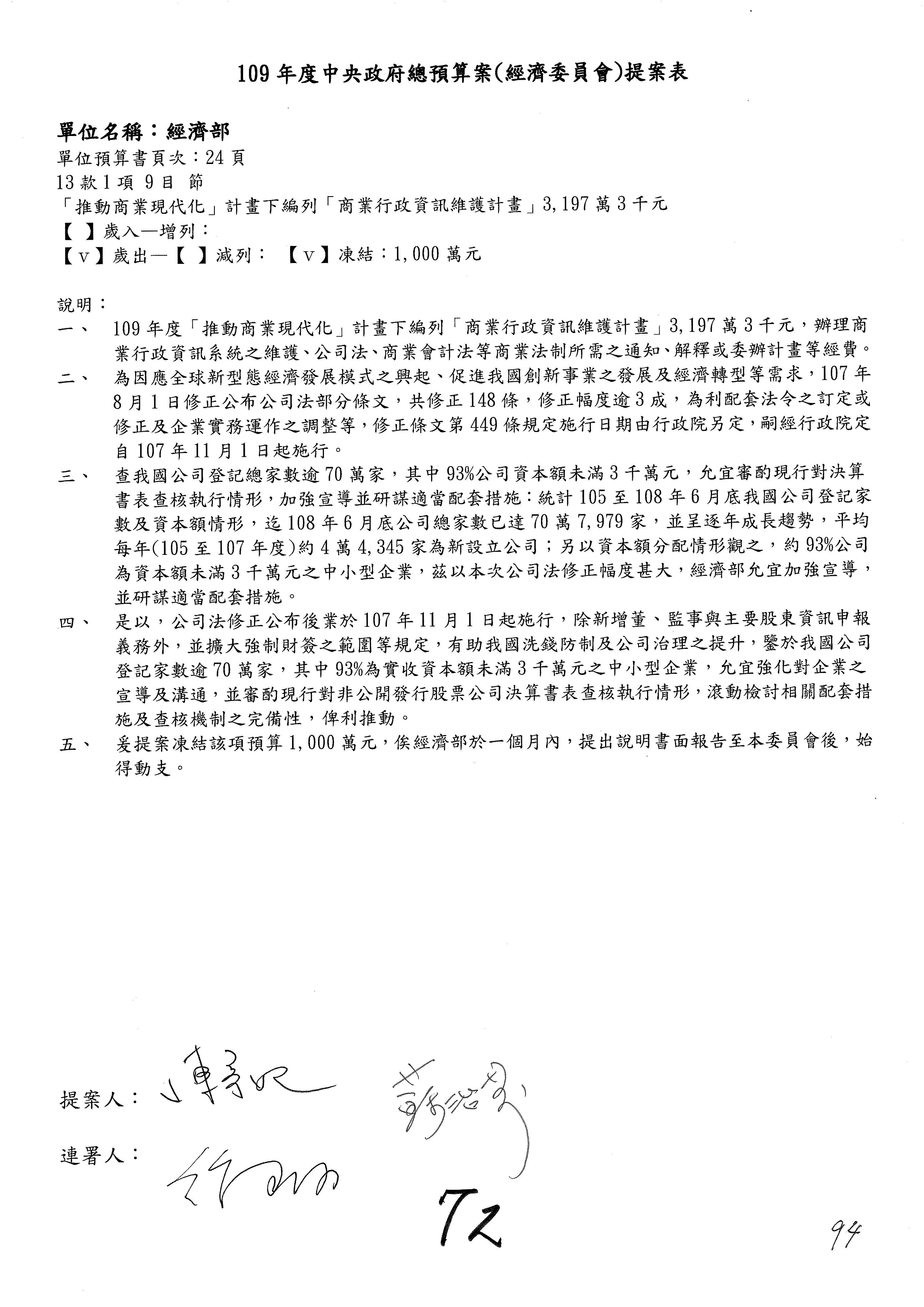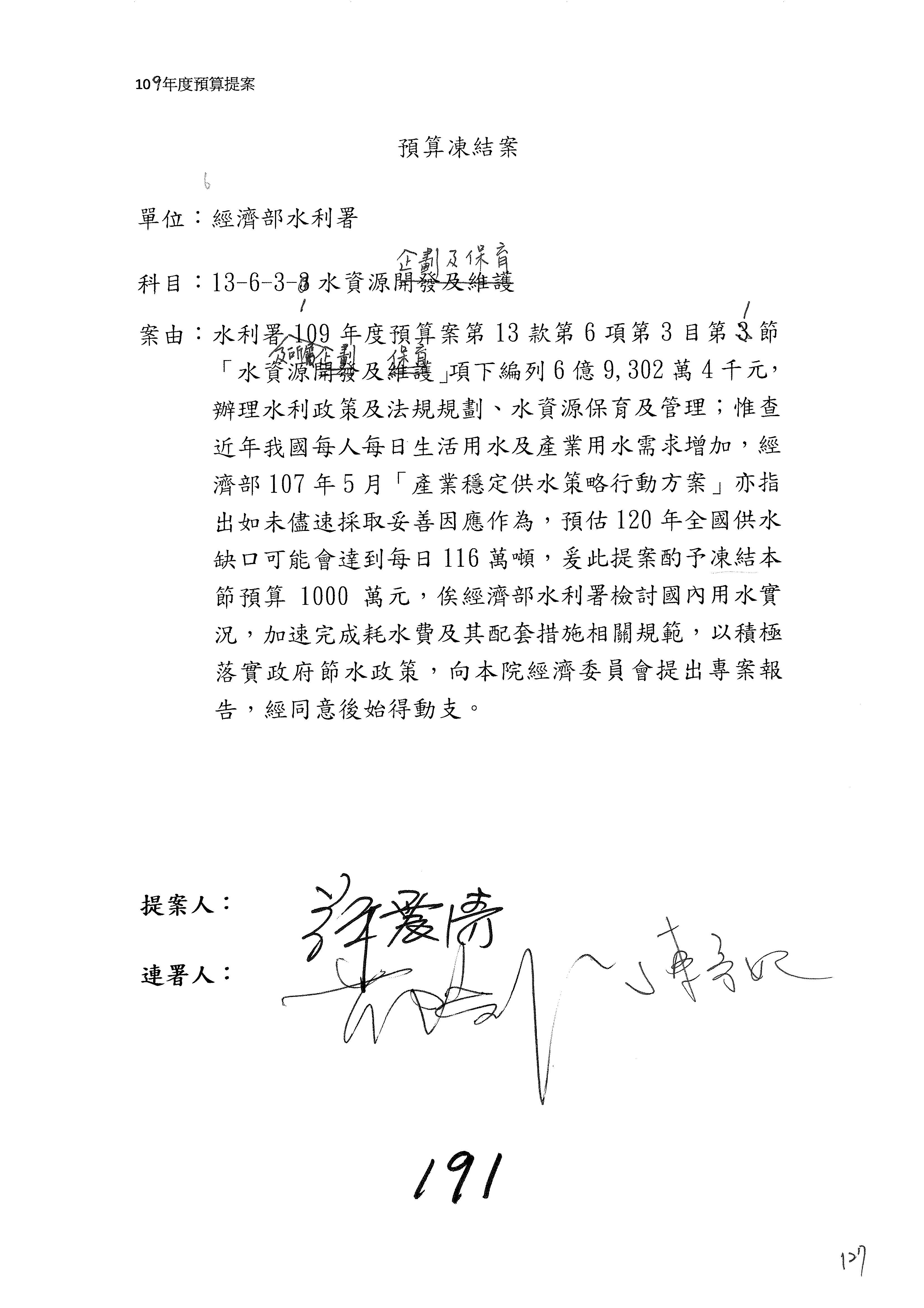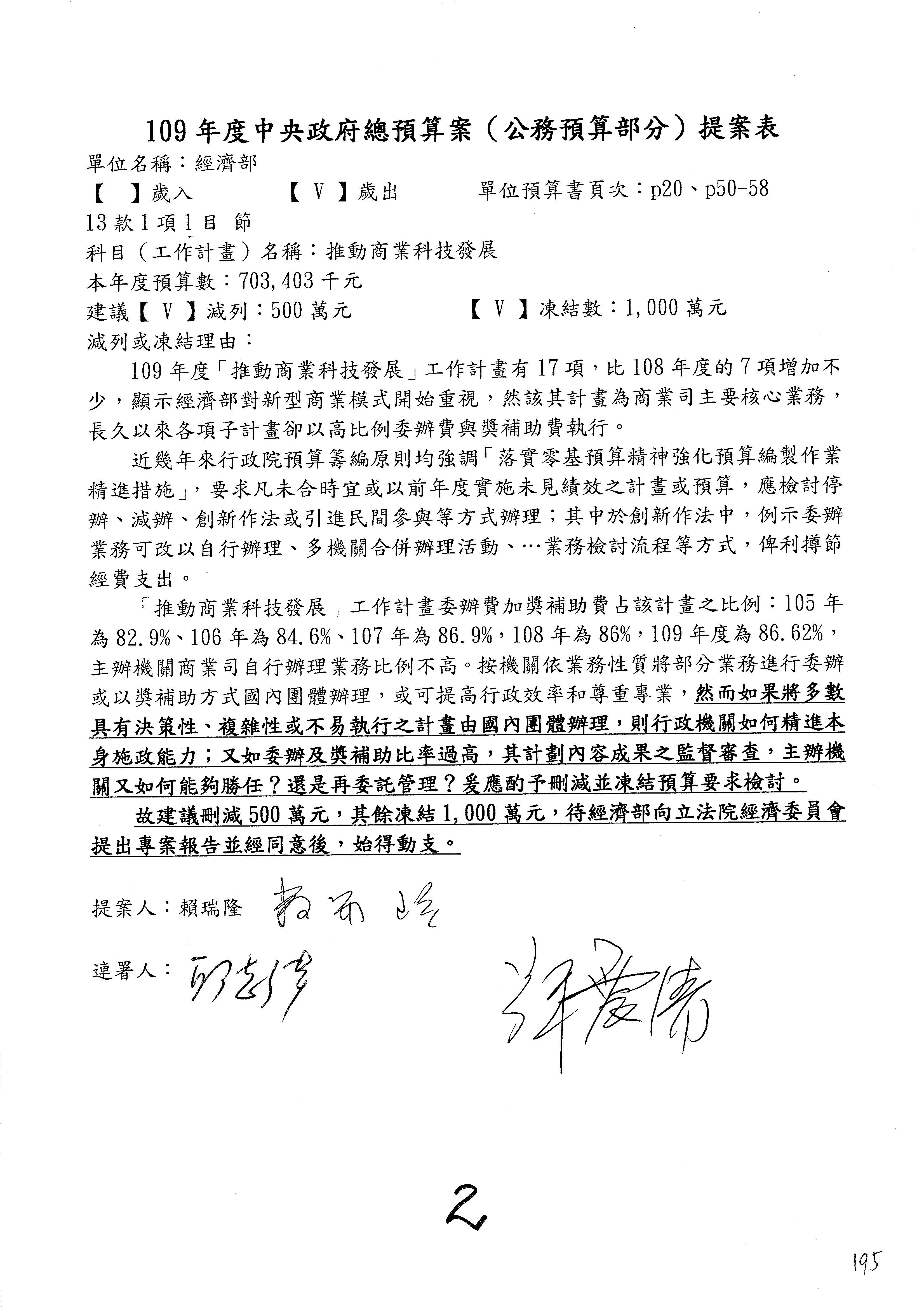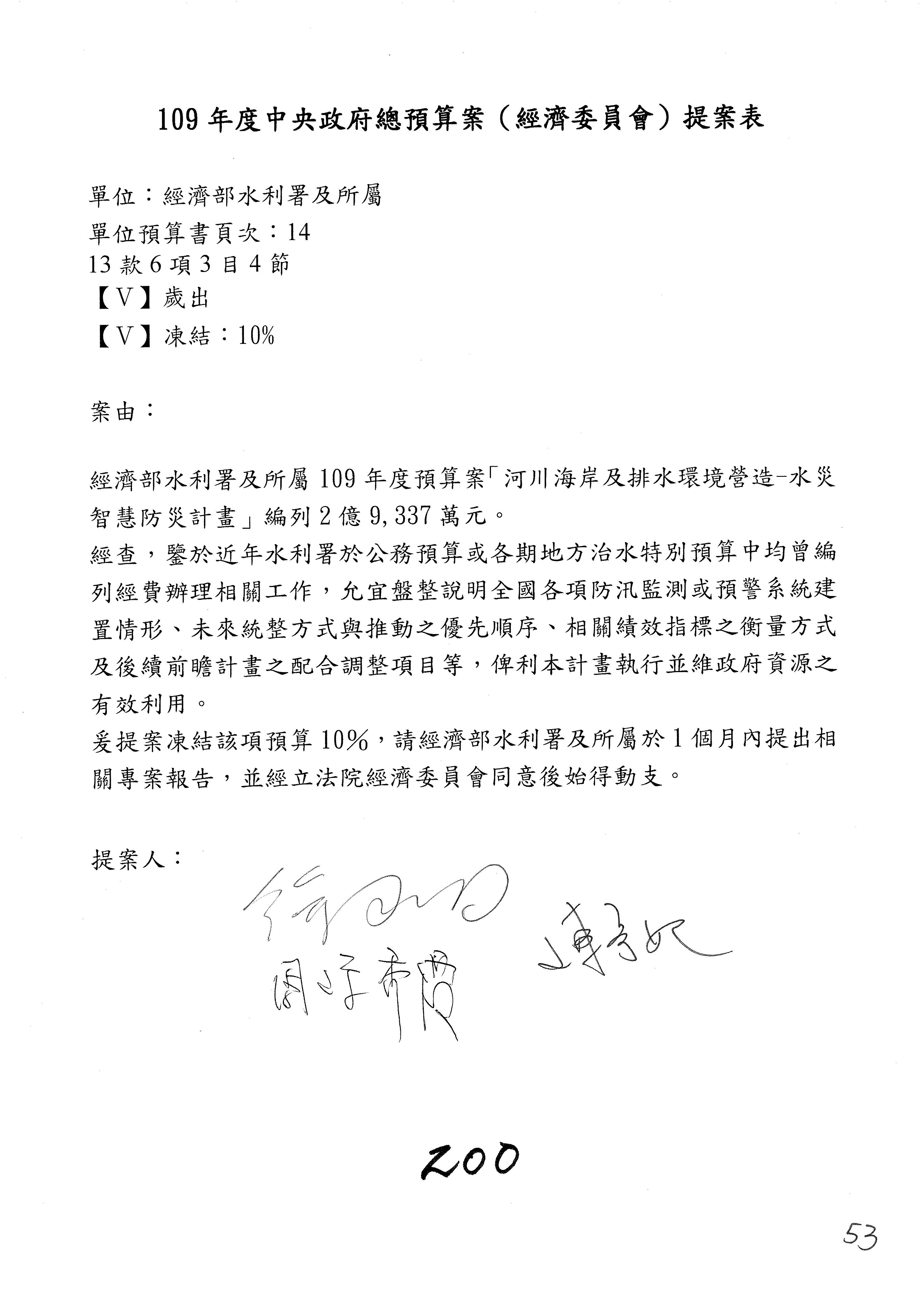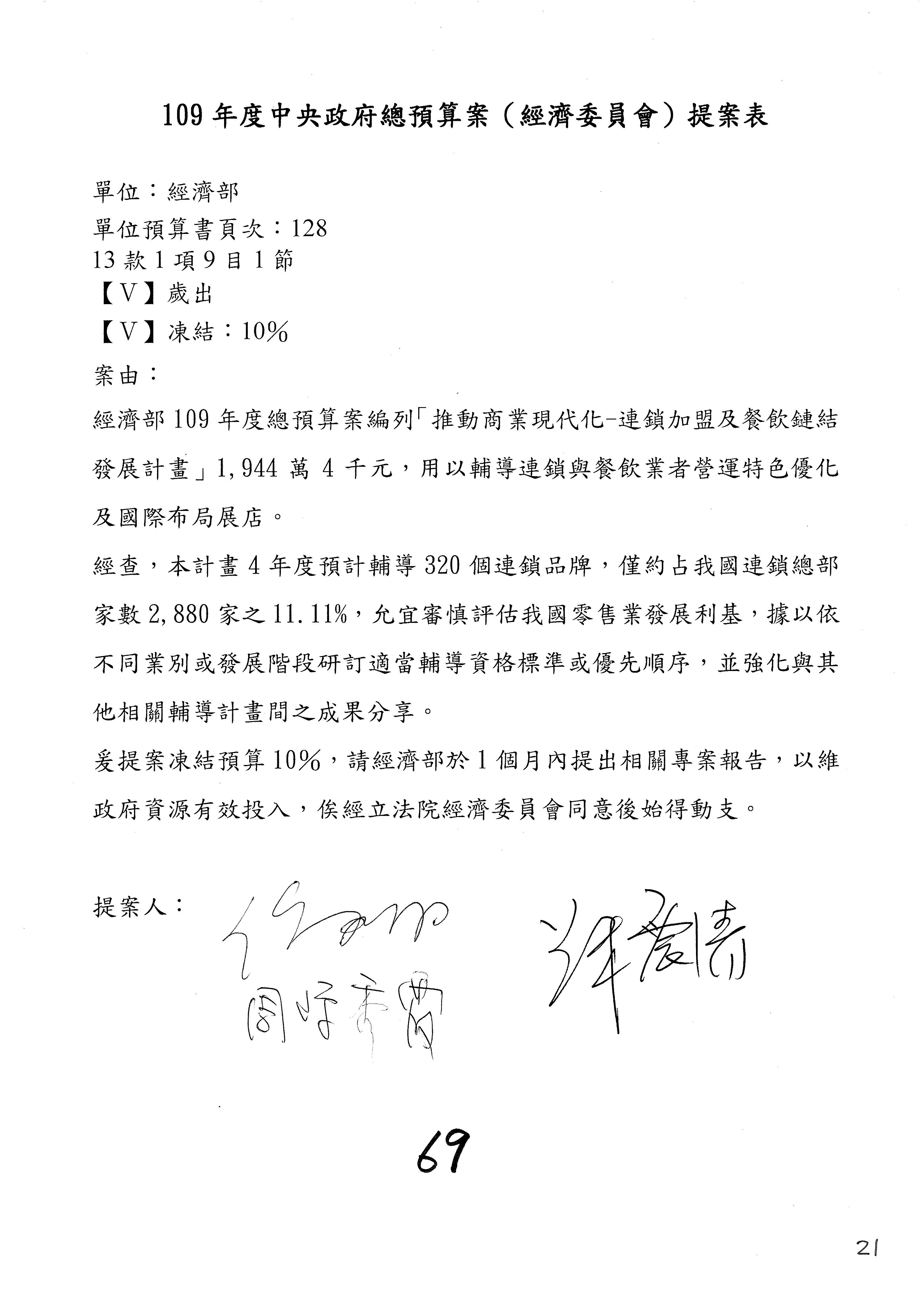 (一)國家發展委員會109年度歲出預算第3目「研擬經濟政策、協調推動財經措施」編列1,773萬3千元,凍結5%,俟向立法院經濟委員會提出書面報告後,始得動支。