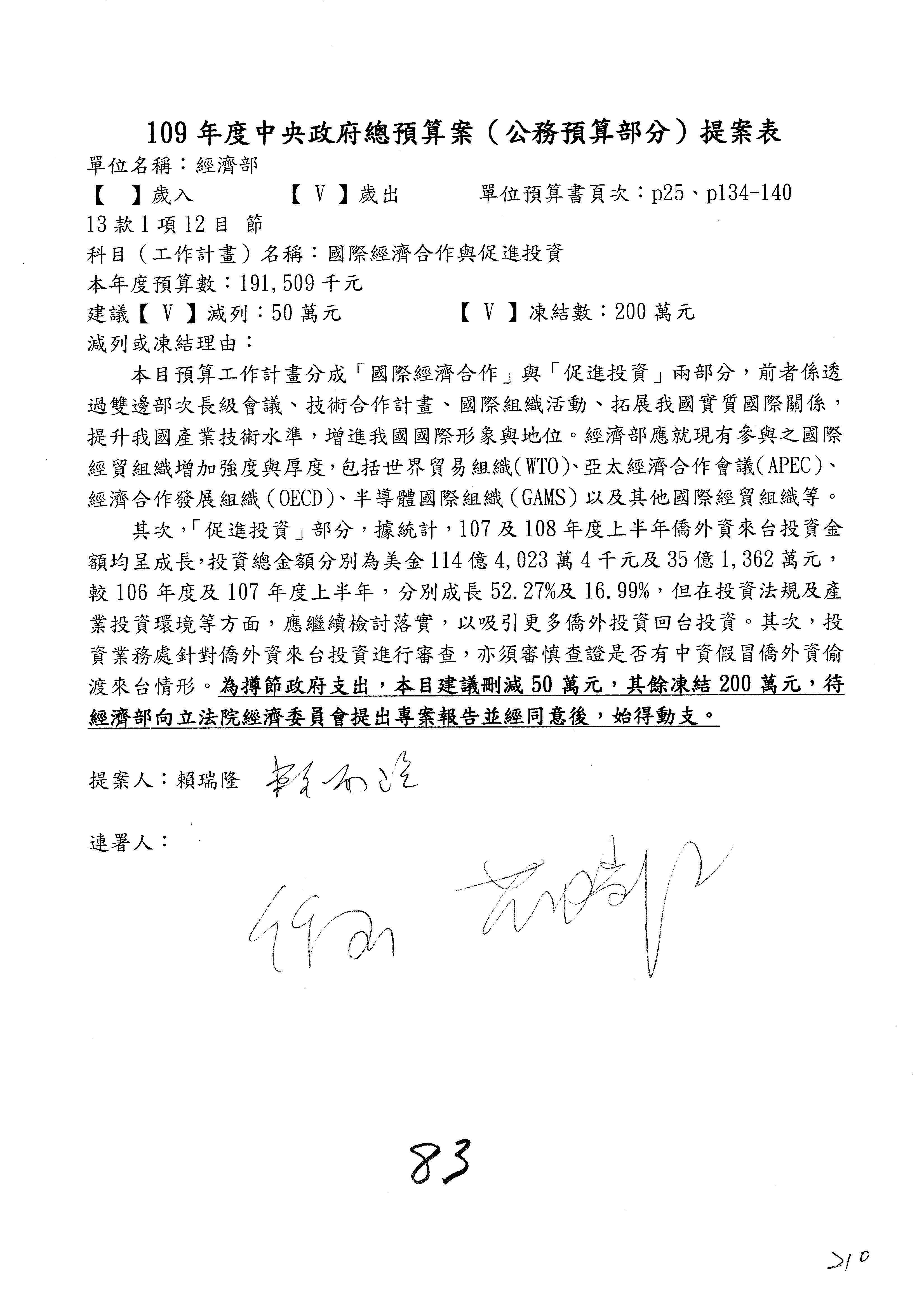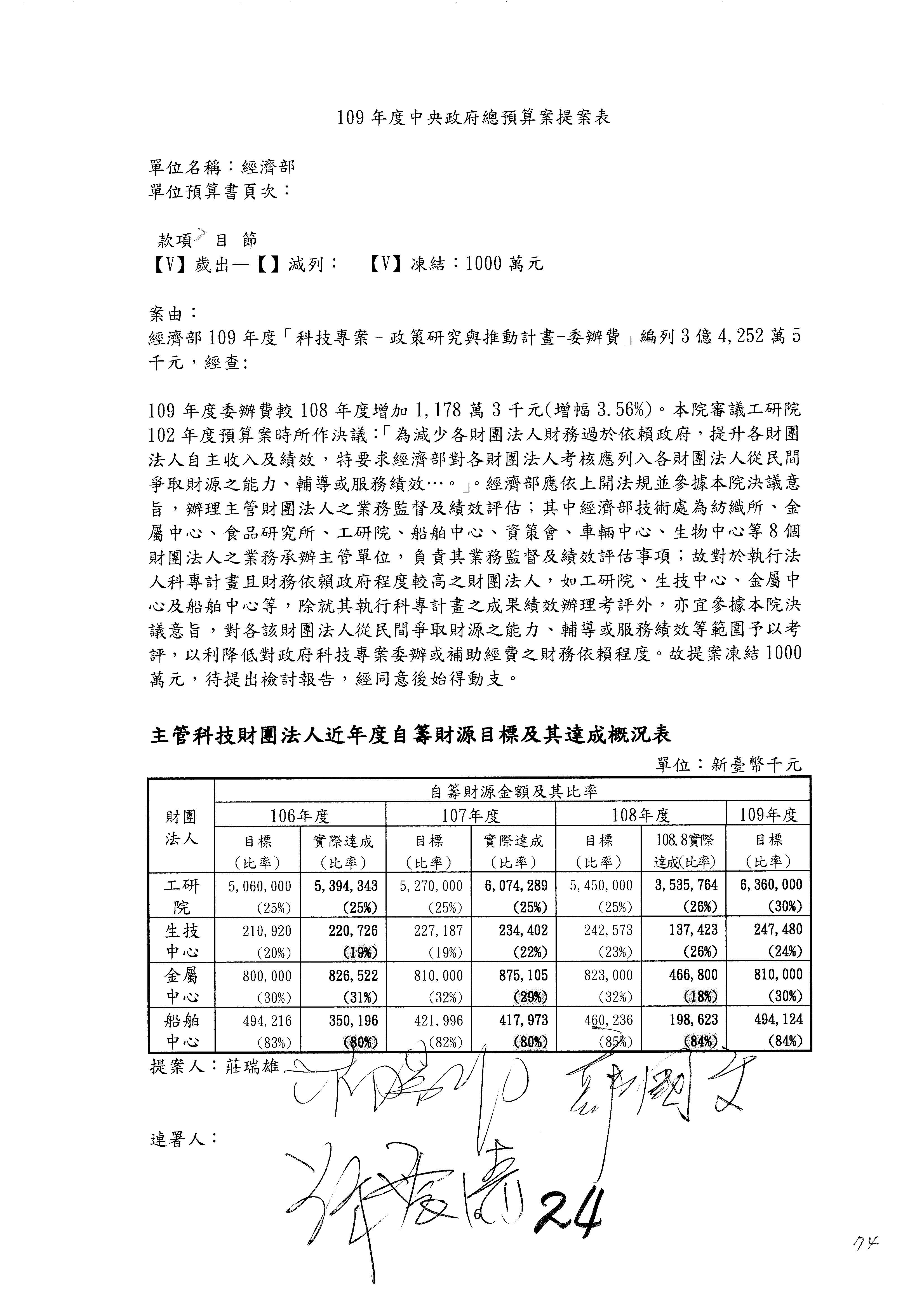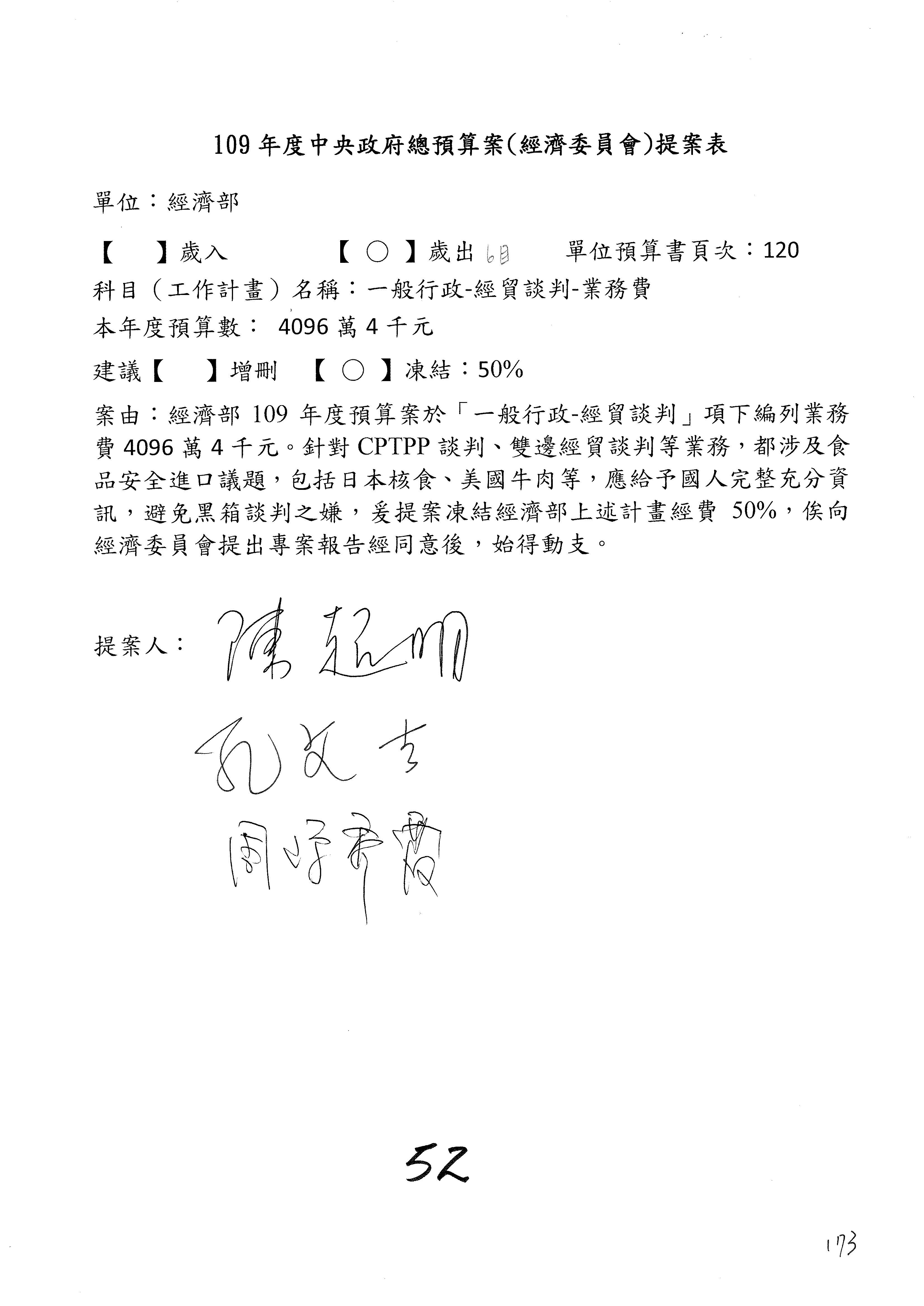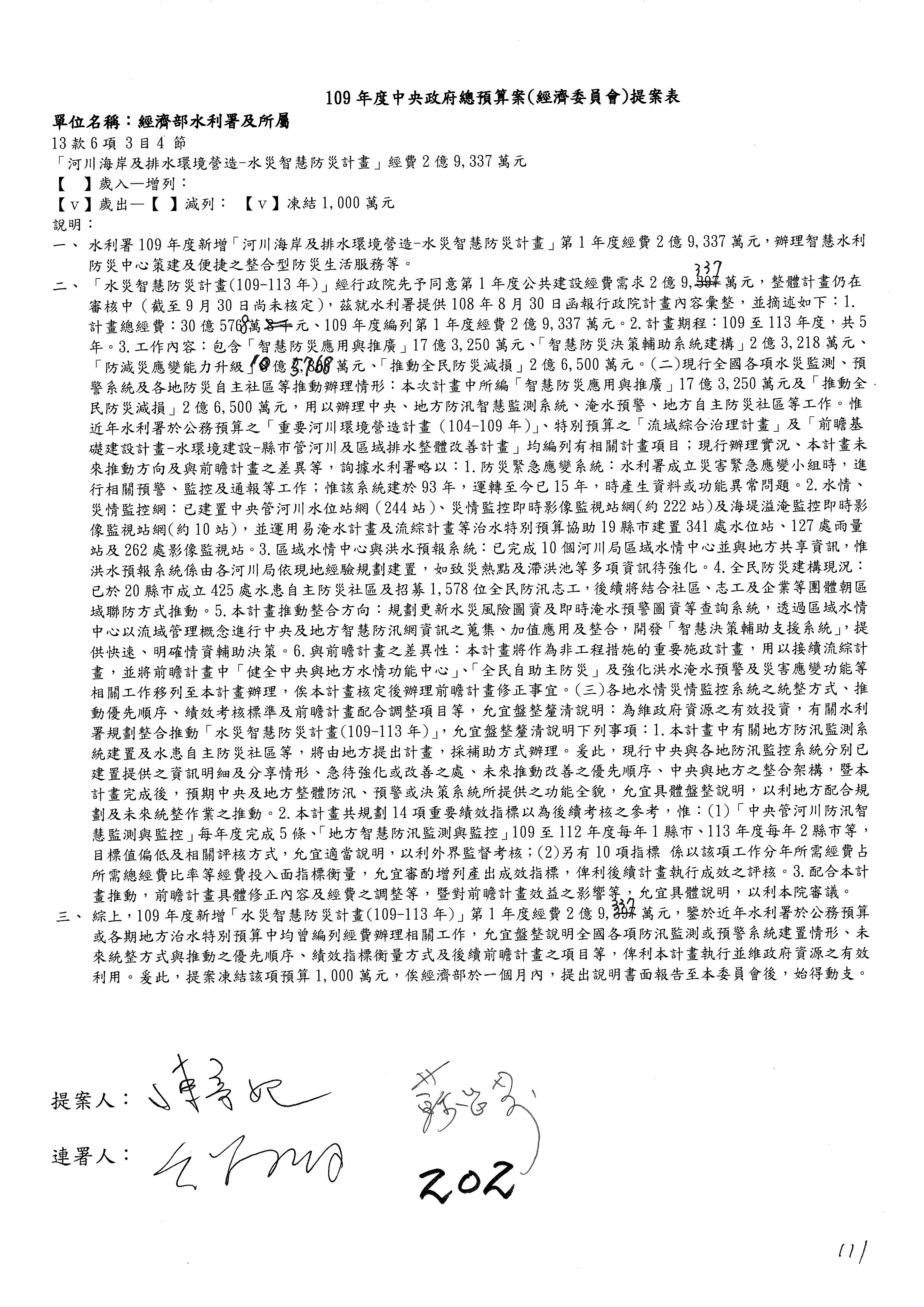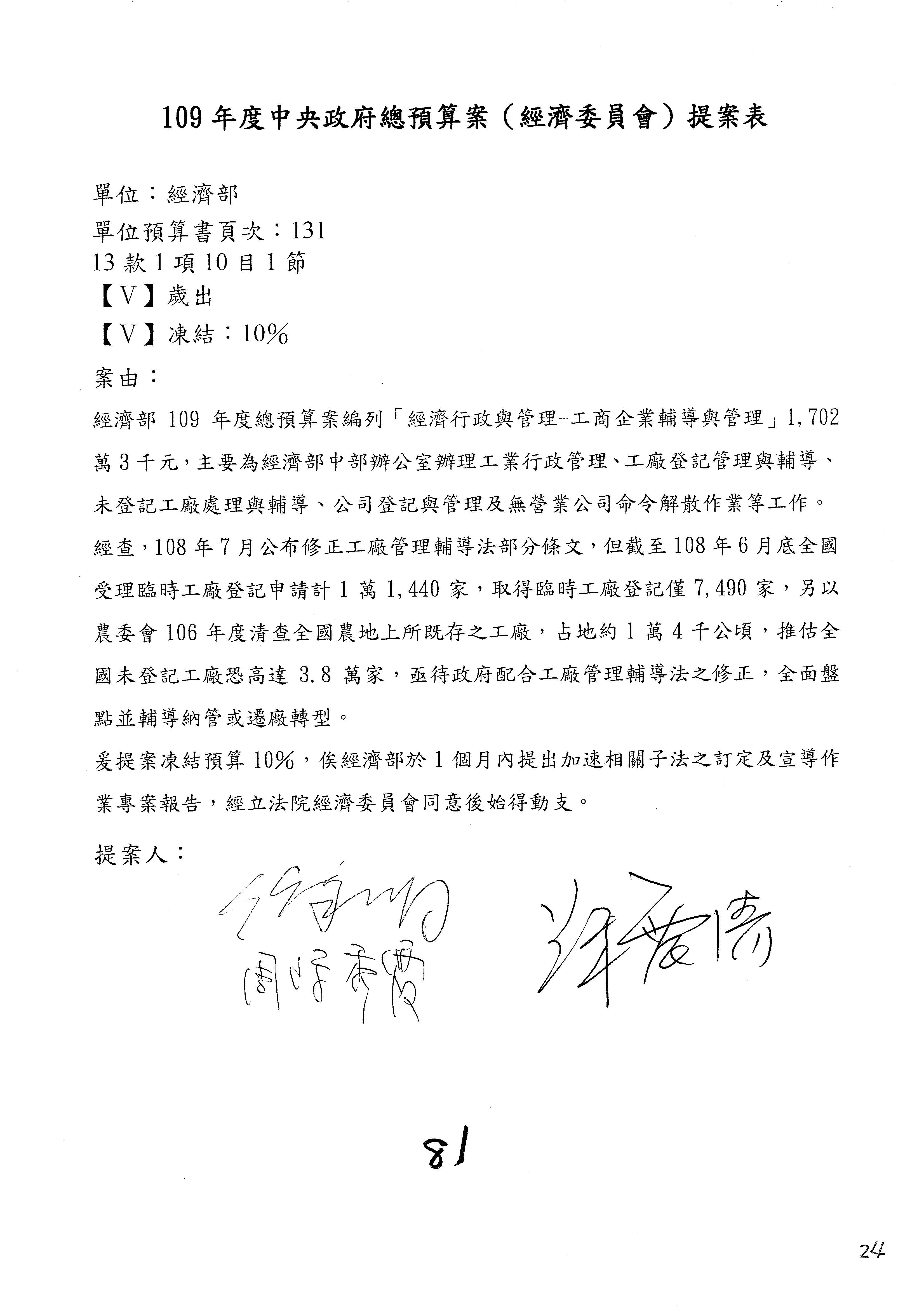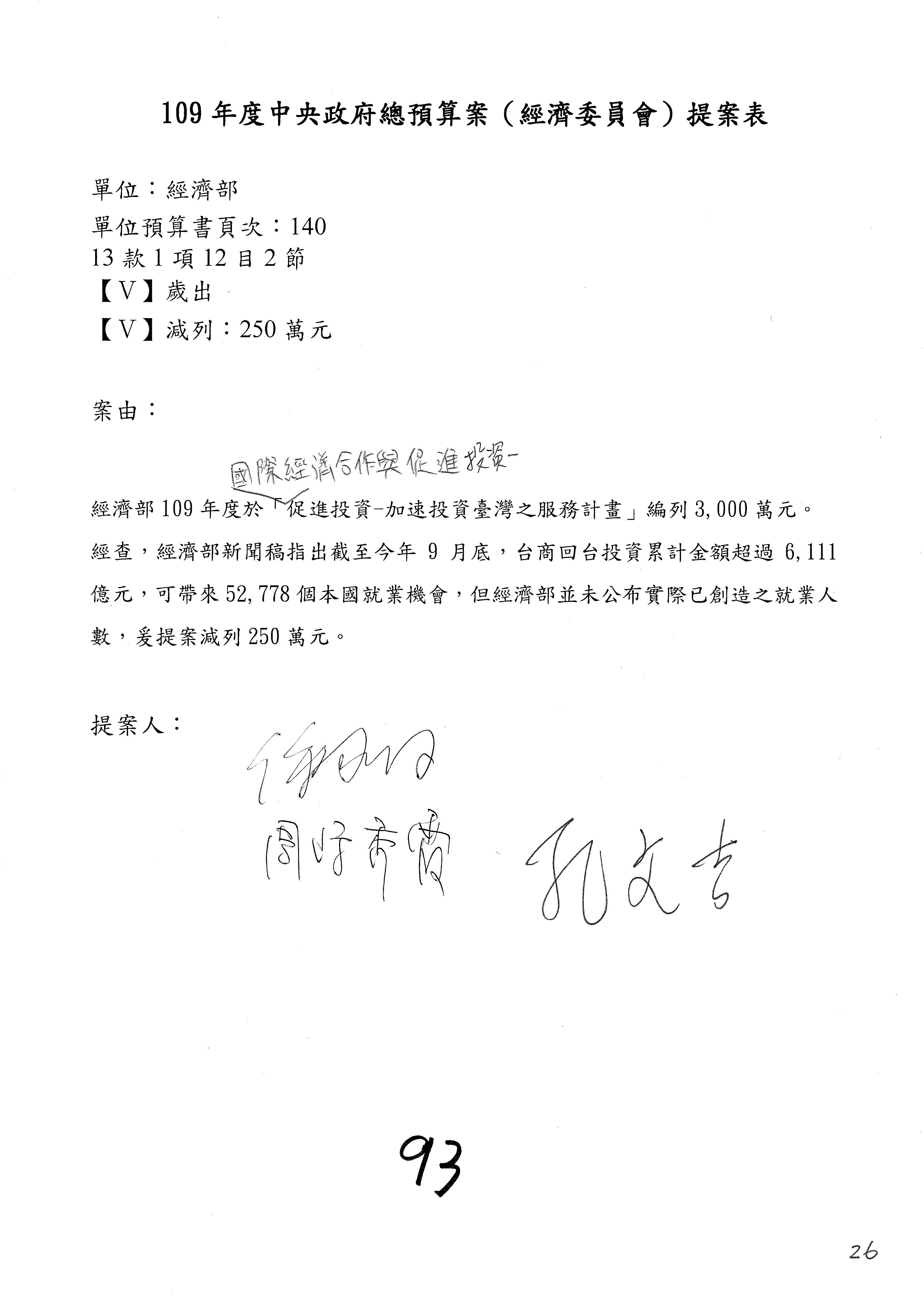 (一)國家發展委員會109年度歲出預算第3目「研擬經濟政策、協調推動財經措施」編列1,773萬3千元,凍結5%,俟向立法院經濟委員會提出書面報告後,始得動支。