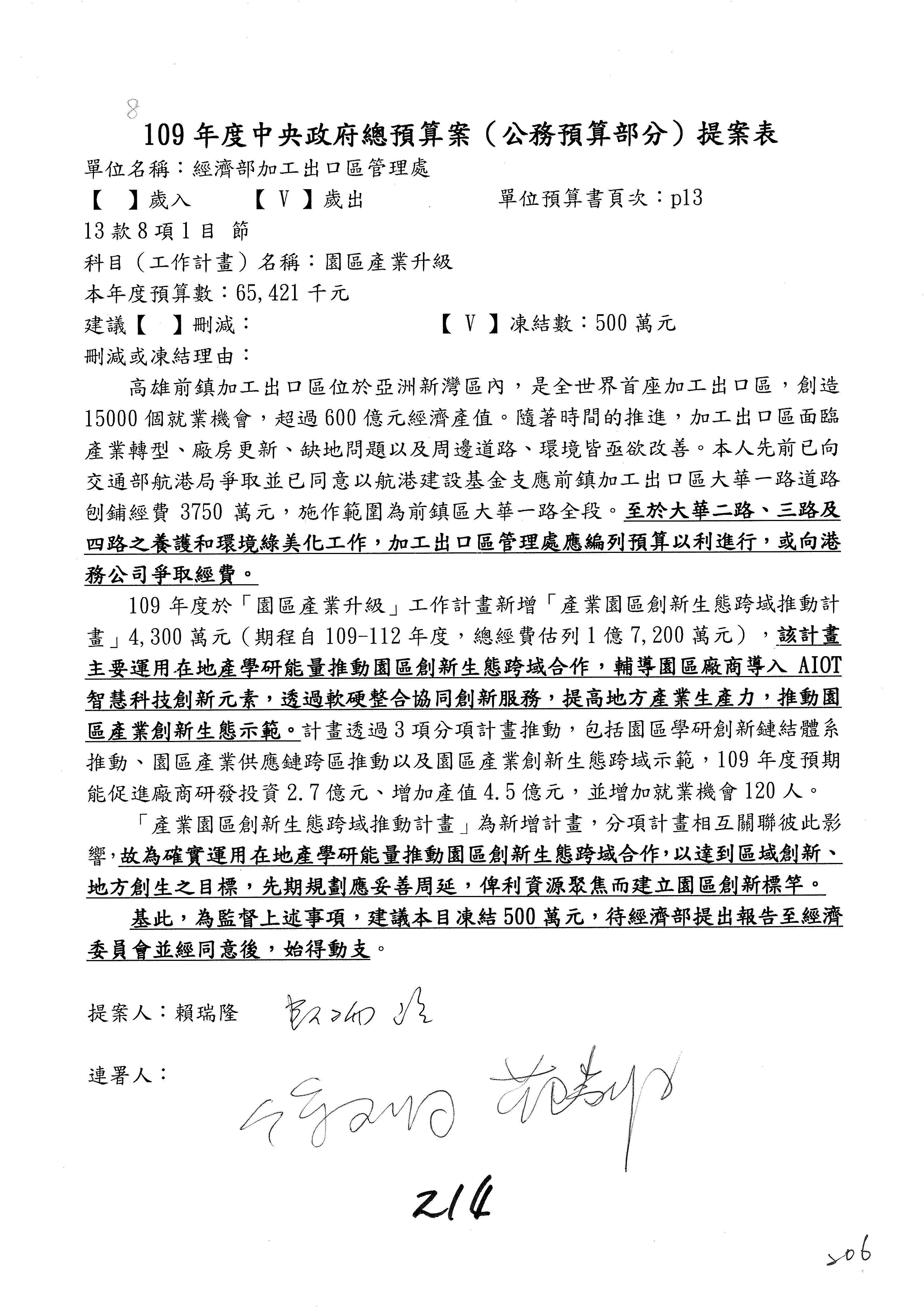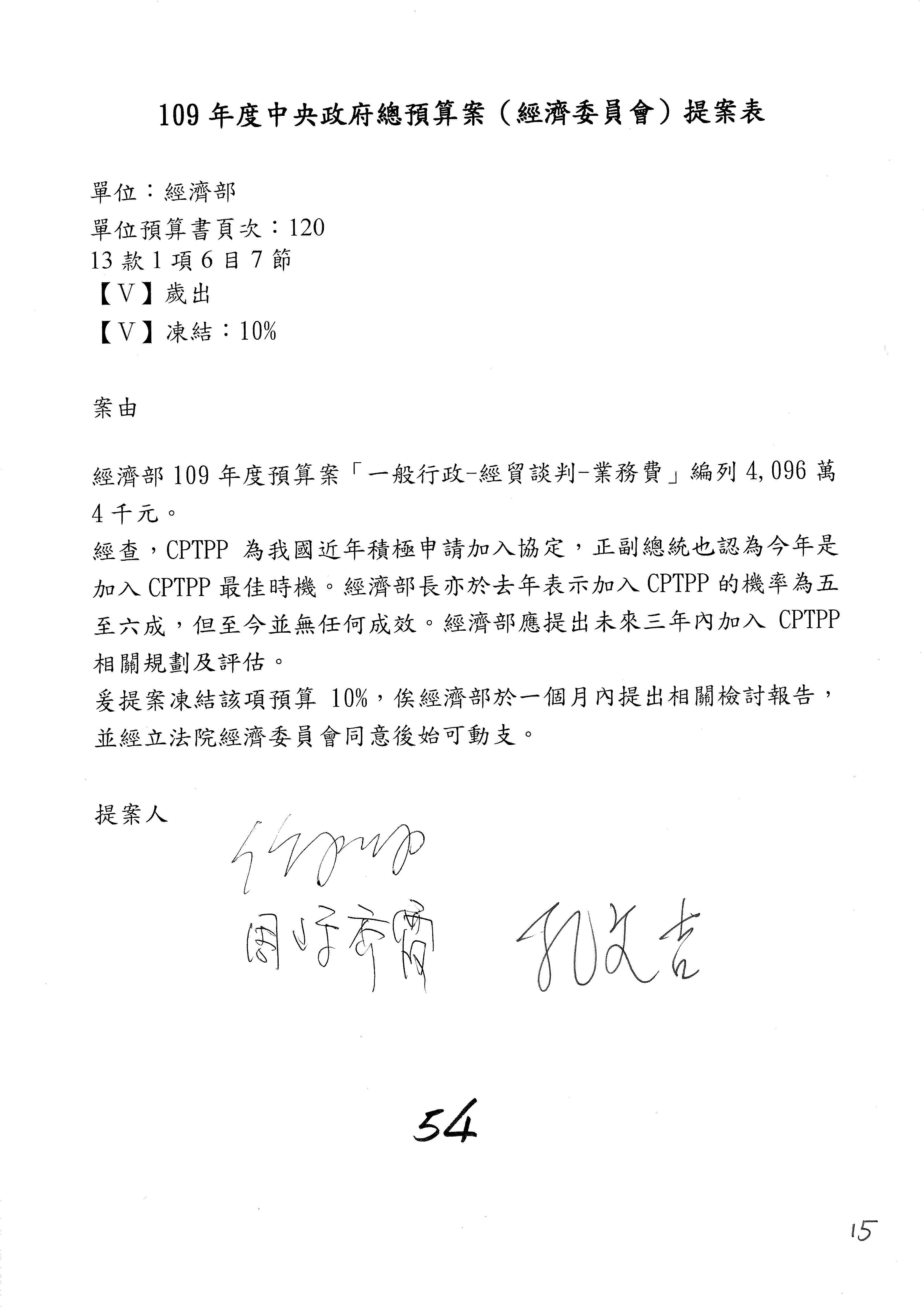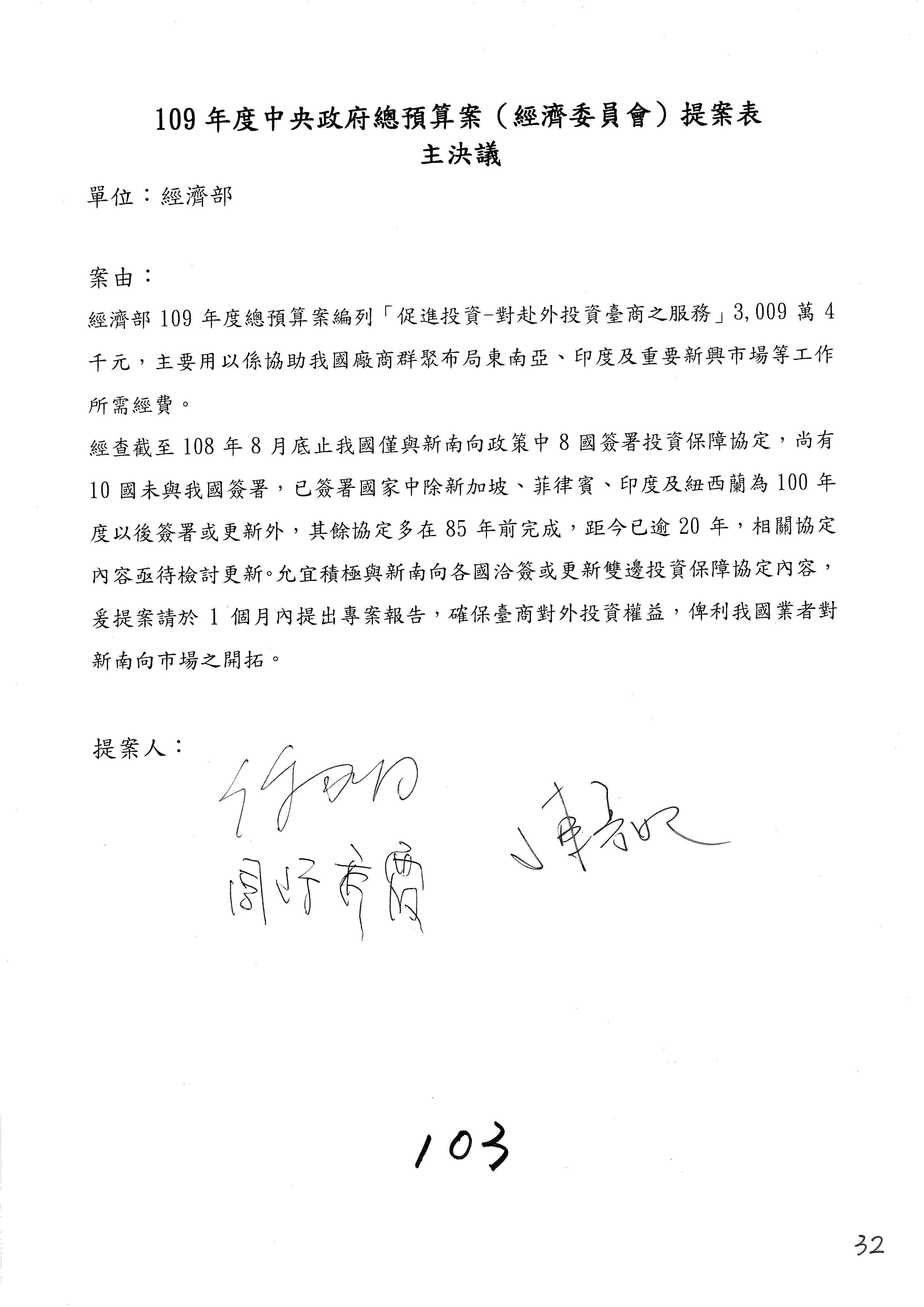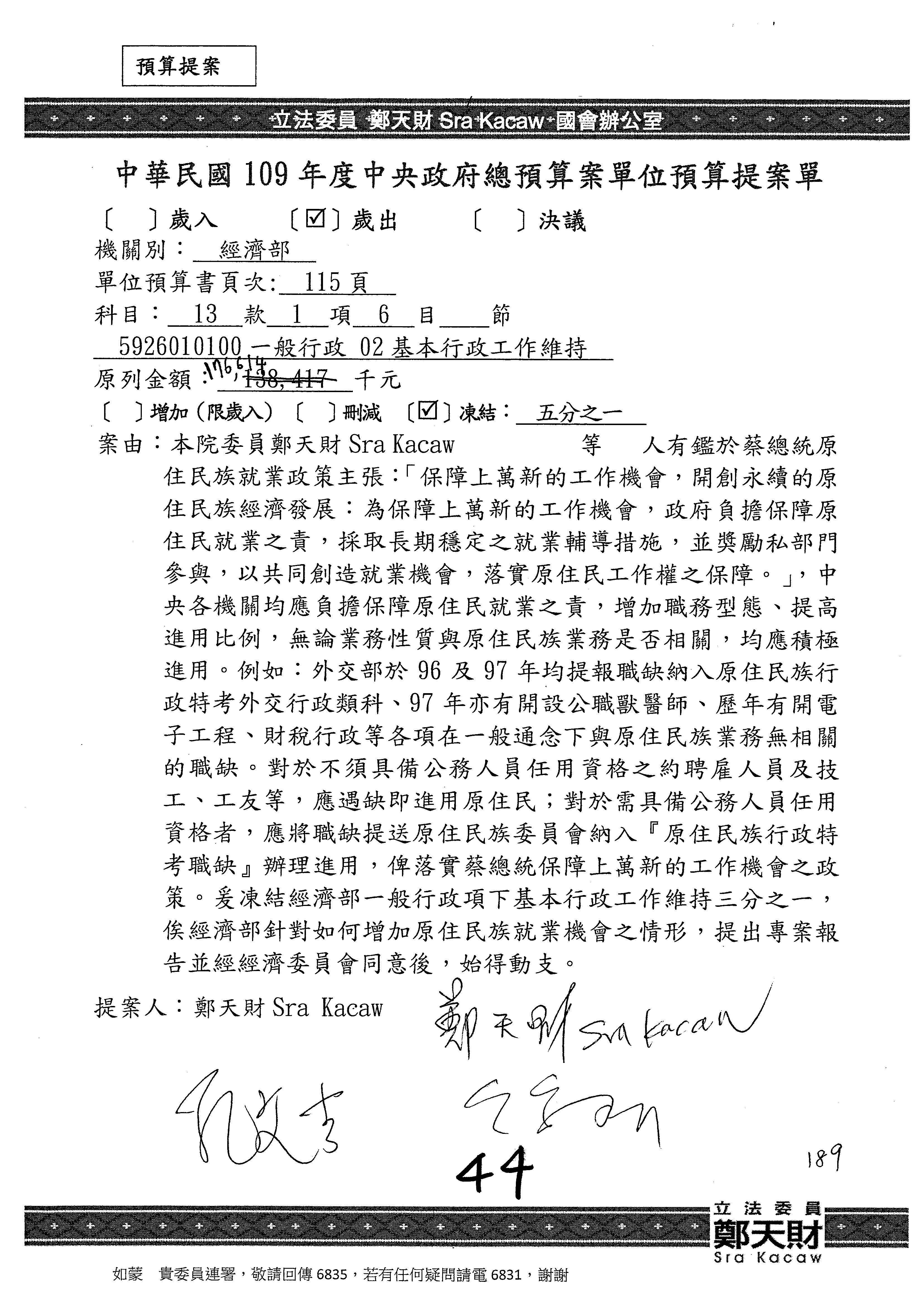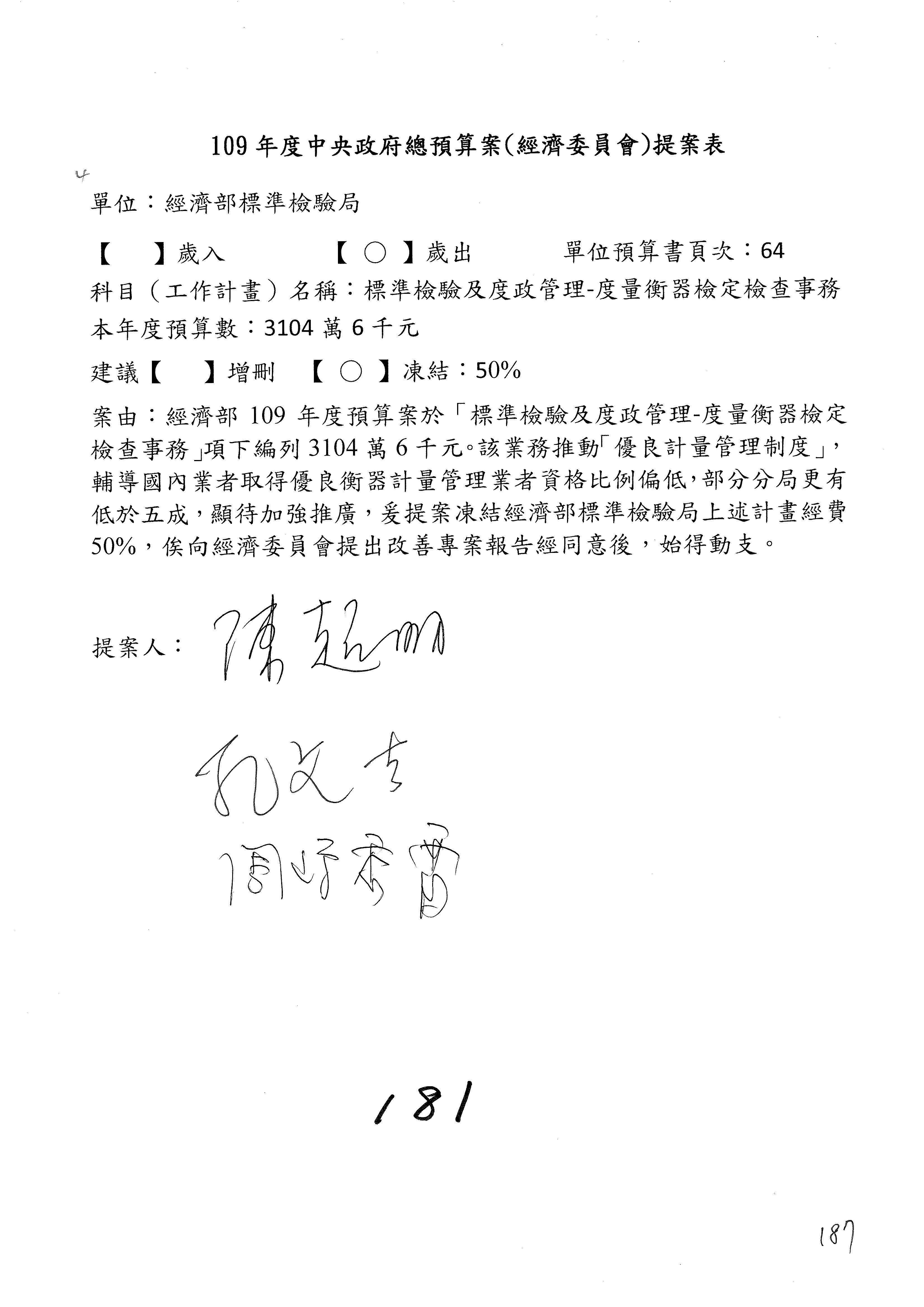 (一)國家發展委員會109年度歲出預算第3目「研擬經濟政策、協調推動財經措施」編列1,773萬3千元,凍結5%,俟向立法院經濟委員會提出書面報告後,始得動支。