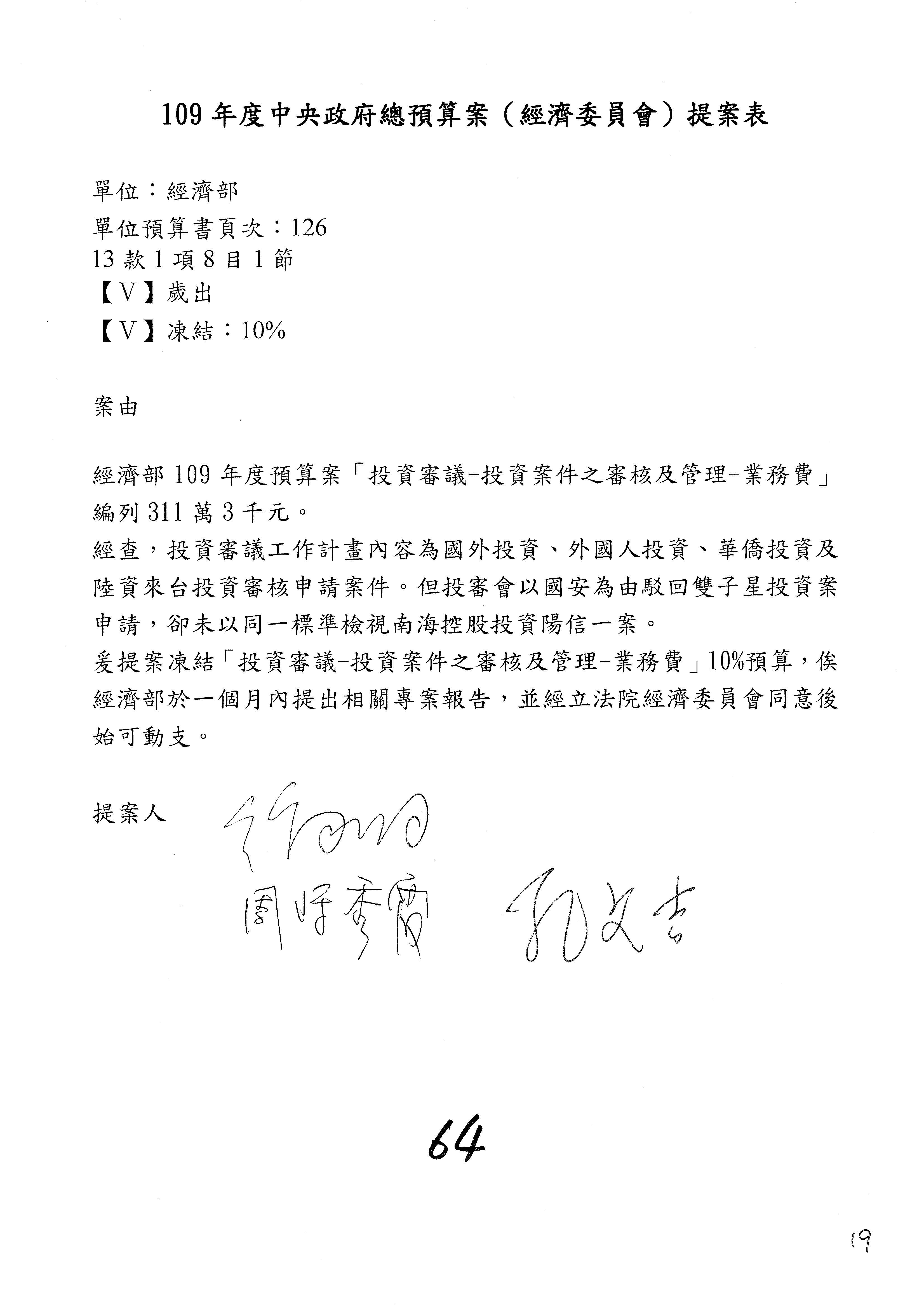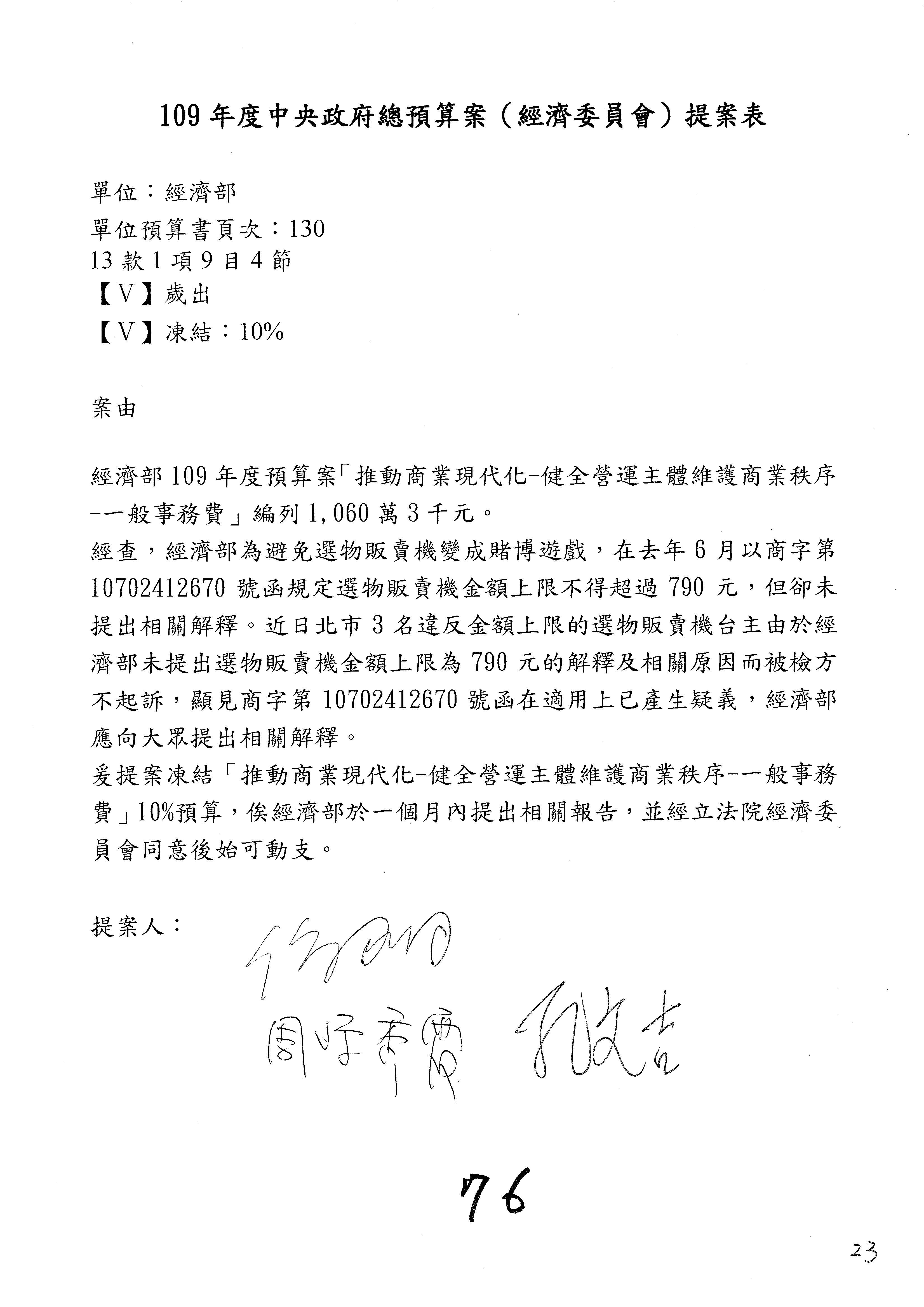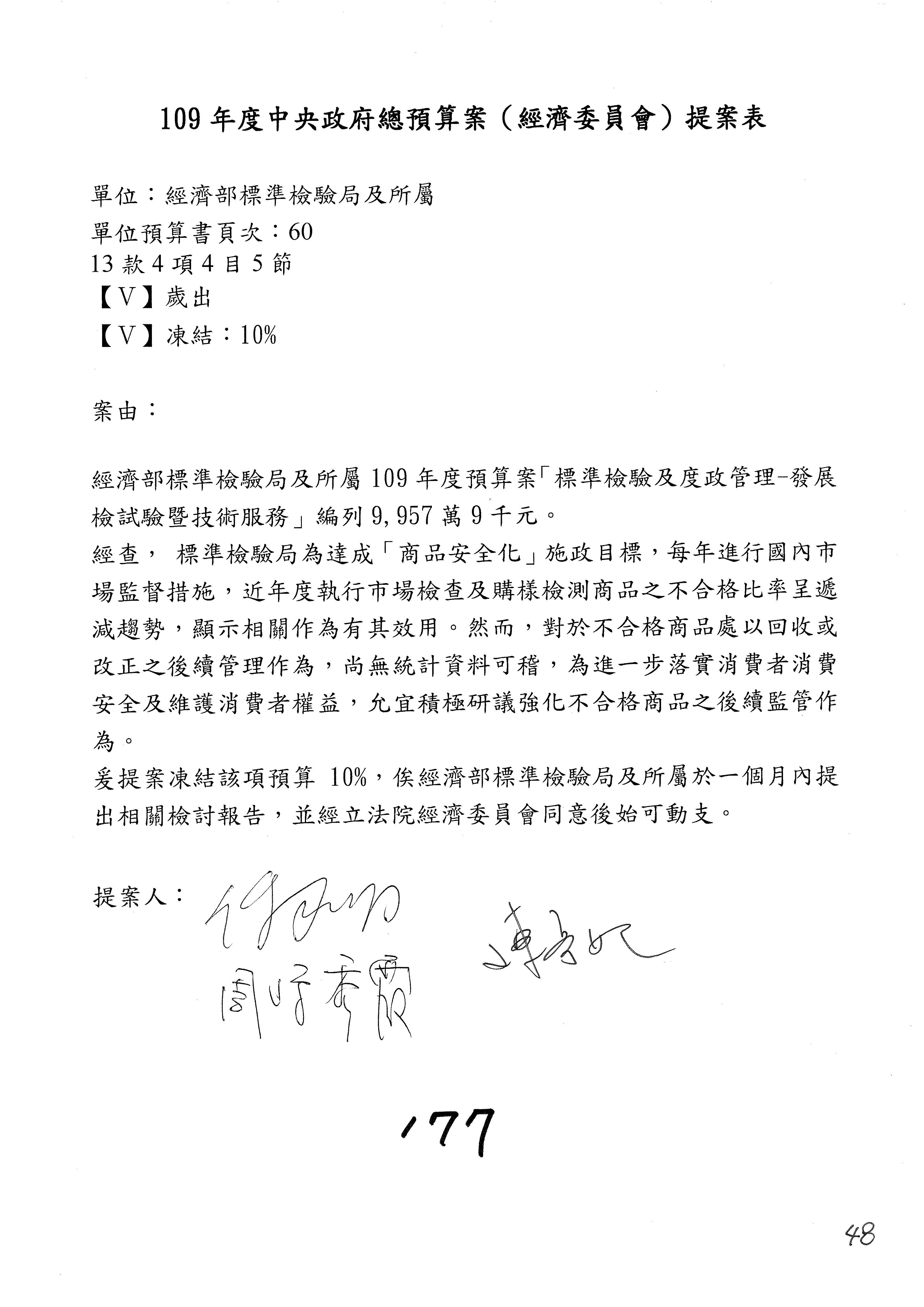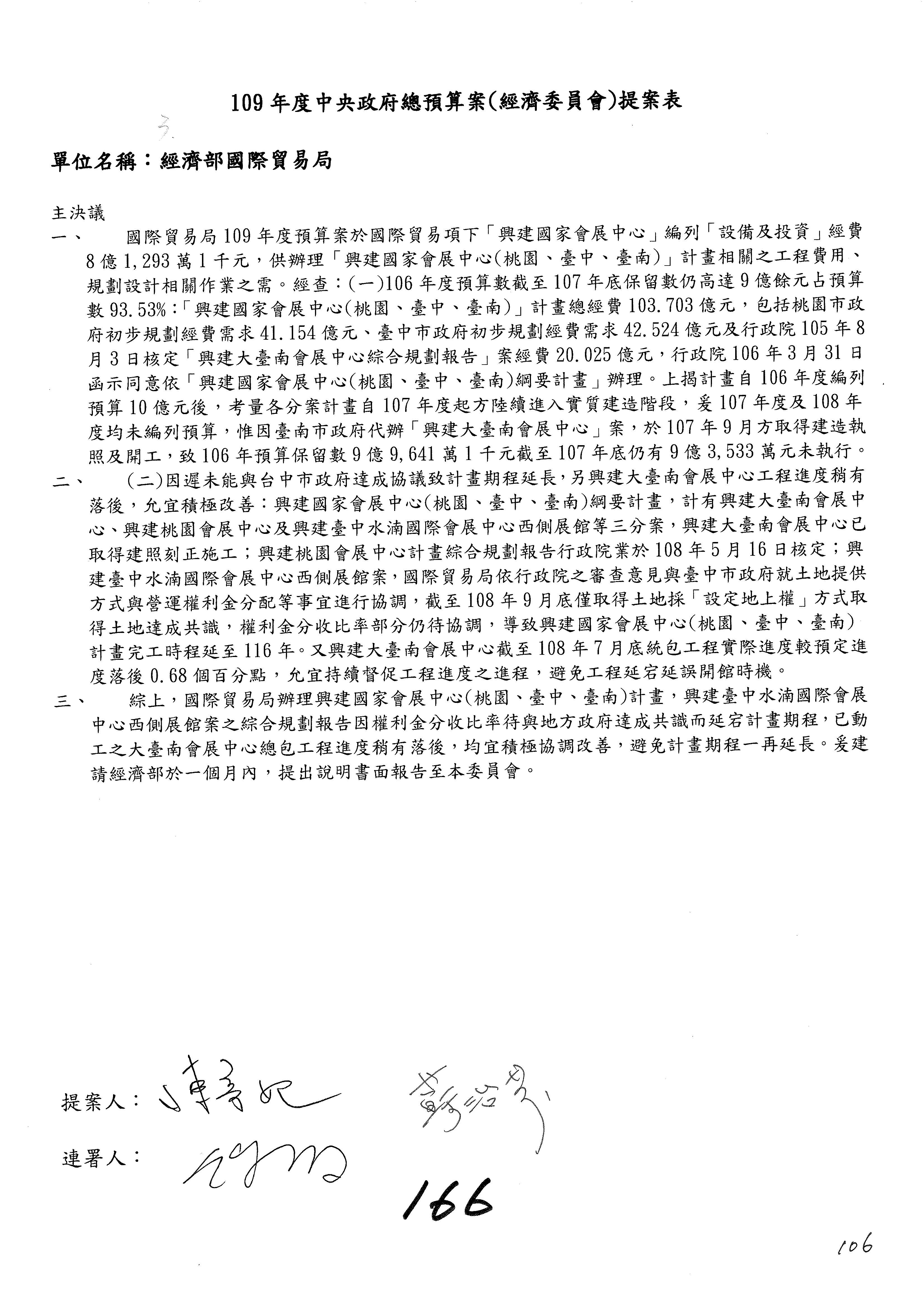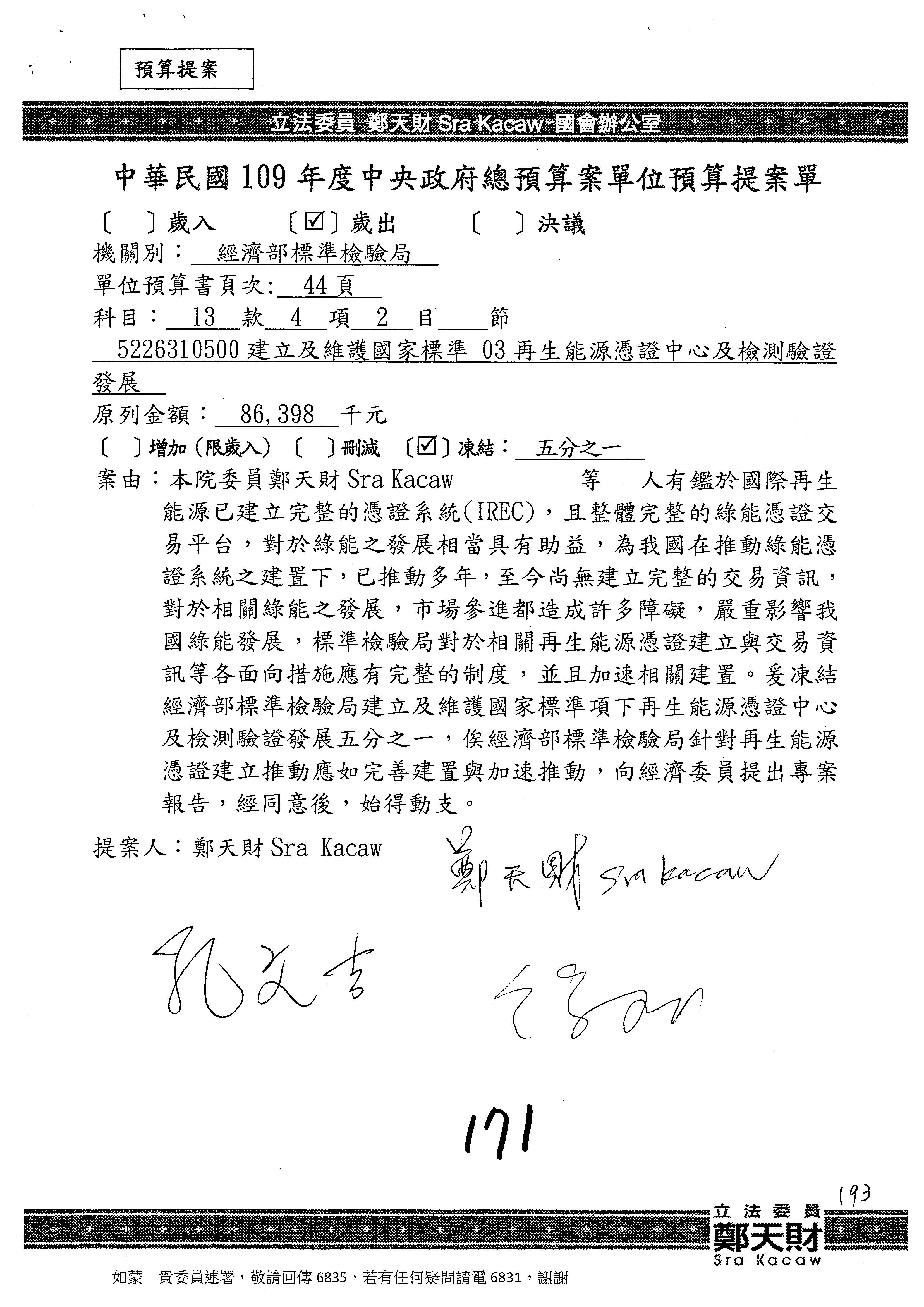 (一)國家發展委員會109年度歲出預算第3目「研擬經濟政策、協調推動財經措施」編列1,773萬3千元,凍結5%,俟向立法院經濟委員會提出書面報告後,始得動支。