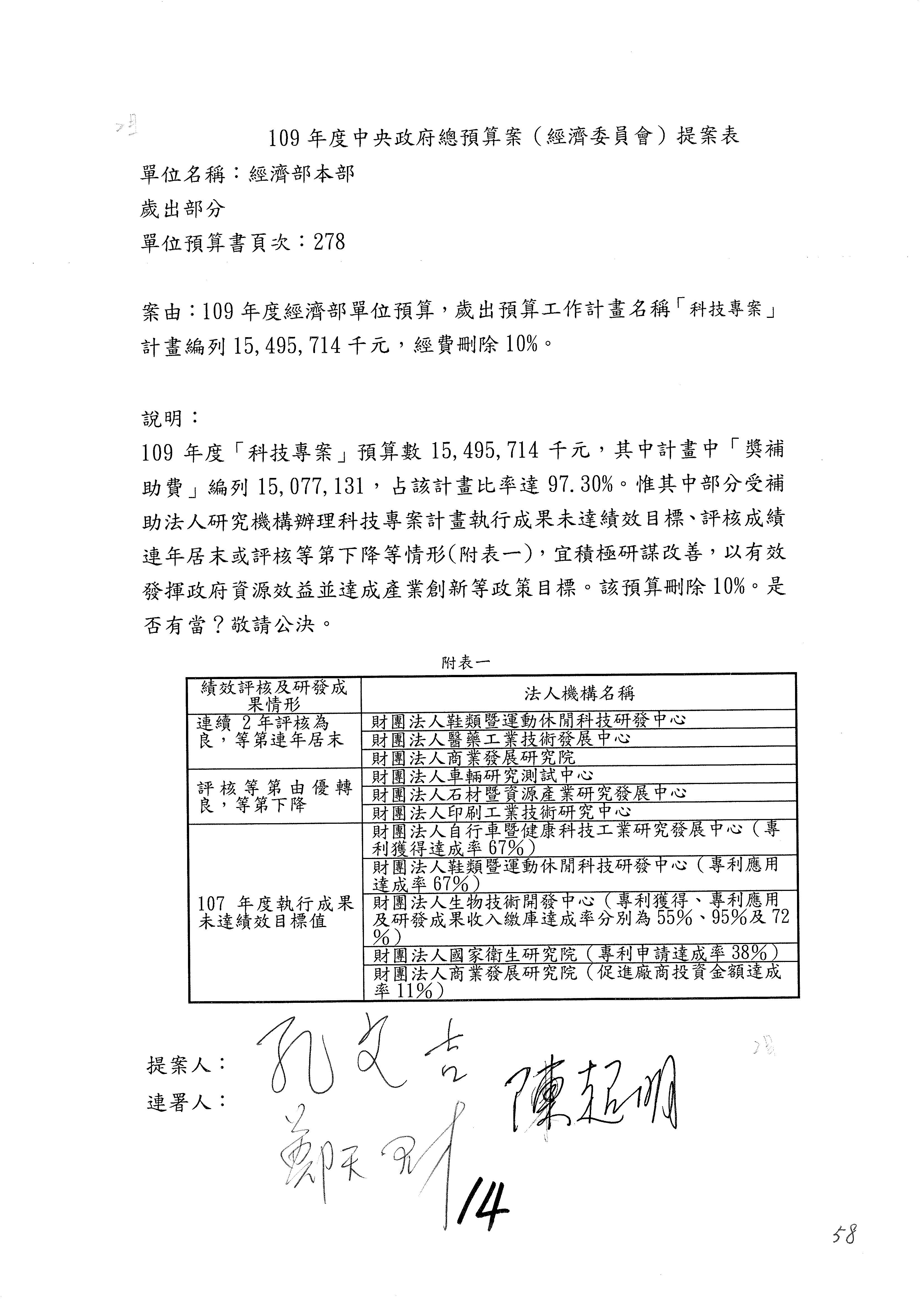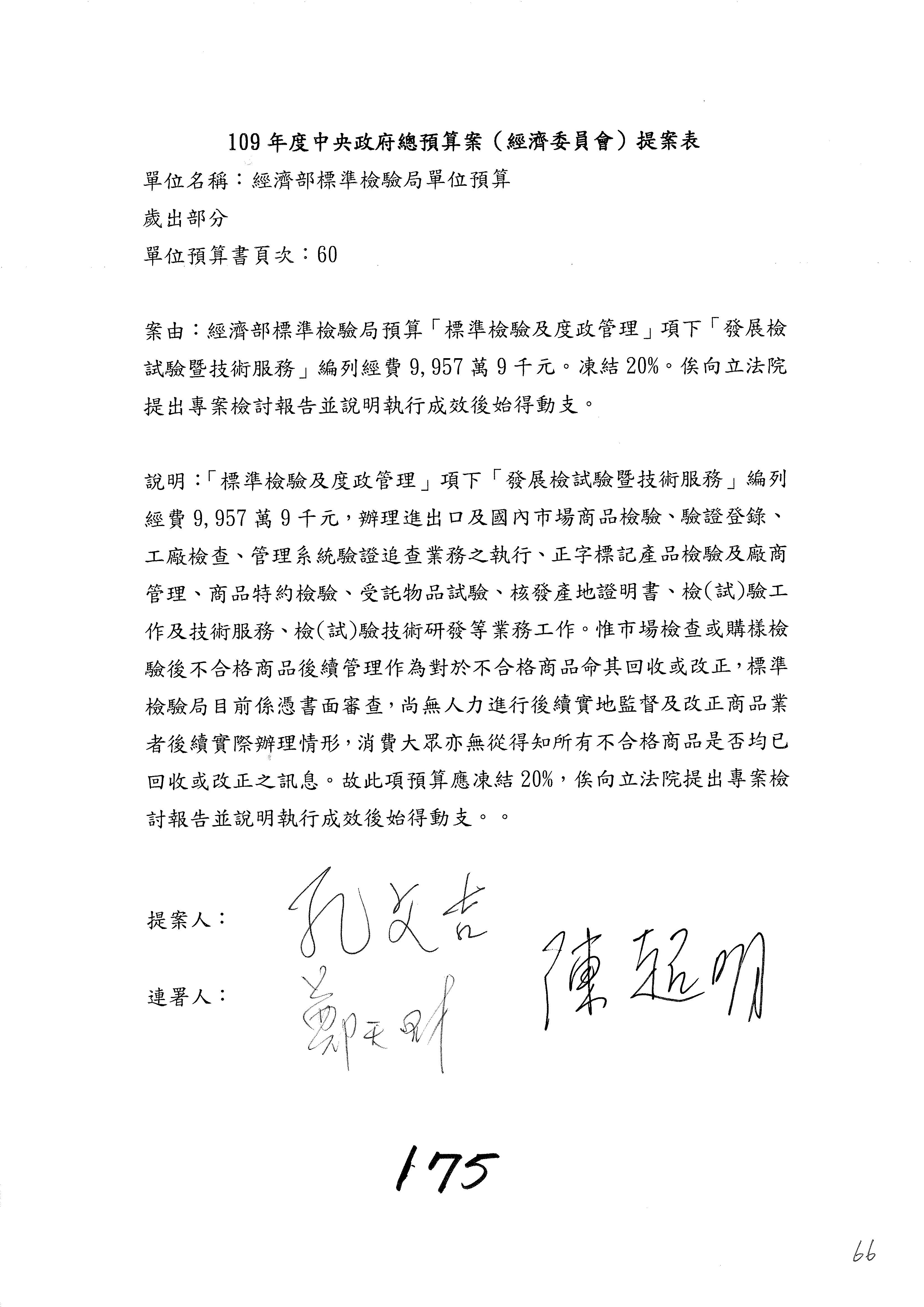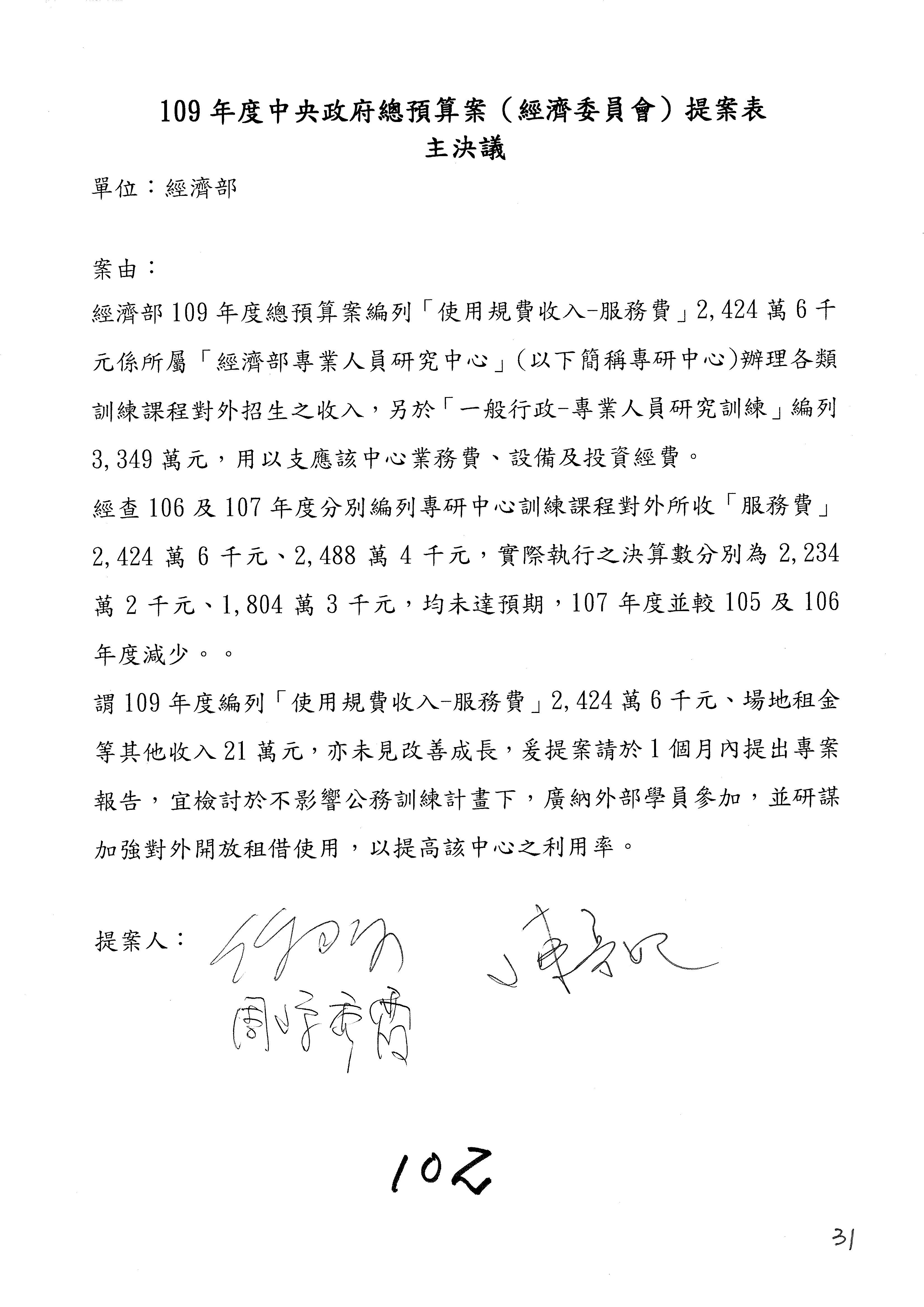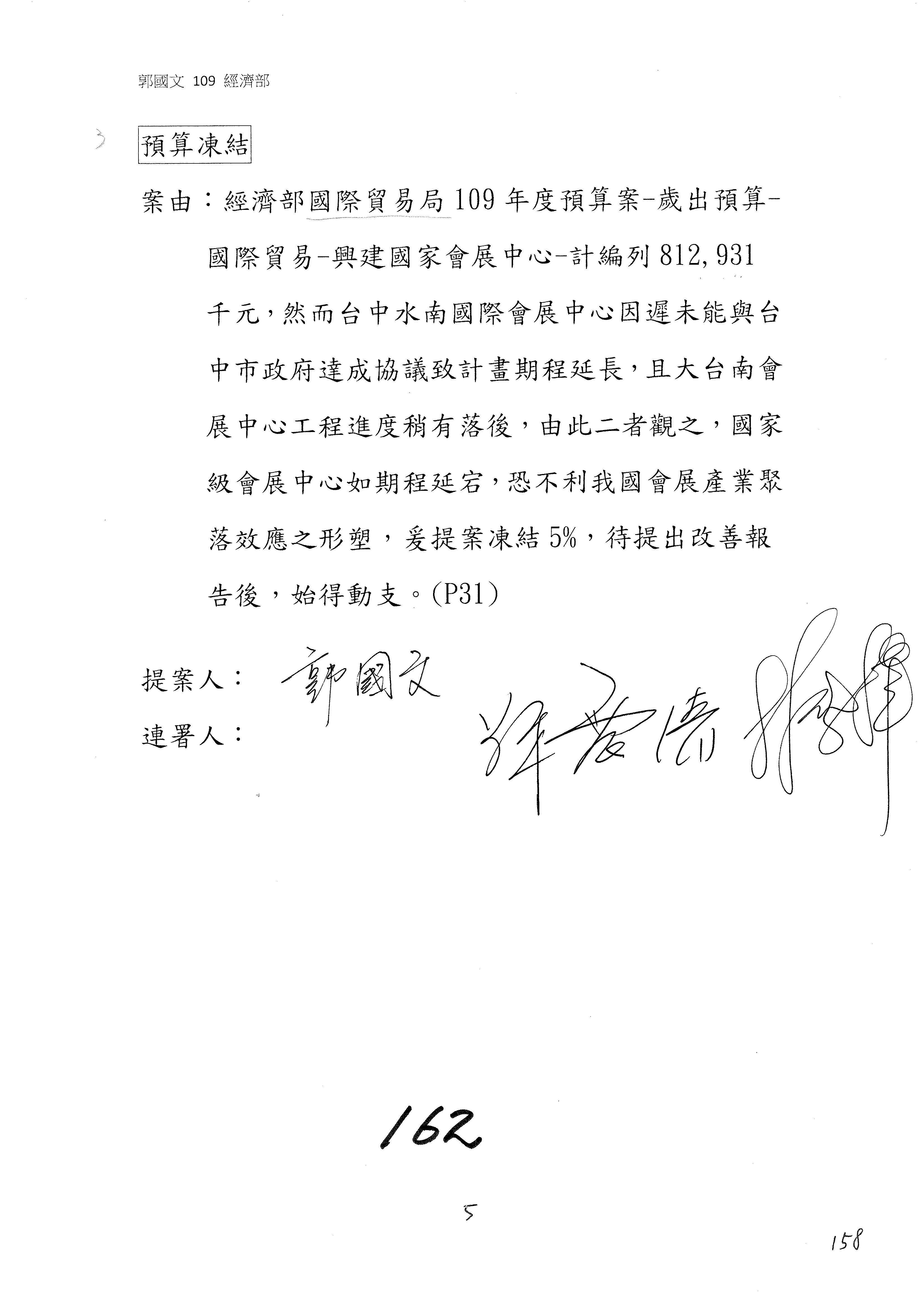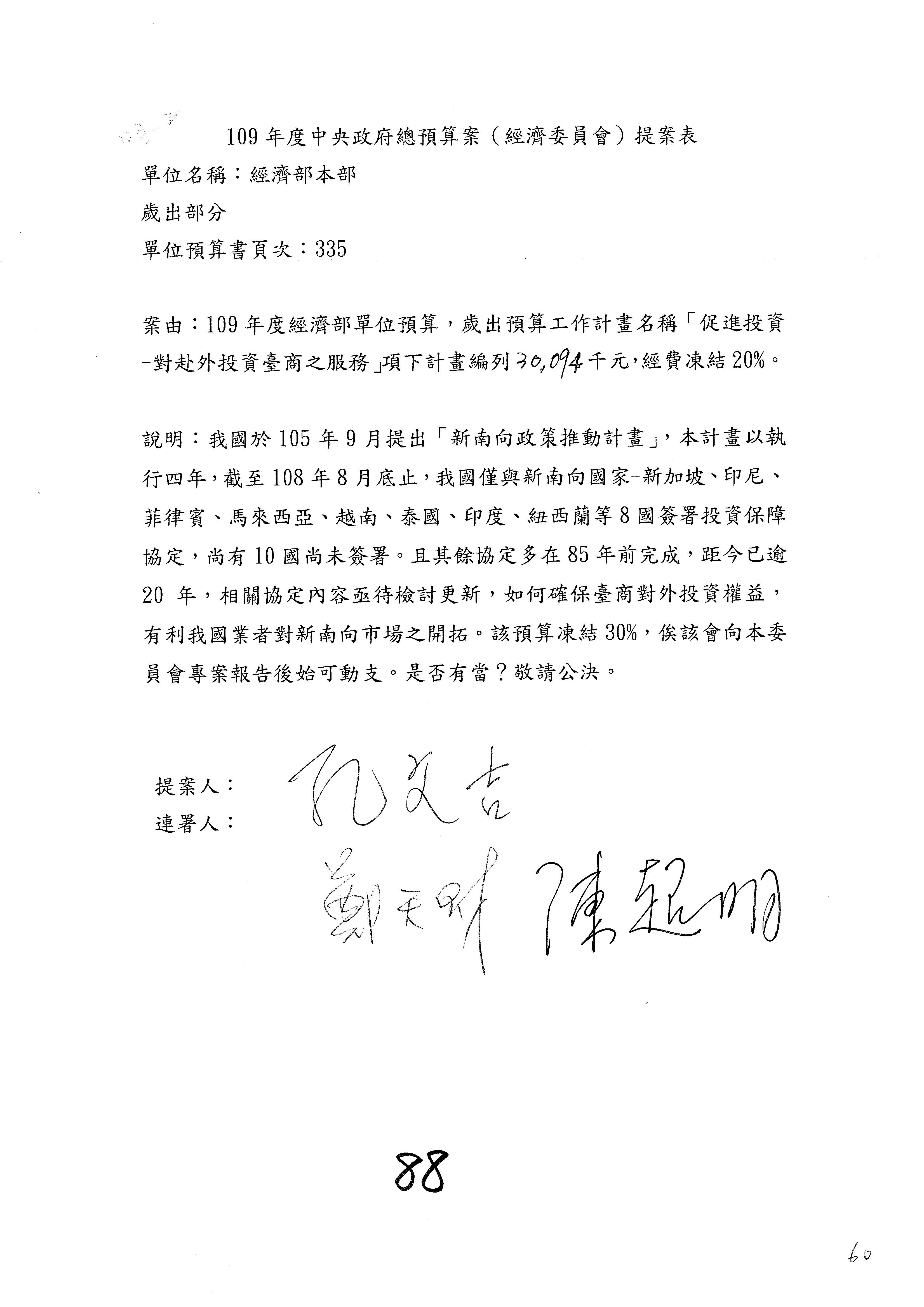 (一)國家發展委員會109年度歲出預算第3目「研擬經濟政策、協調推動財經措施」編列1,773萬3千元,凍結5%,俟向立法院經濟委員會提出書面報告後,始得動支。
