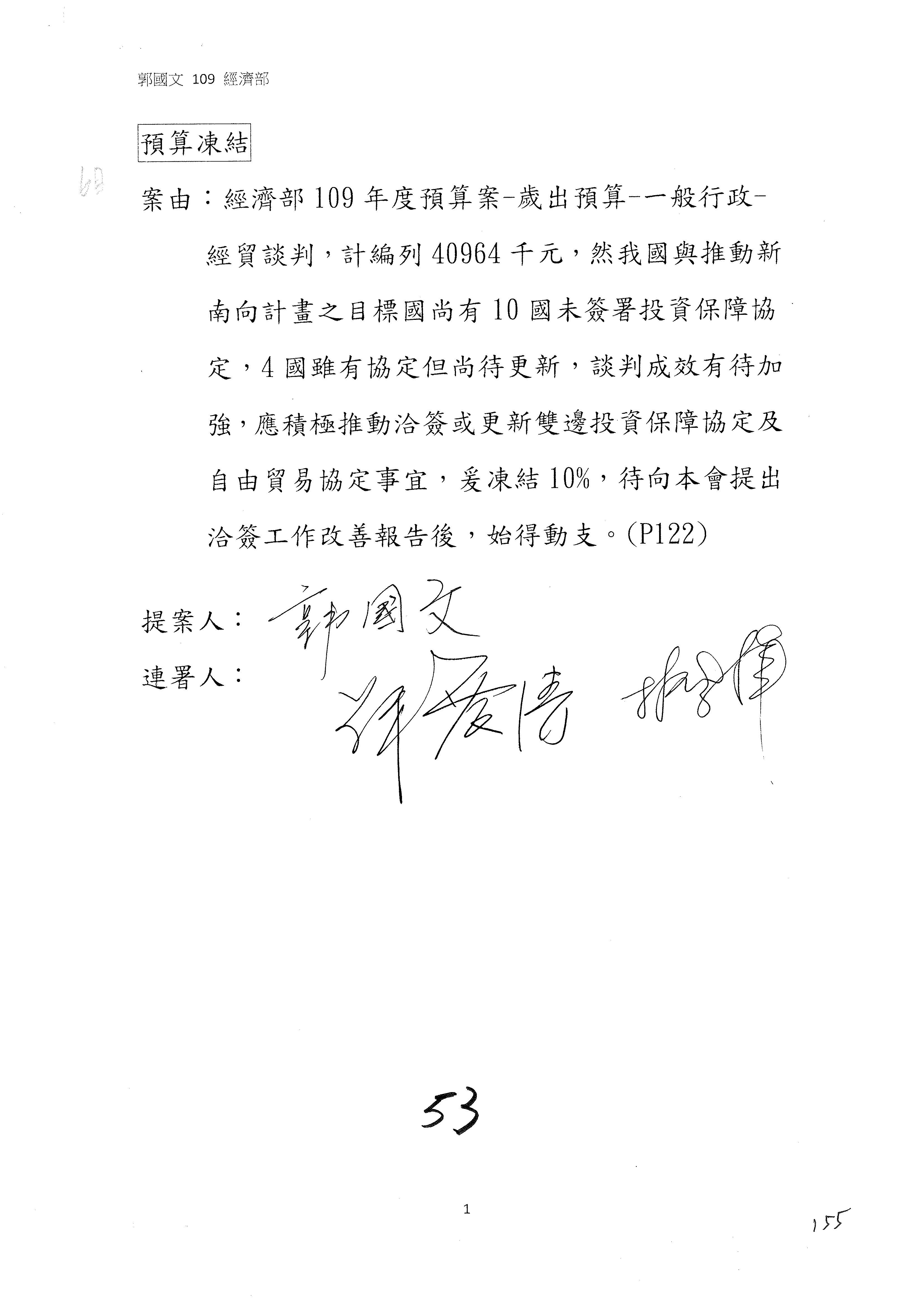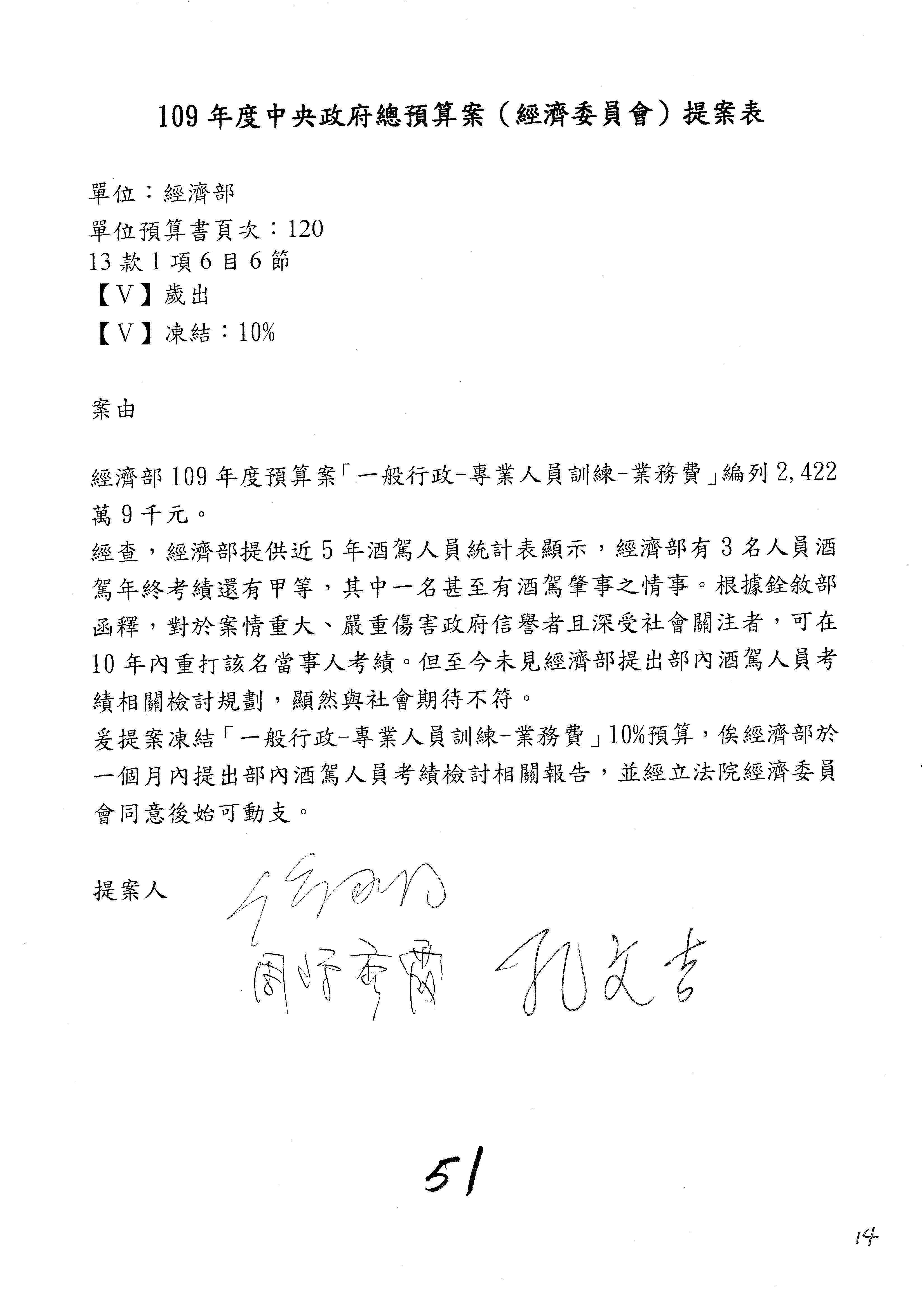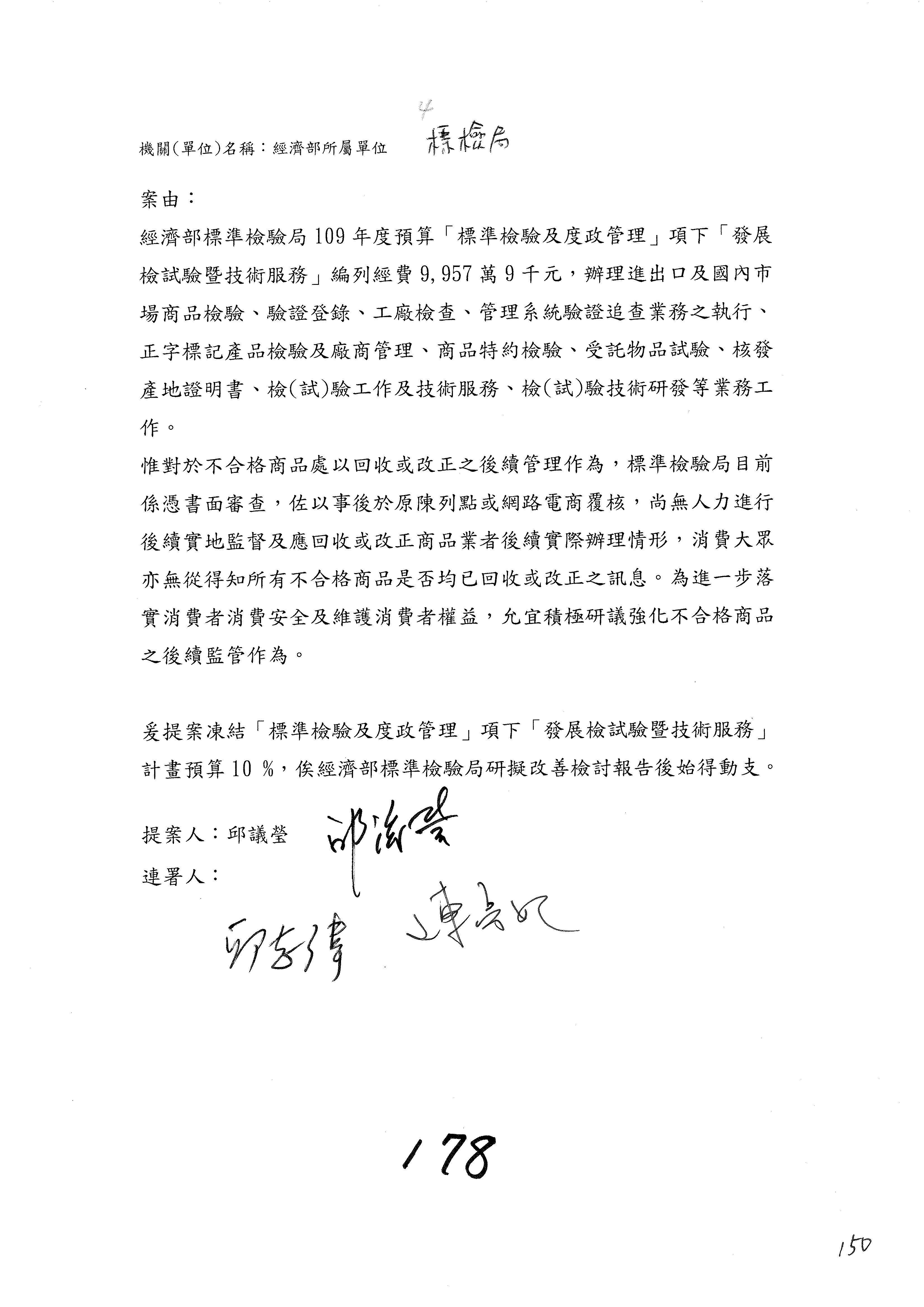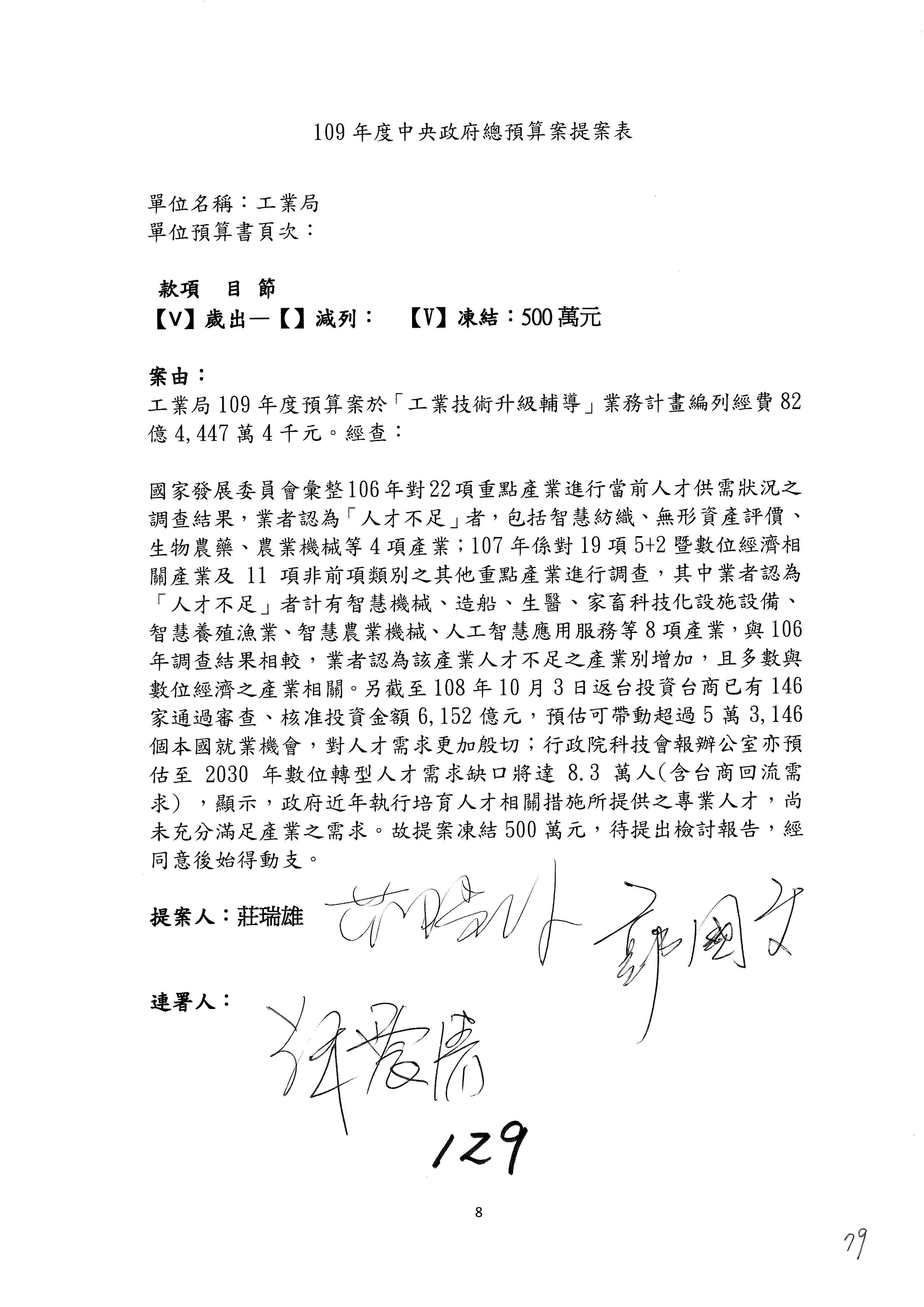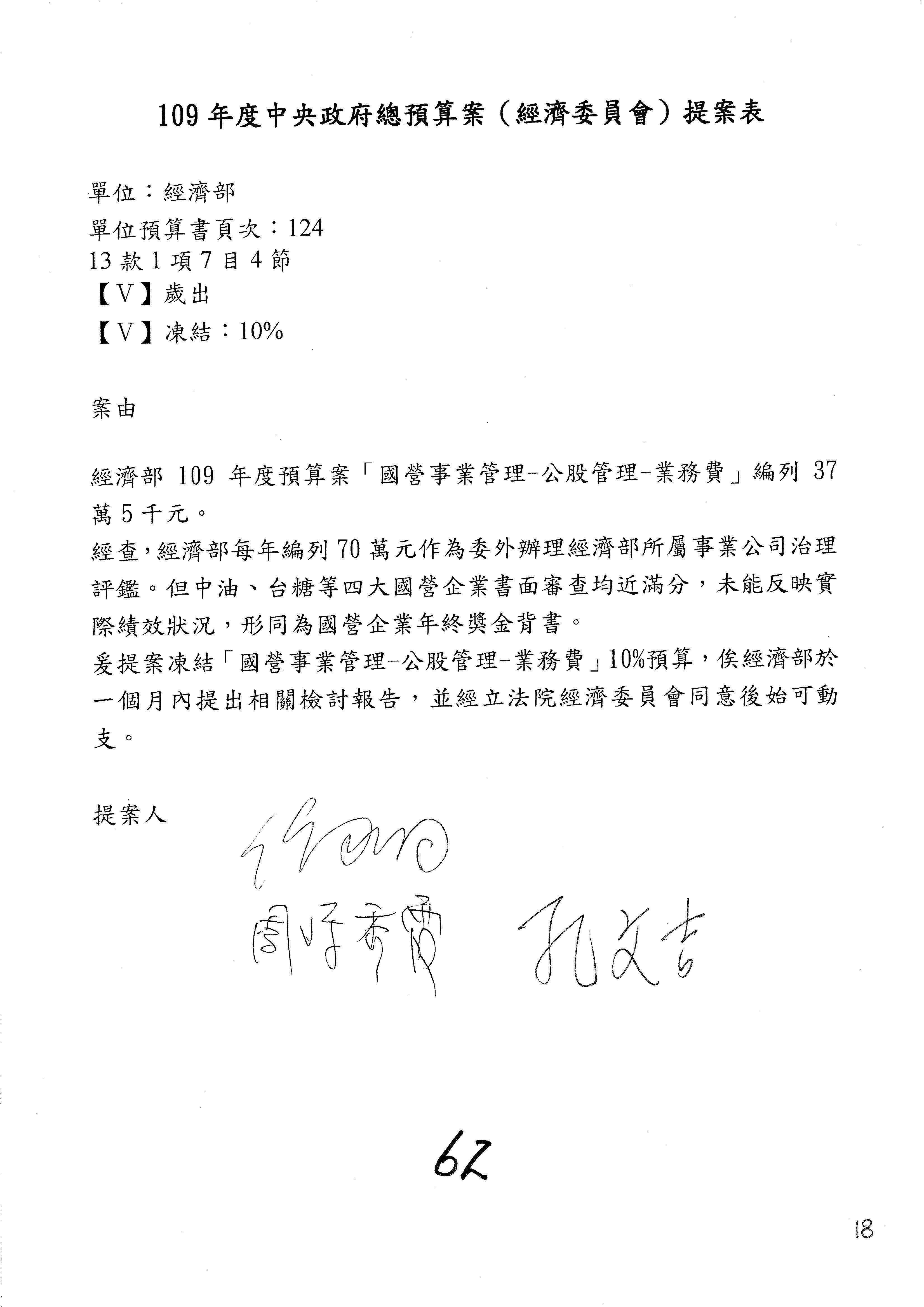 (一)國家發展委員會109年度歲出預算第3目「研擬經濟政策、協調推動財經措施」編列1,773萬3千元,凍結5%,俟向立法院經濟委員會提出書面報告後,始得動支。