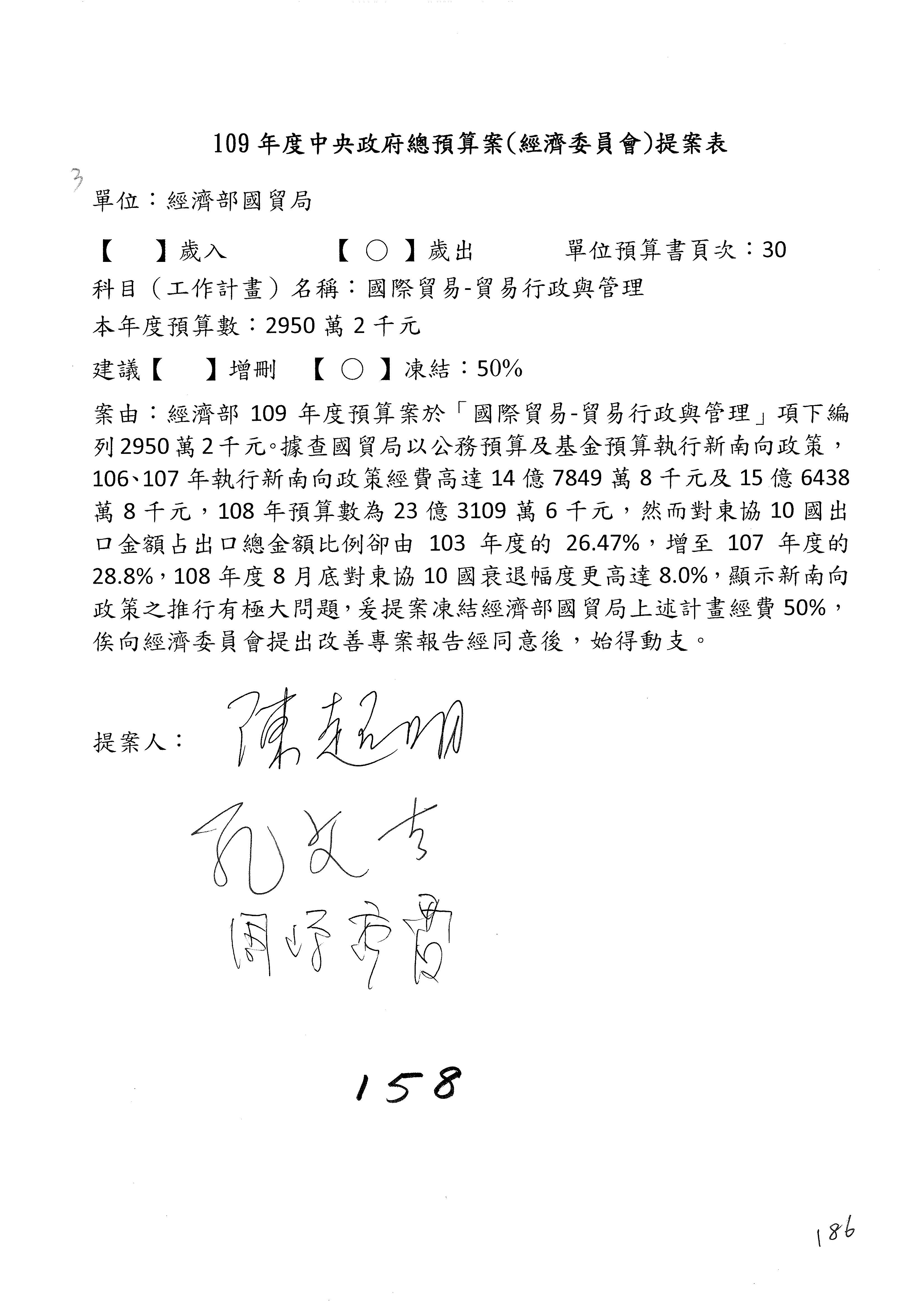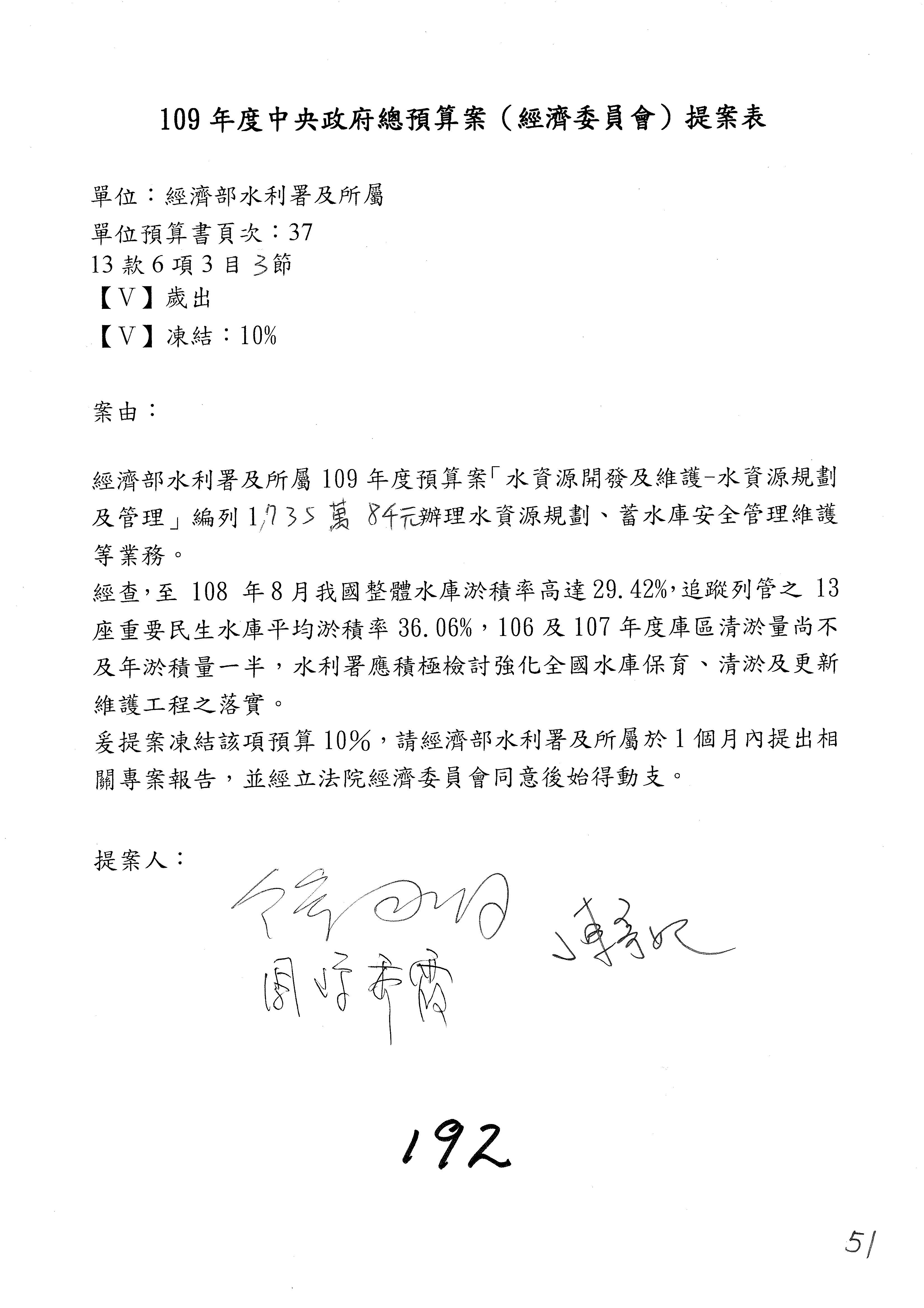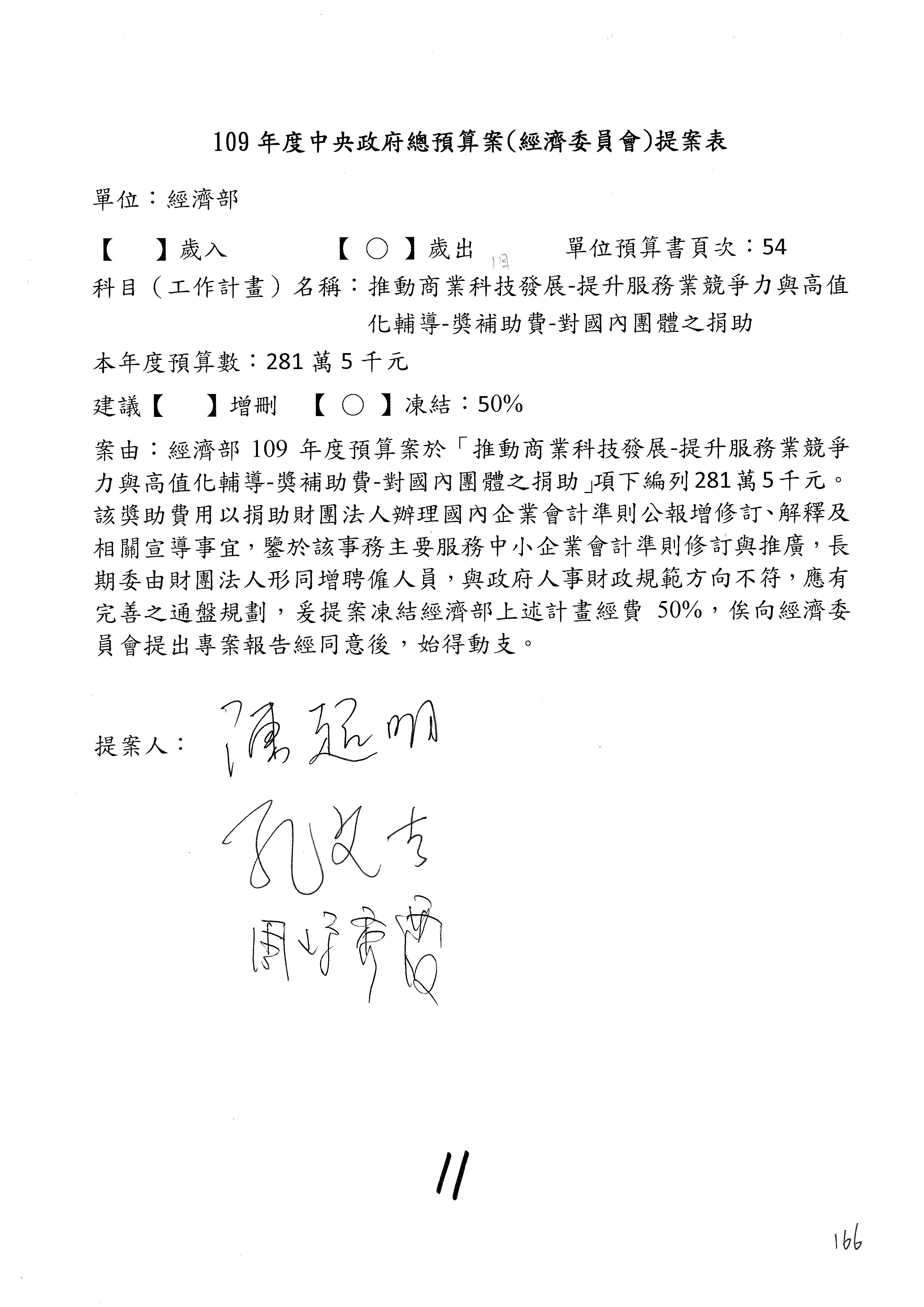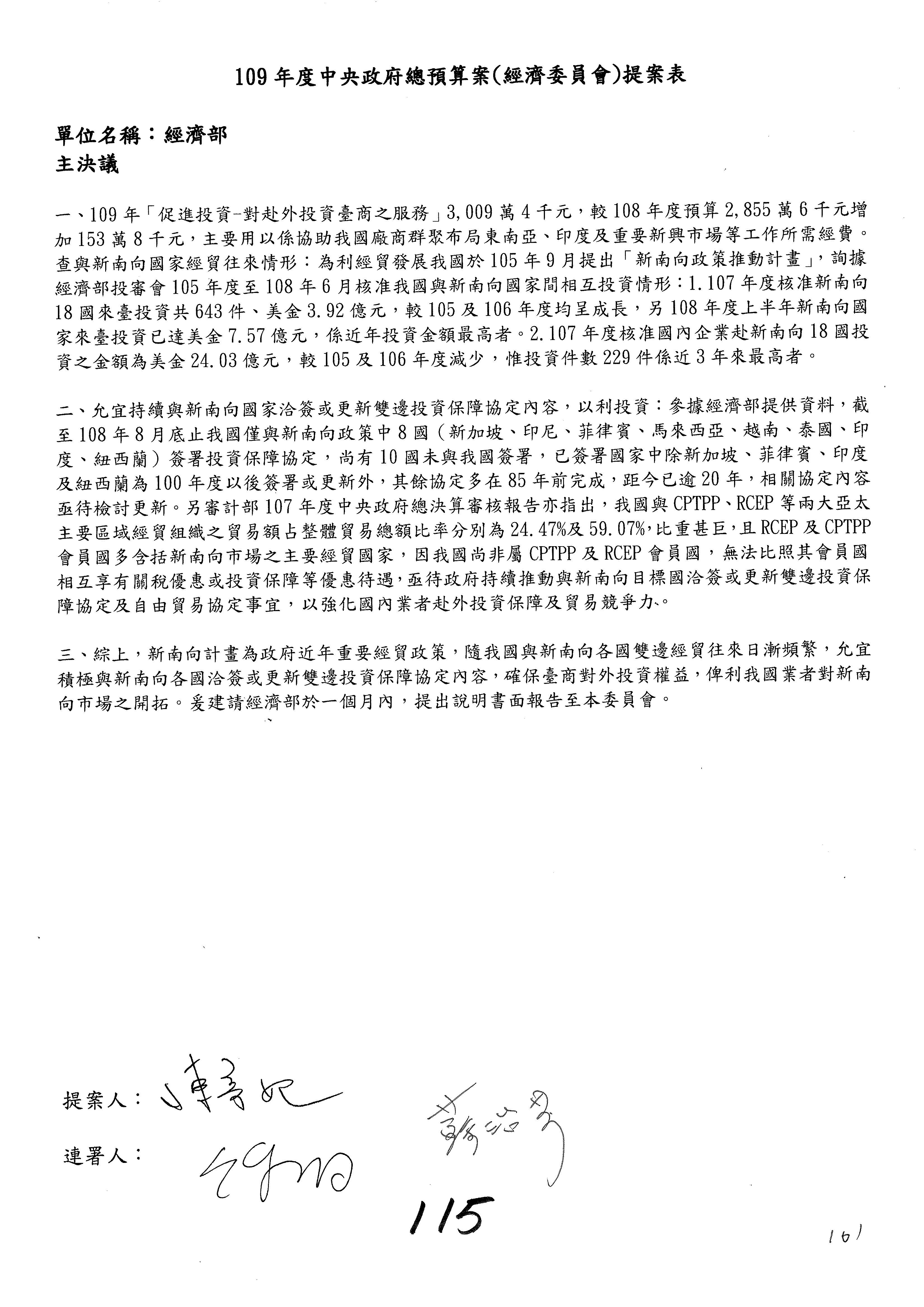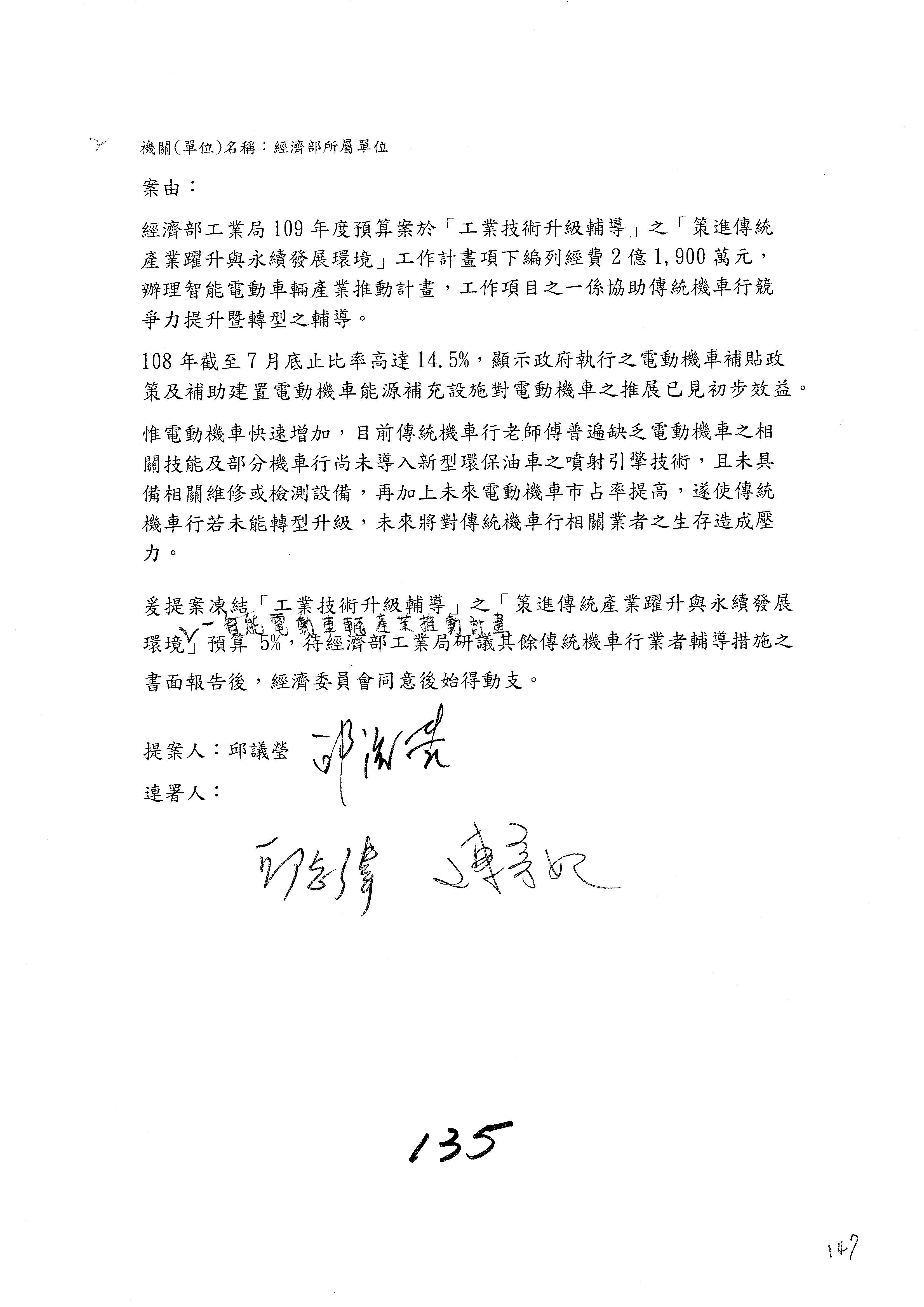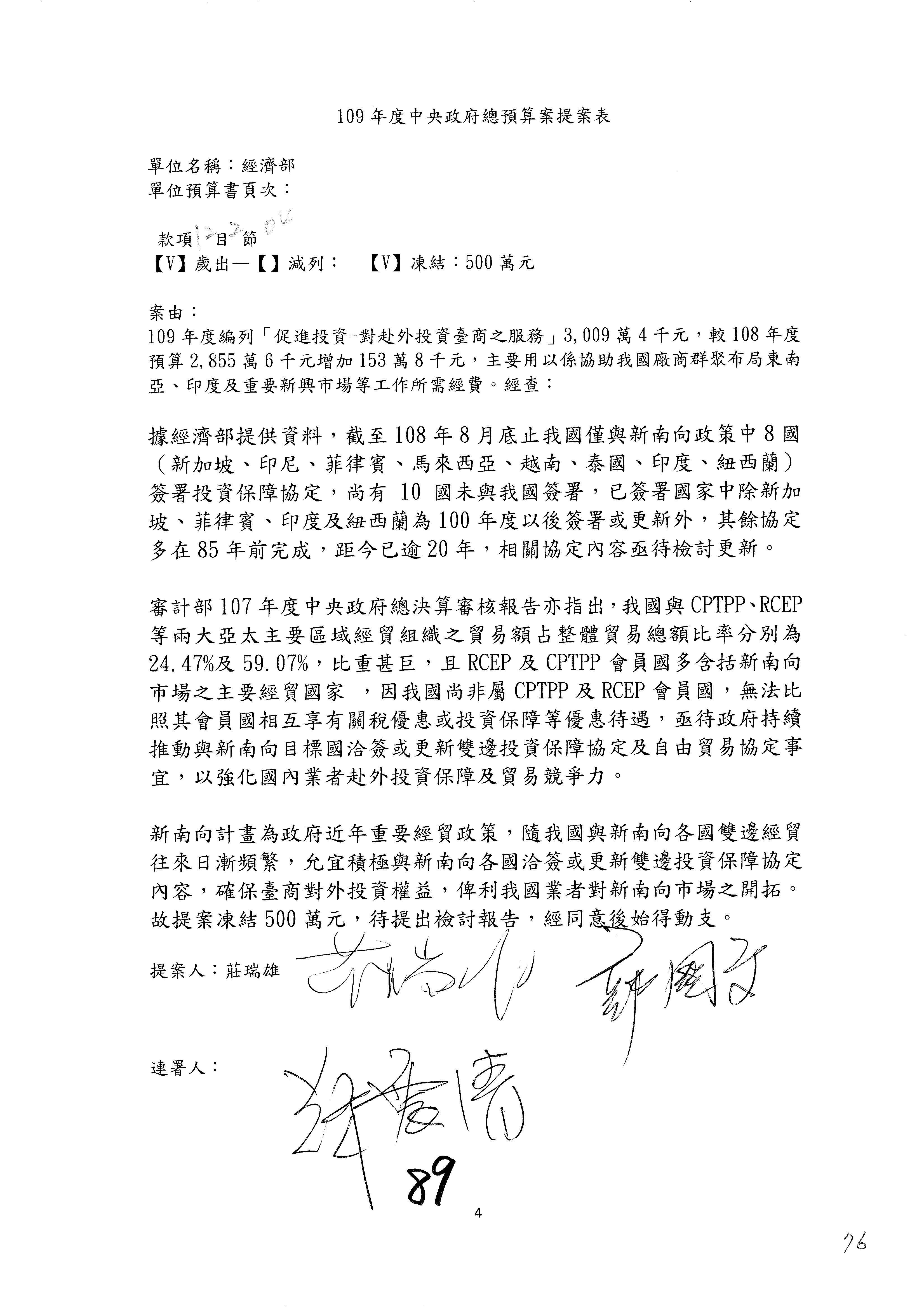 (一)國家發展委員會109年度歲出預算第3目「研擬經濟政策、協調推動財經措施」編列1,773萬3千元,凍結5%,俟向立法院經濟委員會提出書面報告後,始得動支。