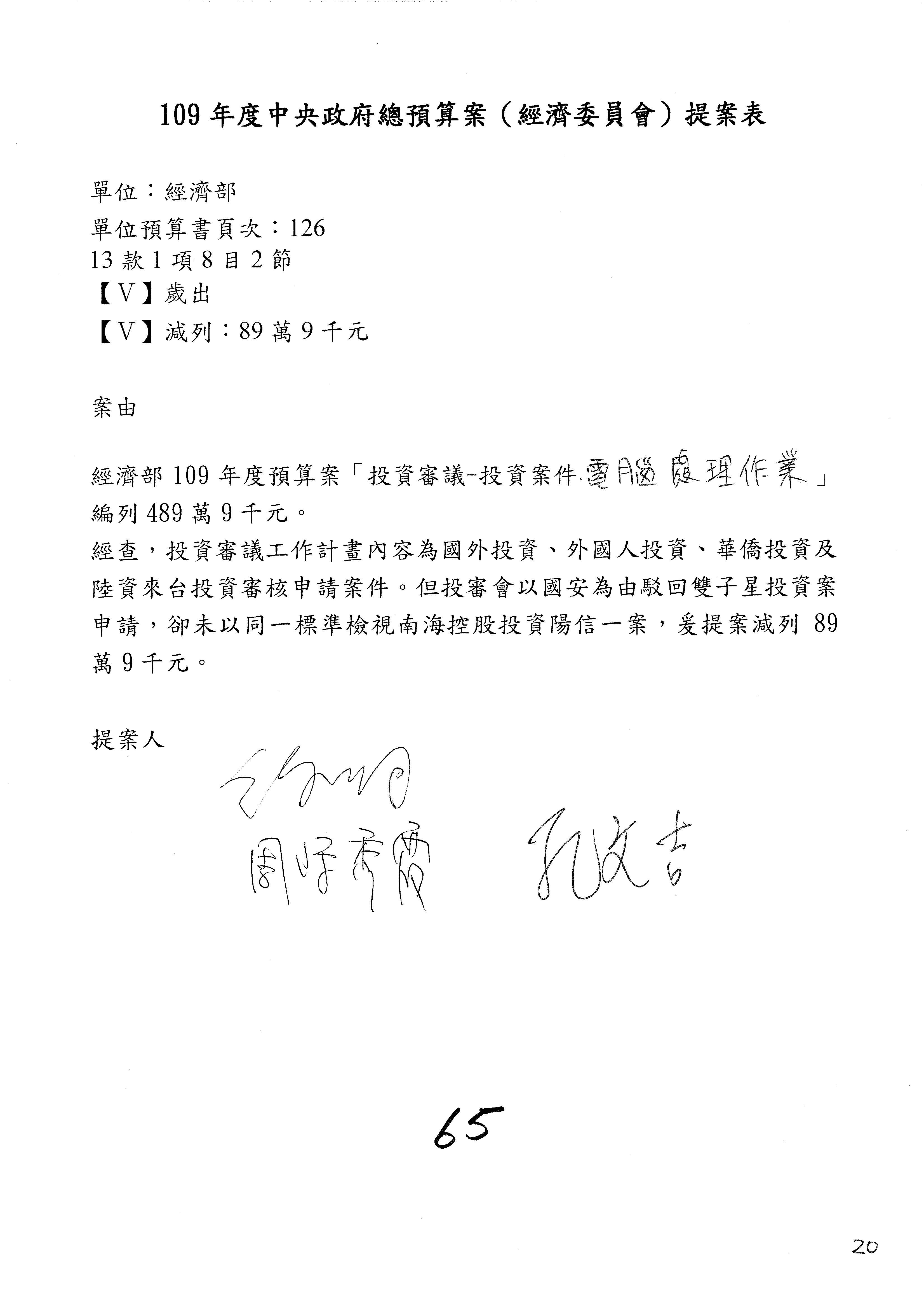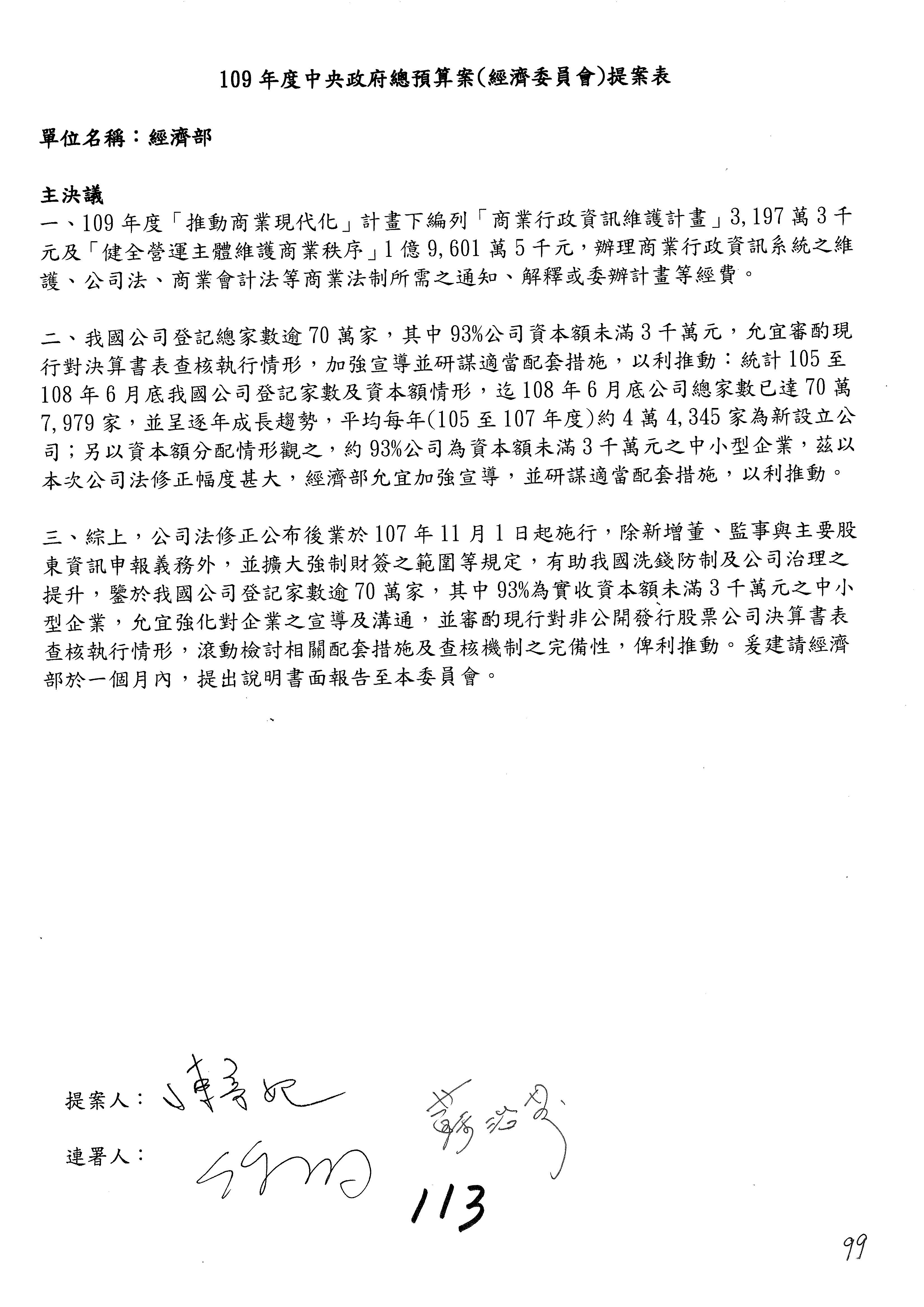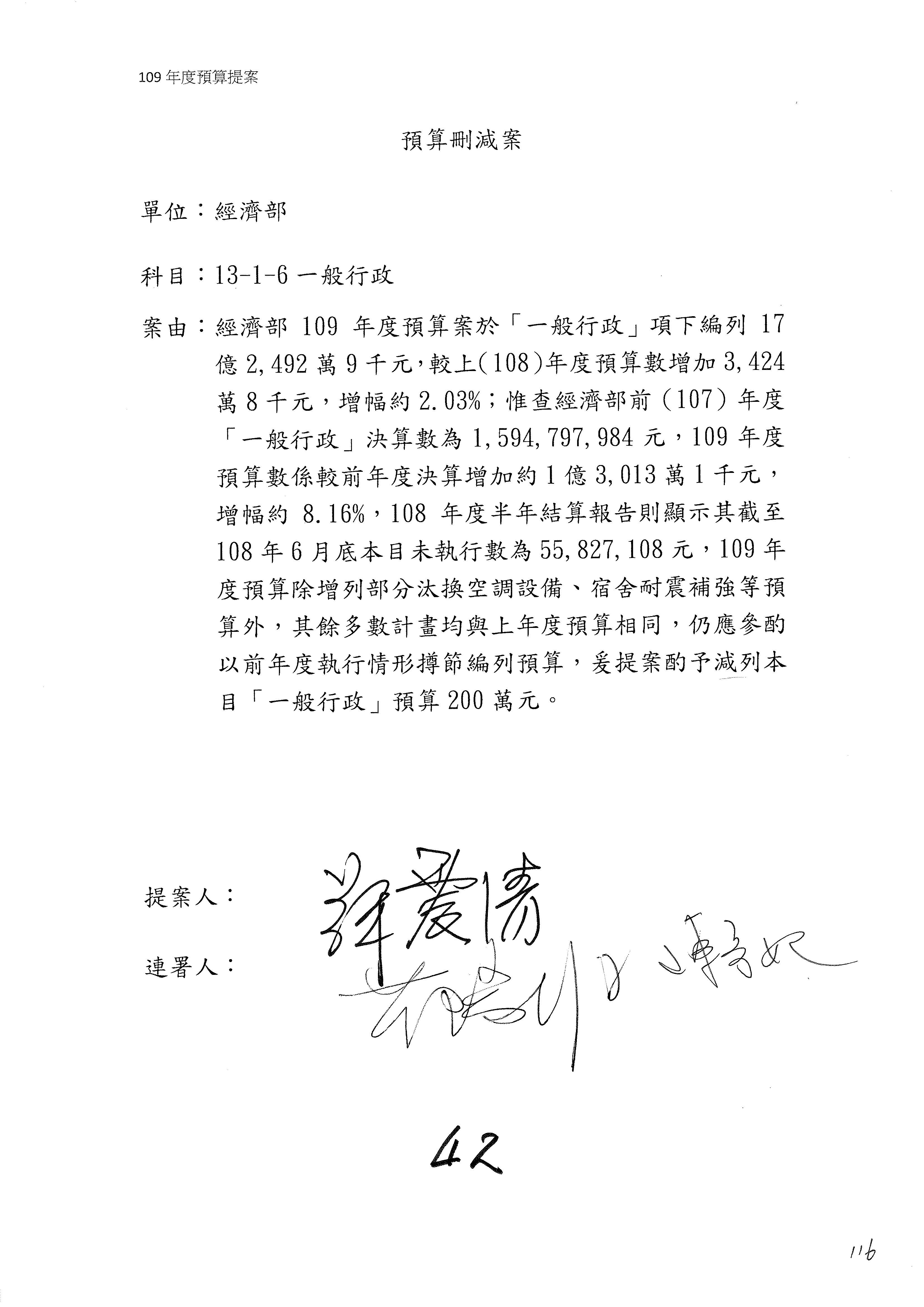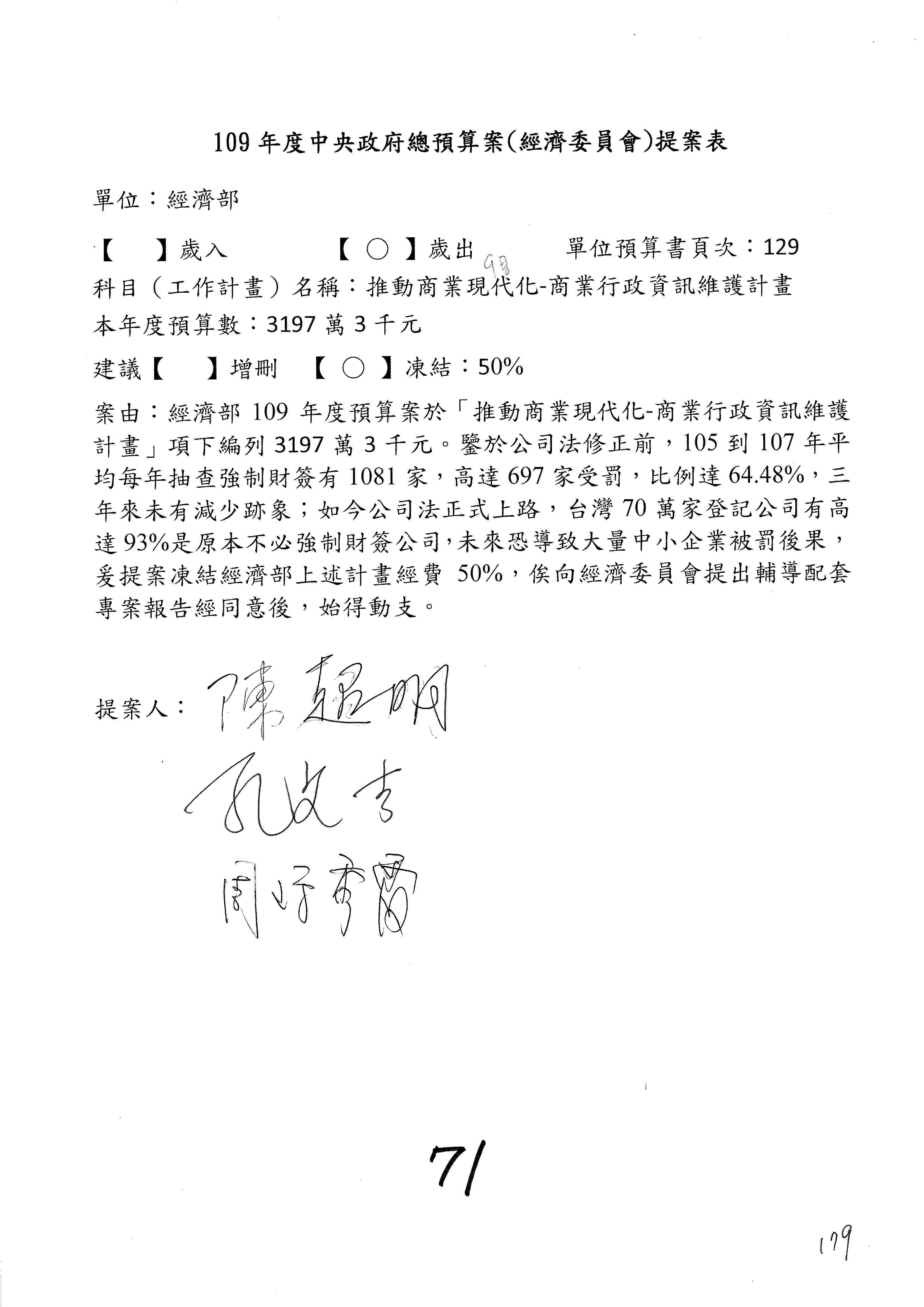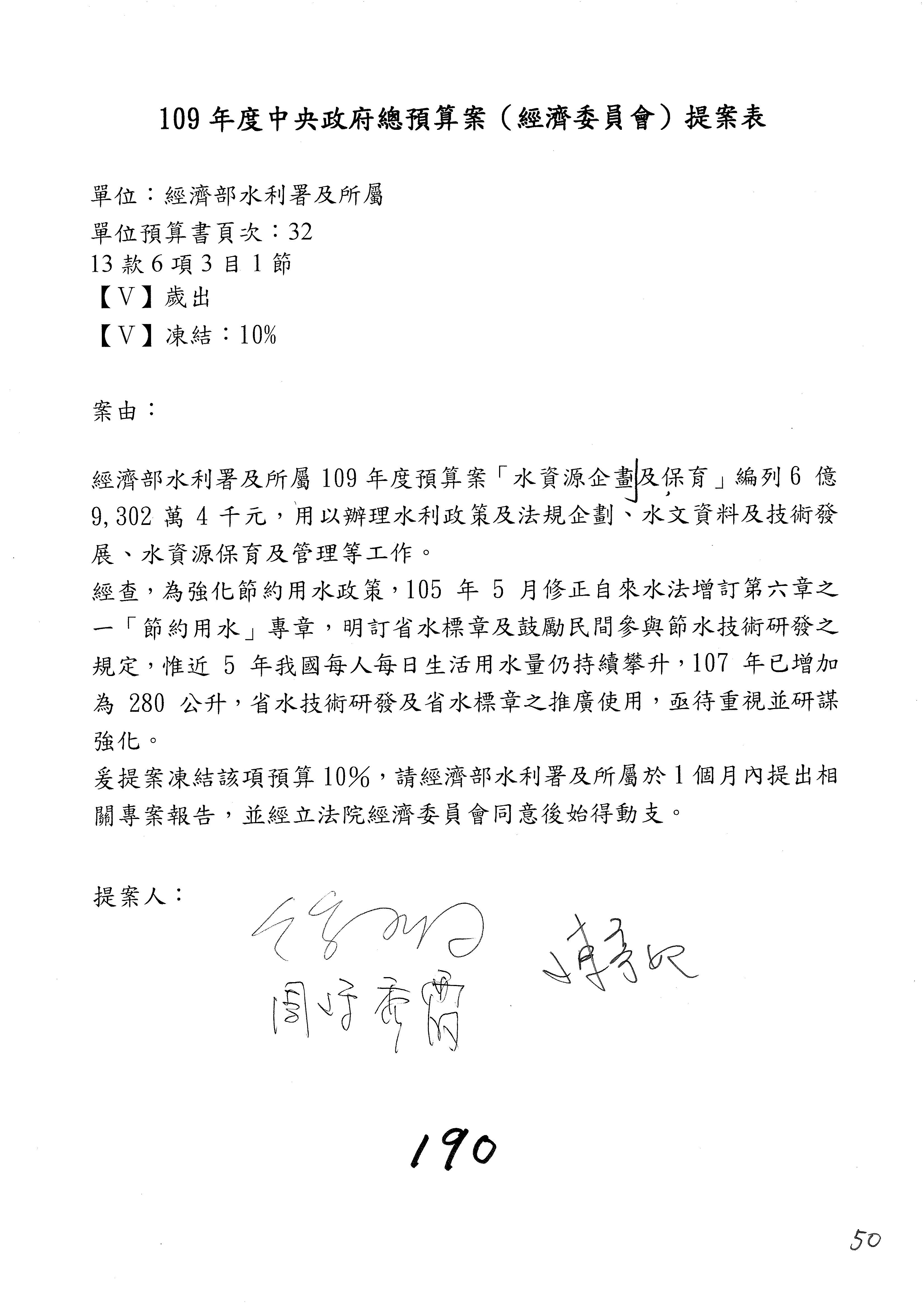 (一)國家發展委員會109年度歲出預算第3目「研擬經濟政策、協調推動財經措施」編列1,773萬3千元,凍結5%,俟向立法院經濟委員會提出書面報告後,始得動支。
