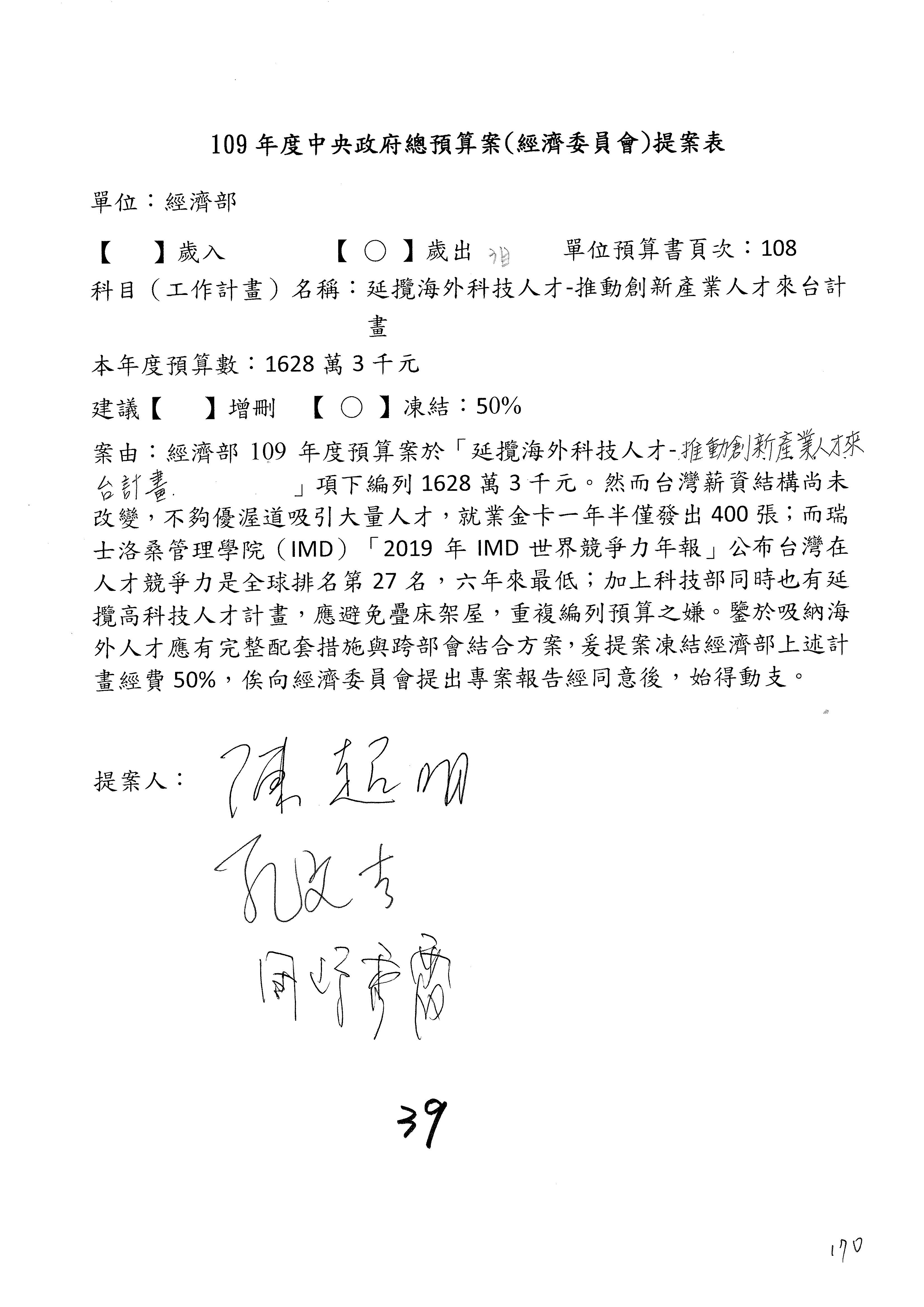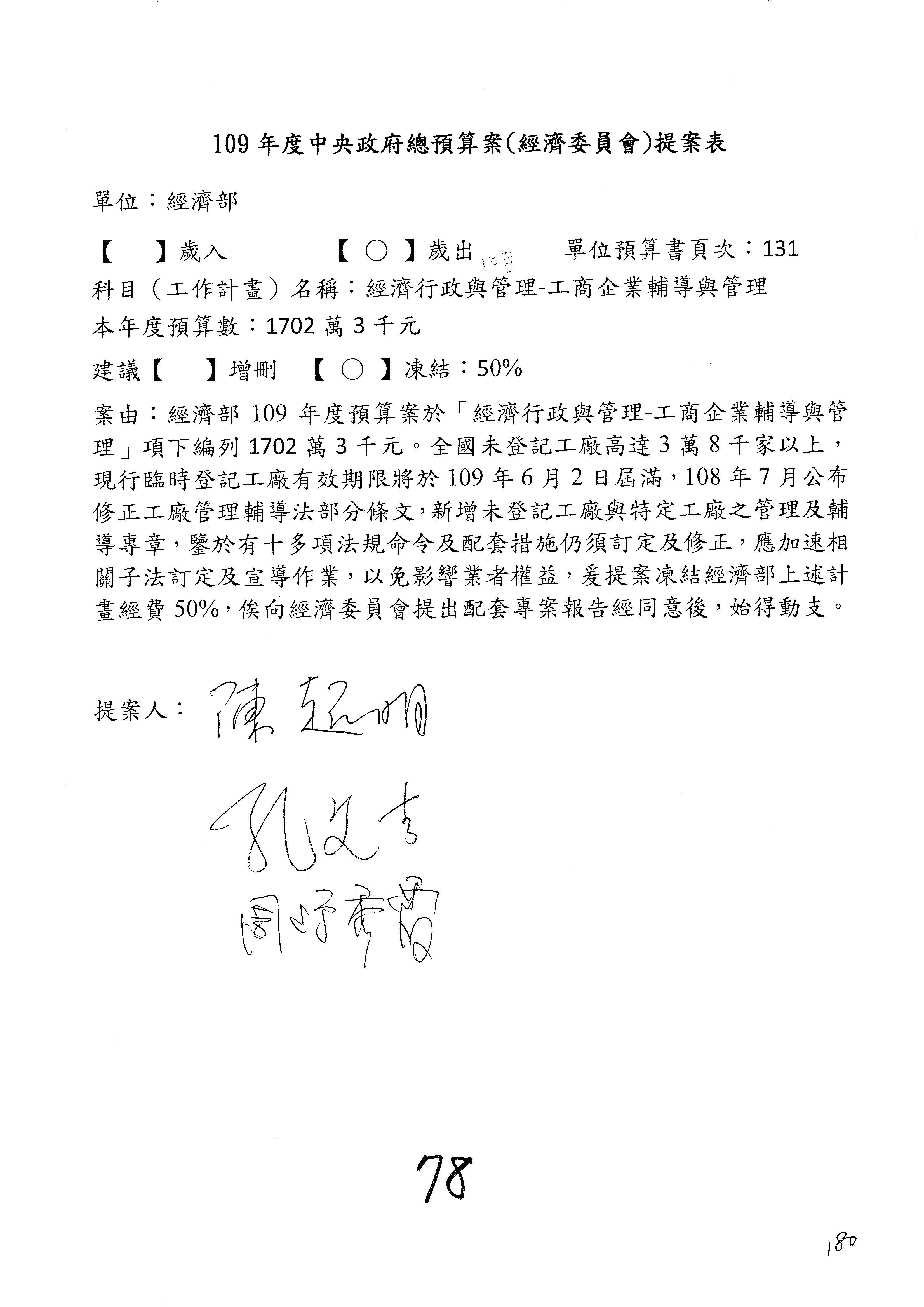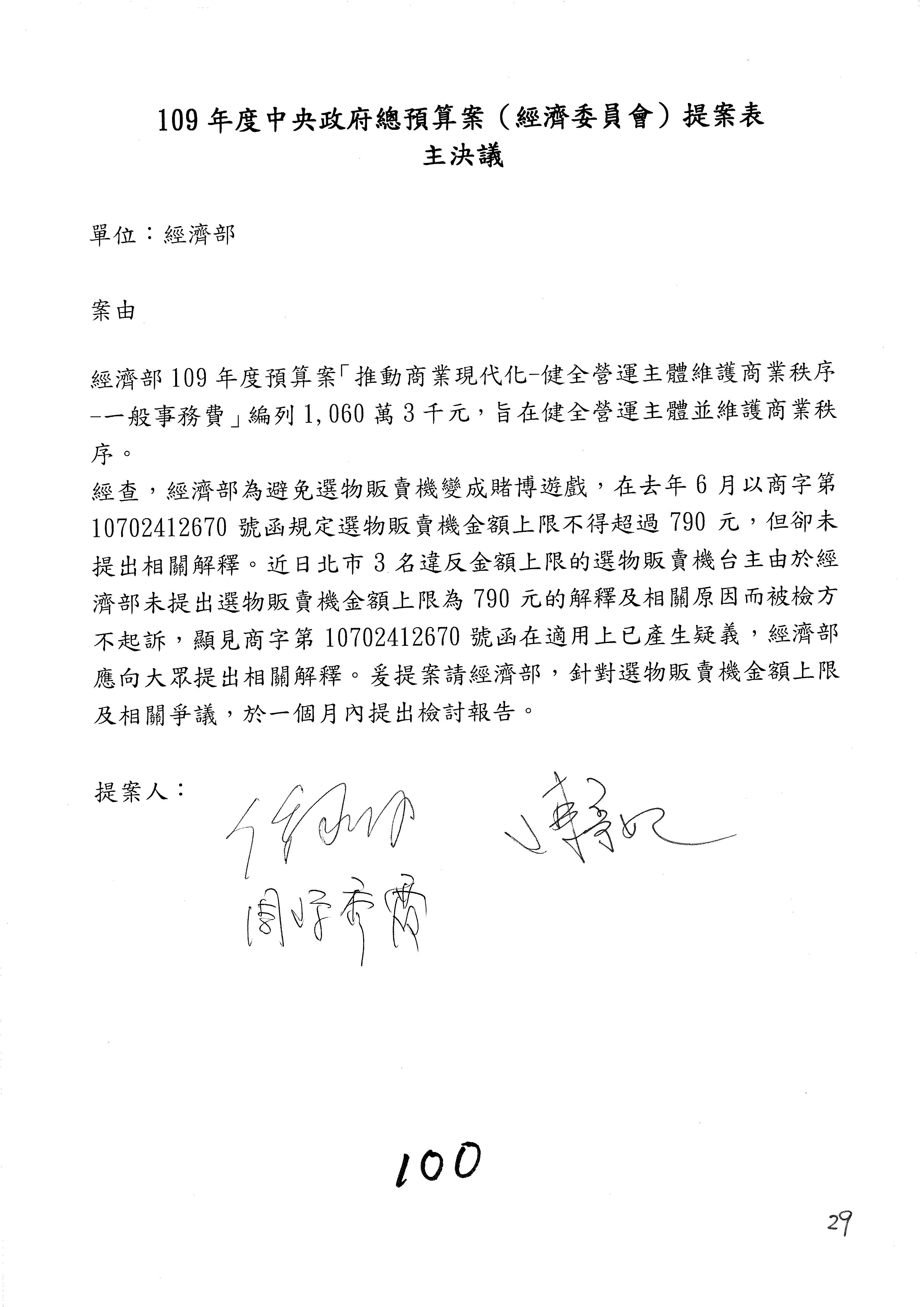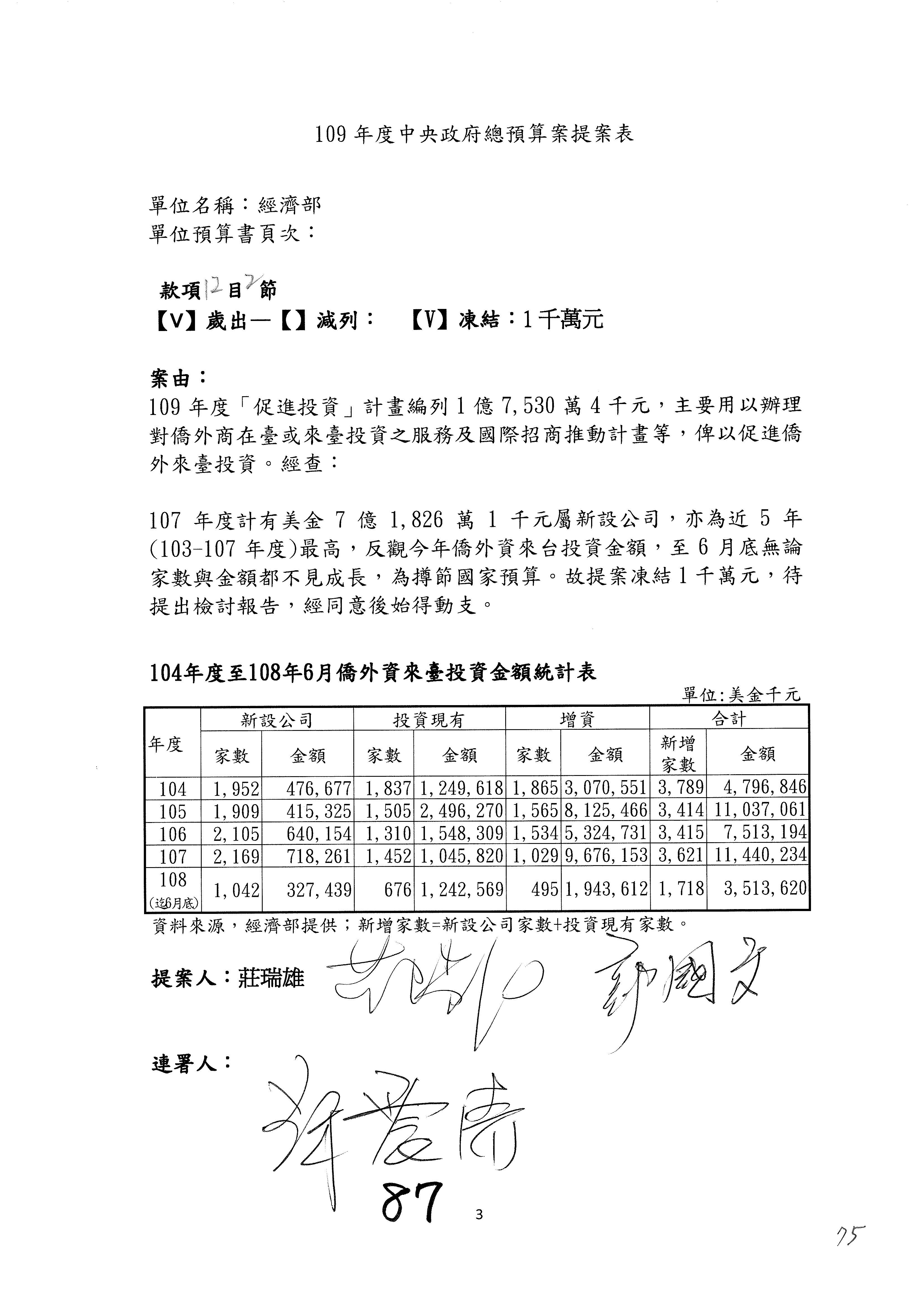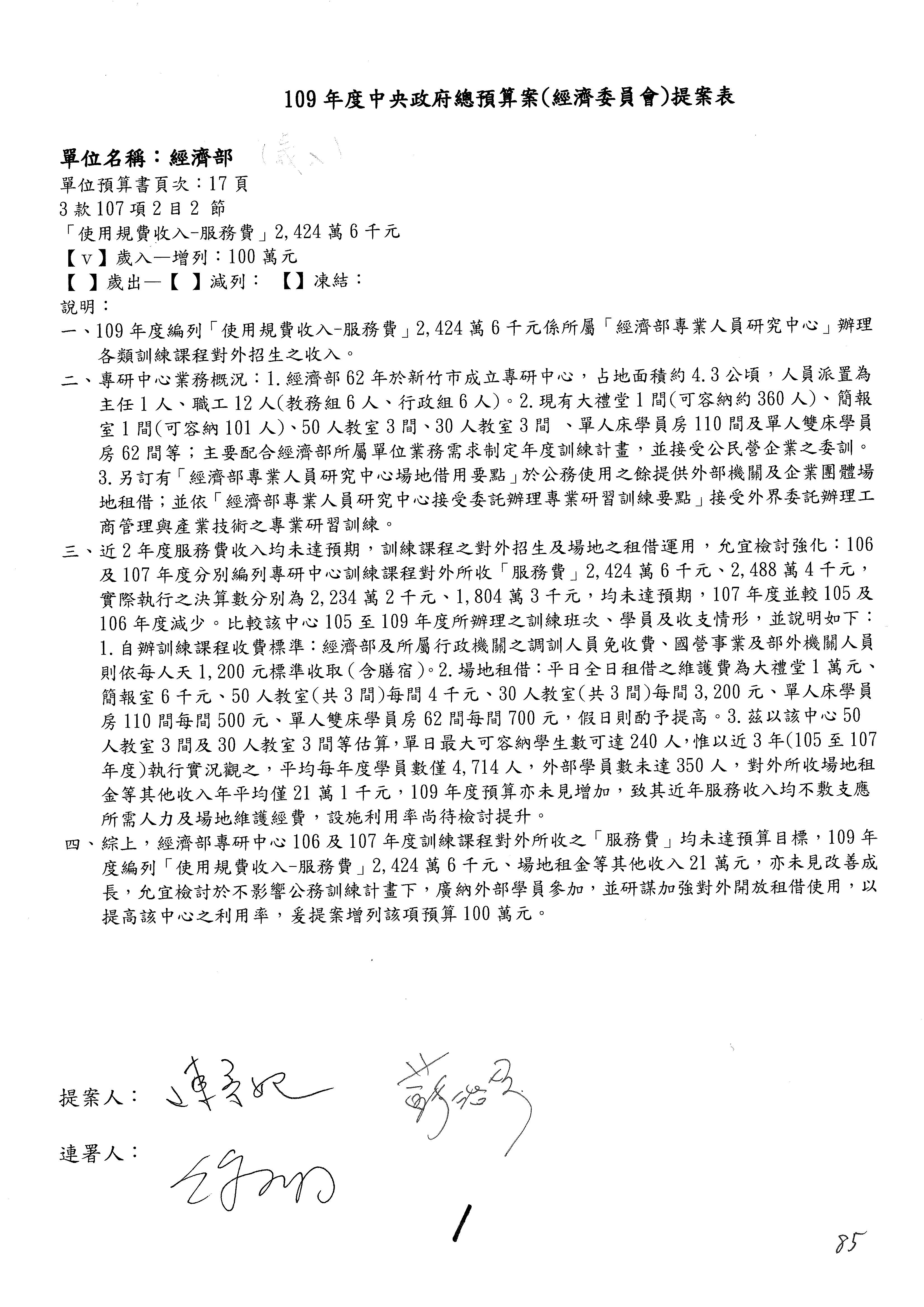 (一)國家發展委員會109年度歲出預算第3目「研擬經濟政策、協調推動財經措施」編列1,773萬3千元,凍結5%,俟向立法院經濟委員會提出書面報告後,始得動支。