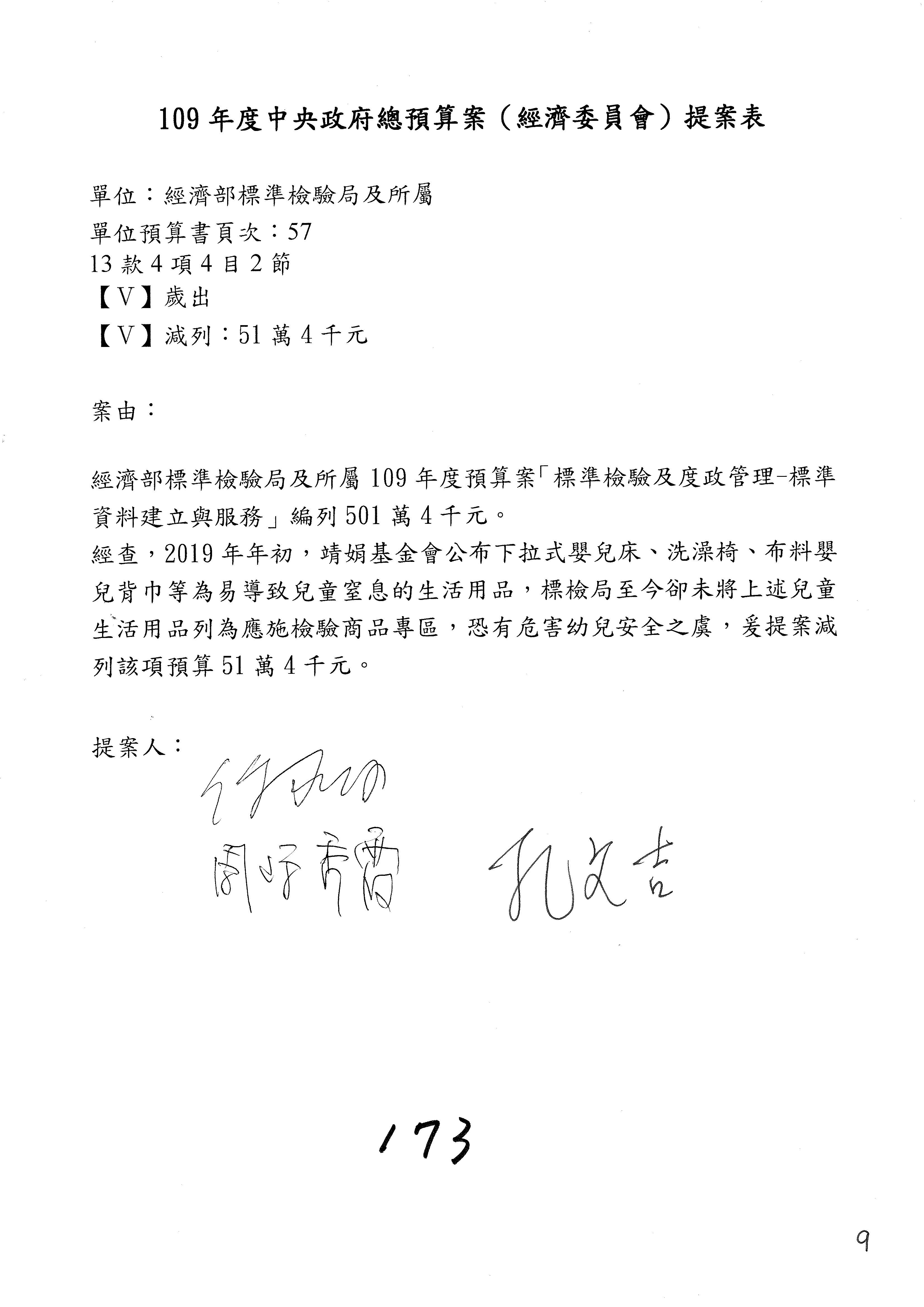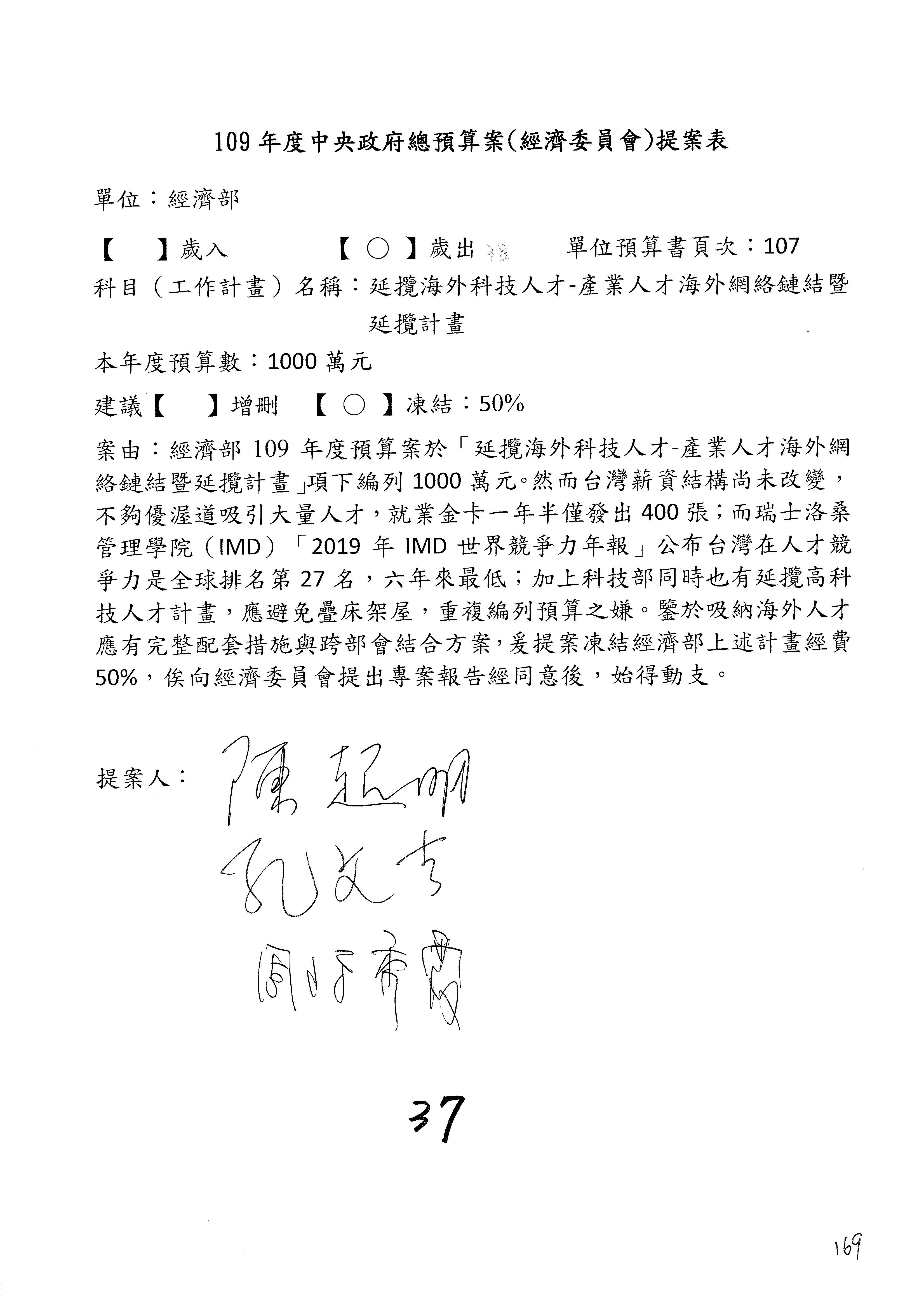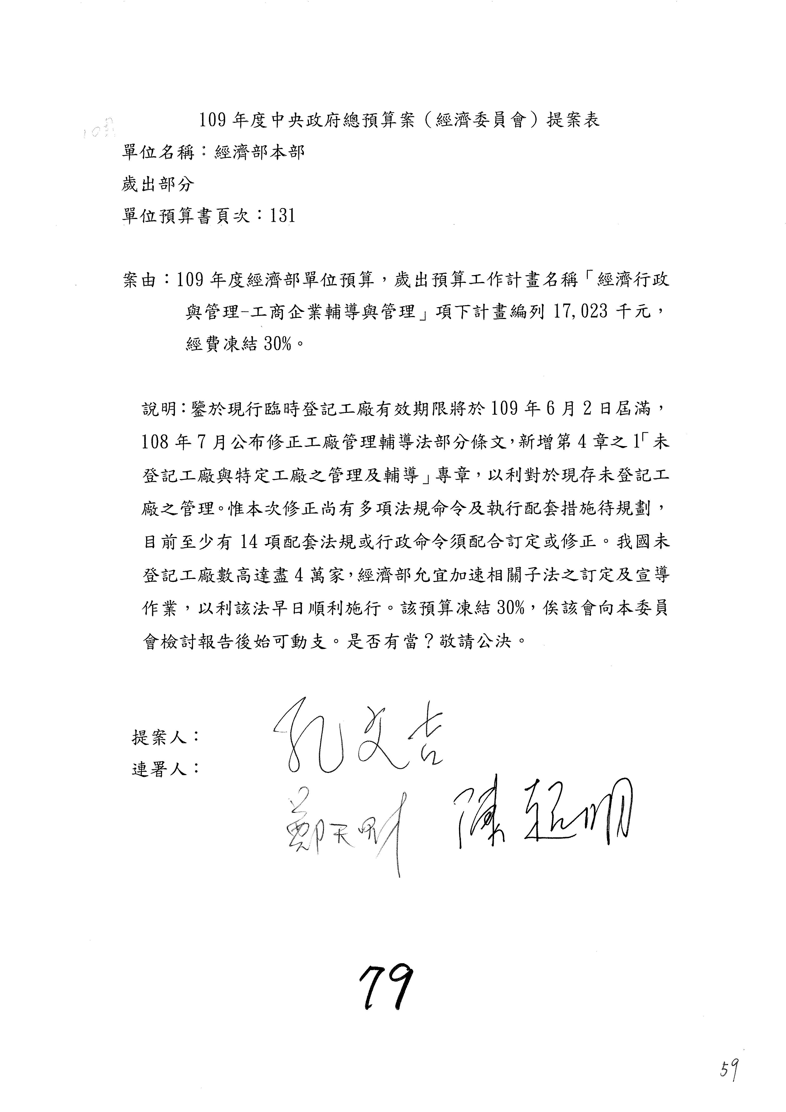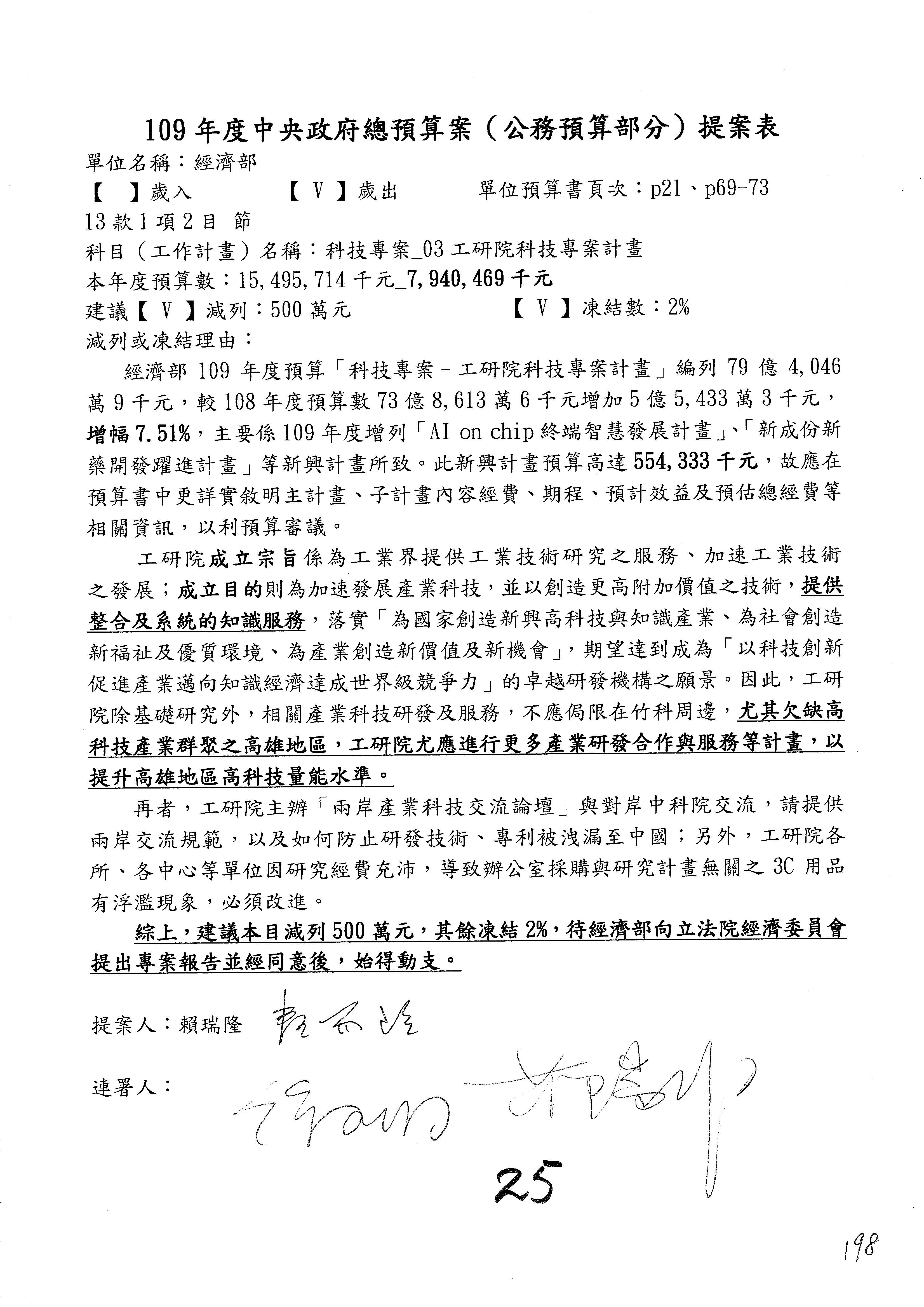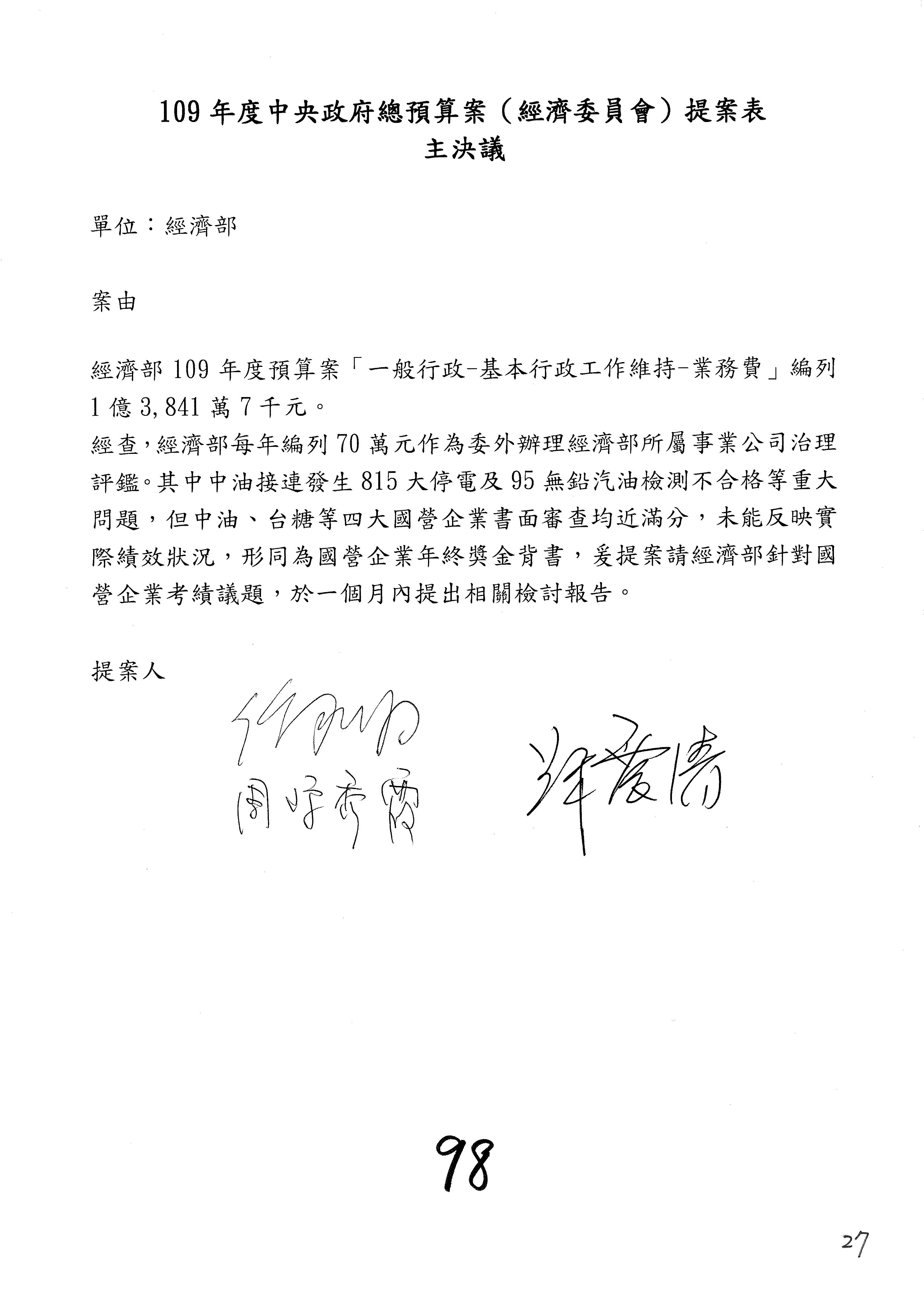 (一)國家發展委員會109年度歲出預算第3目「研擬經濟政策、協調推動財經措施」編列1,773萬3千元,凍結5%,俟向立法院經濟委員會提出書面報告後,始得動支。