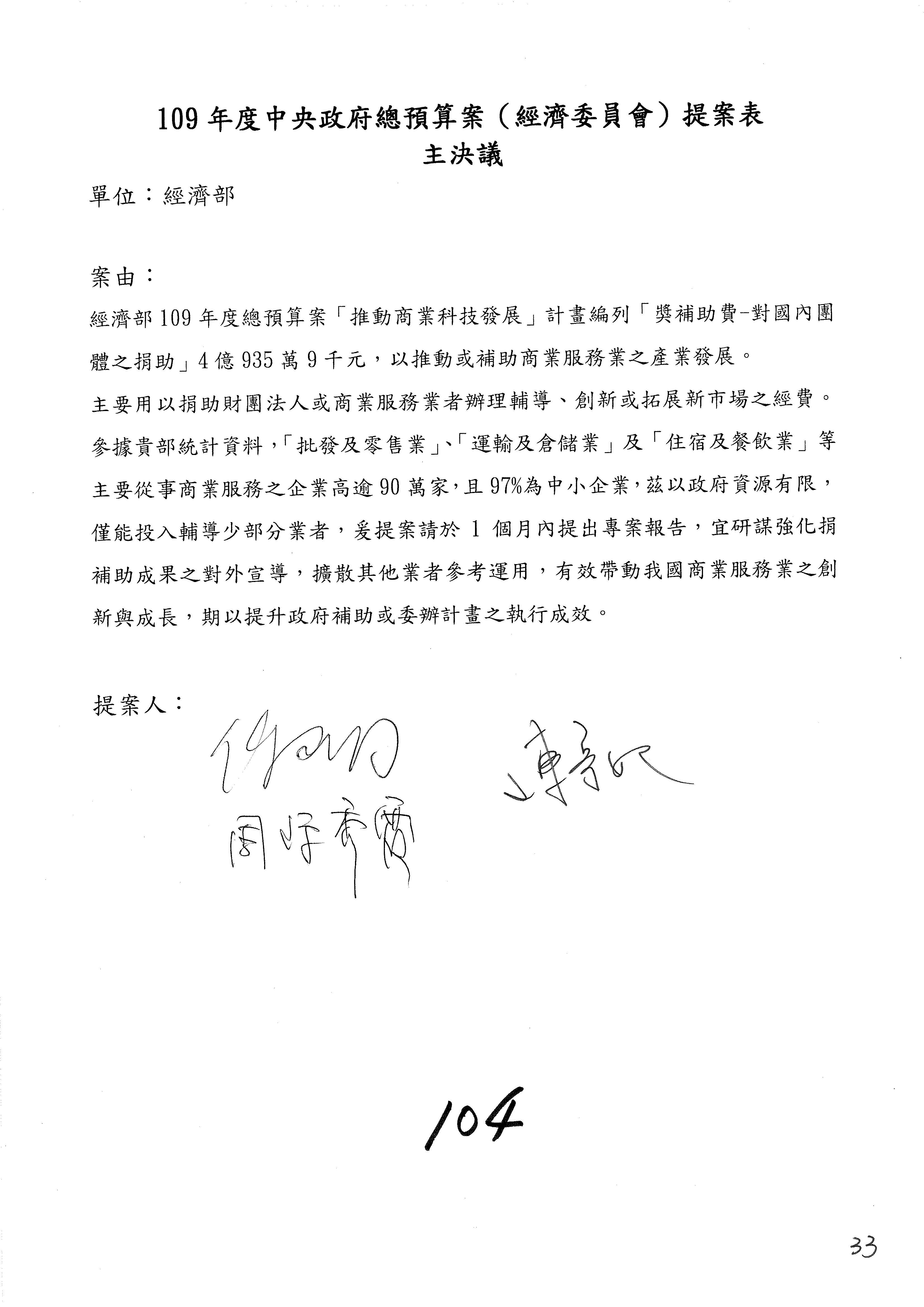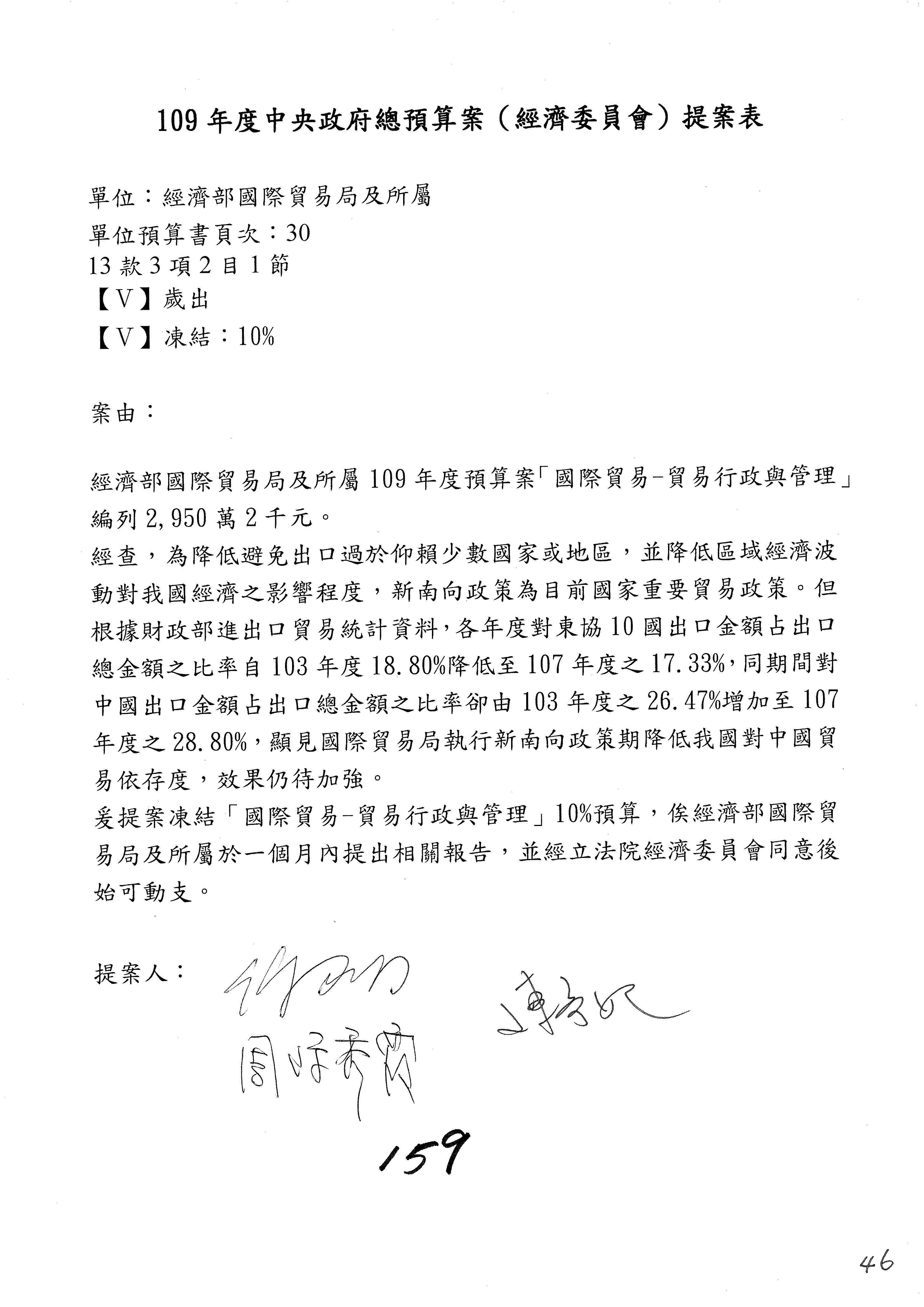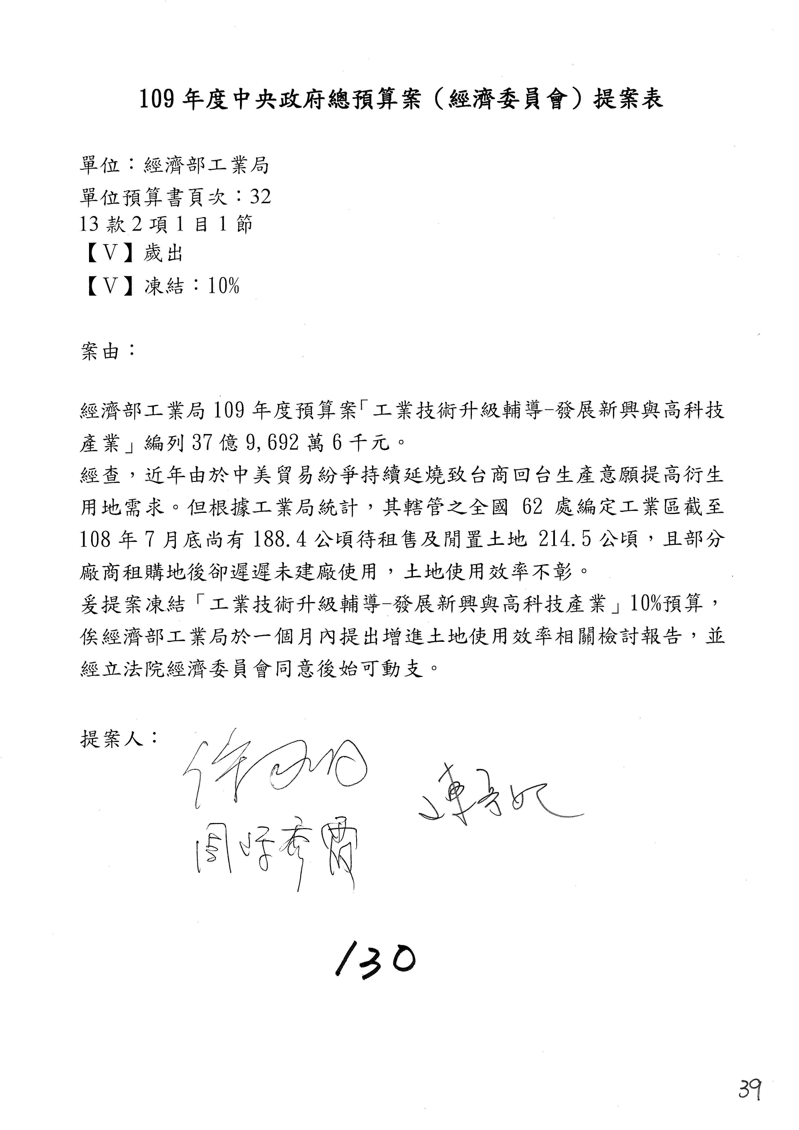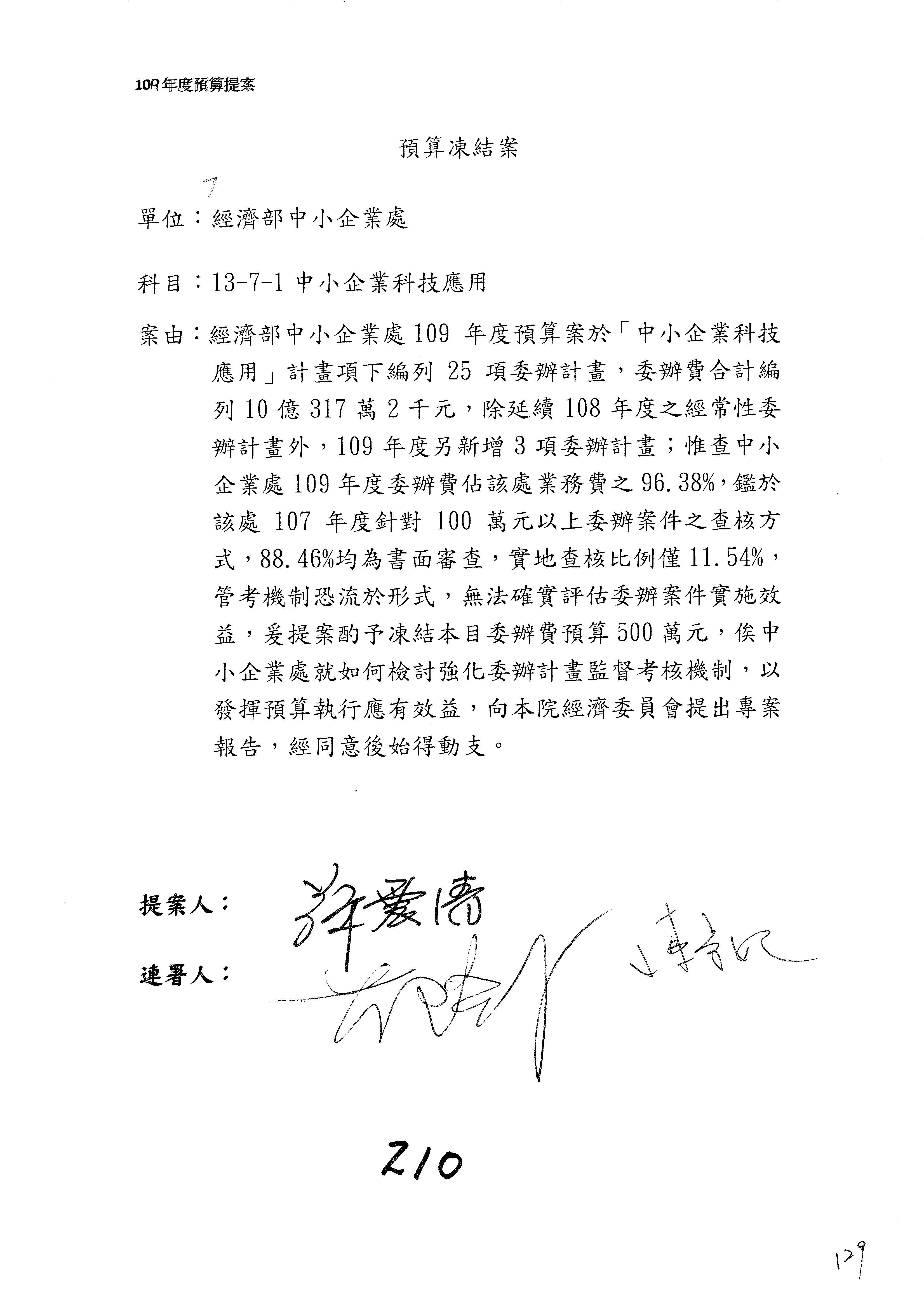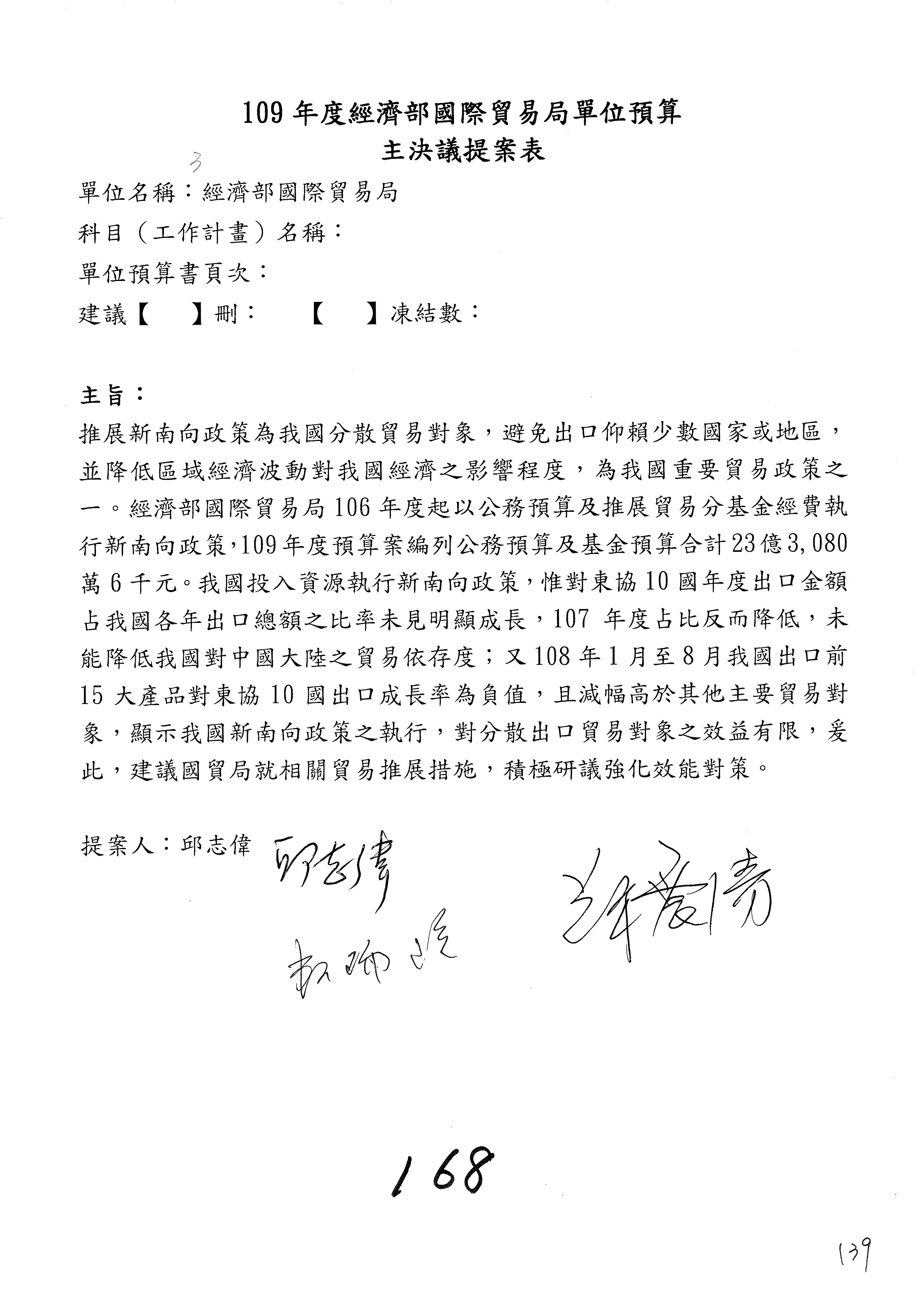 (一)國家發展委員會109年度歲出預算第3目「研擬經濟政策、協調推動財經措施」編列1,773萬3千元,凍結5%,俟向立法院經濟委員會提出書面報告後,始得動支。