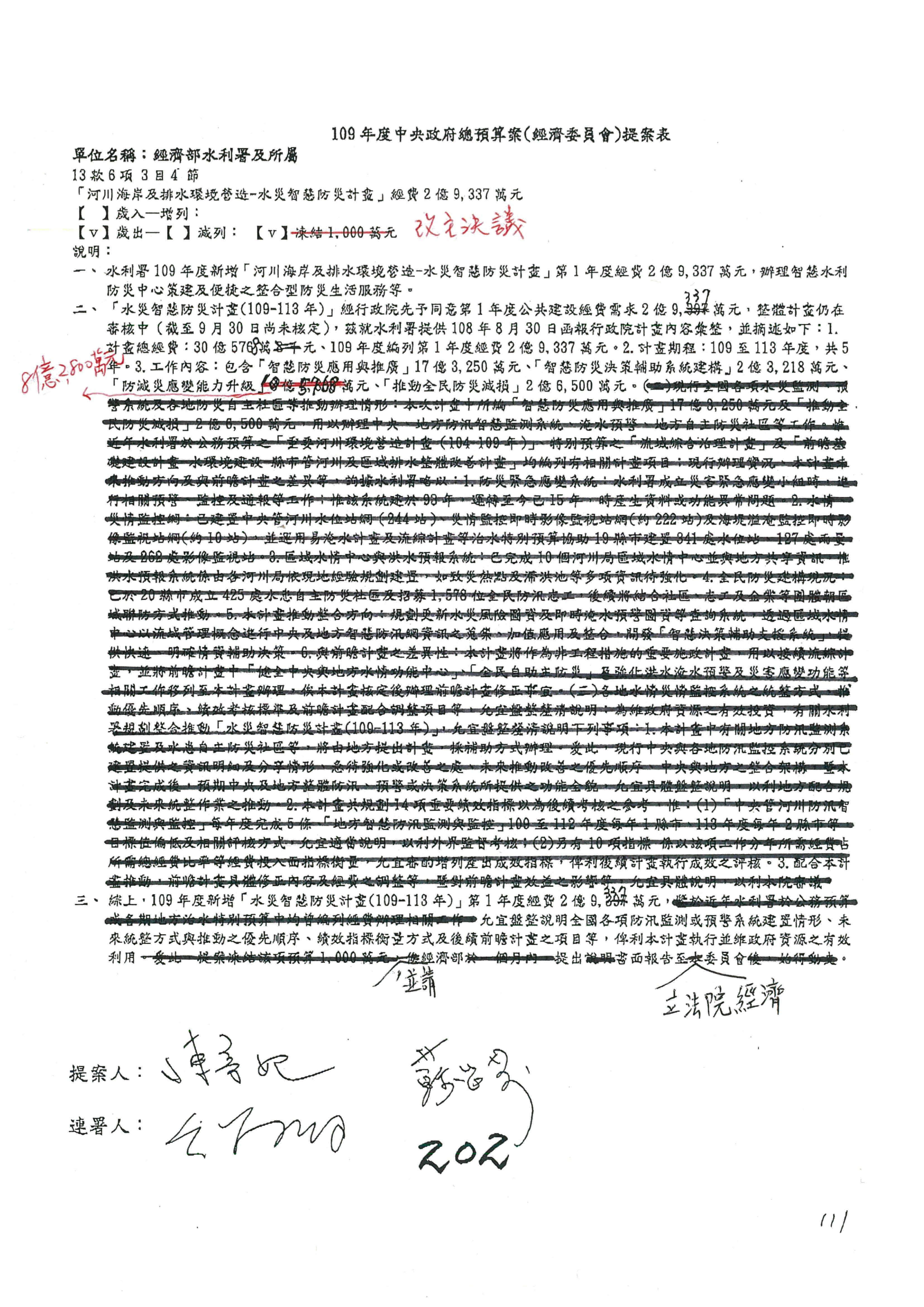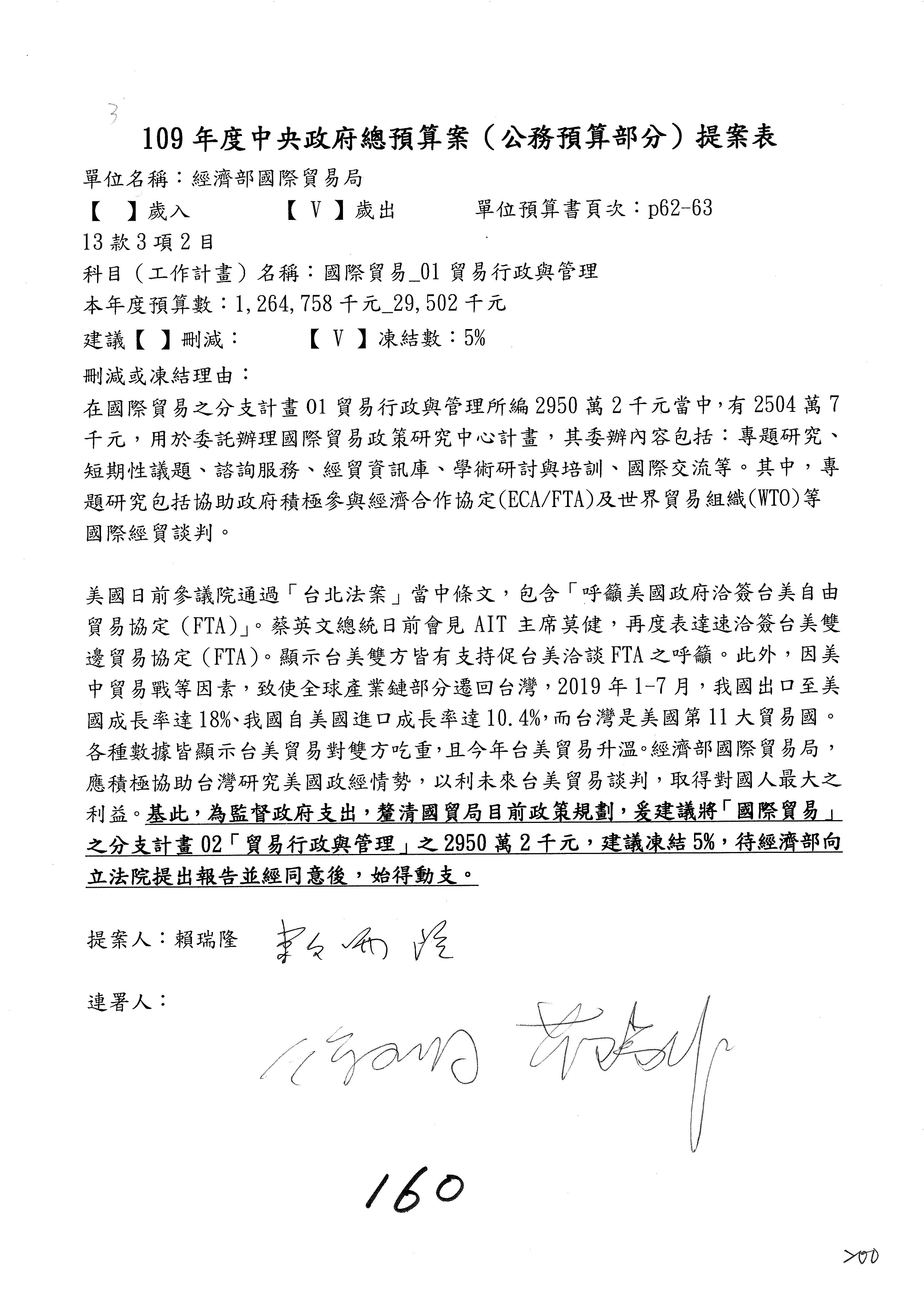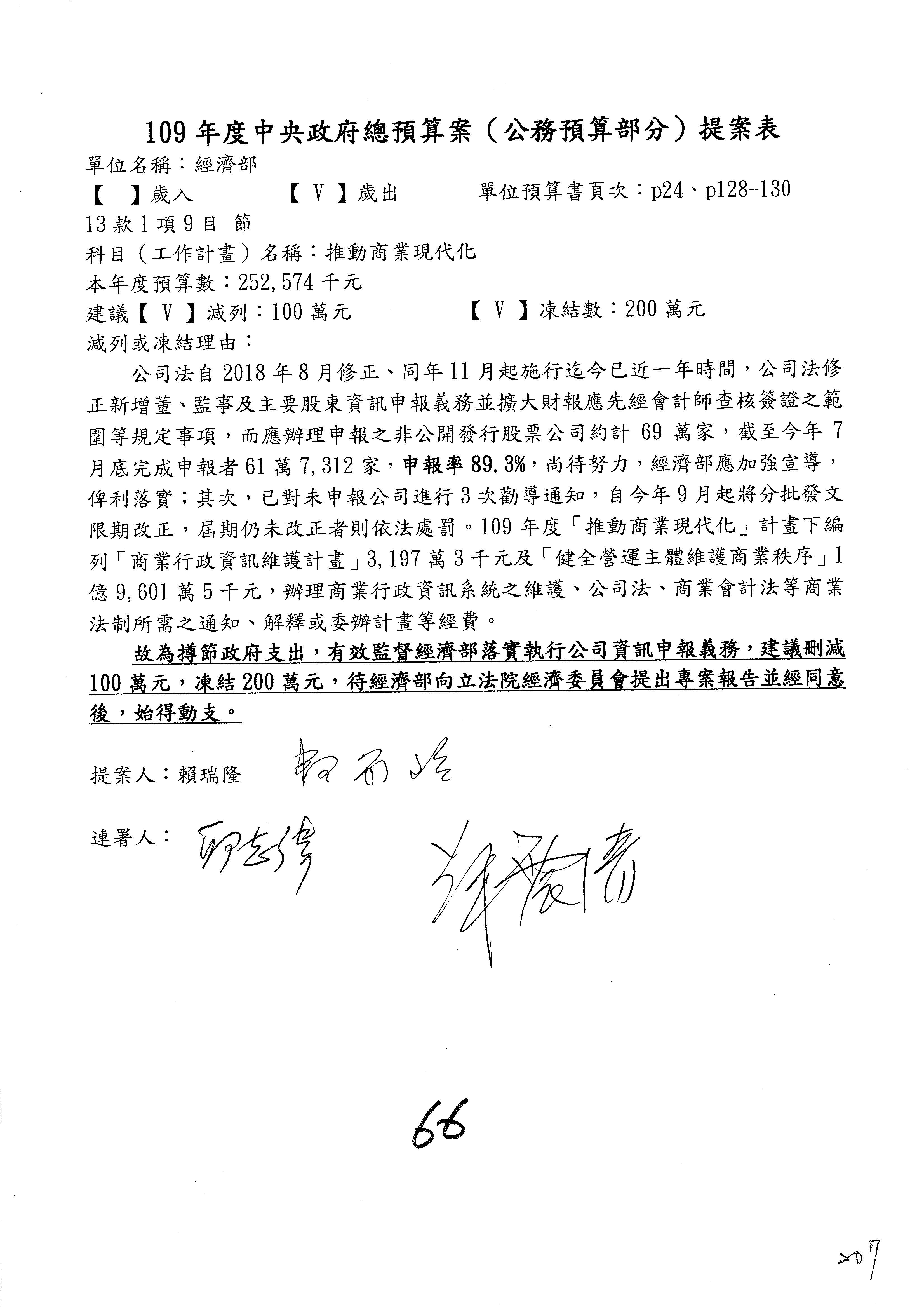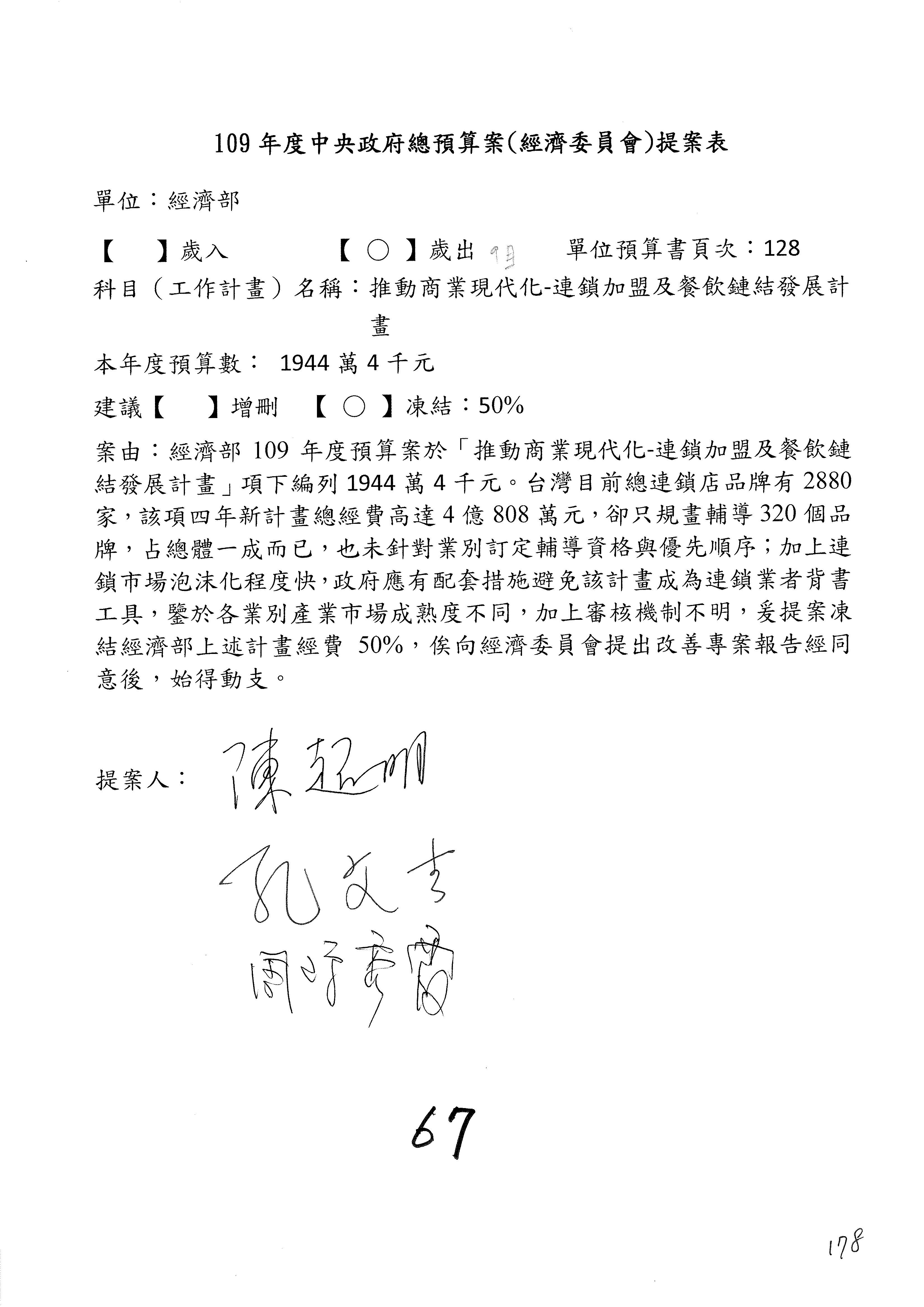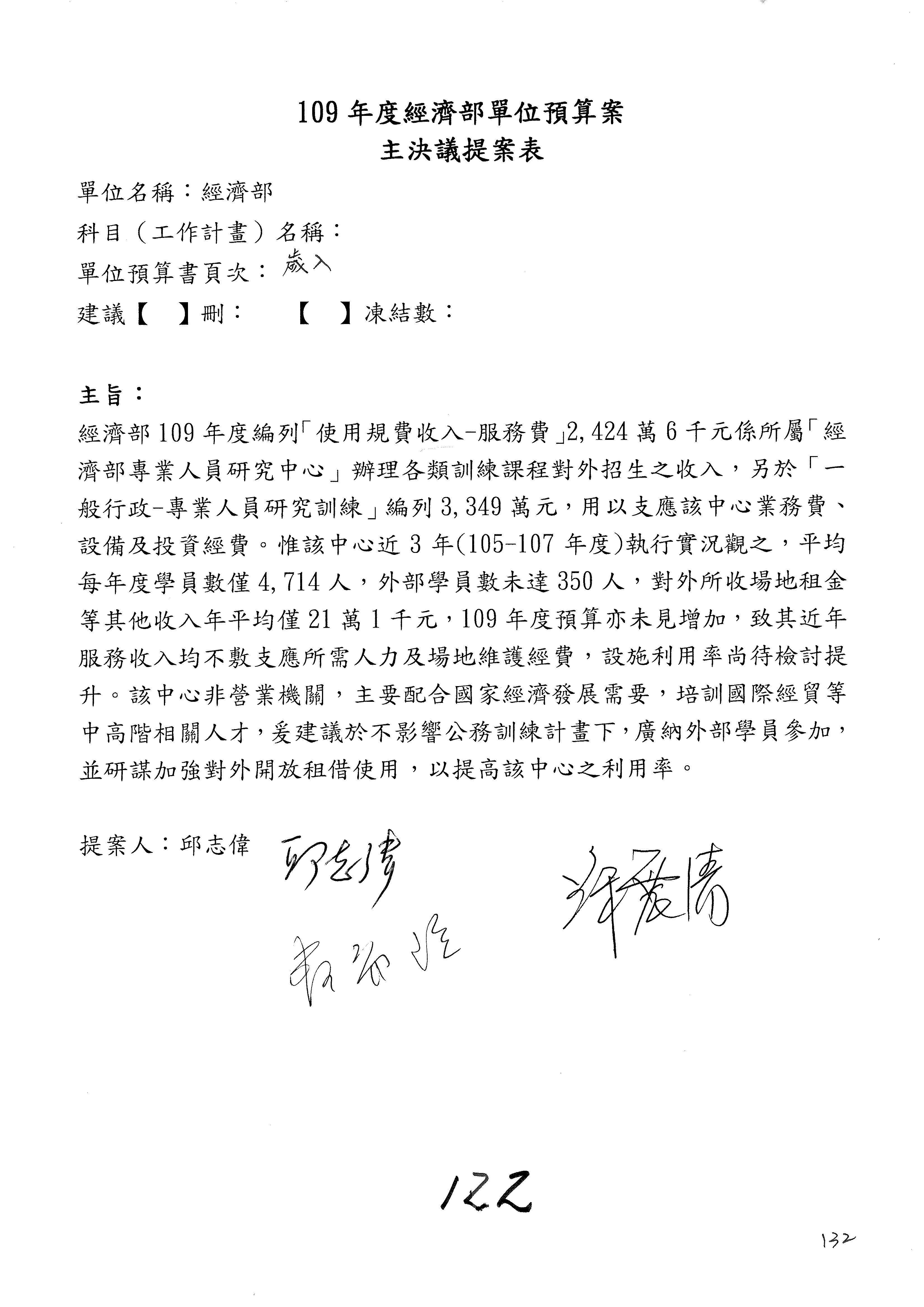 (一)國家發展委員會109年度歲出預算第3目「研擬經濟政策、協調推動財經措施」編列1,773萬3千元,凍結5%,俟向立法院經濟委員會提出書面報告後,始得動支。