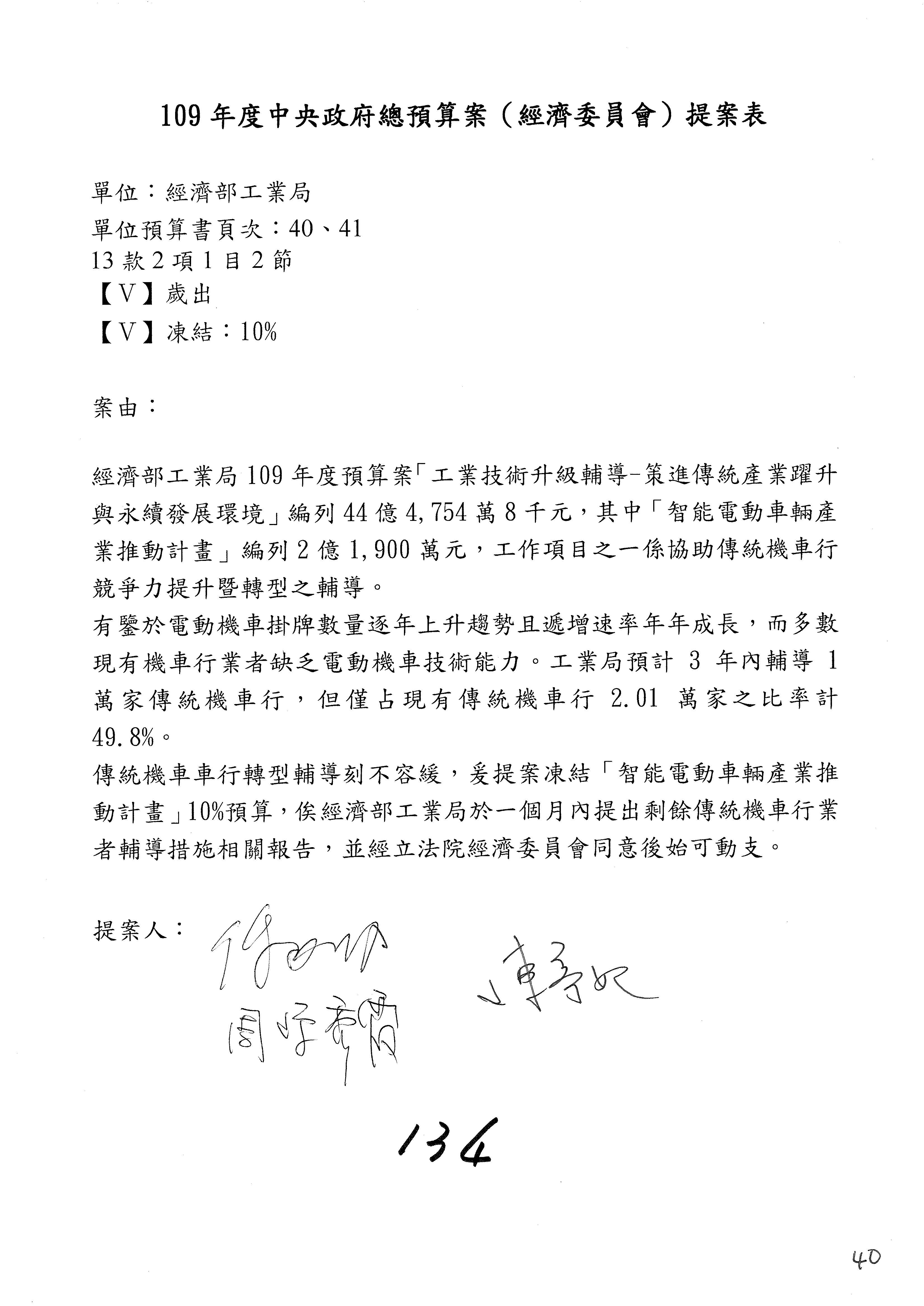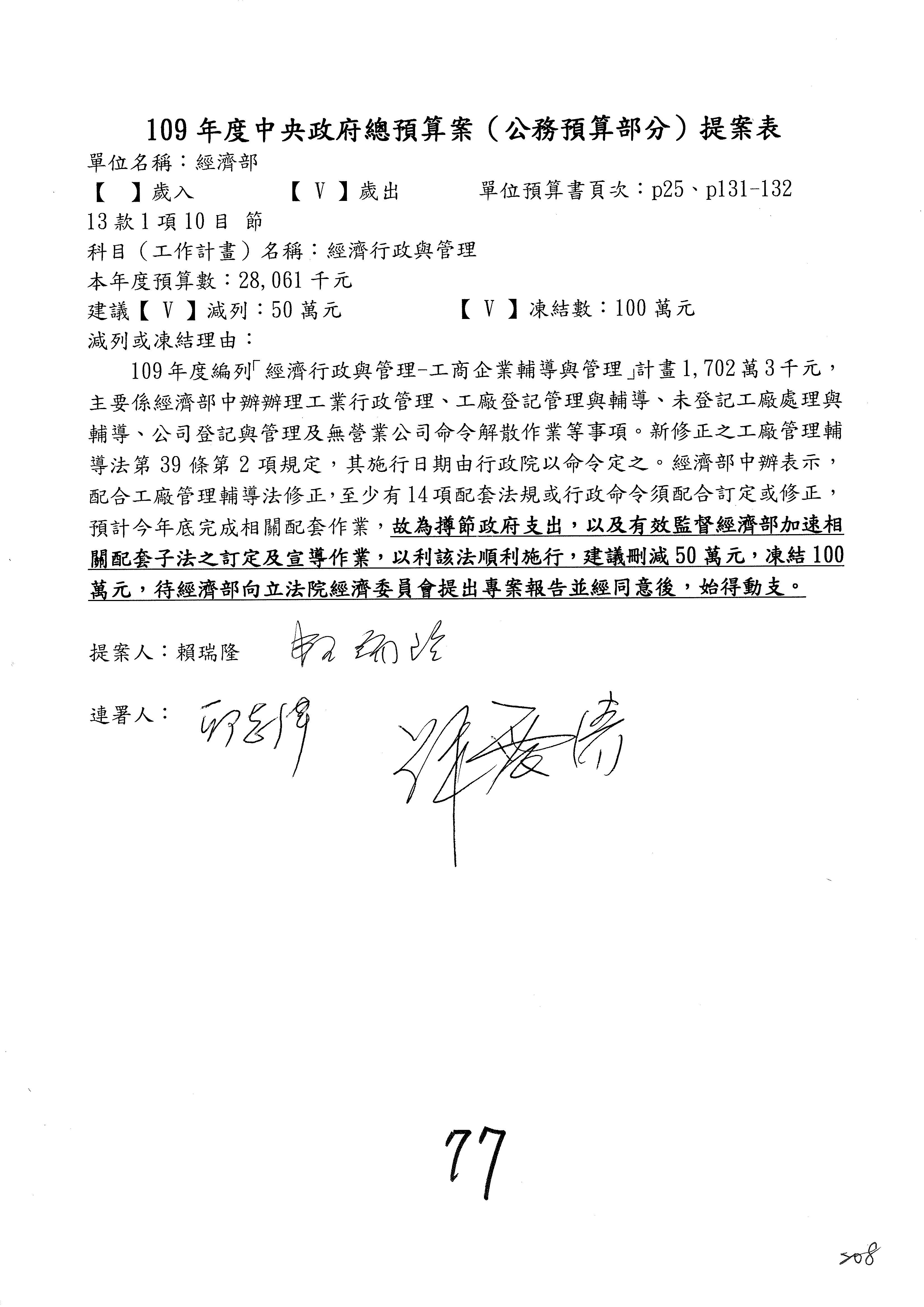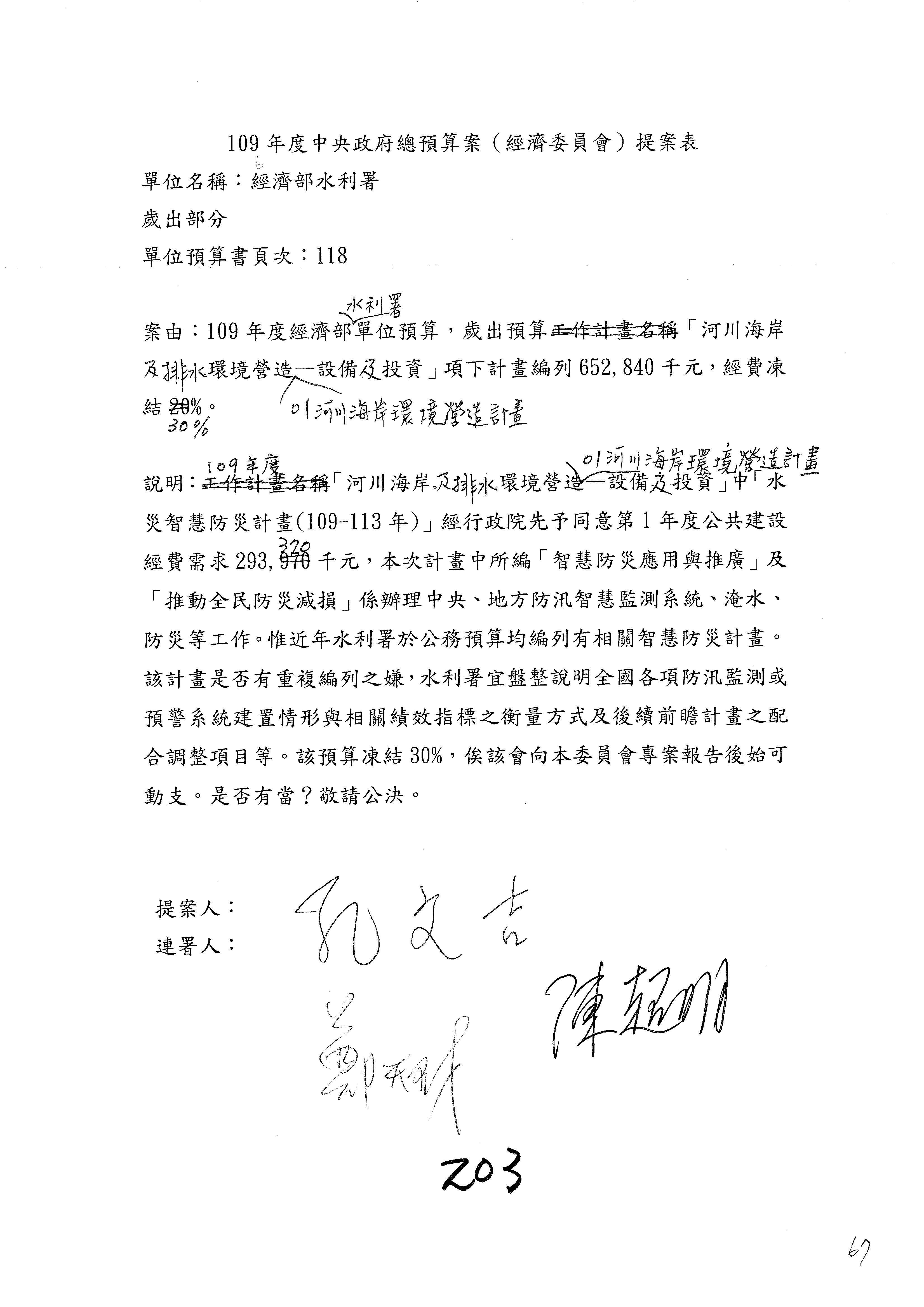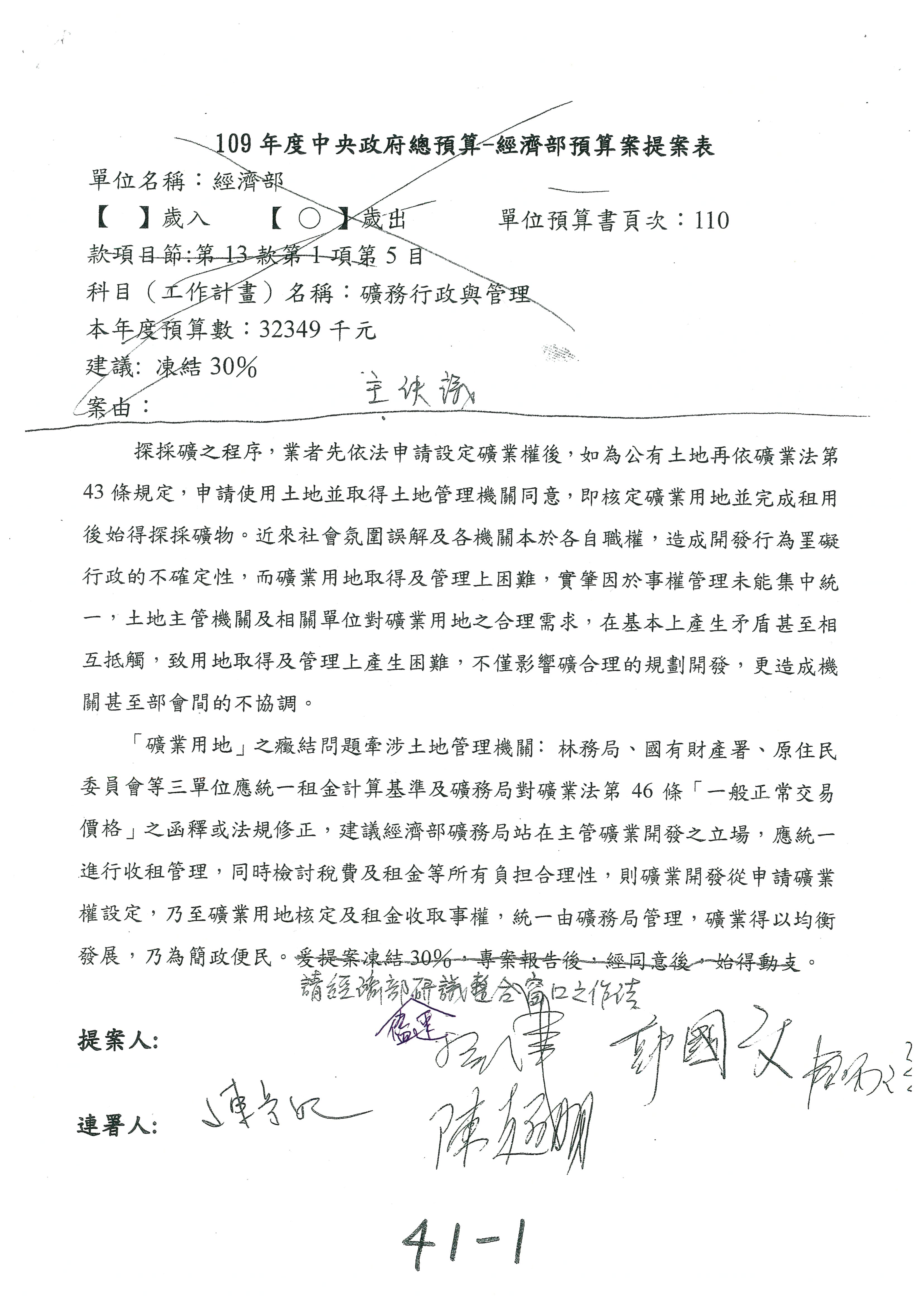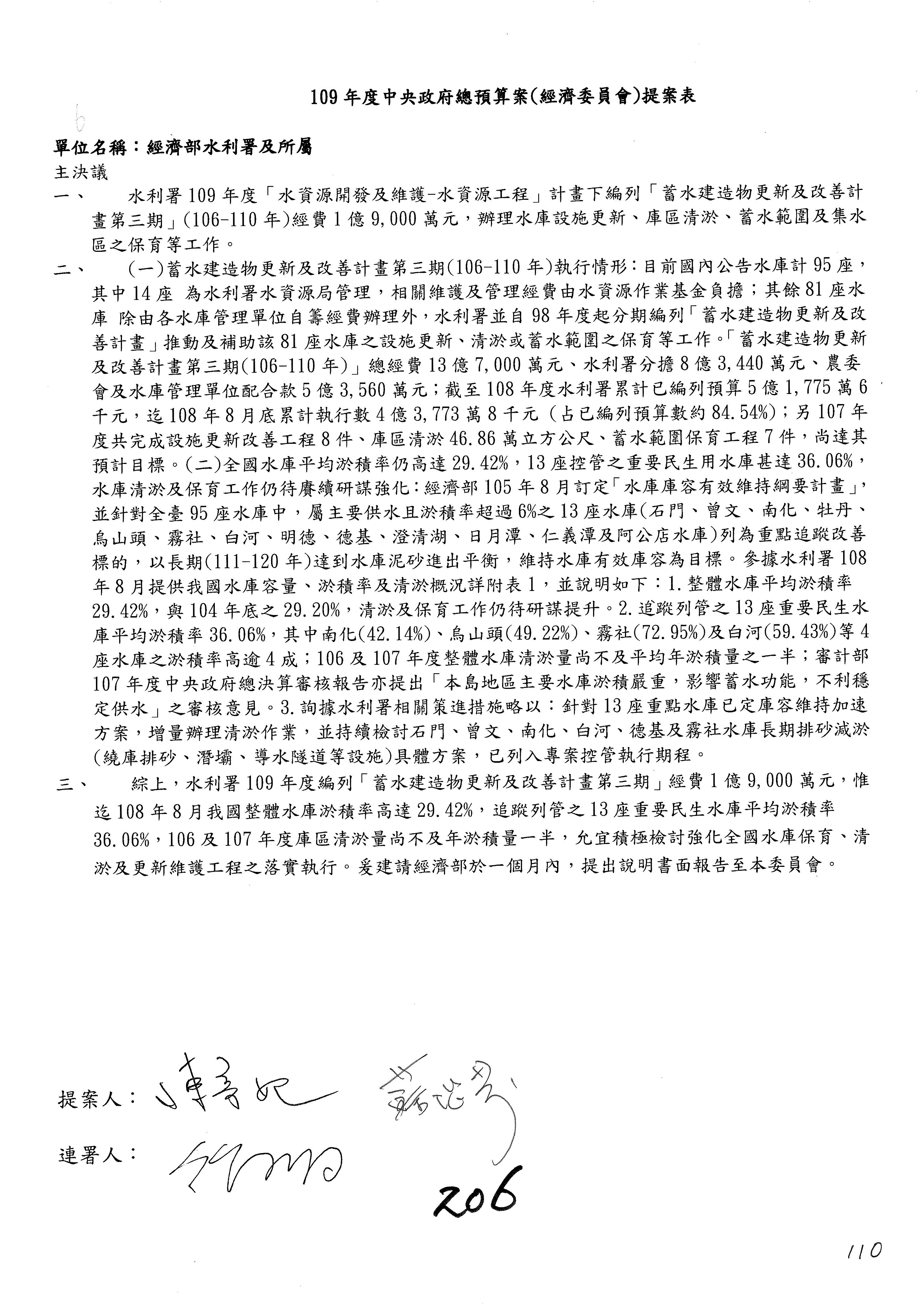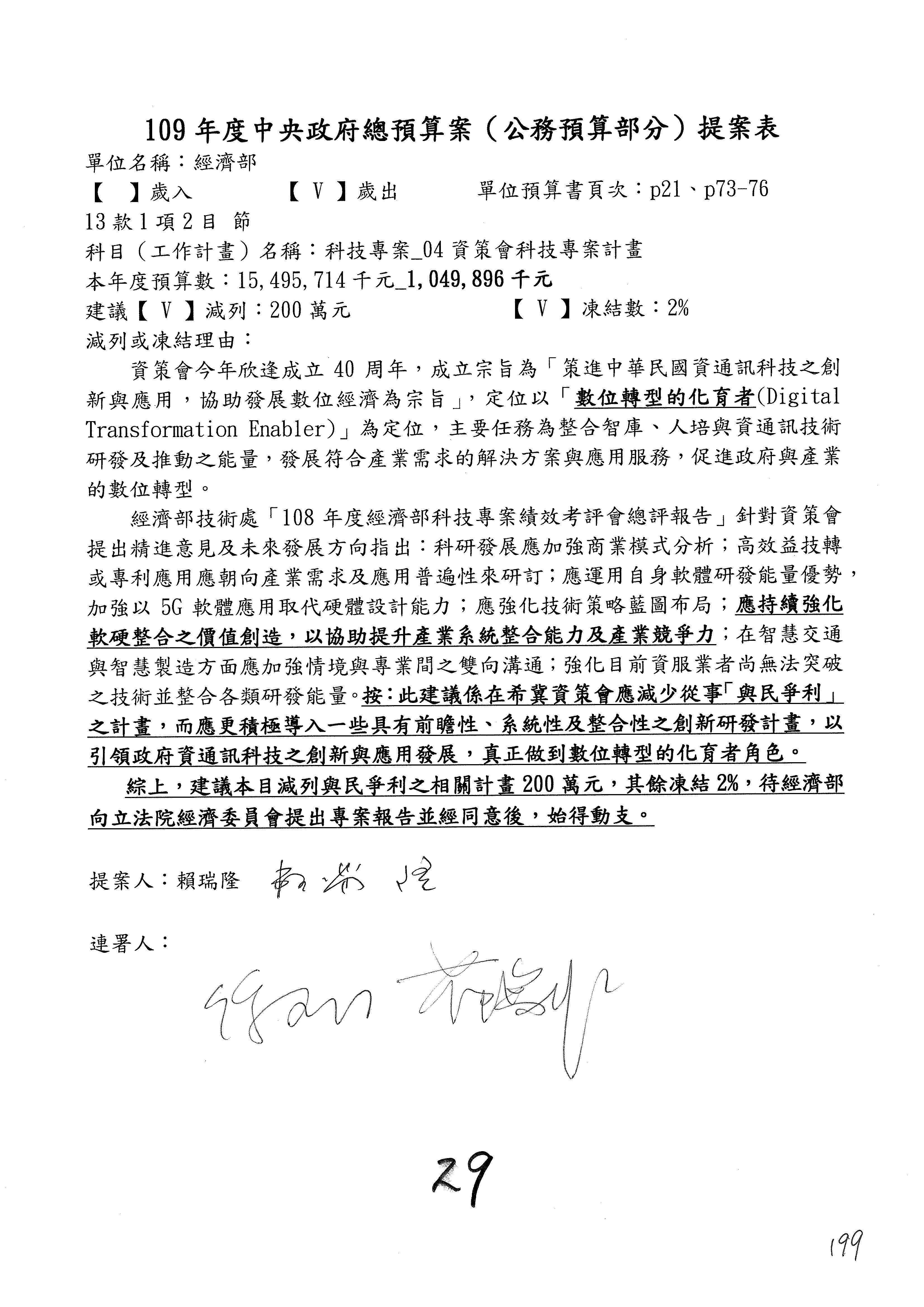 (一)國家發展委員會109年度歲出預算第3目「研擬經濟政策、協調推動財經措施」編列1,773萬3千元,凍結5%,俟向立法院經濟委員會提出書面報告後,始得動支。