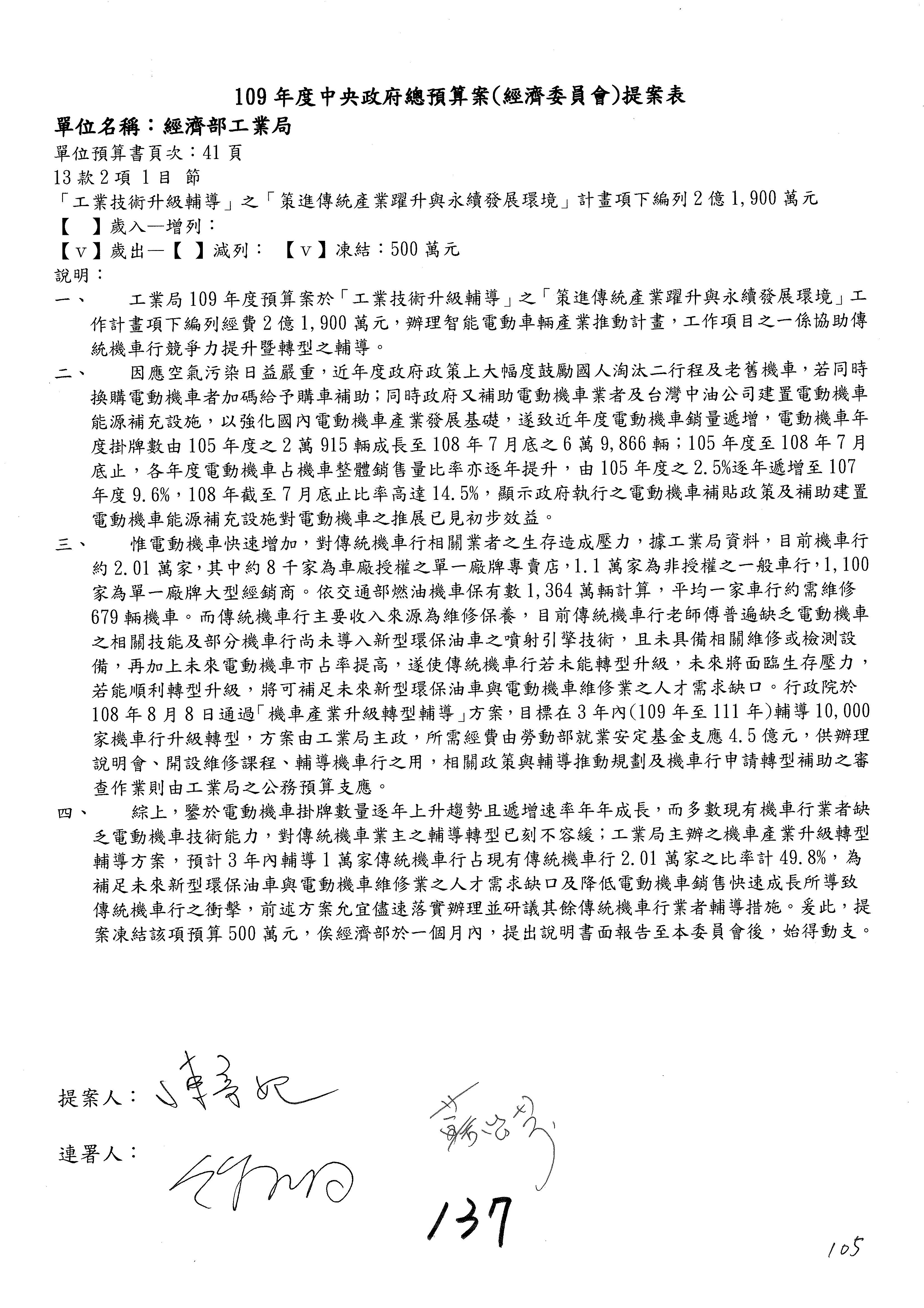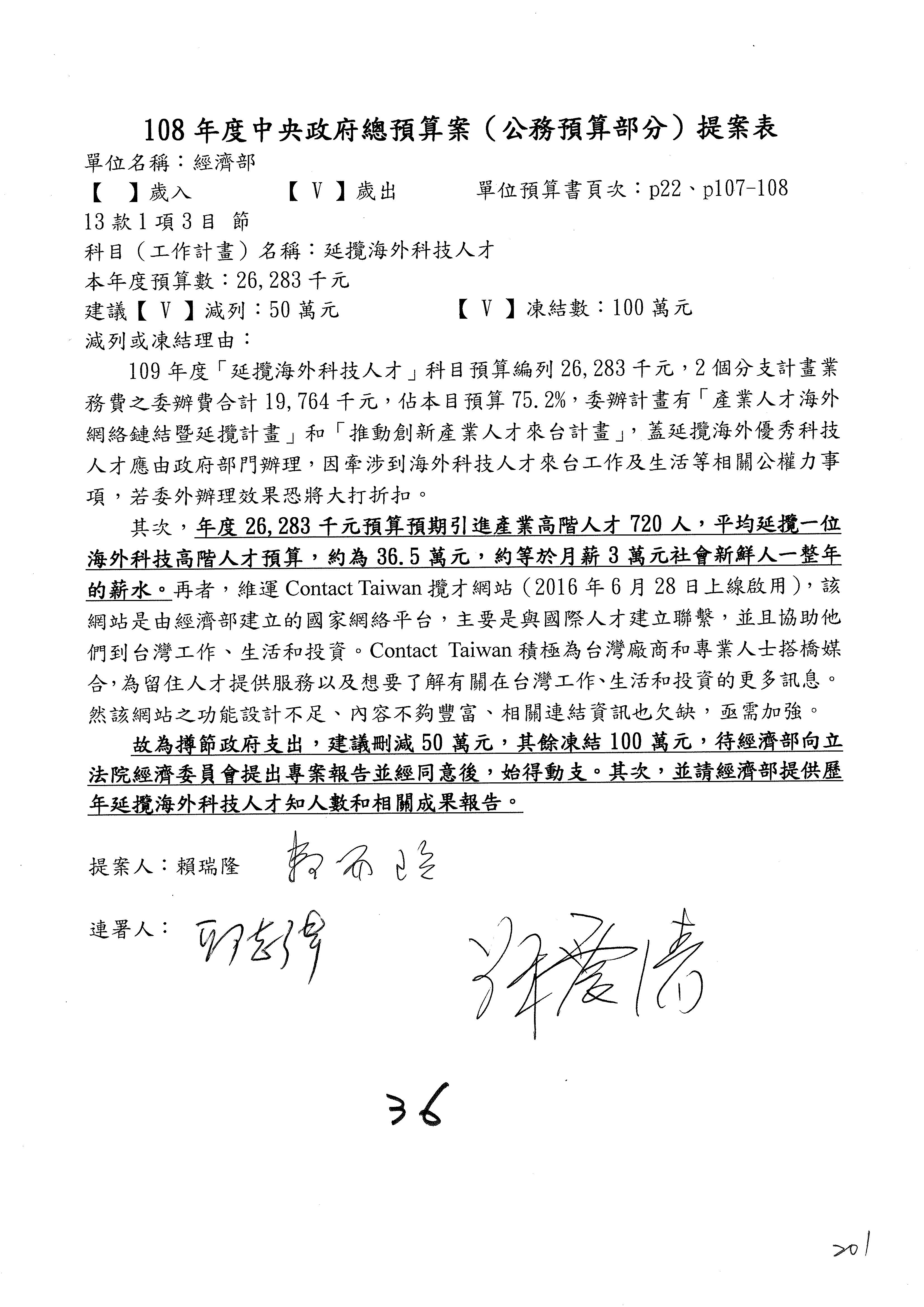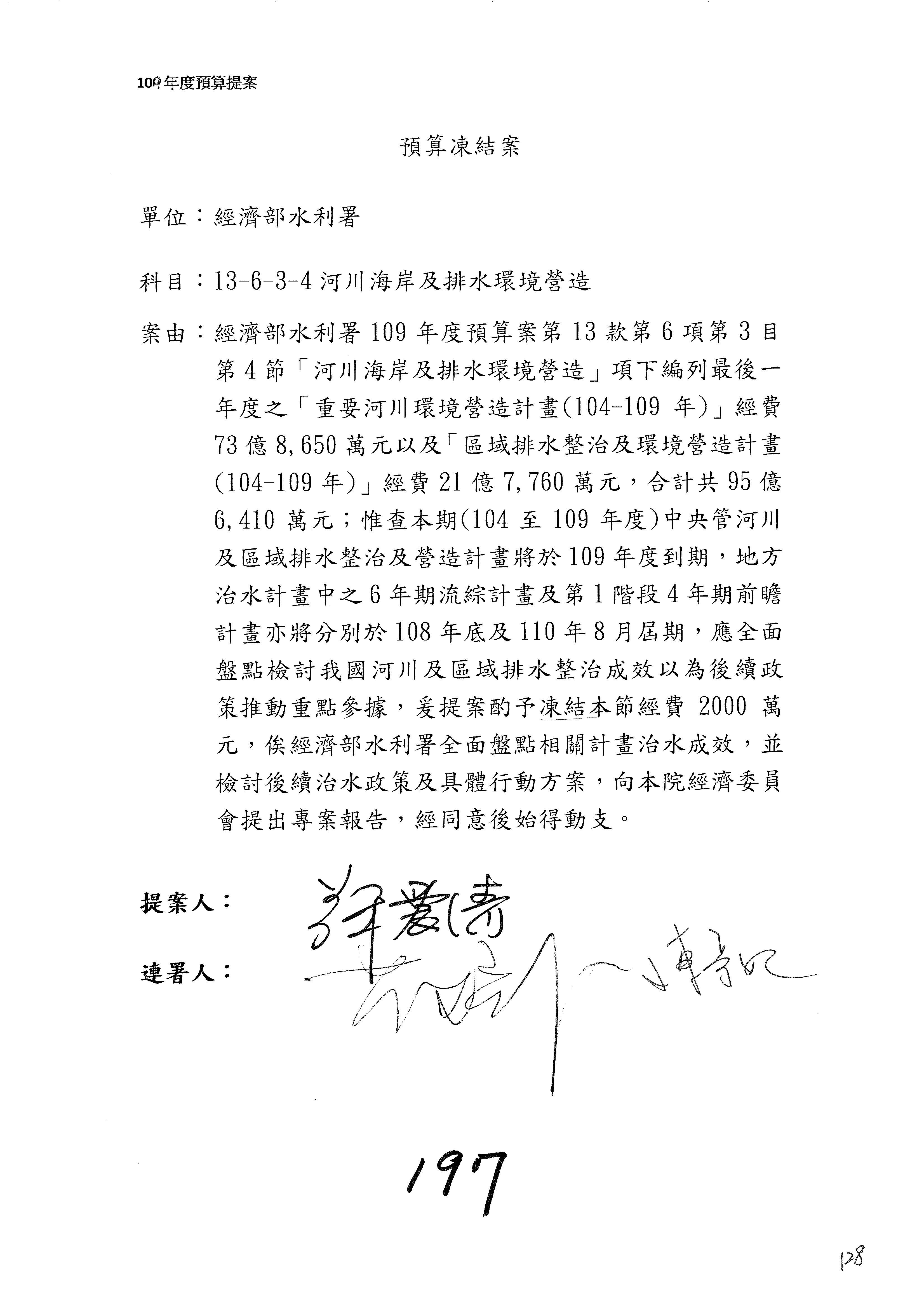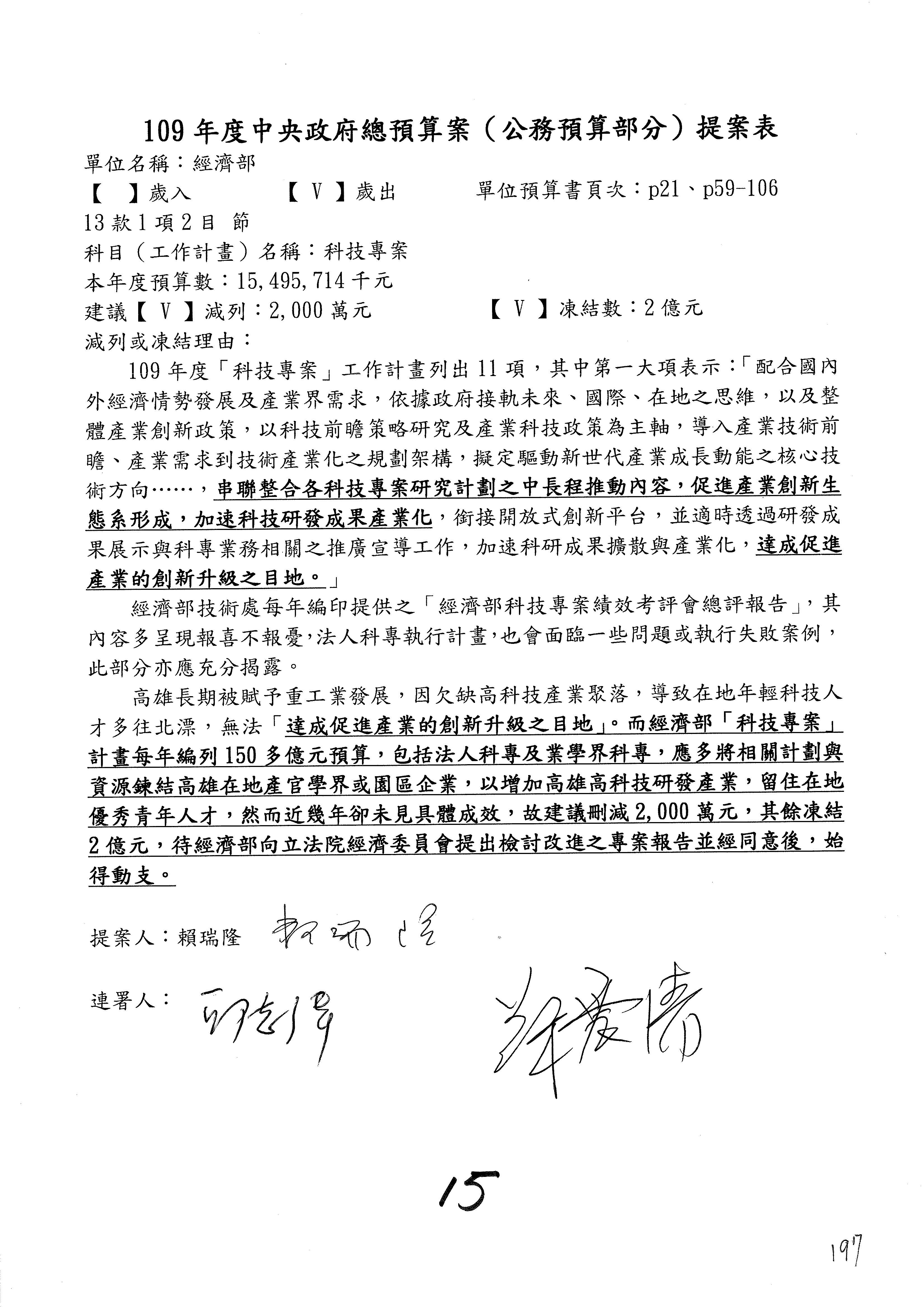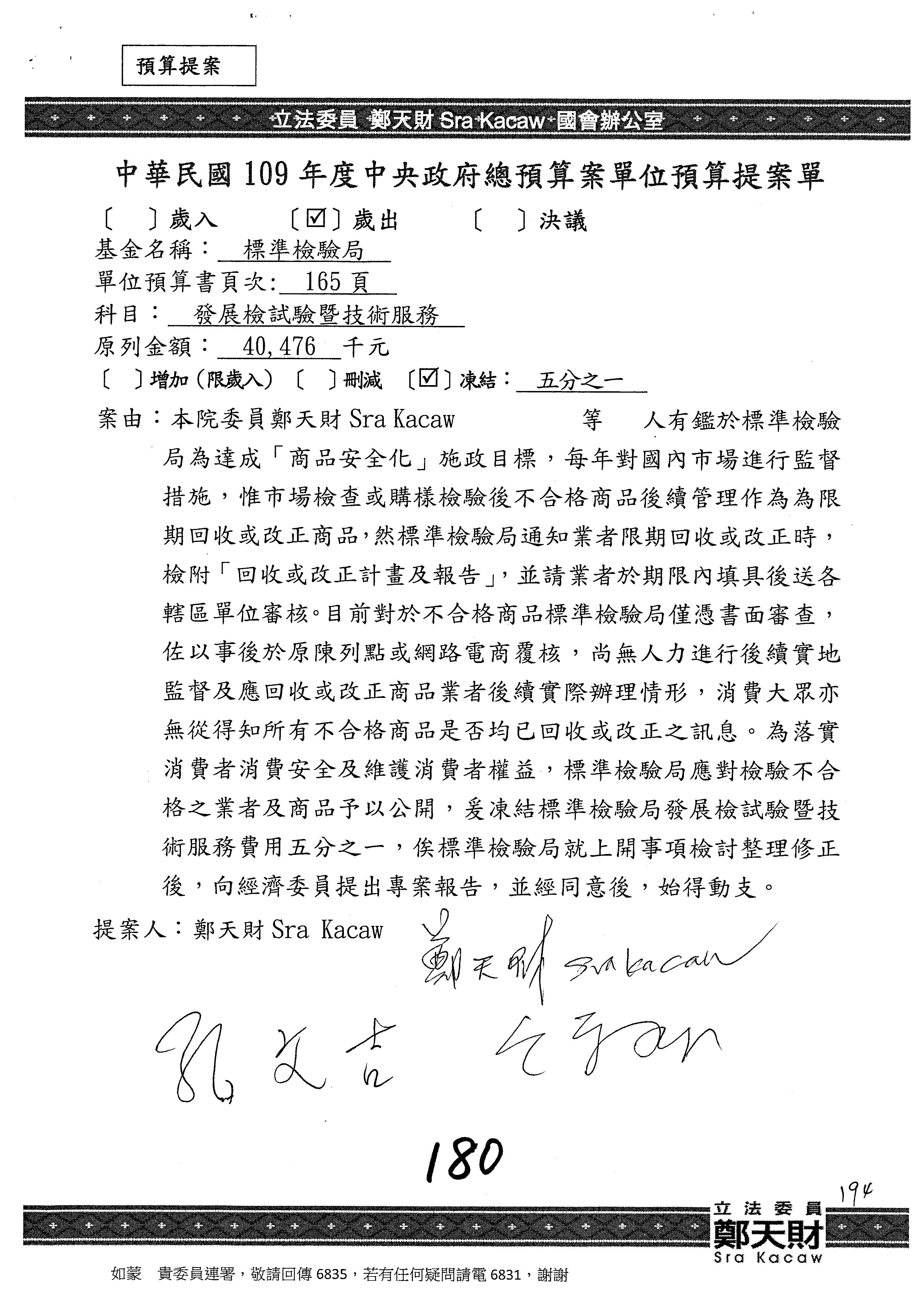 (一)國家發展委員會109年度歲出預算第3目「研擬經濟政策、協調推動財經措施」編列1,773萬3千元,凍結5%,俟向立法院經濟委員會提出書面報告後,始得動支。