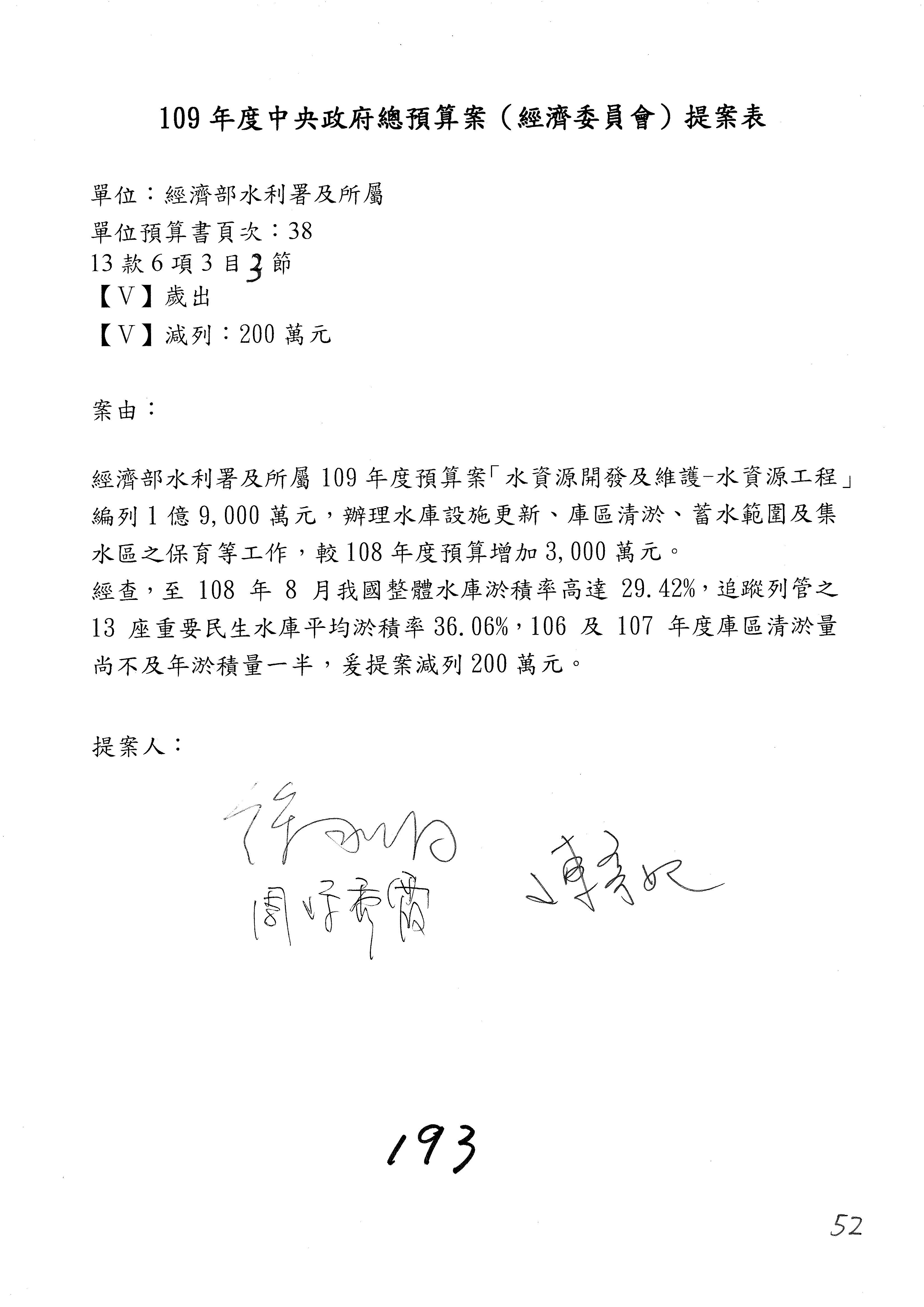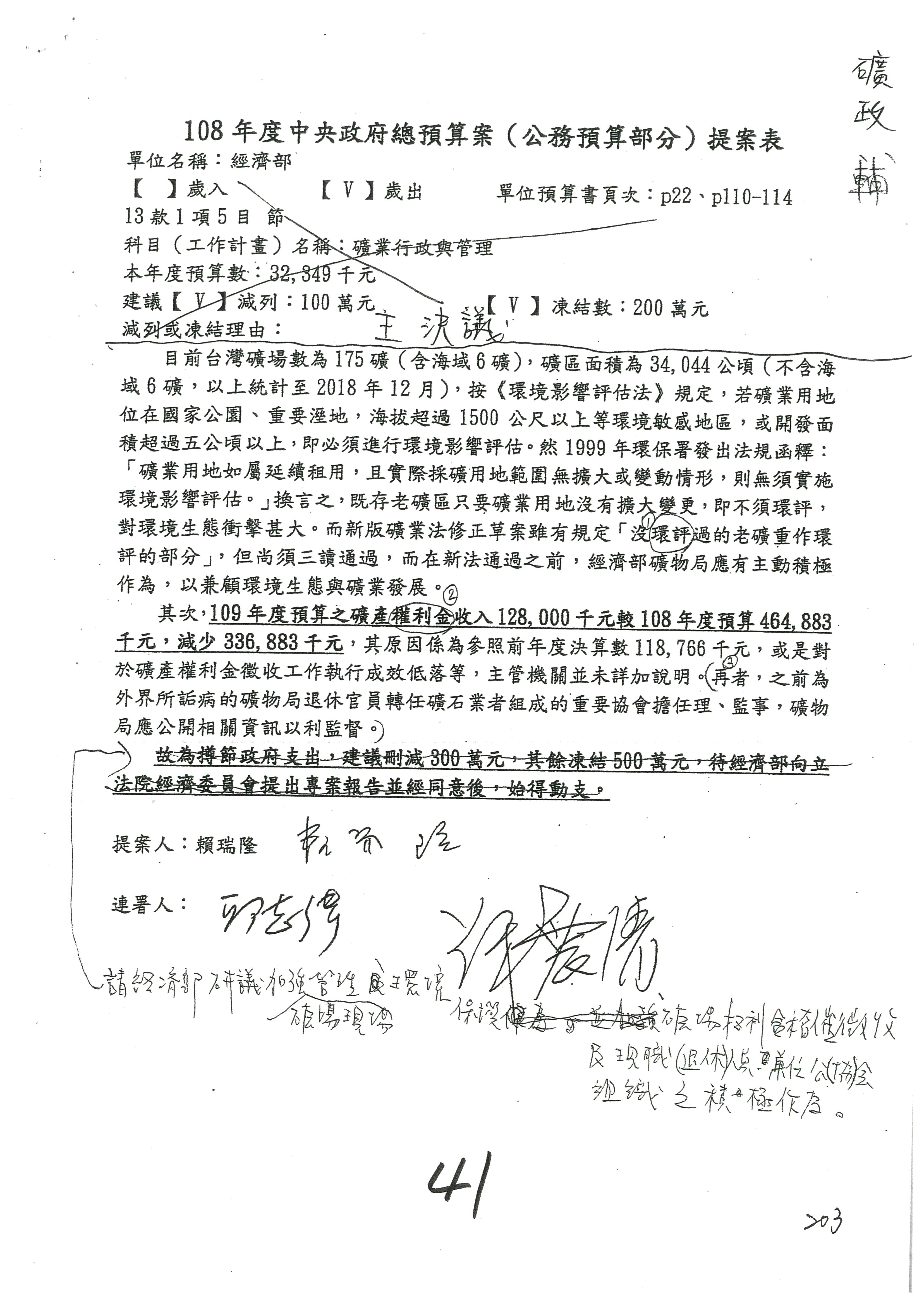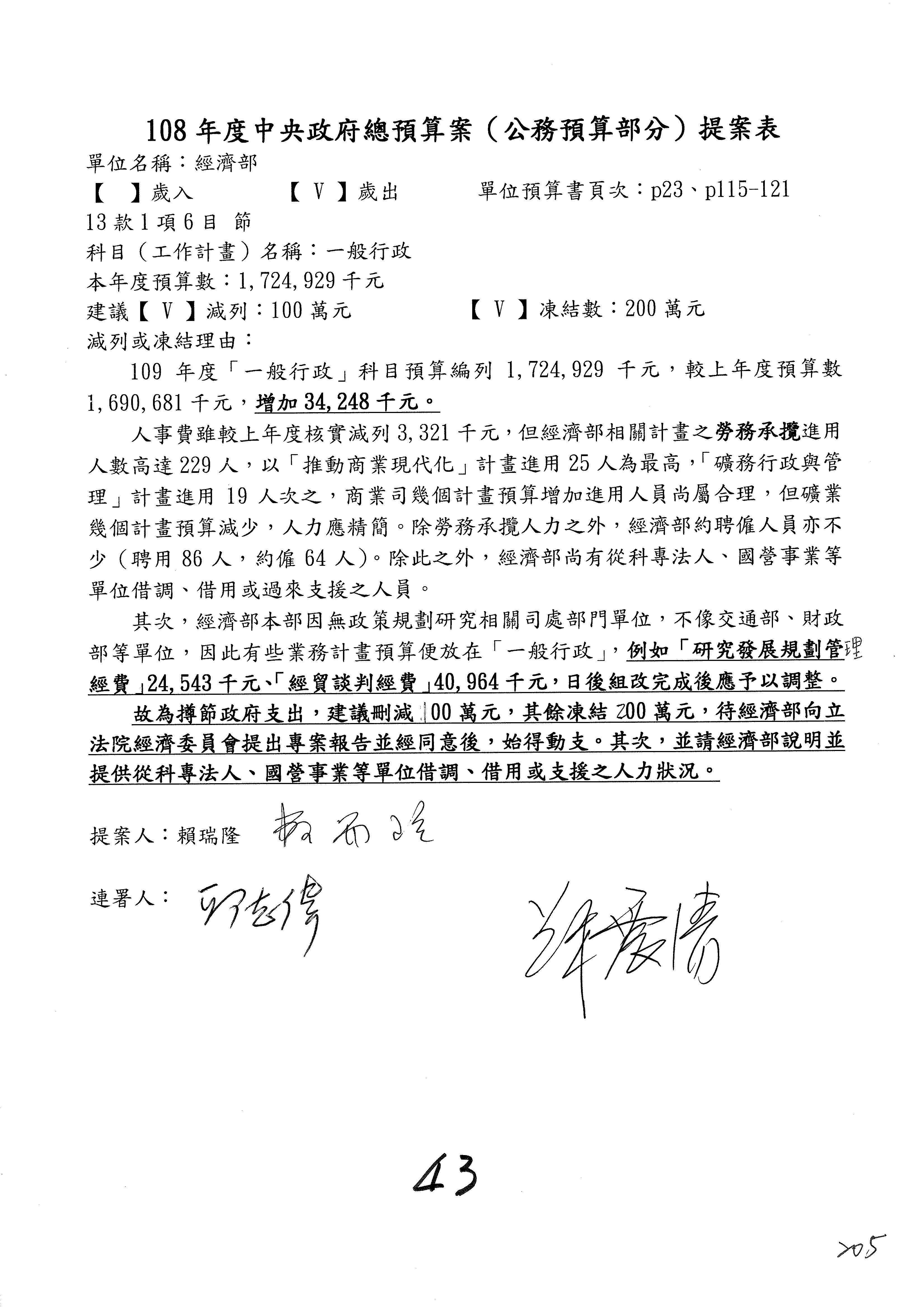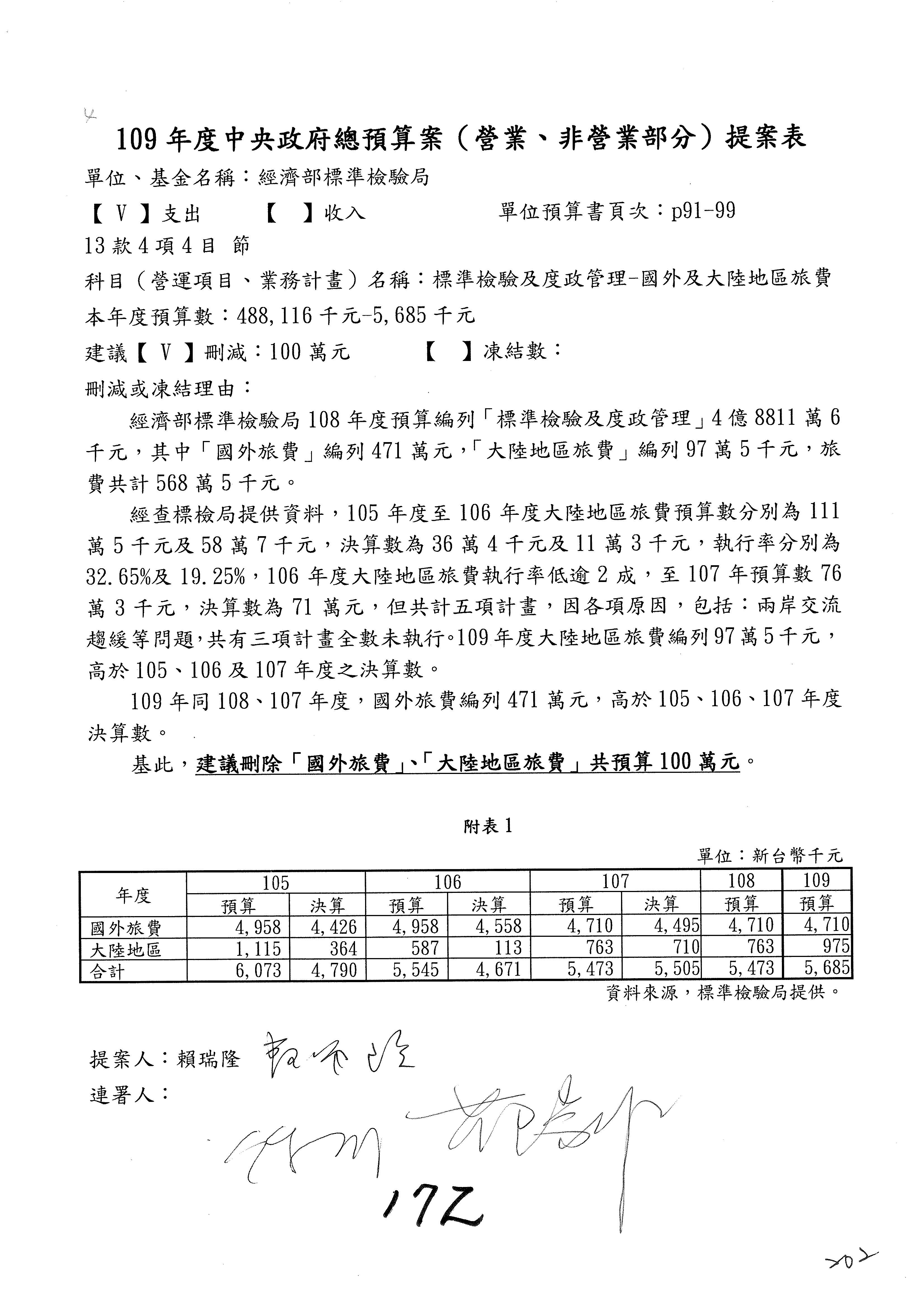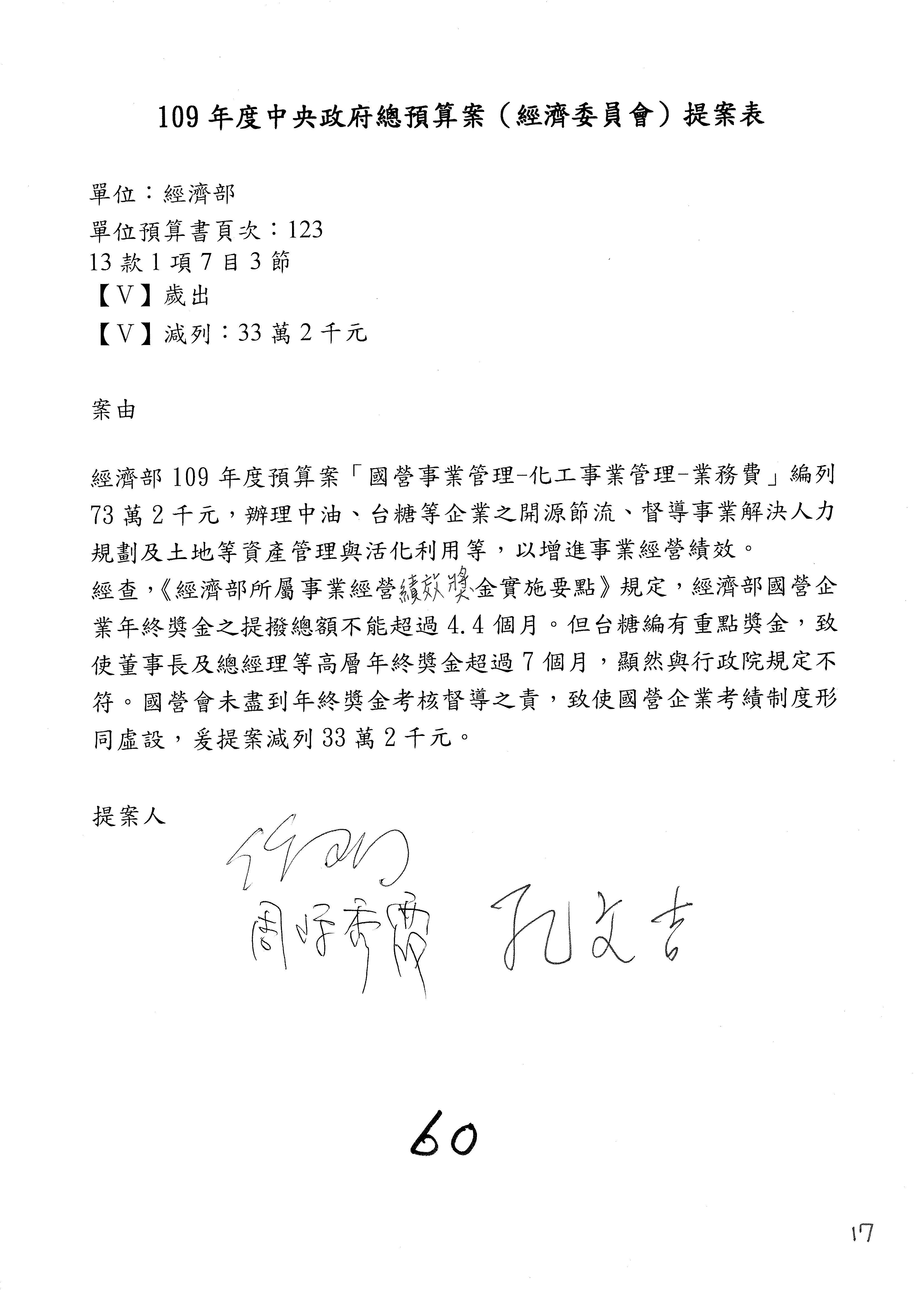 (一)國家發展委員會109年度歲出預算第3目「研擬經濟政策、協調推動財經措施」編列1,773萬3千元,凍結5%,俟向立法院經濟委員會提出書面報告後,始得動支。