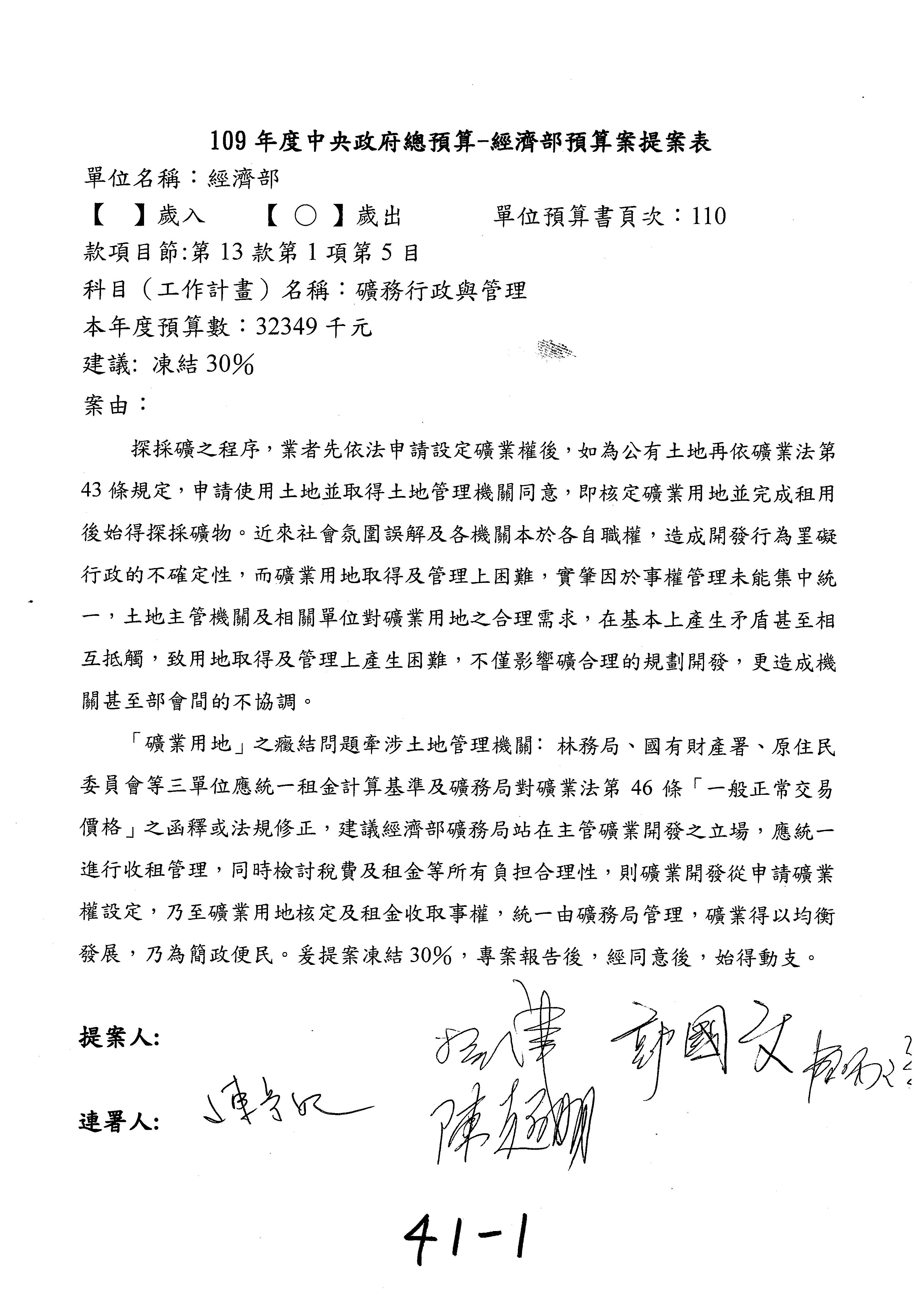 第36案至第40案第3目預算照列。第41案及第41-1案改主決議。