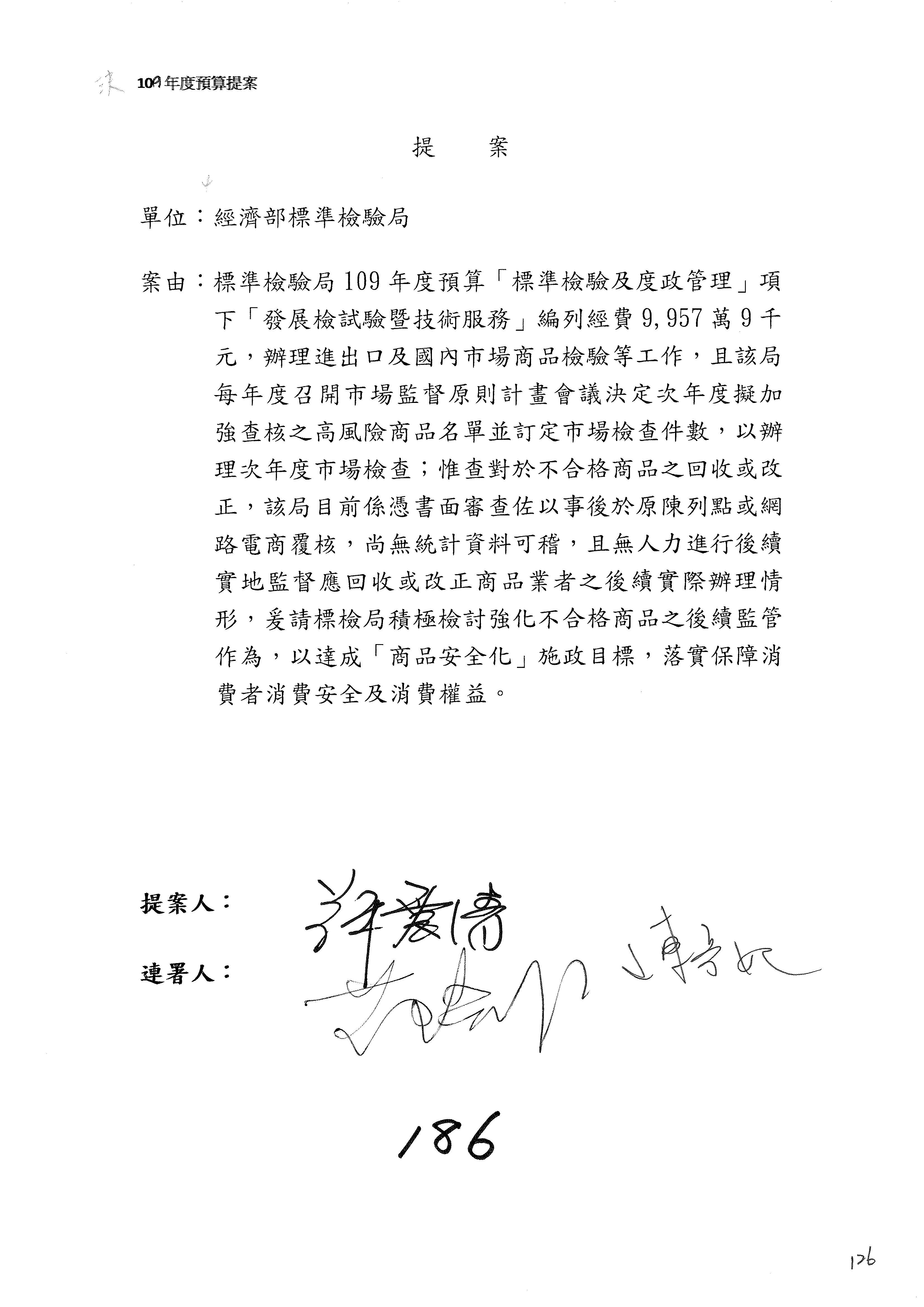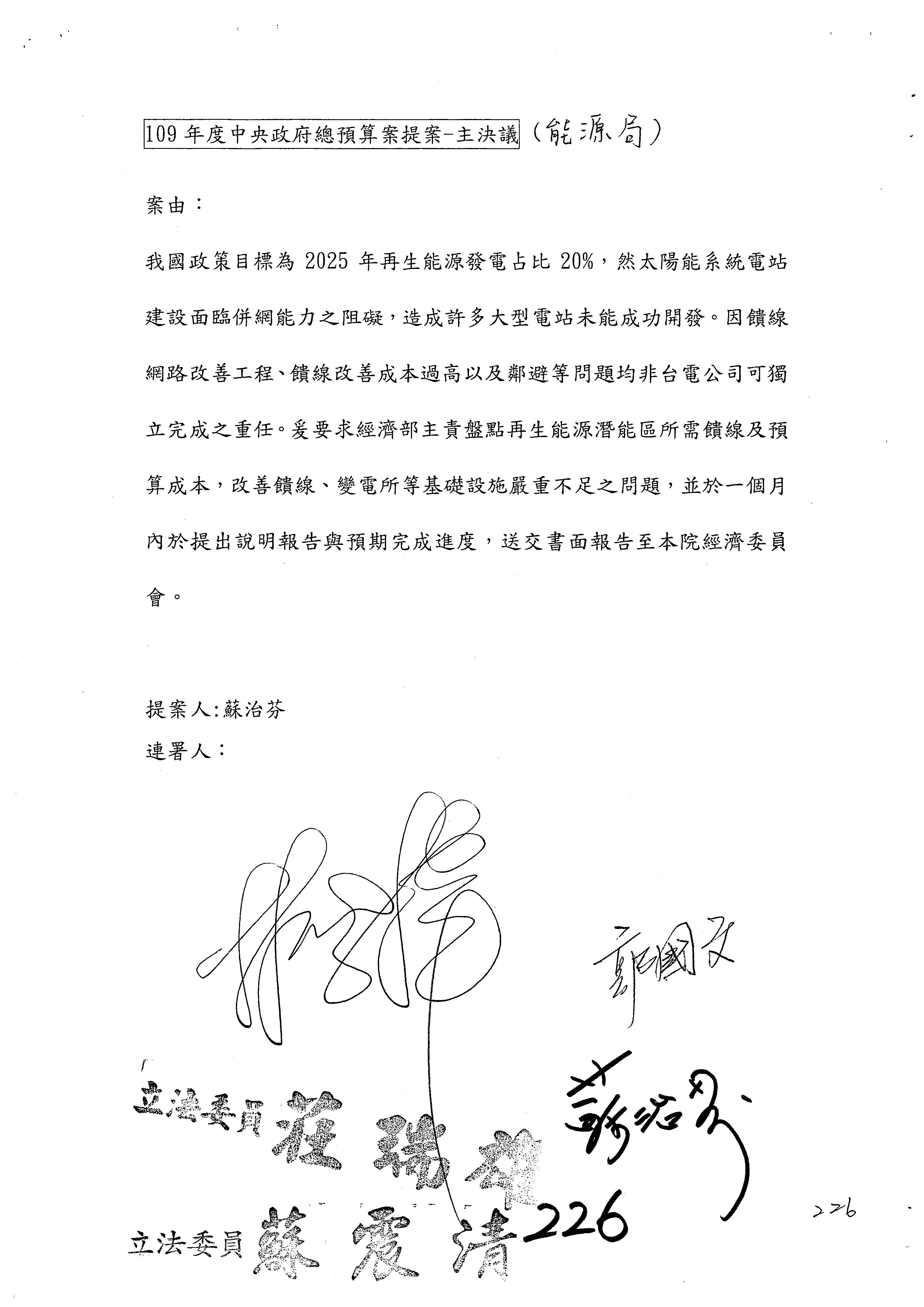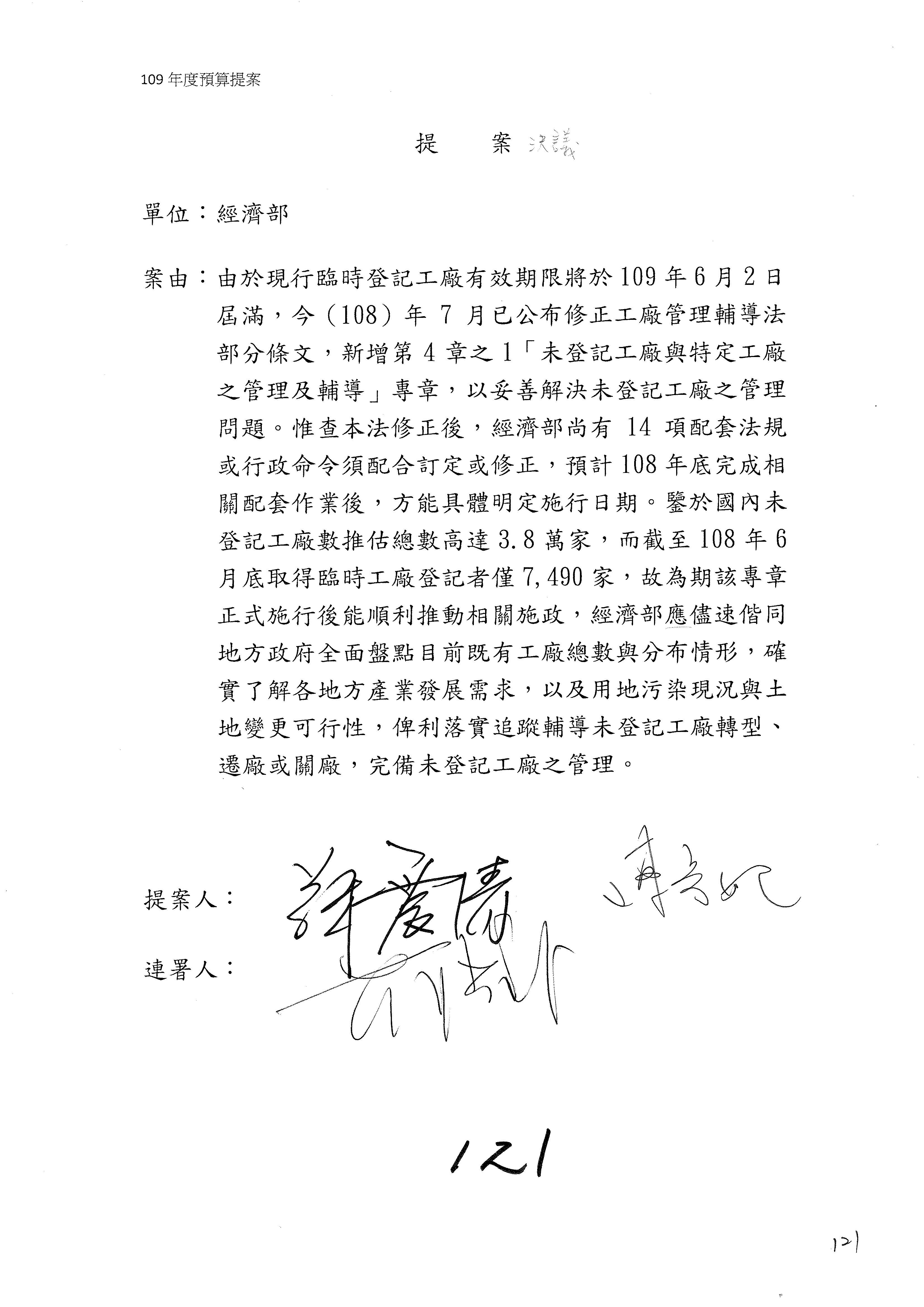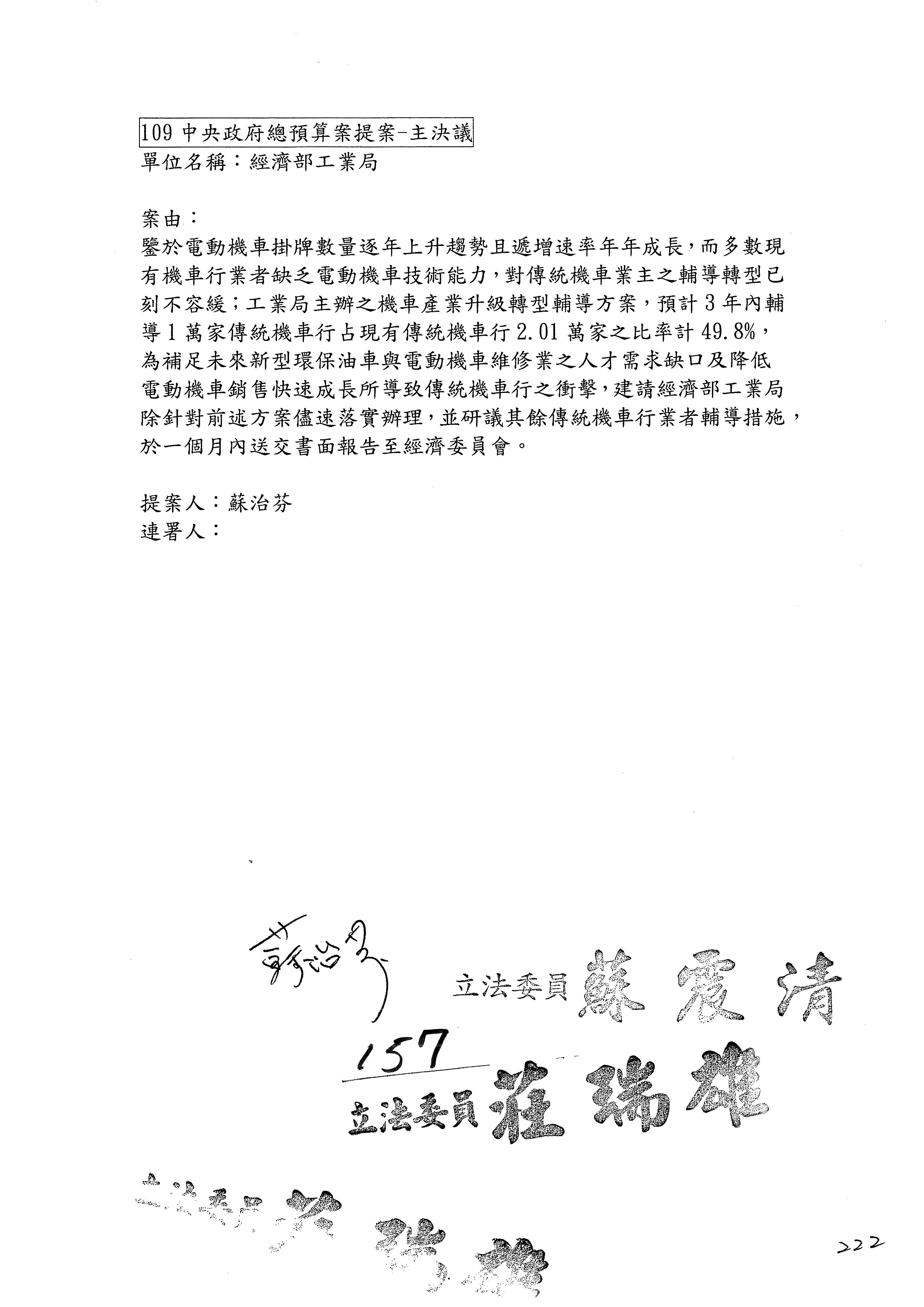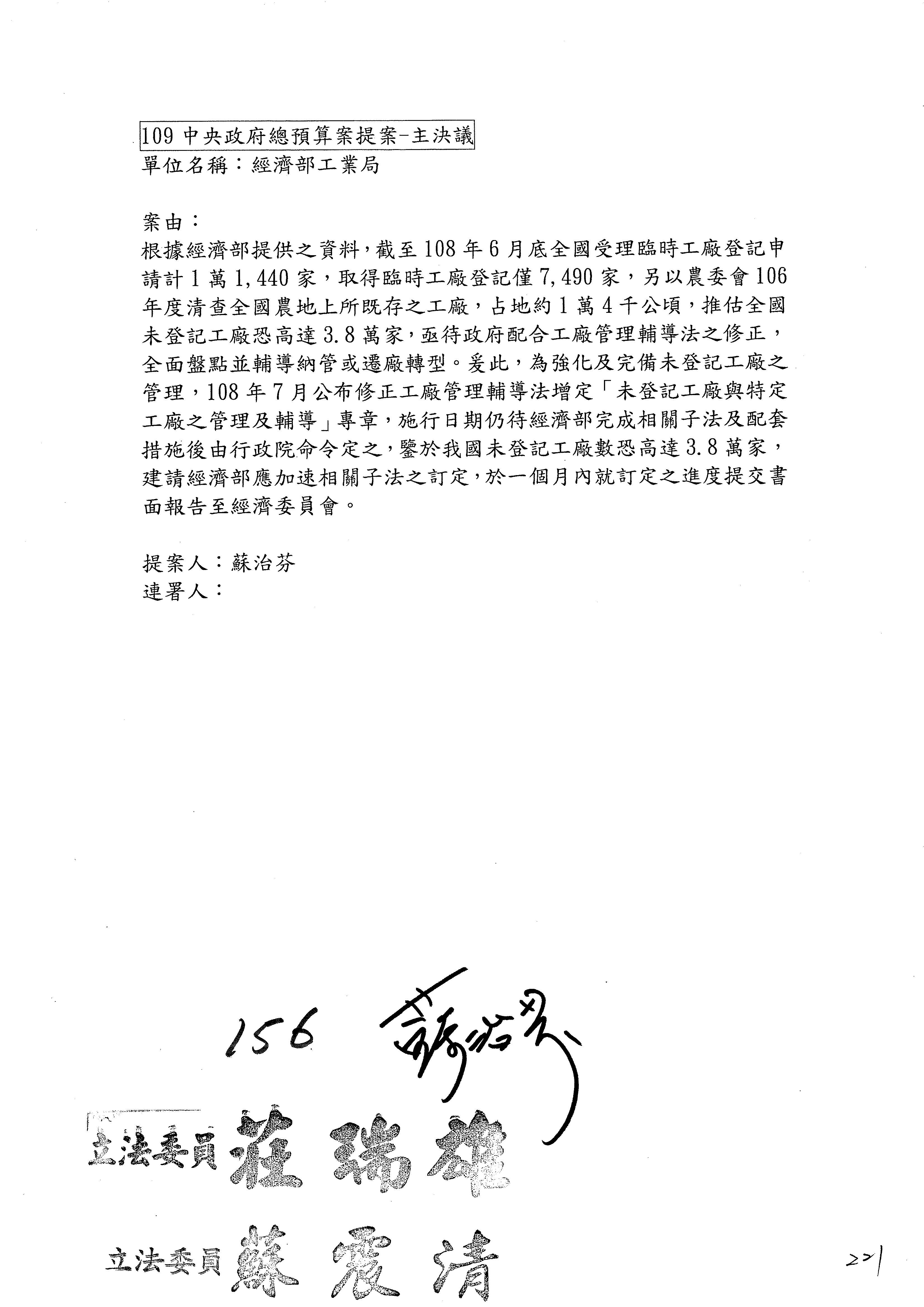 提案人:蘇震清 陳亭妃 邱議瑩 莊瑞雄 徐永明 周陳秀霞 賴瑞隆 陳超明 廖國棟 孔文吉 邱志偉 連署人:郭國文