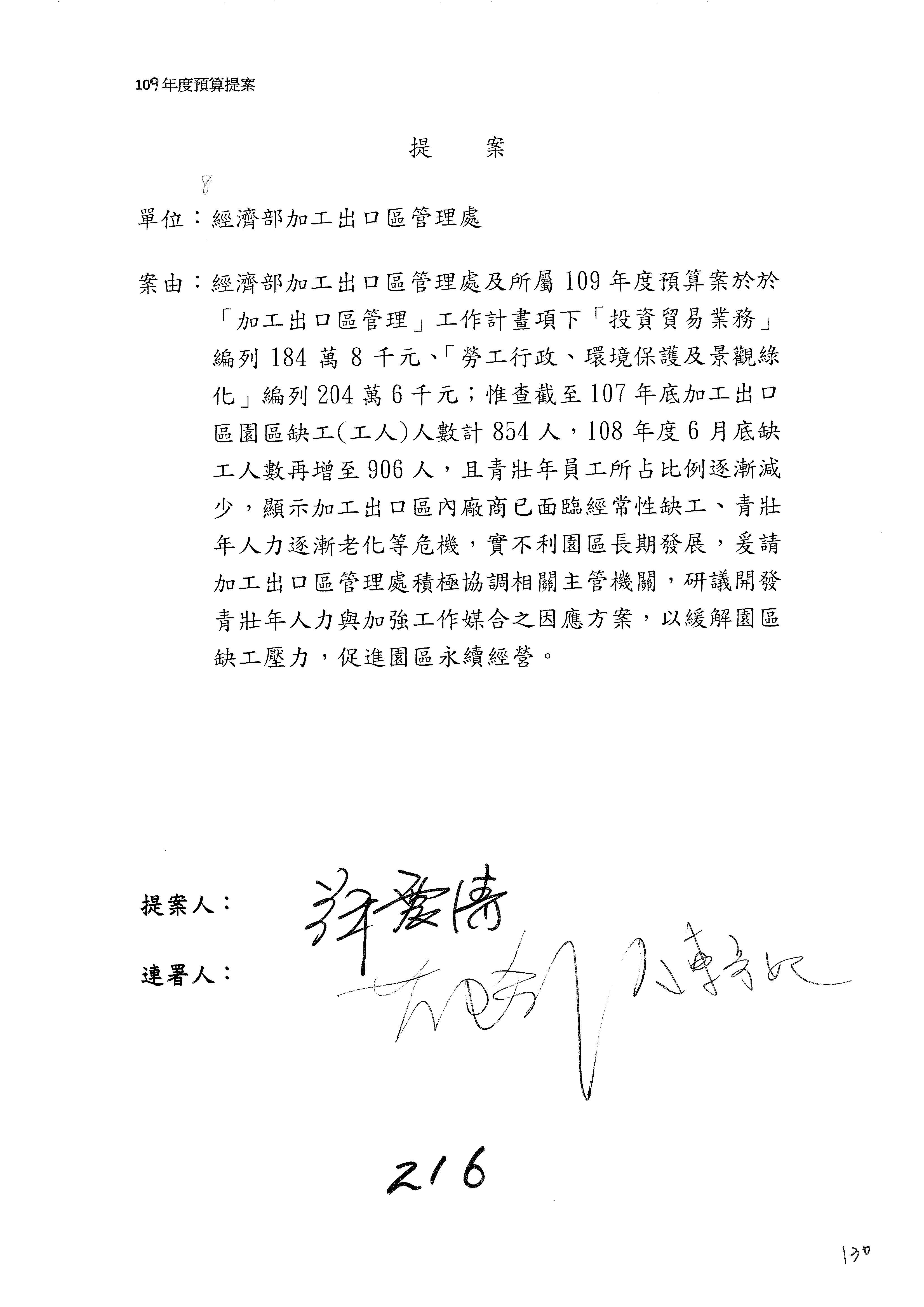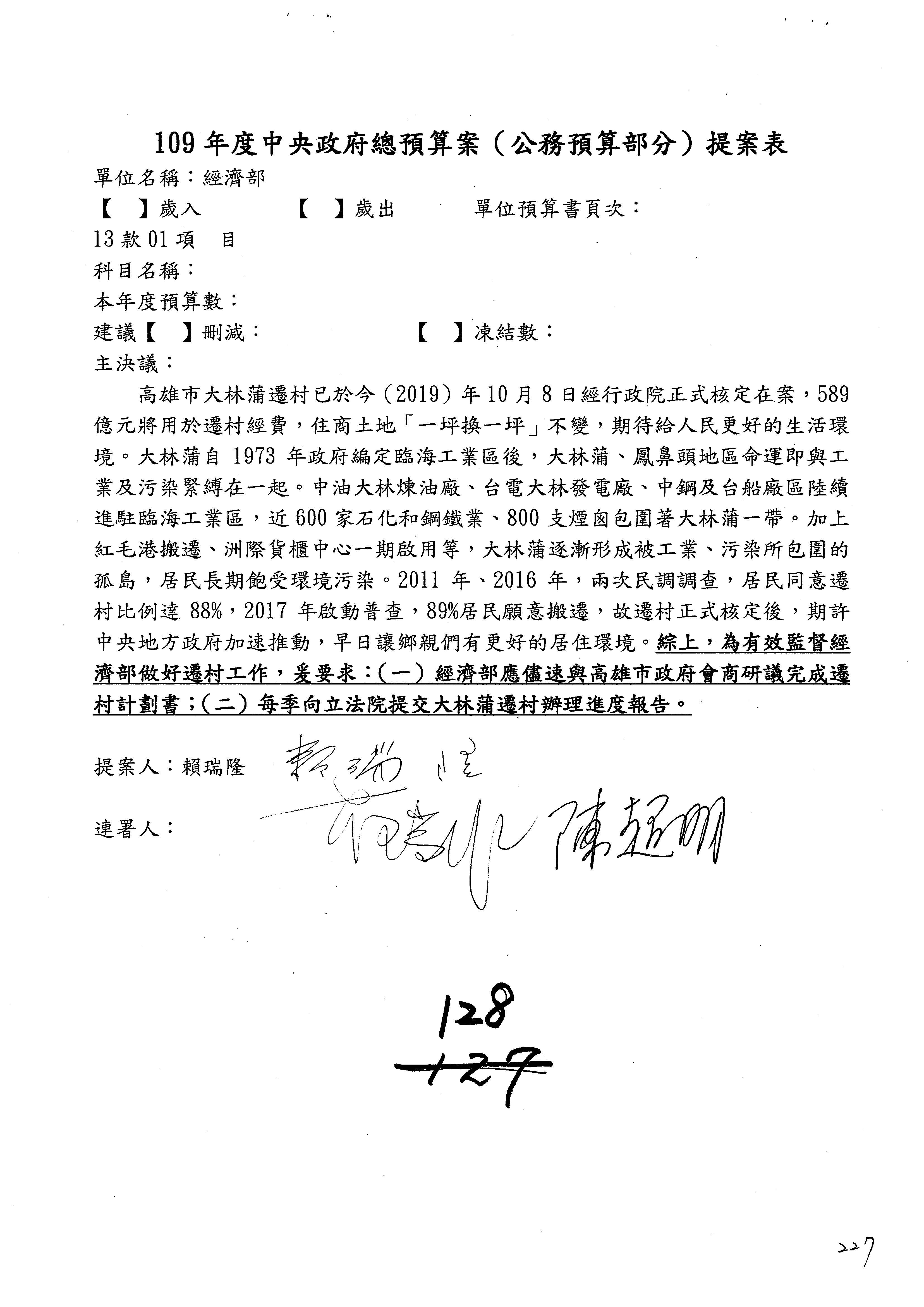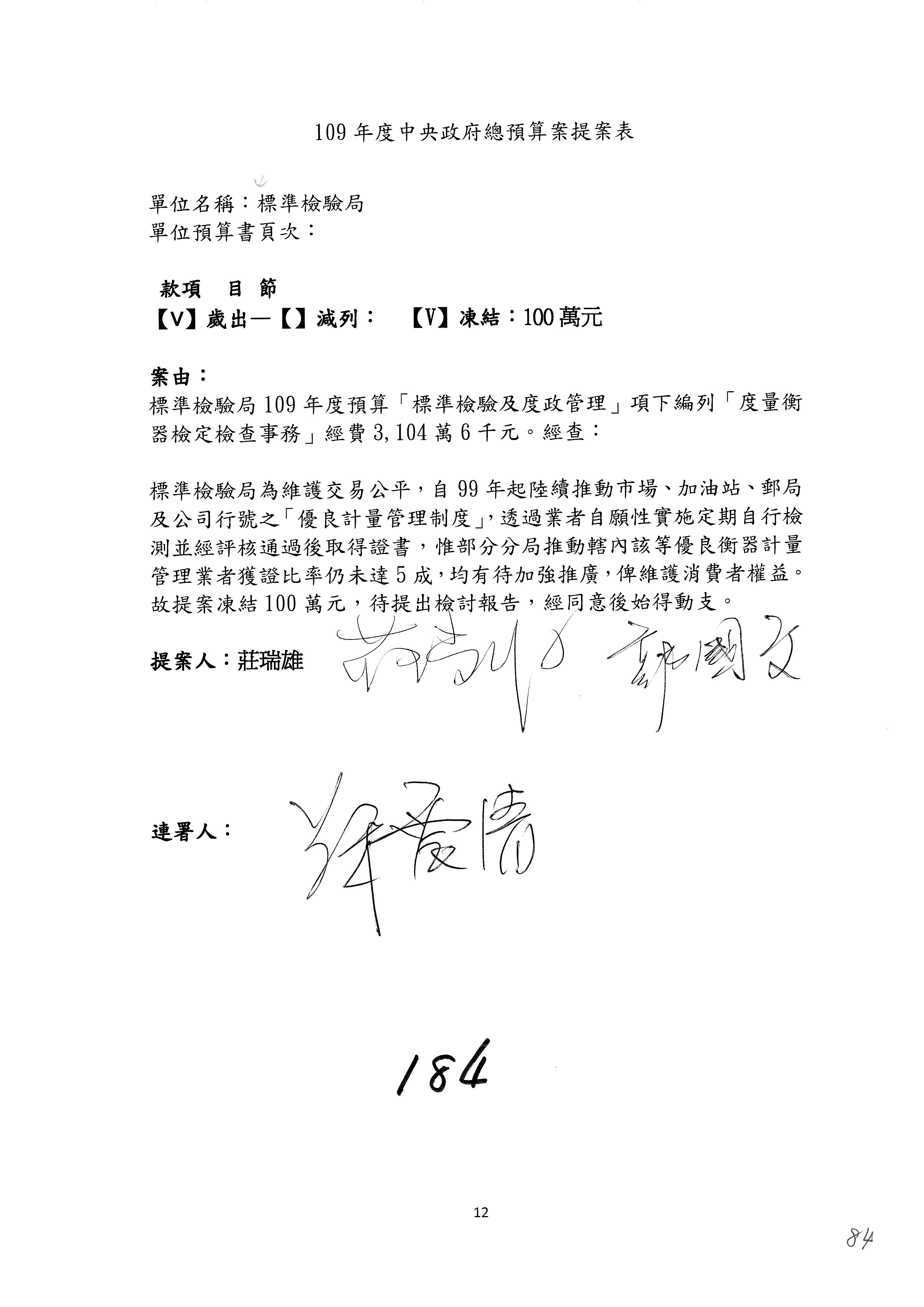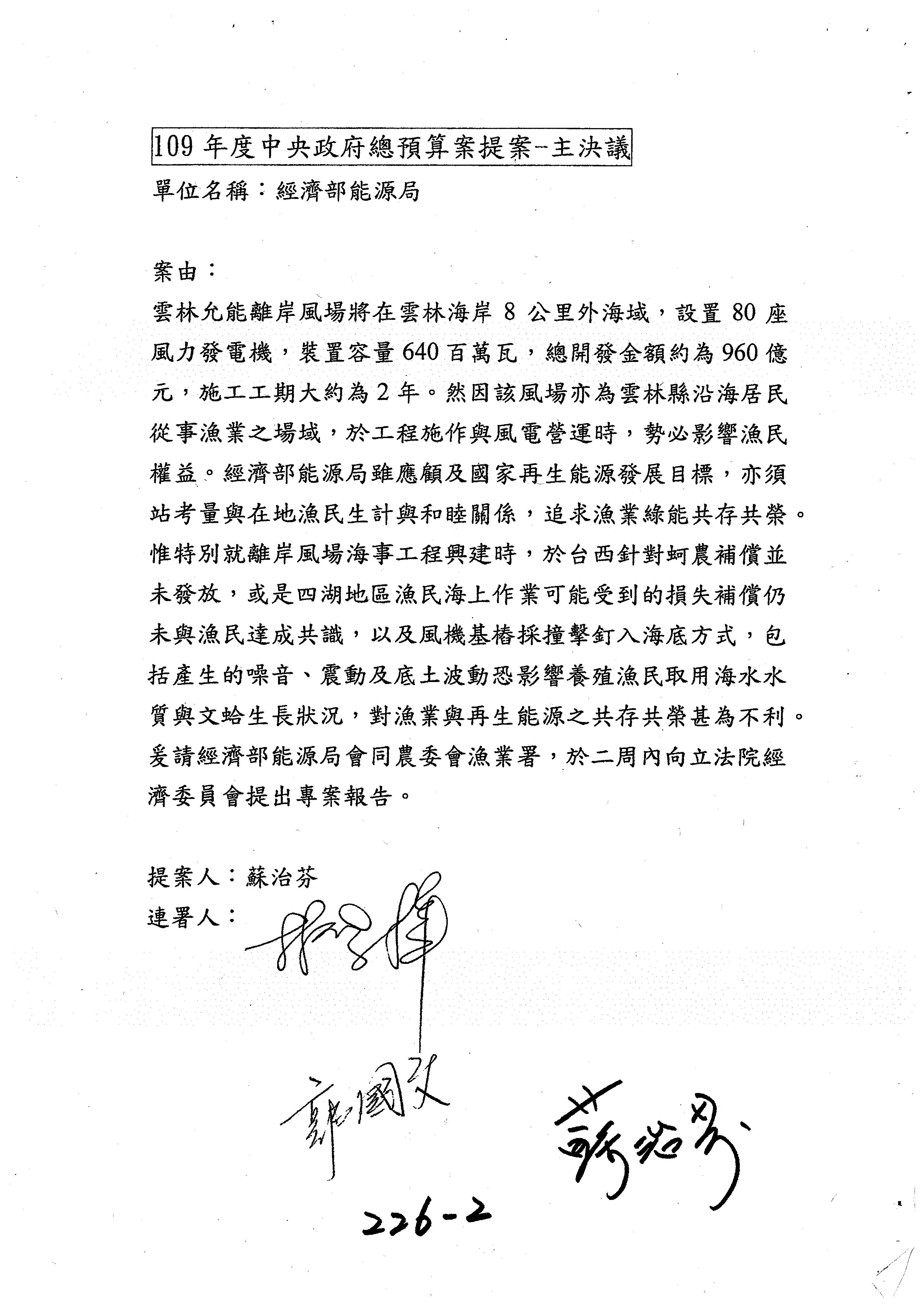 提案人:蘇震清 陳亭妃 邱議瑩 莊瑞雄 徐永明 周陳秀霞 賴瑞隆 陳超明 廖國棟 孔文吉 邱志偉 連署人:郭國文