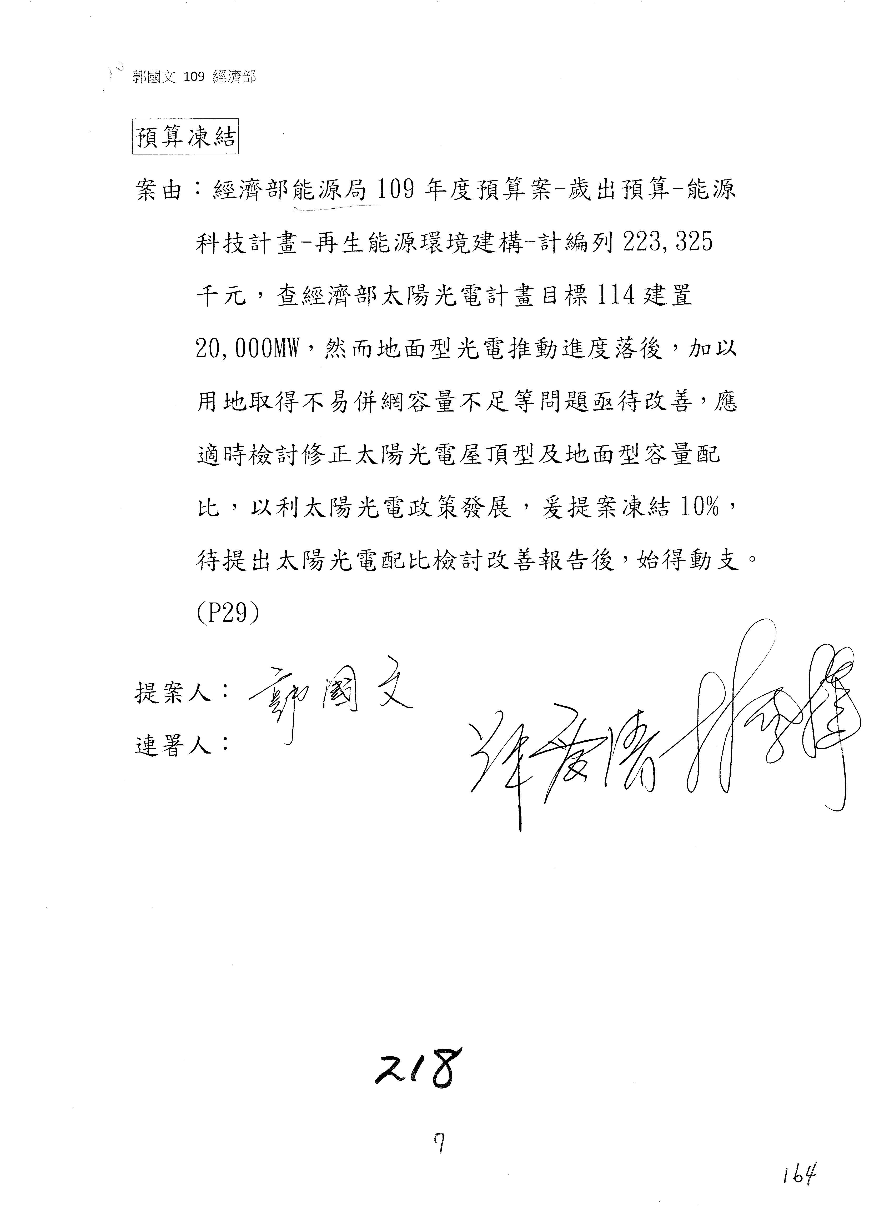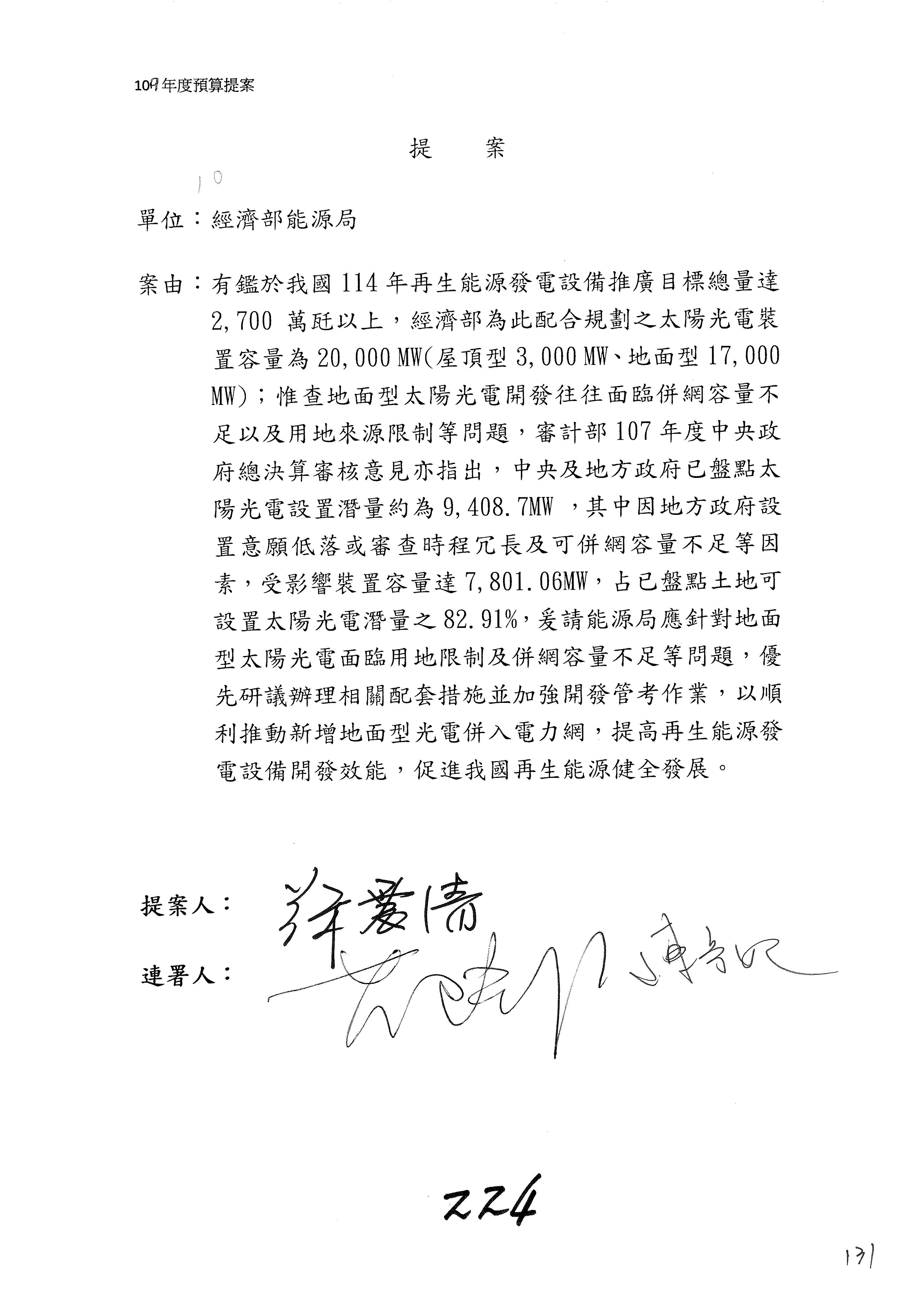 然後是剛剛郭委員提到的屋頂型跟地面型的部分,我們確實也務實的去檢討,過去設定的目標是屋頂3GW、地面17GW,我們今年大概就可以達到屋頂3GW的目標,所以我們會務實的檢討,屋頂的部分我們會提高,現在的目標是加倍提高到6GW,地面的部分則降到14GW,在總量不變的情況下,我們做了一個務實的檢討來做這樣的處理。能源局這邊還是很努力,召委是不是讓我們的預算部分可以去執行,剛剛召委所提的部分,我們主管機關一定會去落實要求。