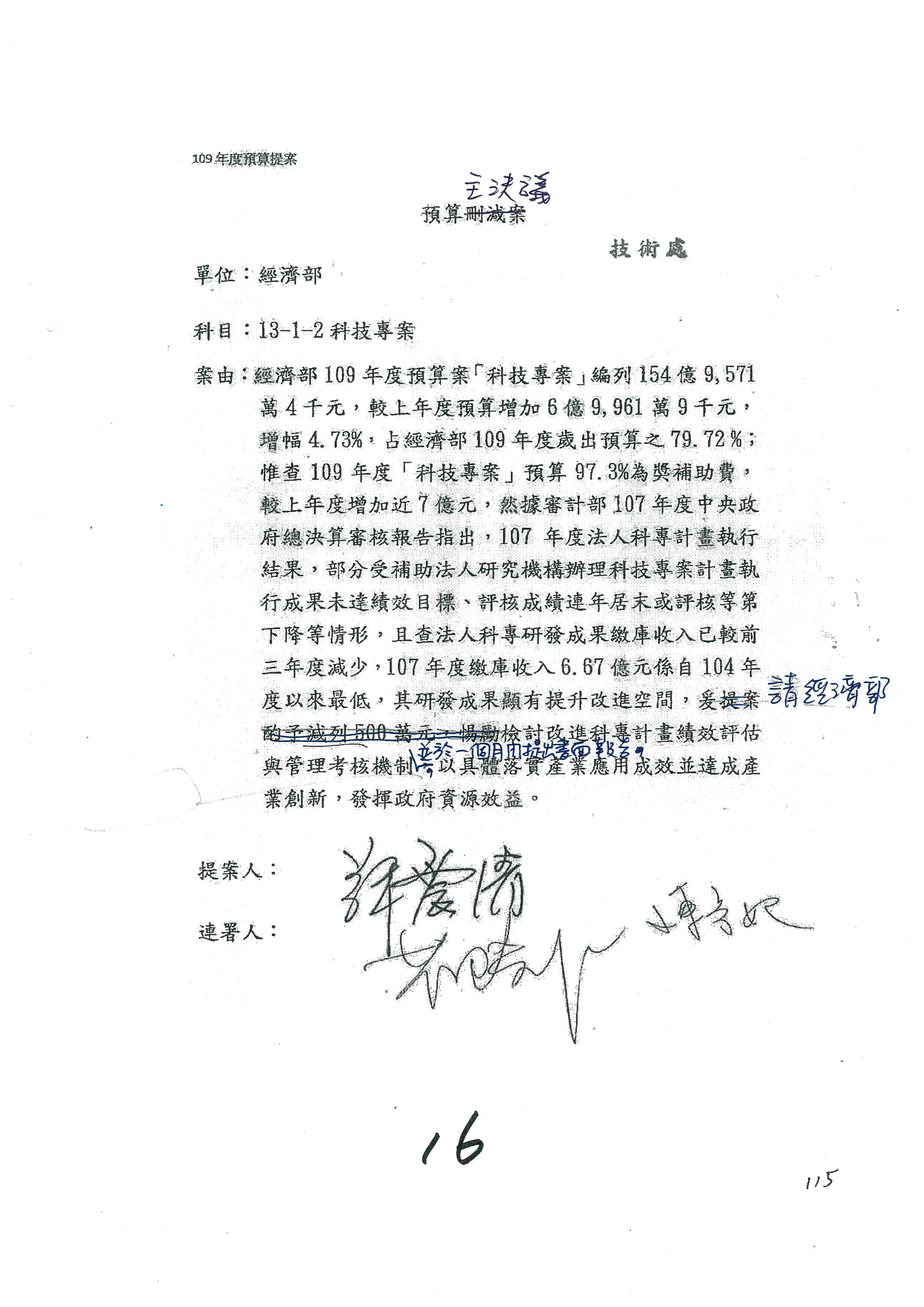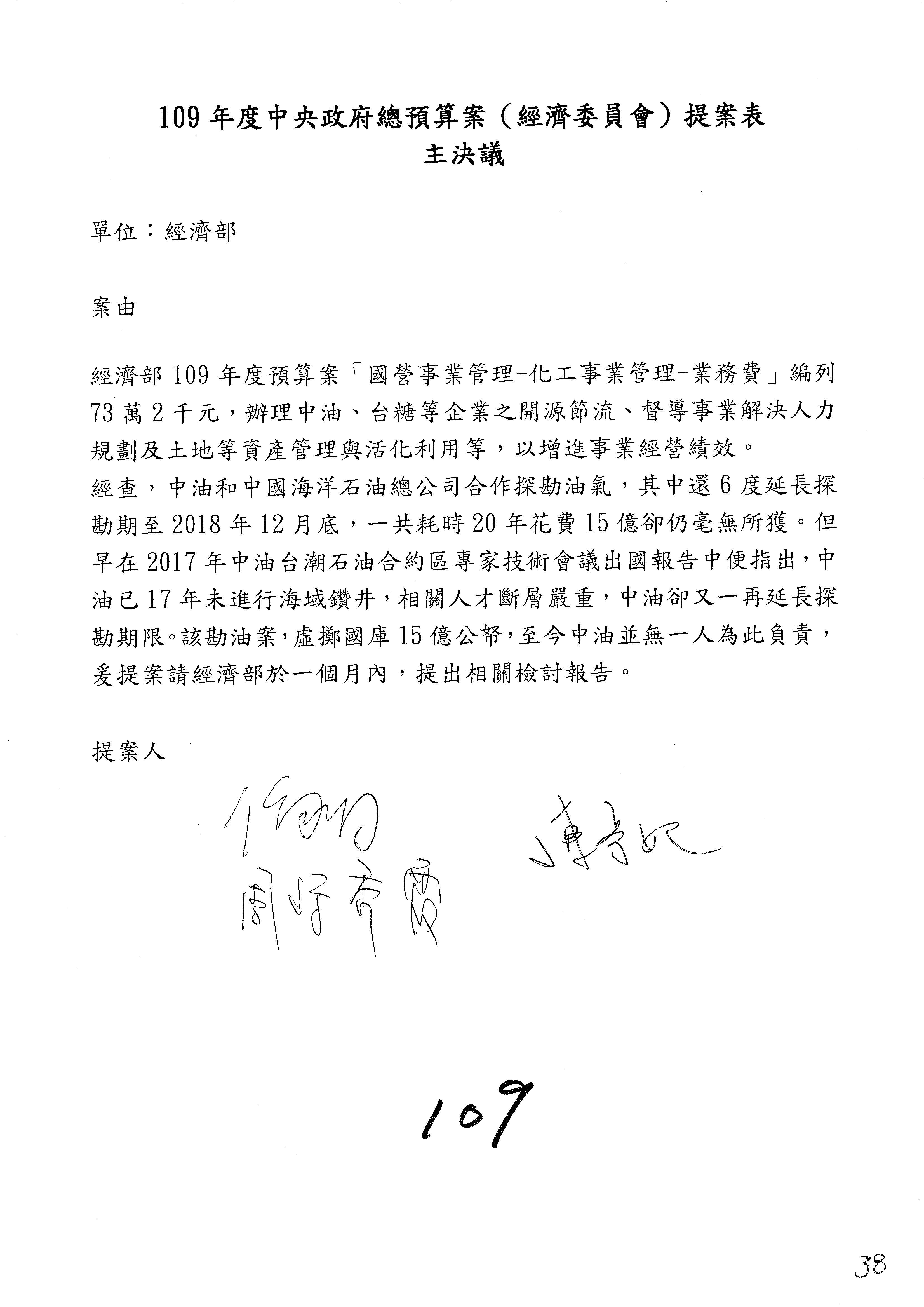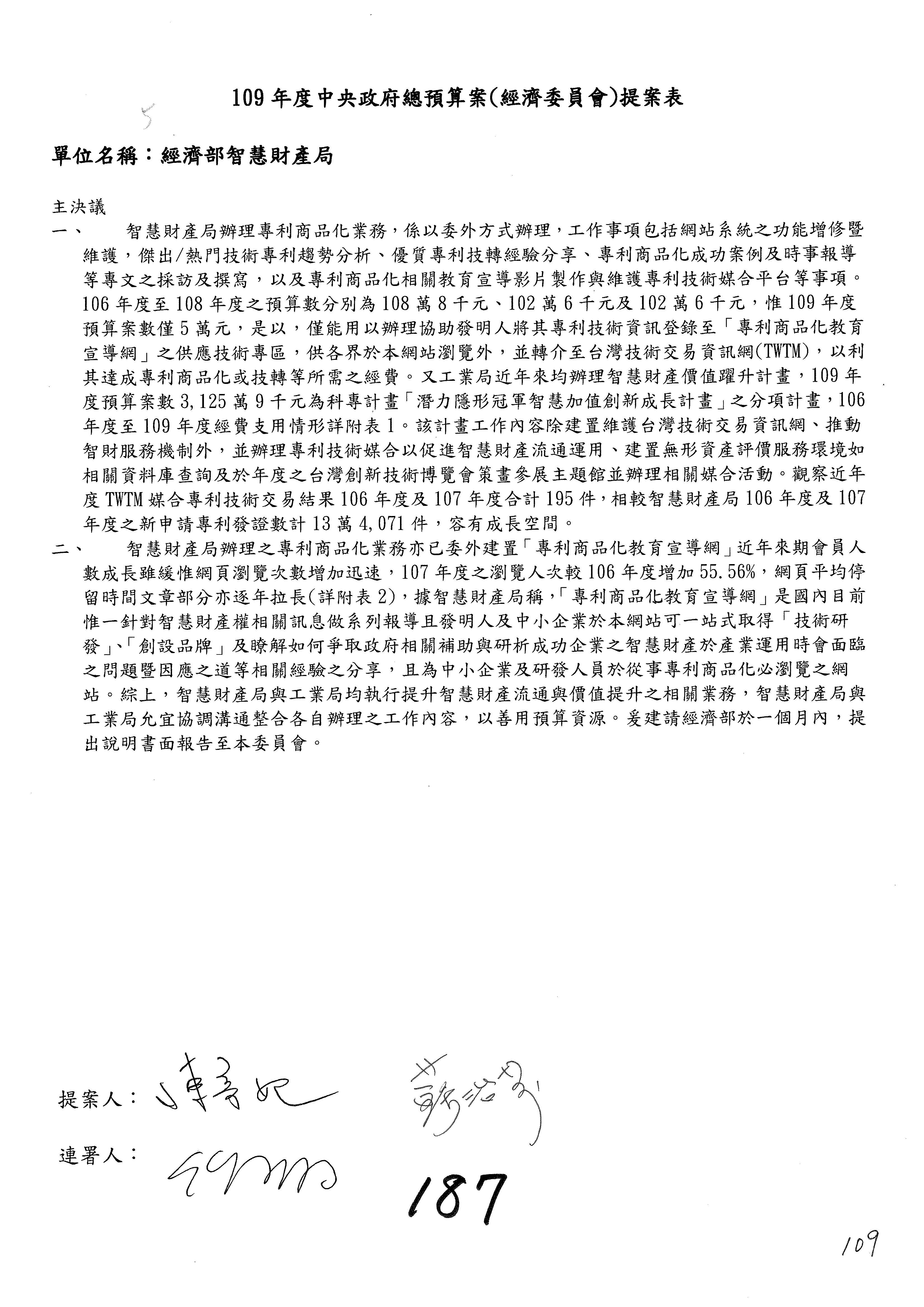 主席:各位同仁,有委員提案的部分照剛才宣讀的協商結論通過,沒有提案的部分均照列,請問有無異議?(無)無異議,通過。本次會議通過之決議,文字授權主席及議事人員整理,經濟部及所屬109年度單位預算審查完竣。散會。