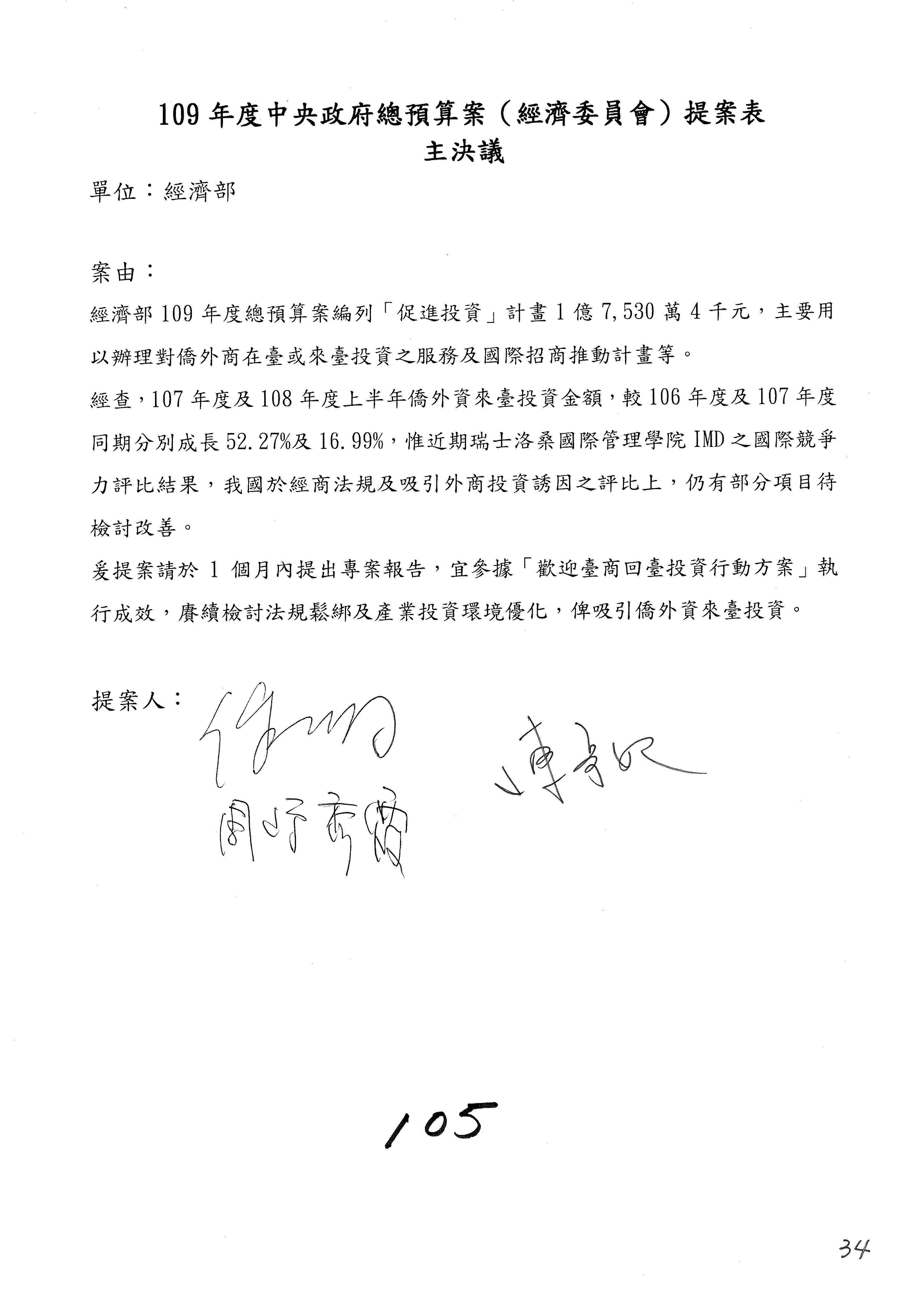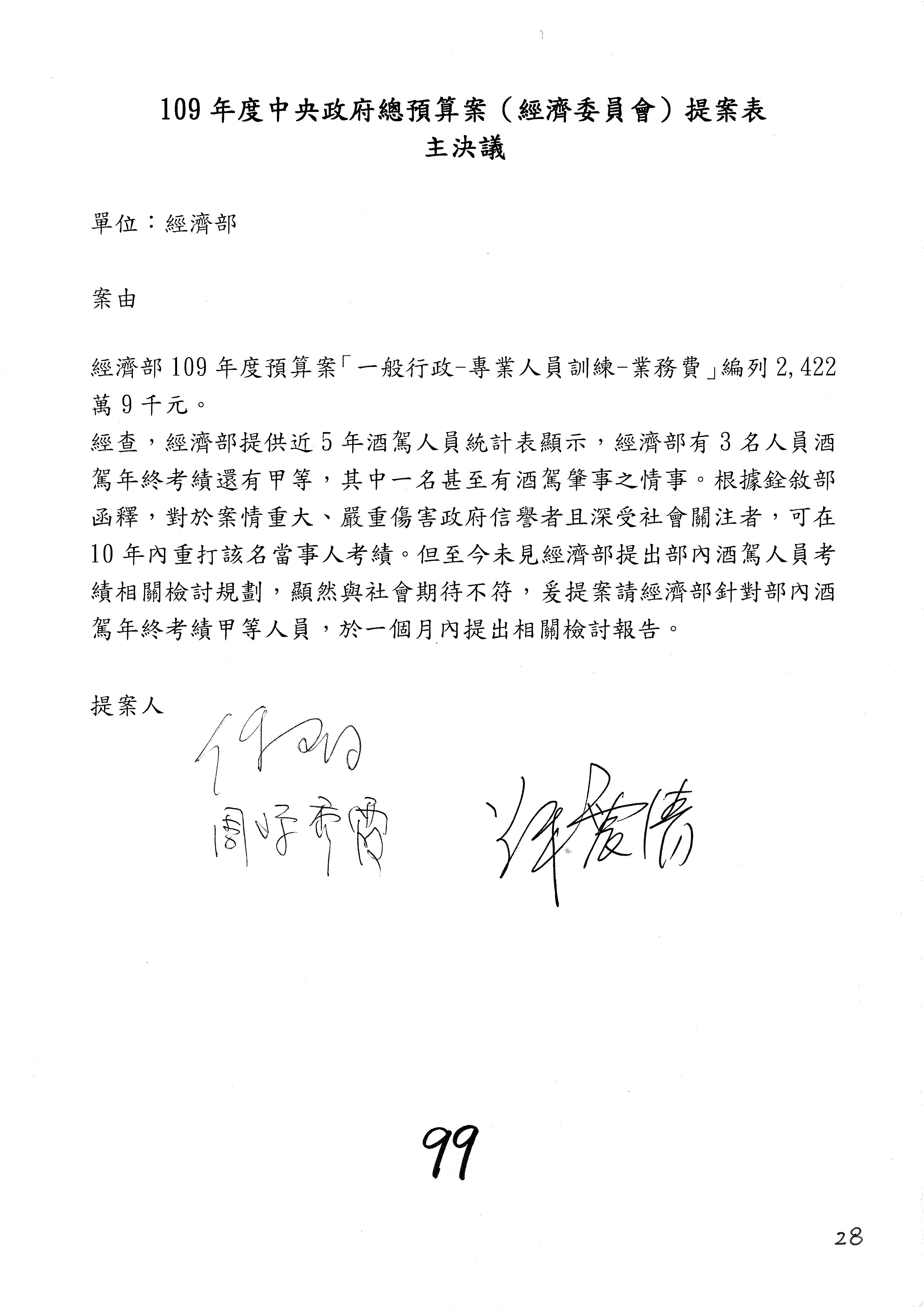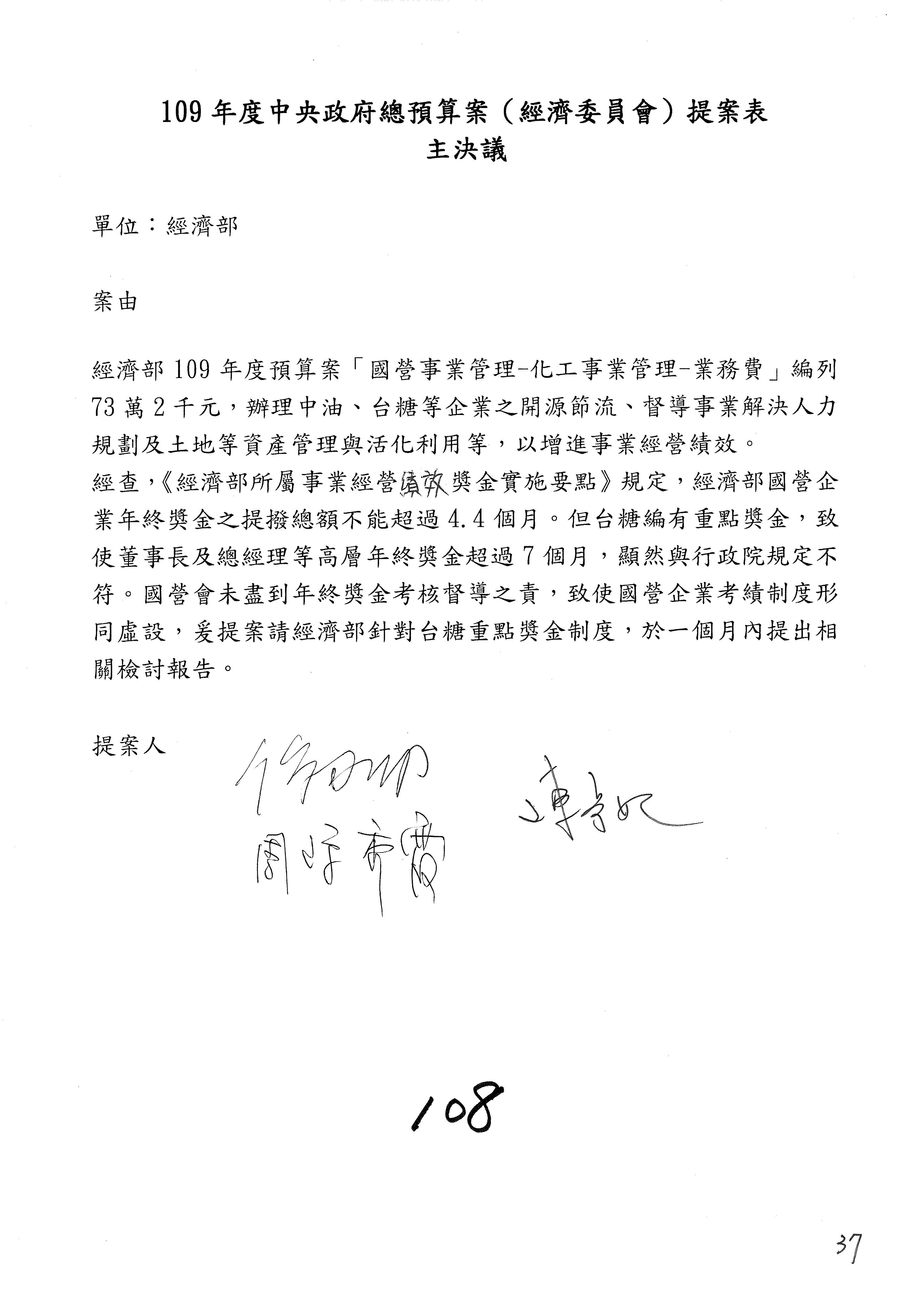 主席:各位同仁,有委員提案的部分照剛才宣讀的協商結論通過,沒有提案的部分均照列,請問有無異議?(無)無異議,通過。本次會議通過之決議,文字授權主席及議事人員整理,經濟部及所屬109年度單位預算審查完竣。散會。