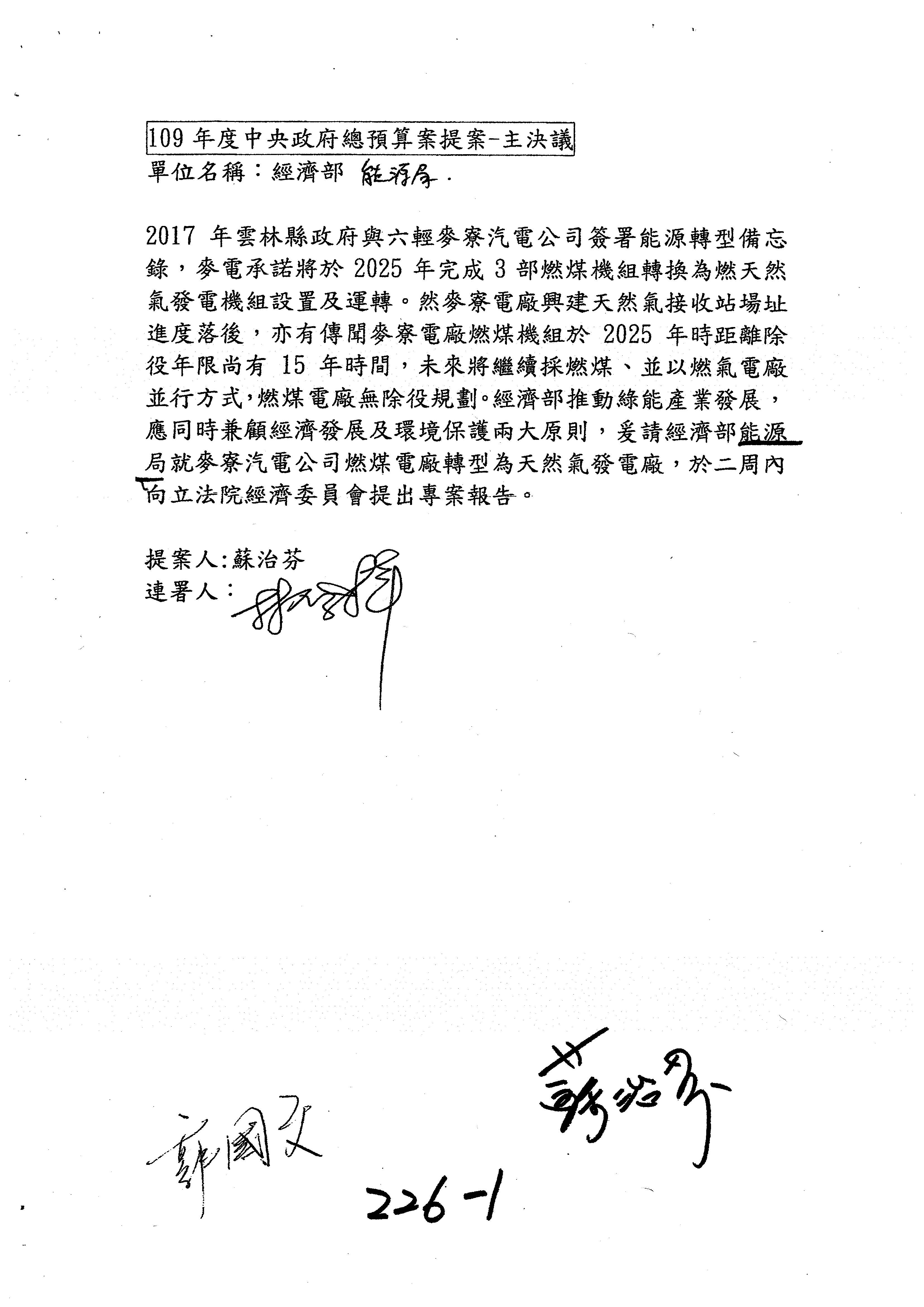 游局長振偉:這一案跟委員有說明了,因為他寫的是麥寮汽電公司,實際上是麥寮電廠,所以名稱改麥寮電廠,至於專案報告的部分,委員同意改成書面報告。