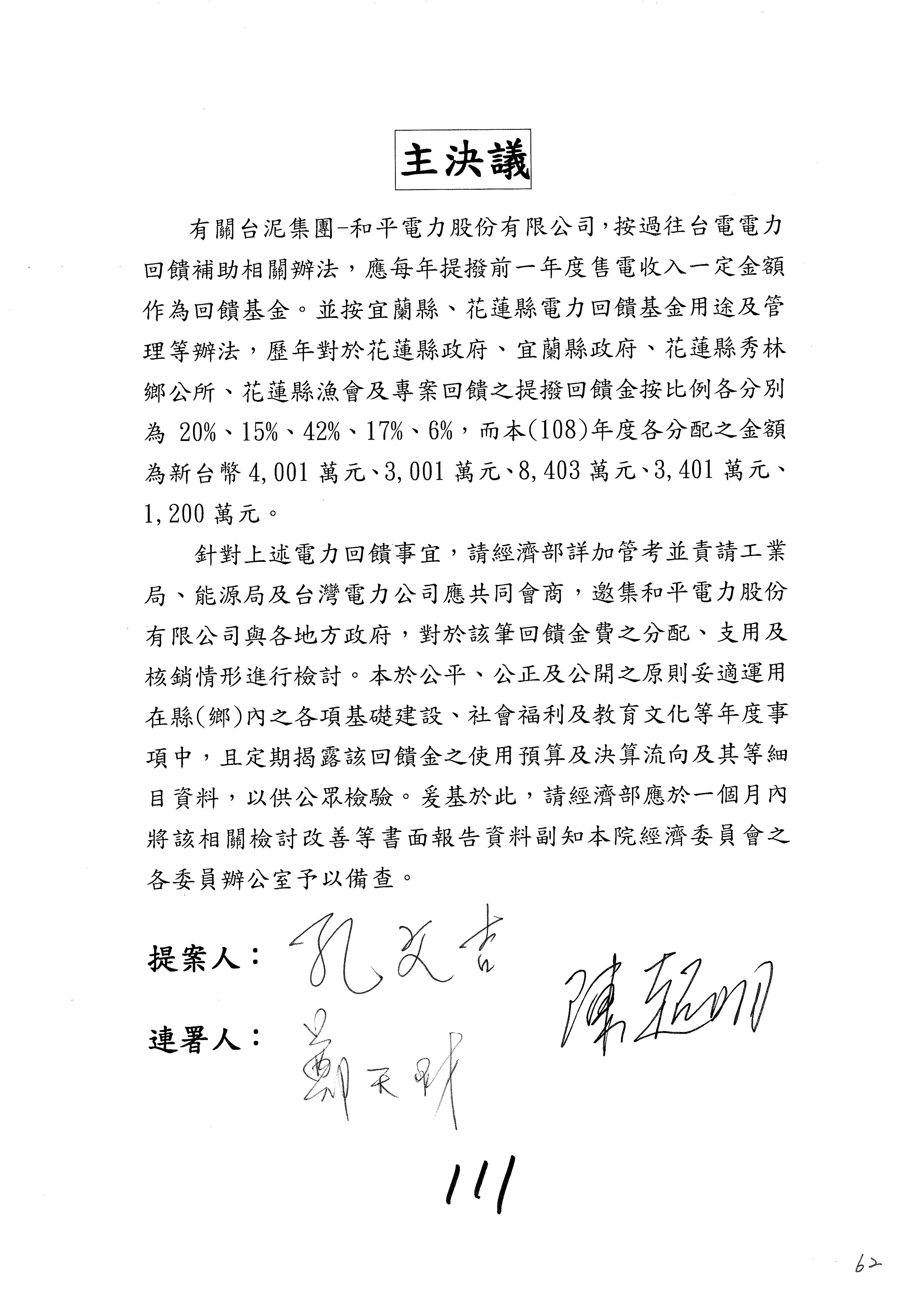 主席:我跟你講,不能這樣子啦!其實再生能源討論的地方很多,一路下來我想你們人是比較多,但是我也要拜託一樣,確實在溝通方面有問題,林次長,你們的第一個離岸風力,結果上緯賣給國外的公司,我們當初所協議的問題幾乎都不實現,所以我很堅持主張,你們不要一味的支持,那些外國人很會騙別人啊!我跟你講,你不要笨笨地被騙,你們為了綠能的增設,裡面產生了很多問題,所以我堅持主張凍結10%,我能妥協的就是可以改為書面報告。