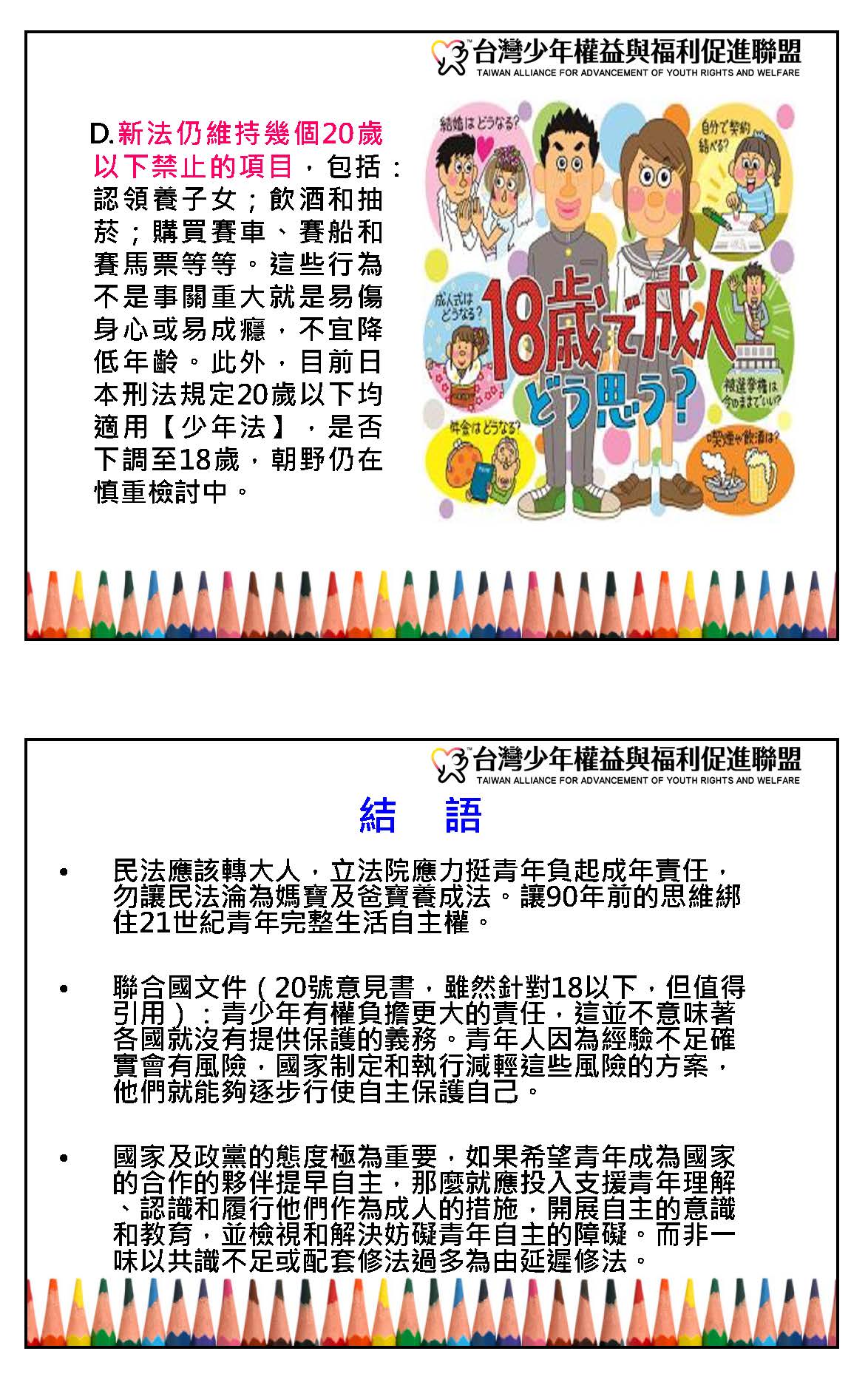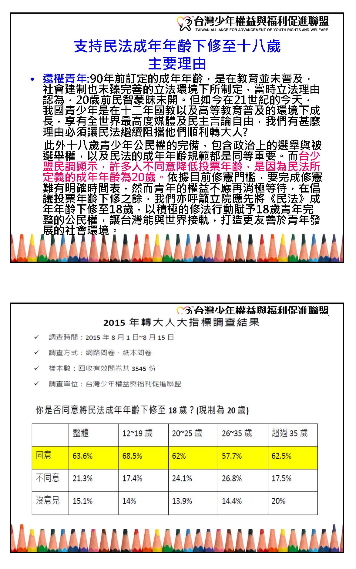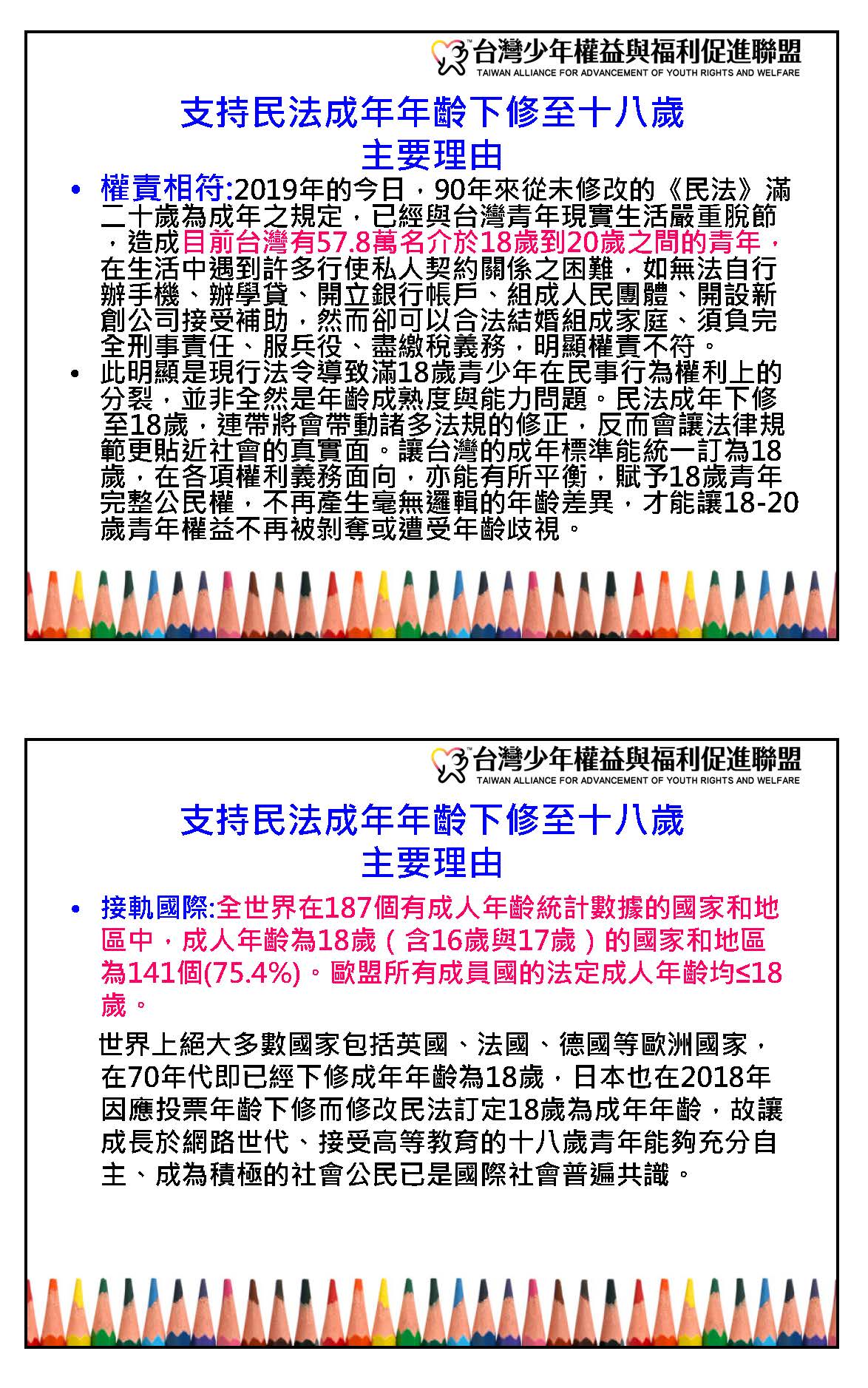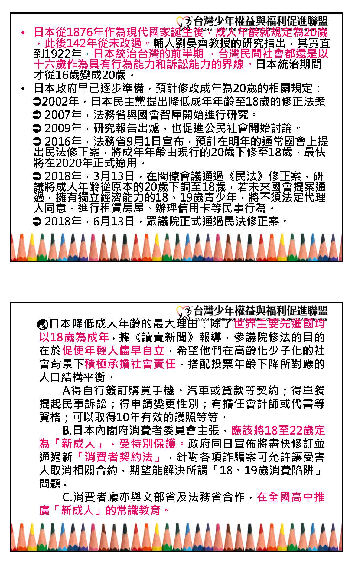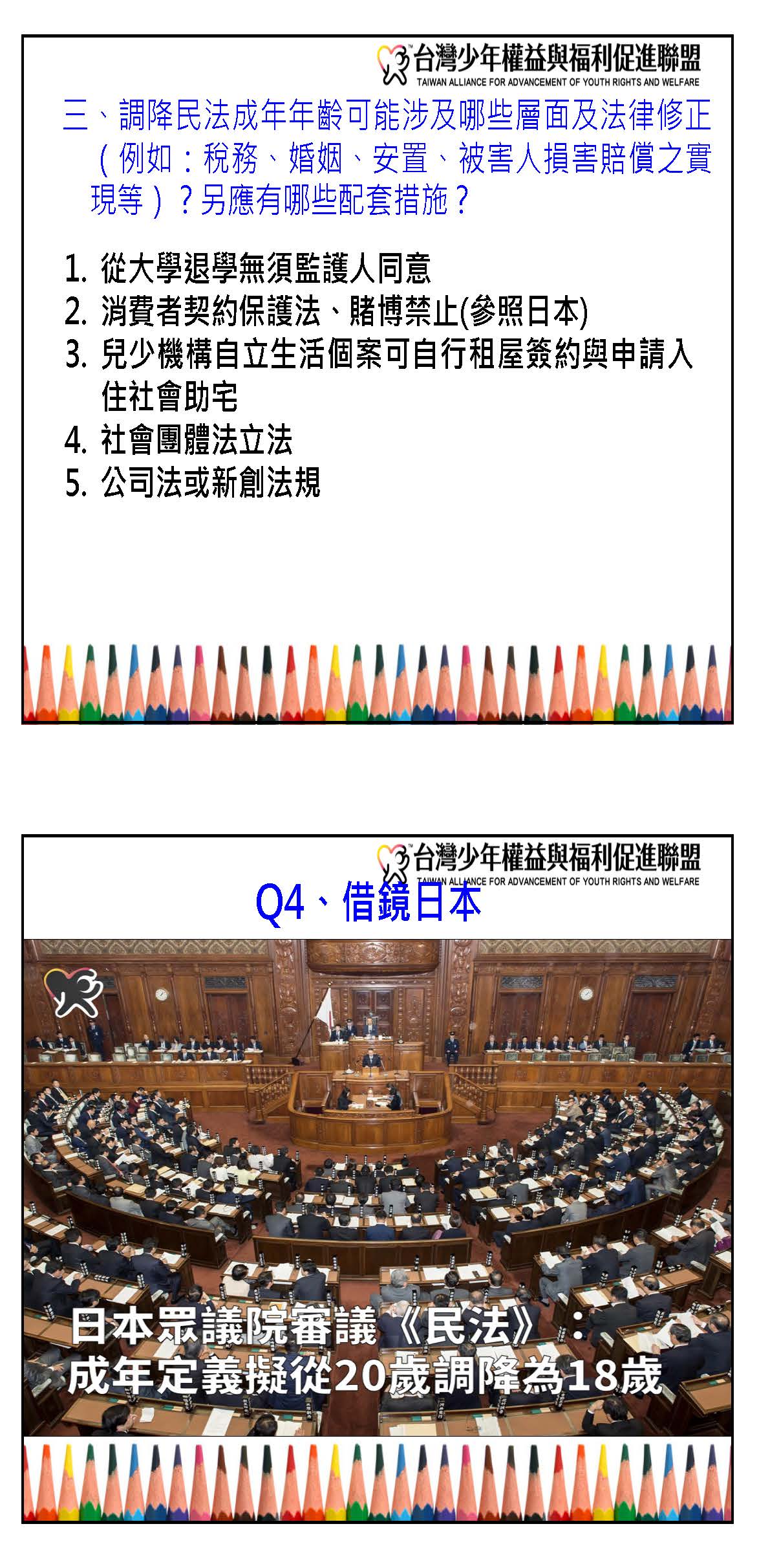 看到臺灣有這麼多因20歲和18歲不同成年年齡門檻而導致法體系不統一及青年不便的情況,我們還要談到,我們繼受成年門檻於日本,如今他們不僅僅在更早之前就已經下修投票年齡的規定,去年他們也把民法的成年門檻下修到18歲。我們知道,在所有公民權利中,不管是選舉、罷免、創制、複決或應考試、服公職,作為民間團體和年輕人,走過這樣一個階段,我們都希望能夠有機會把所有成年年齡門檻都下降到18歲,但是衡諸憲法增修條文的修憲規定,我們知道從根本大法的憲法先調降投票權年齡有困難,所以2018年立法院開始用修法程序從公民投票法修正,下一步同樣也可以用修法程序,相對簡便、便捷的就是從民法著手,但是我知道很多專家學者會認為,因為修正體系龐雜,所以應該從長計議。