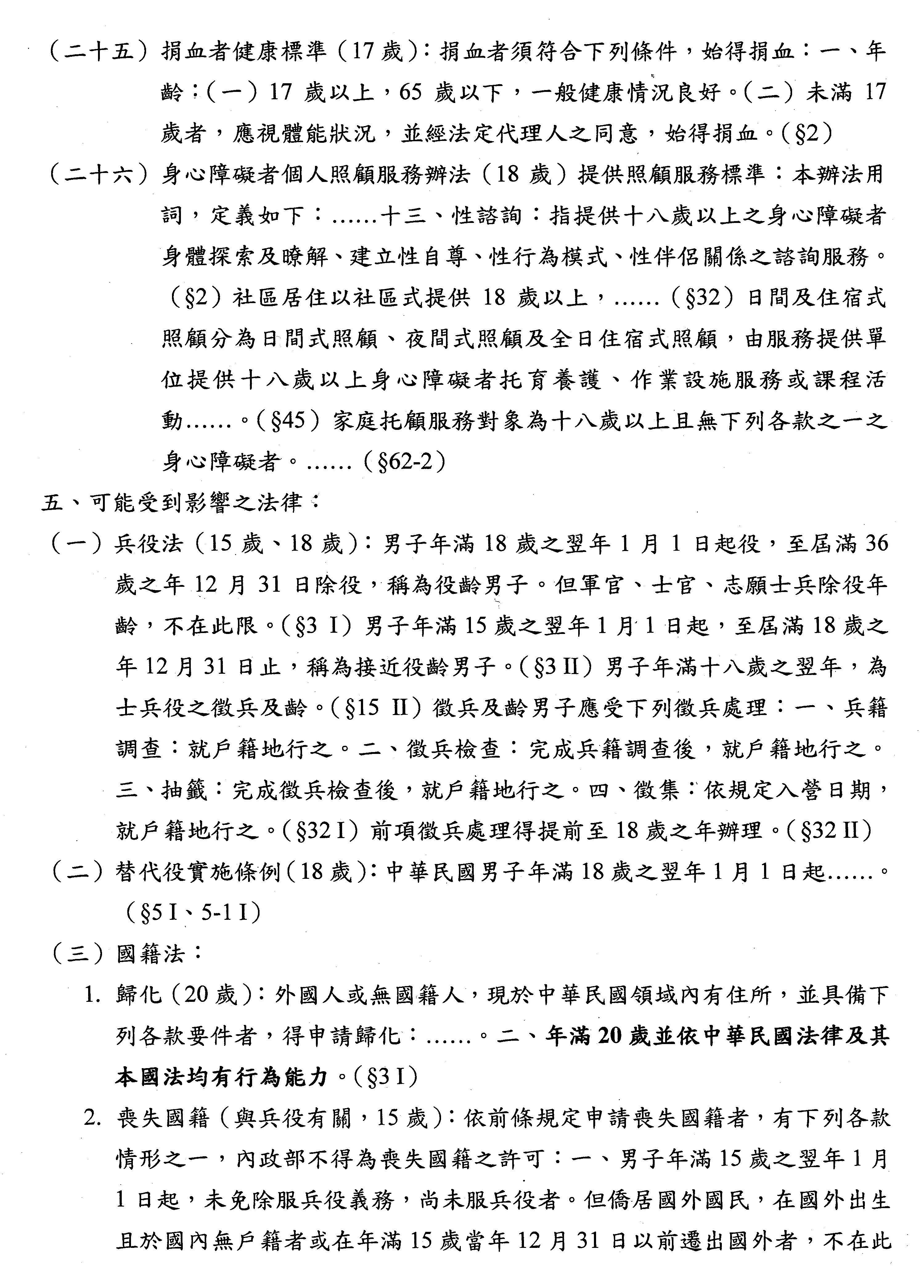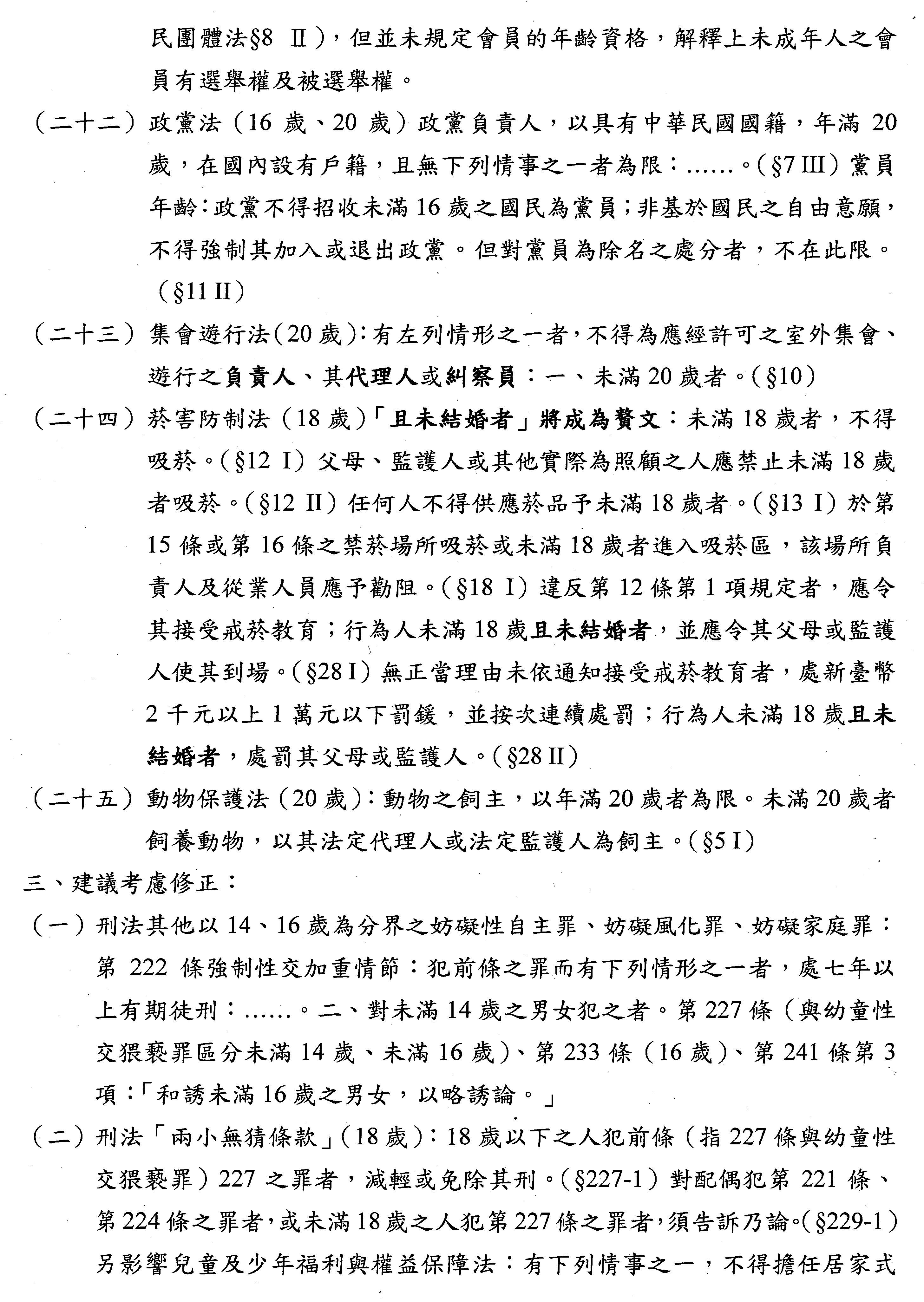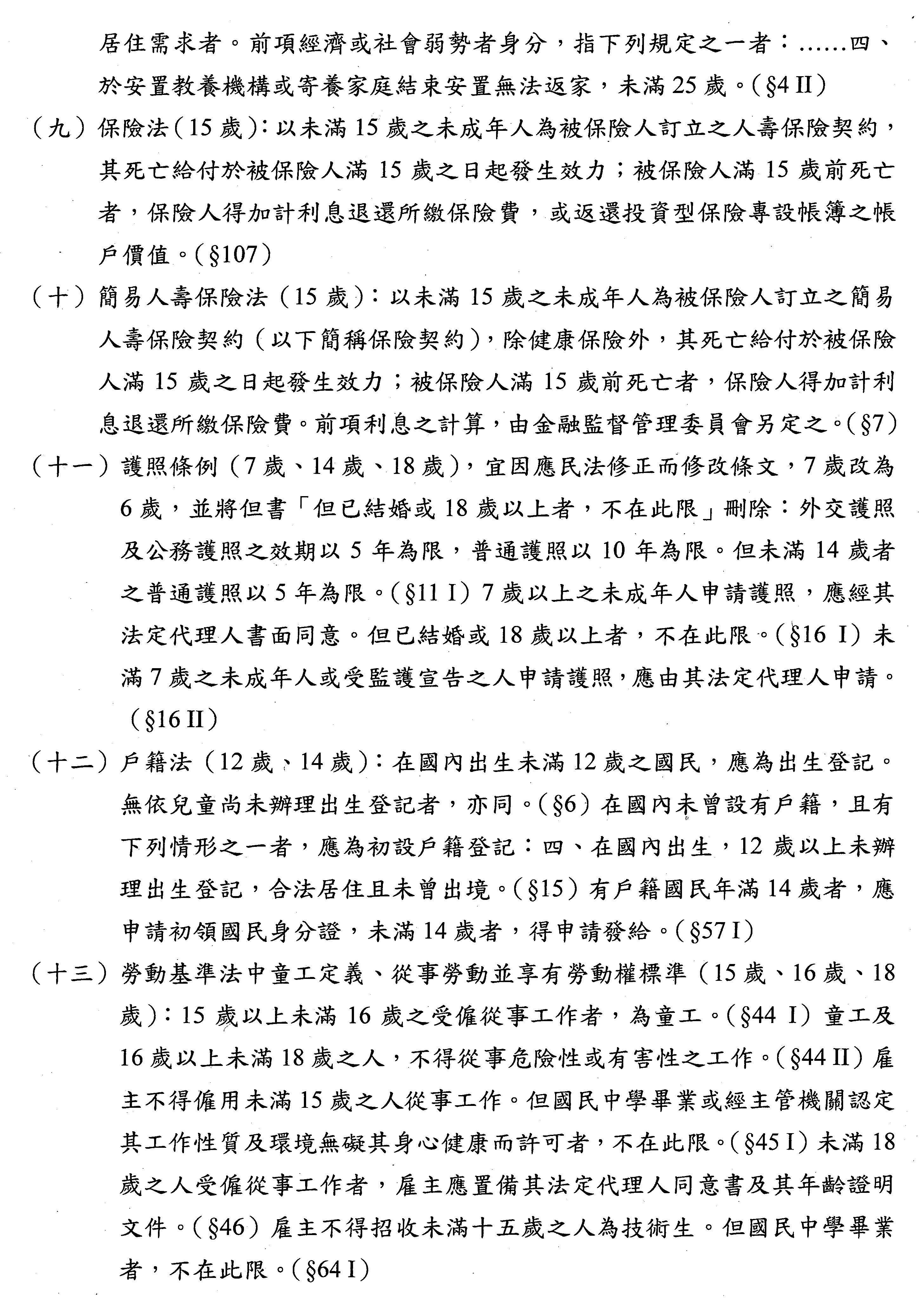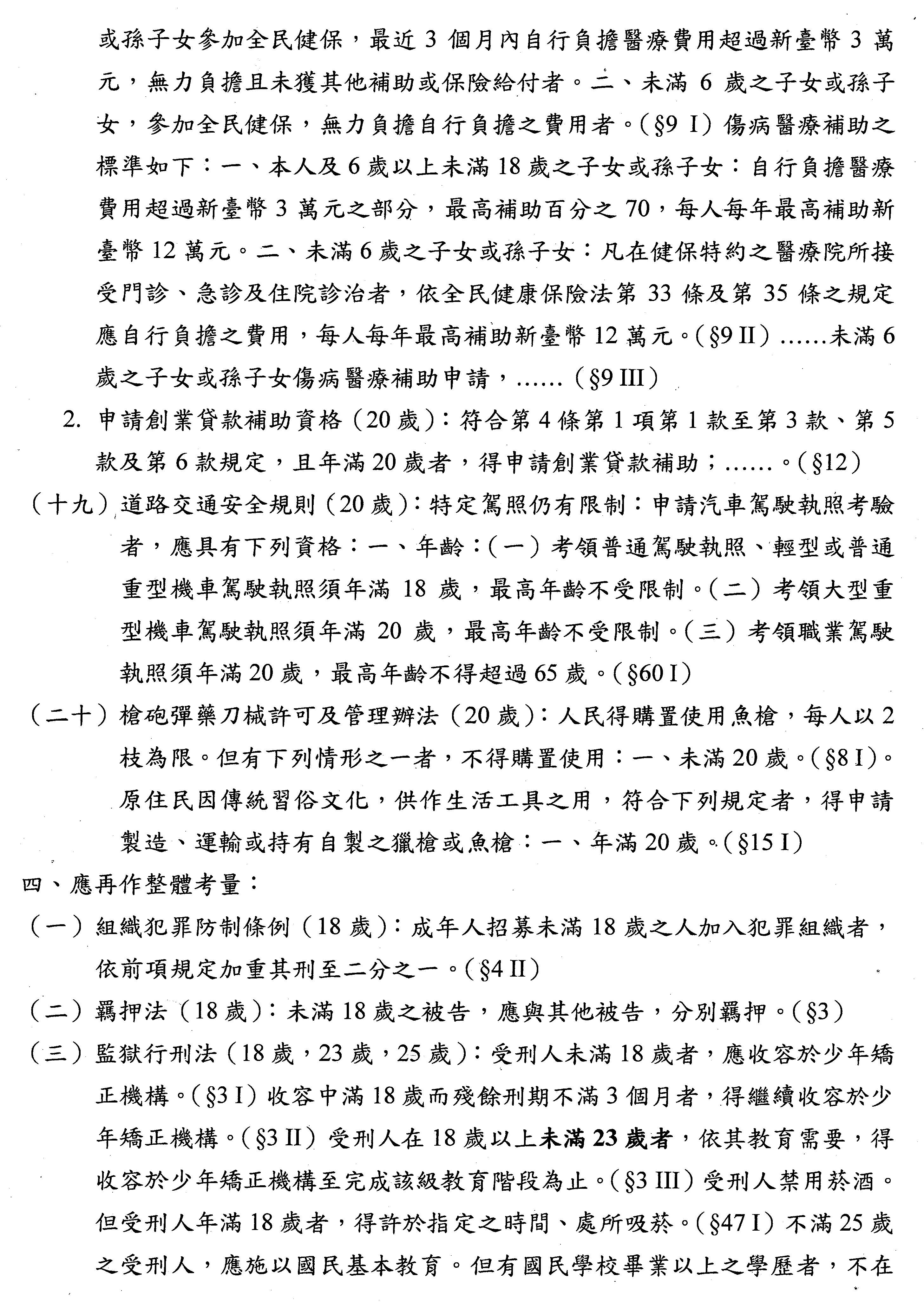 另外,關於這個部分的處理,我們的建議是,因為年齡在法律上的要件規範可能應該還要包括從公民權(比方說憲法上的投票權)、公法上的權利(比如說人民跟政府之間的請求權),還有民事法律關係中對於年齡部分的考量,我們認為這個部分應該要有所區隔並建議不要把它混為一談。