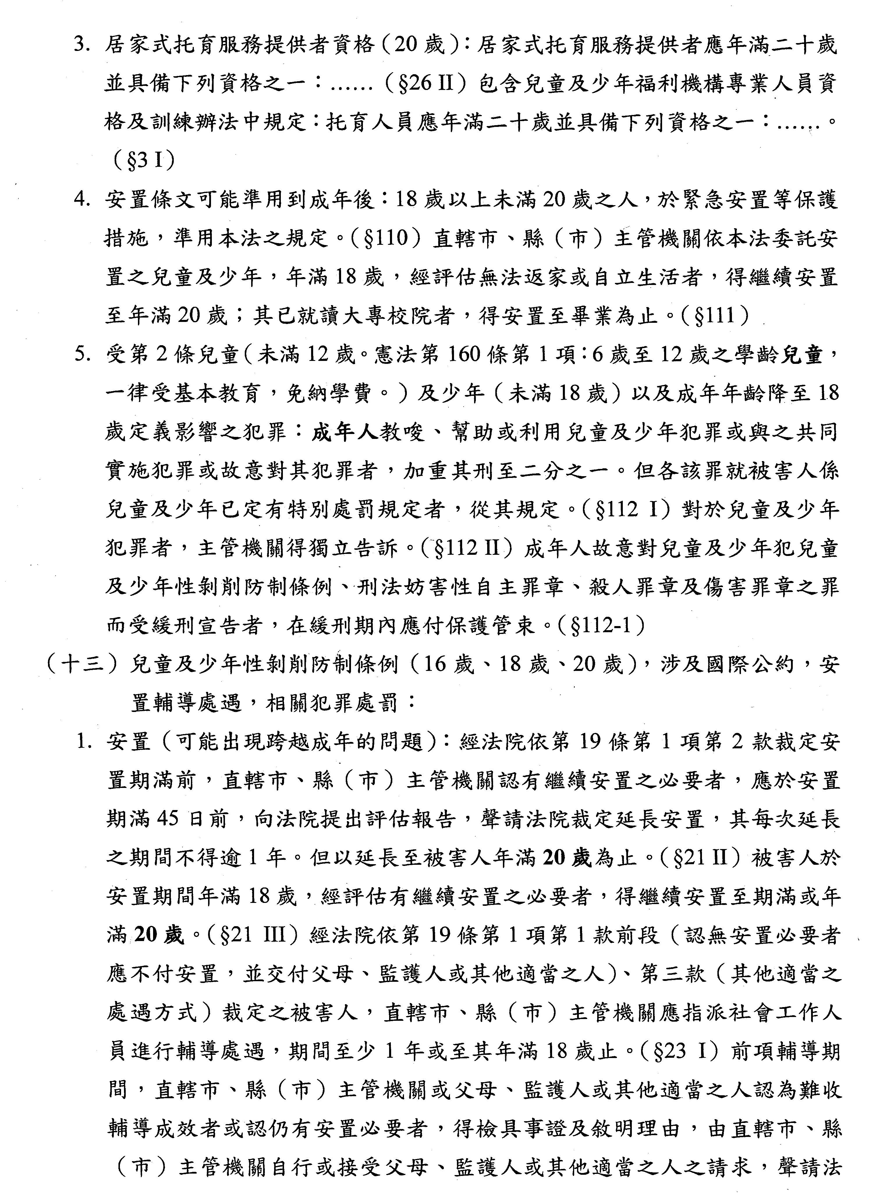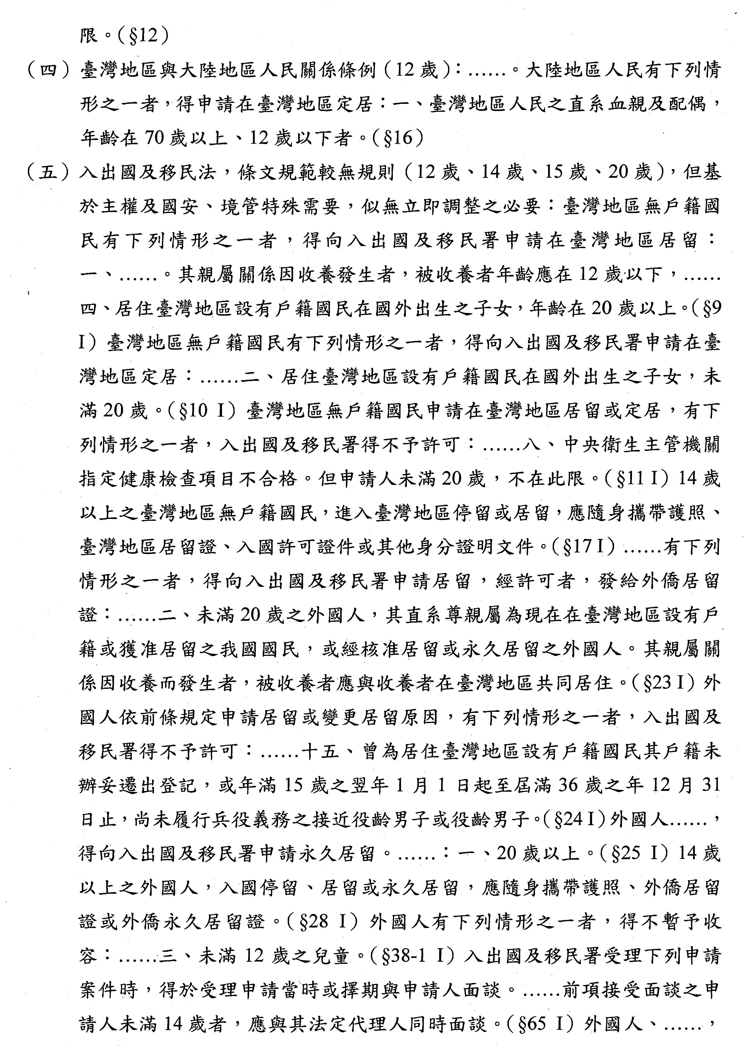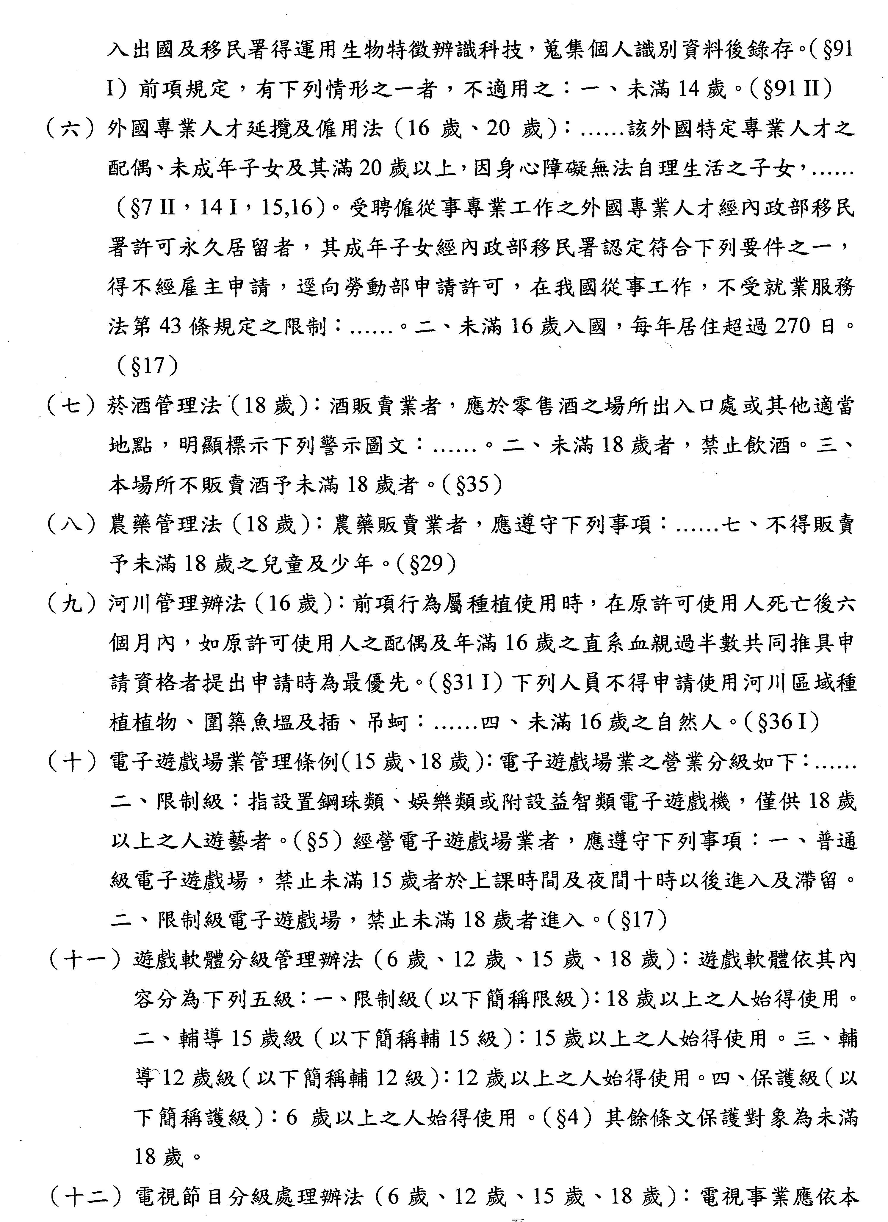 另外,關於這個部分的處理,我們的建議是,因為年齡在法律上的要件規範可能應該還要包括從公民權(比方說憲法上的投票權)、公法上的權利(比如說人民跟政府之間的請求權),還有民事法律關係中對於年齡部分的考量,我們認為這個部分應該要有所區隔並建議不要把它混為一談。
