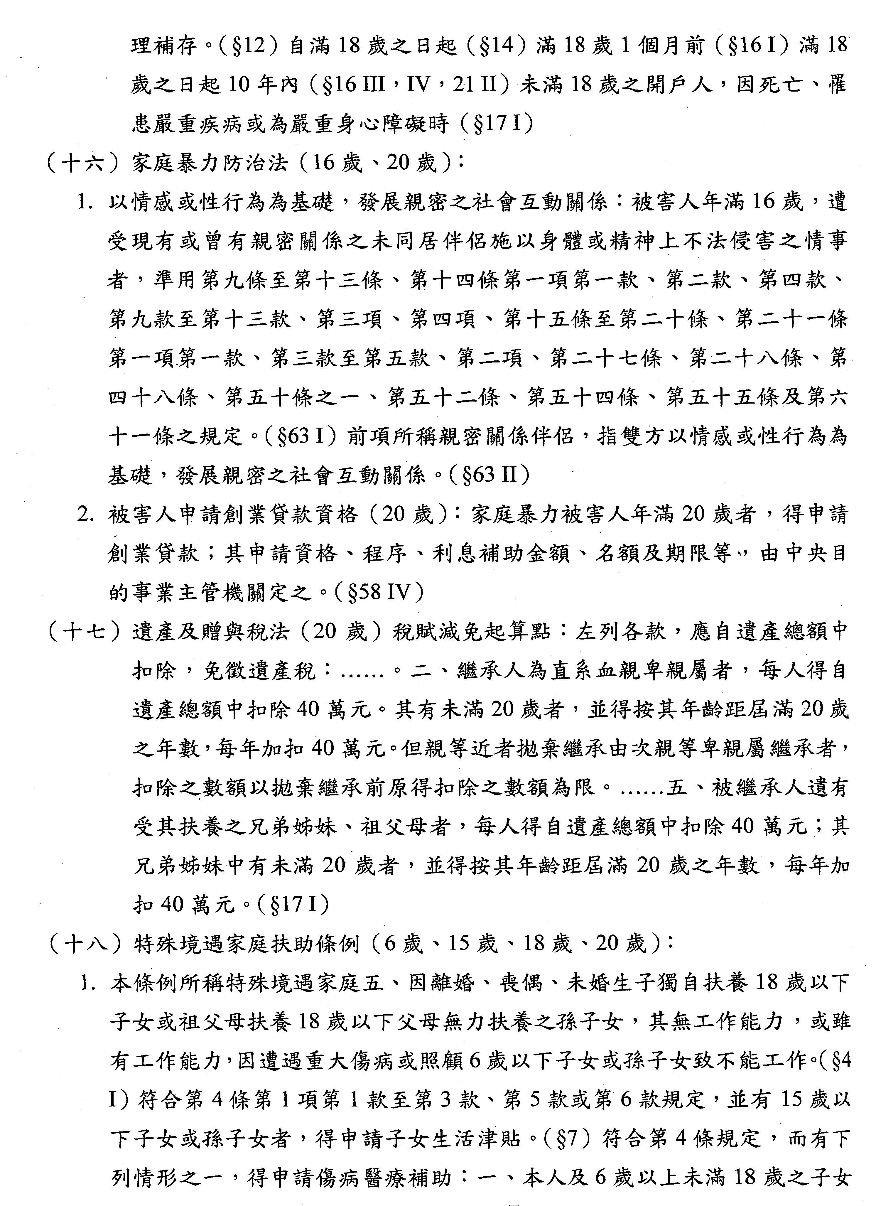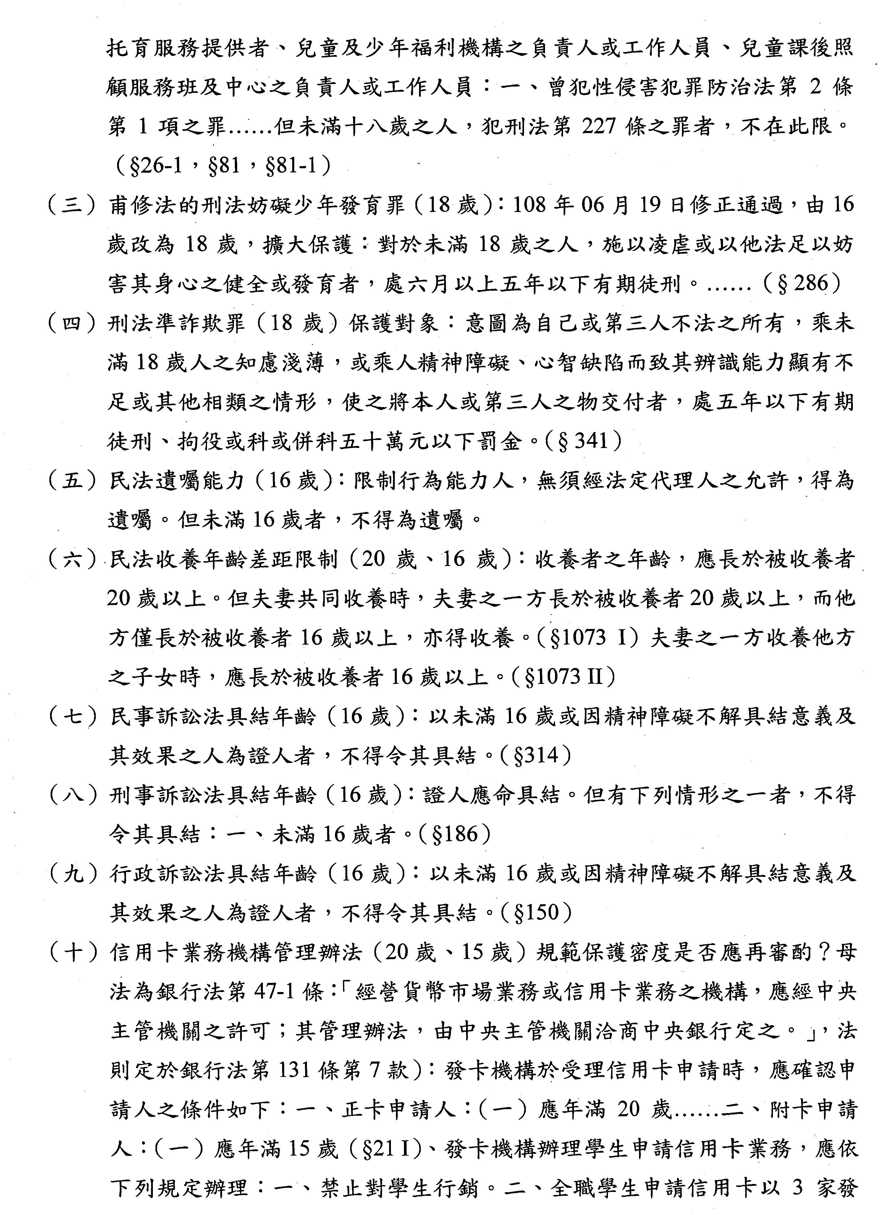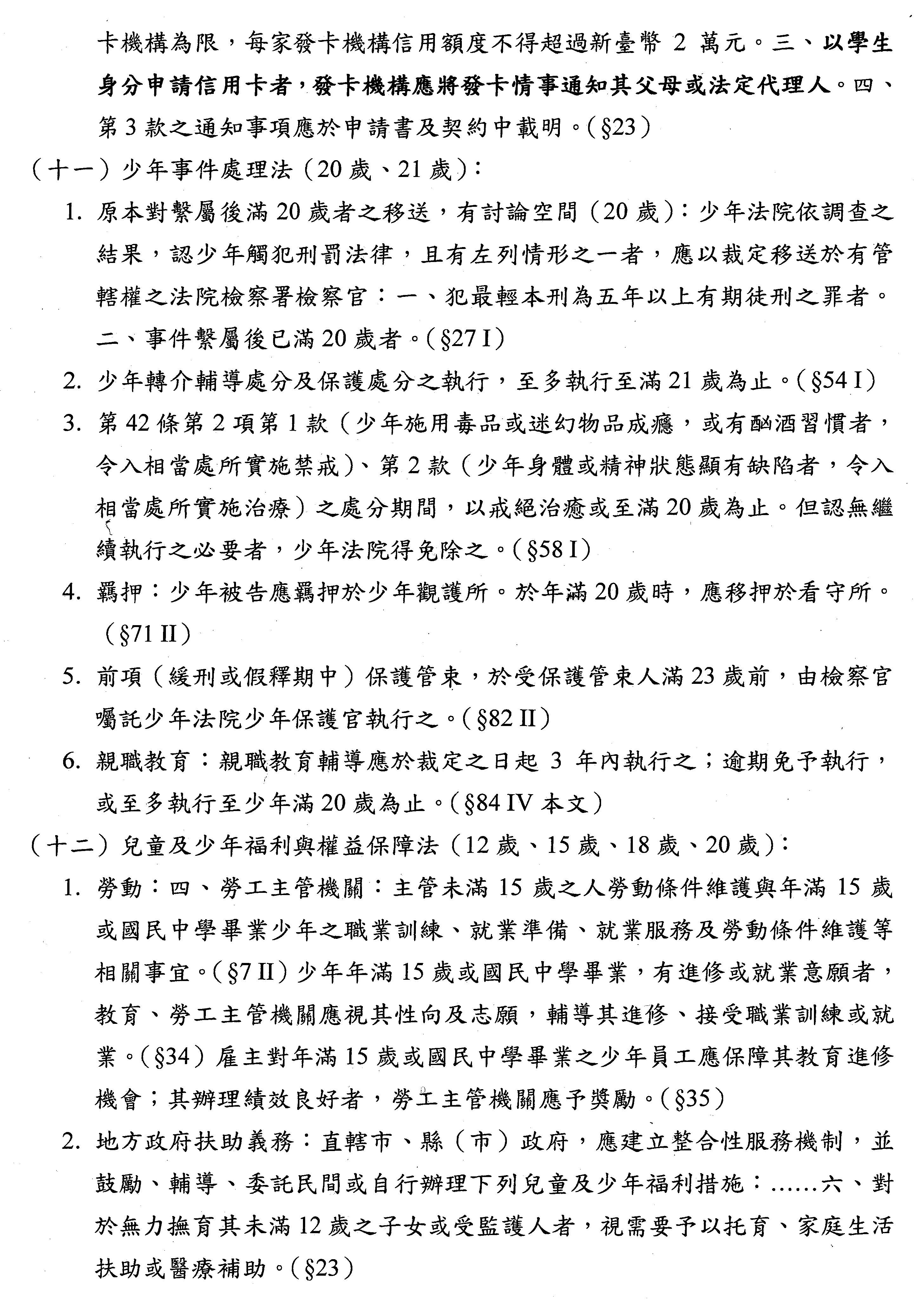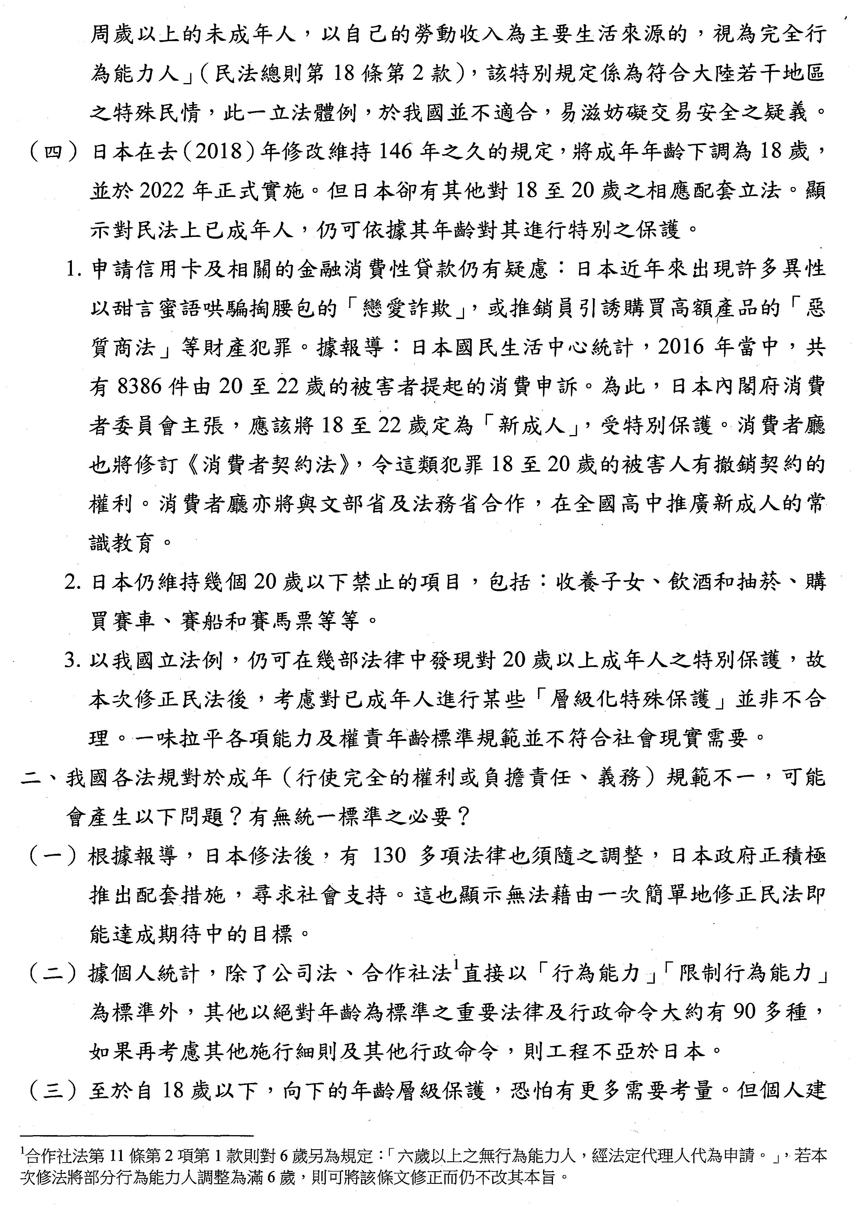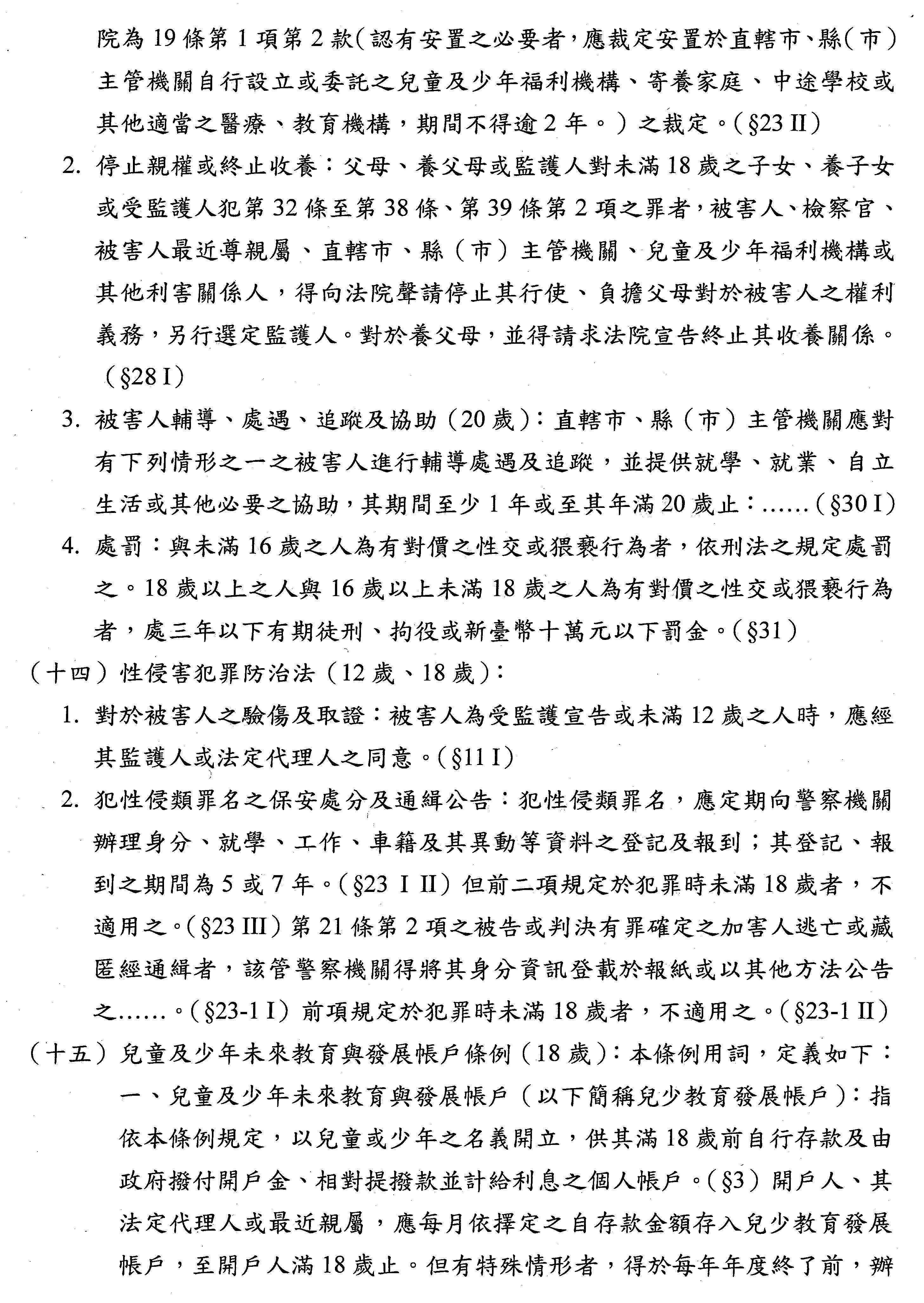 其實並不是只有日本這樣做,從臺灣很多立法例都可以發現我們對年輕人的保護不是只有到20歲就停止了,還會到更多、更遠的地方,稍後我會提出來。這幾天我忙著在蒐尋,法務部說蒐了200個,我大概蒐了三、五百個,我是從7歲一直往上查到25歲,好幾天都沒有睡得很好,所以變成24頁的報告,我不可能全部講完。查完以後,我發現我們法律對於某些成年人是有給予保護的,我在書面資料中也有提到,還特別把幾歲標出來。相反地,對於18歲以下的部分,我們應該考慮因應的修法對18歲以下會不會有些變化,就像有些委員認為其實應該改成年滿6歲就應該有部分行為能力了,基本上我也是贊成的。