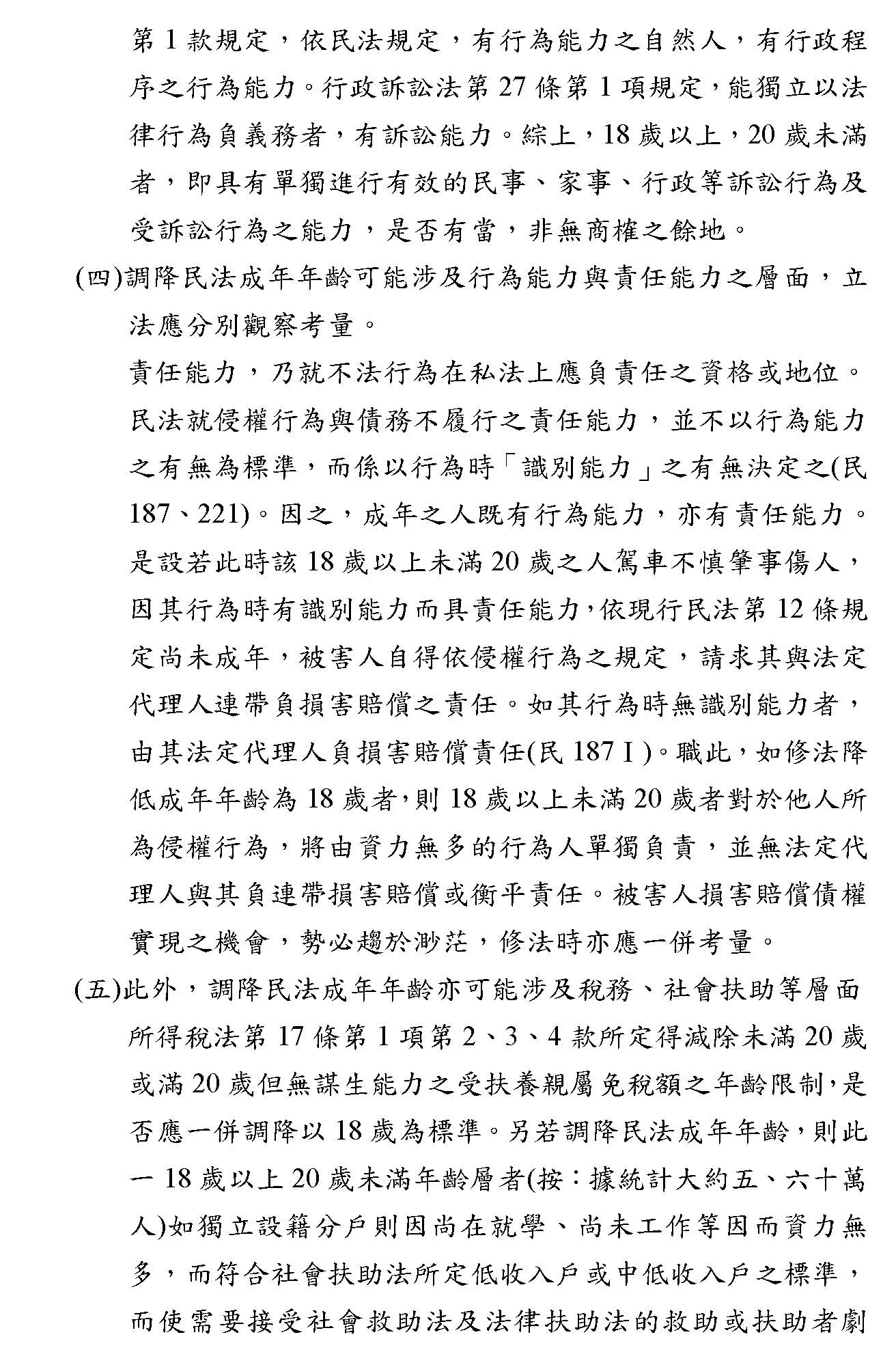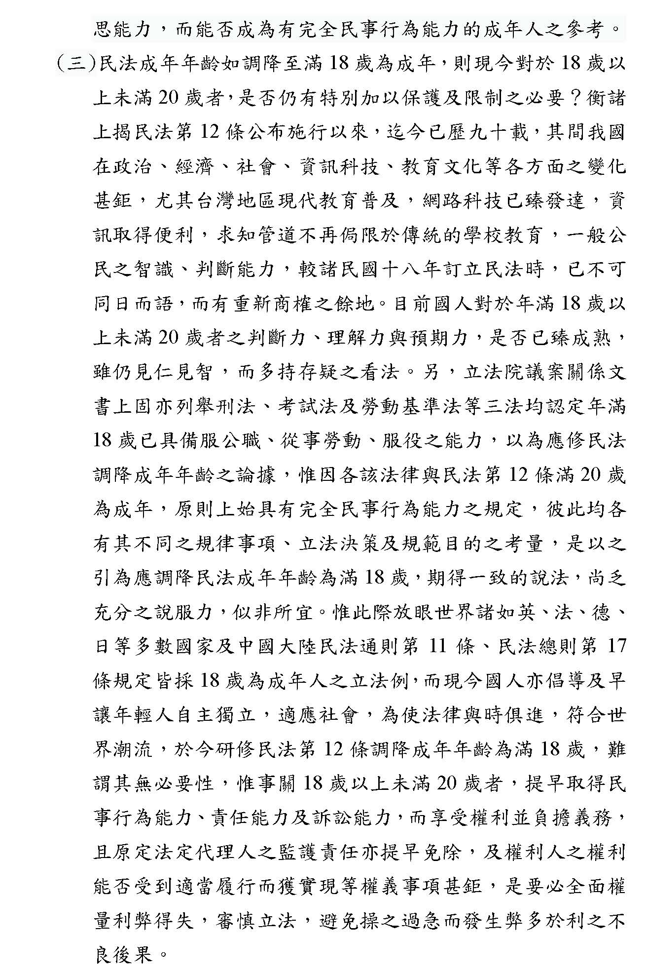 所以,對於是否要將成年年齡調降為18歲,這不是我本身的能力所及,但是我有我個人的價值判斷,而我現在不是在說我的價值判斷,我只是在回答一些法律問題,以及最後如果你更正了之後,是會有利益,但也會帶來不利益,我們對於這些不利益有考慮到嗎?