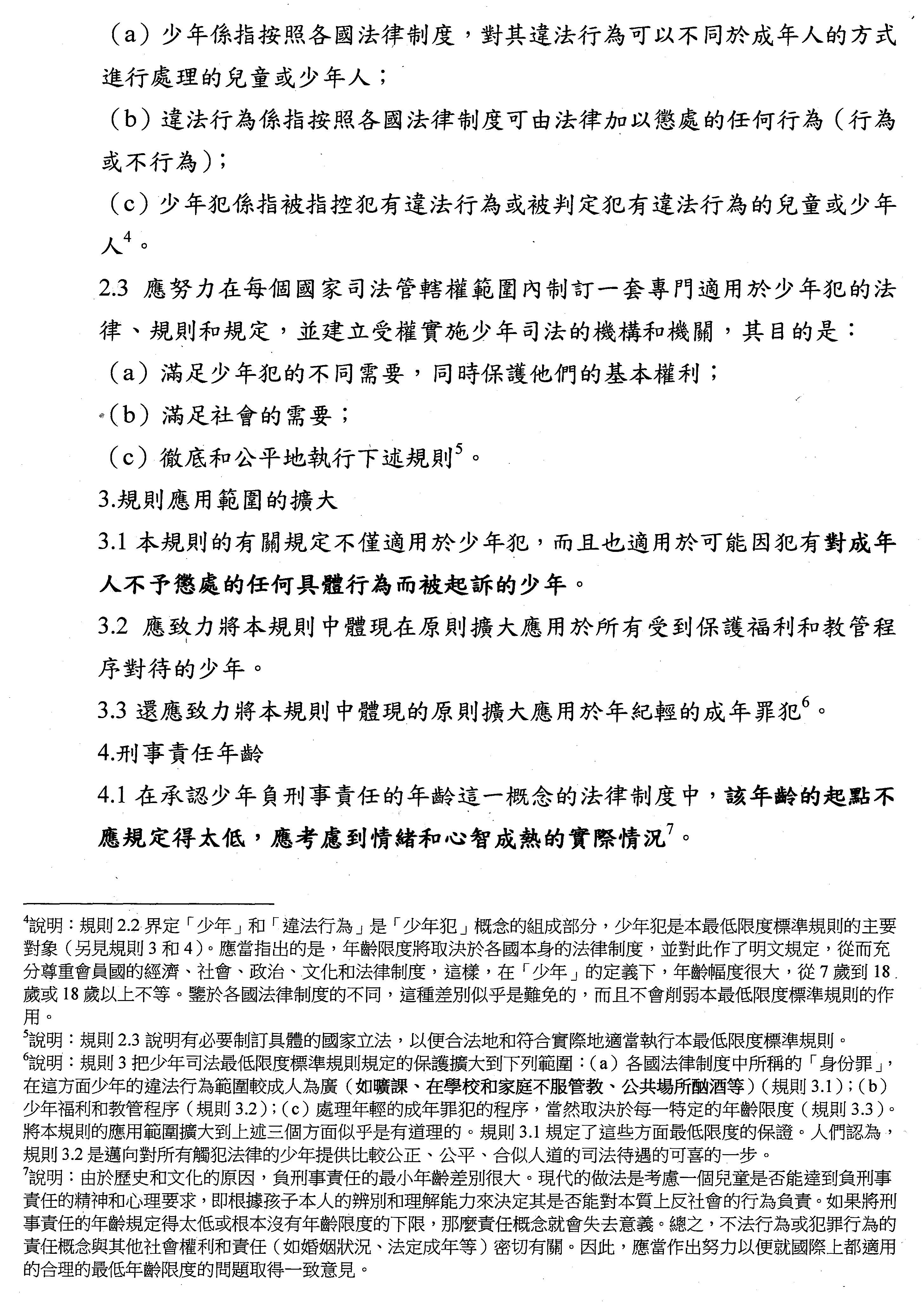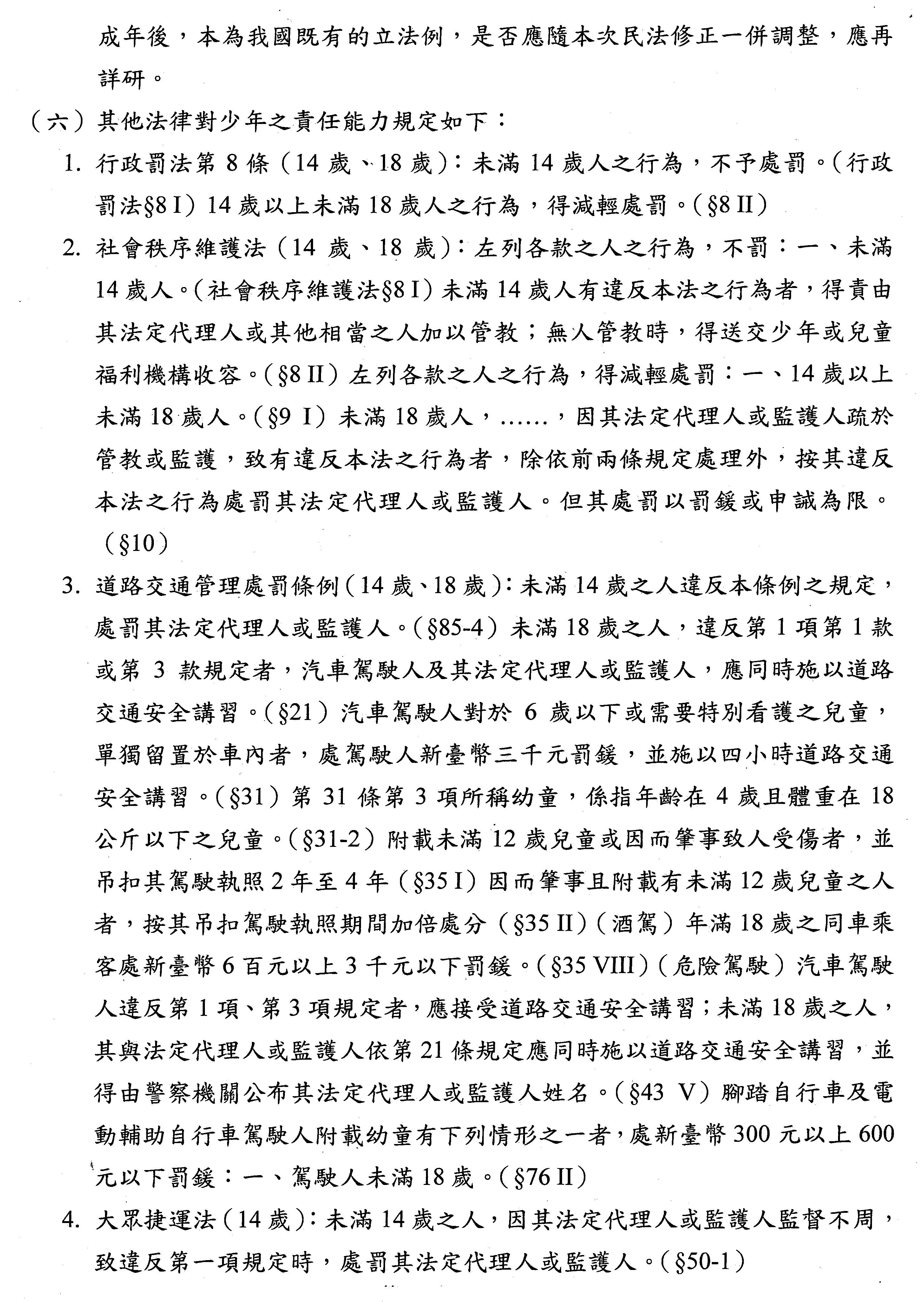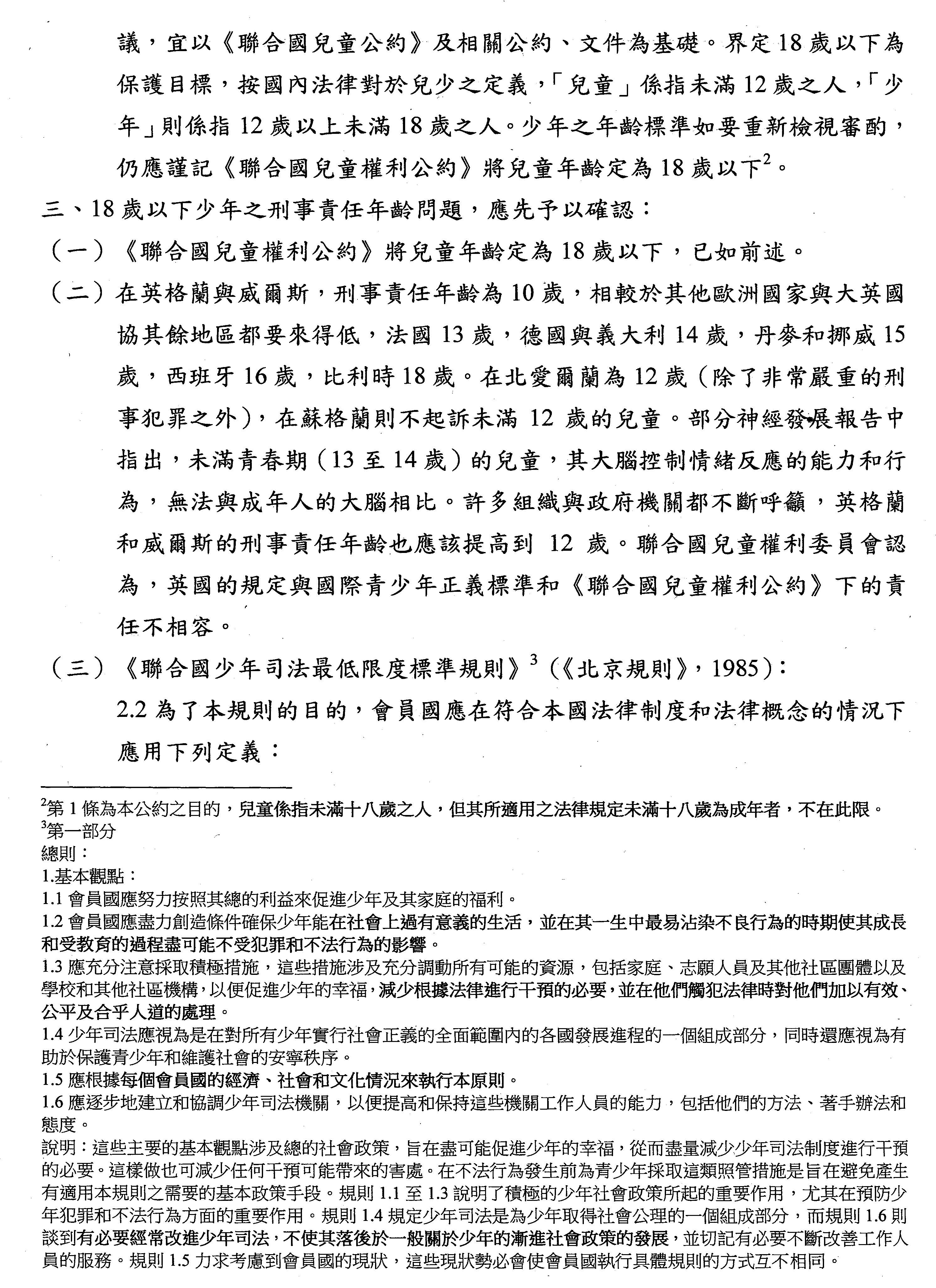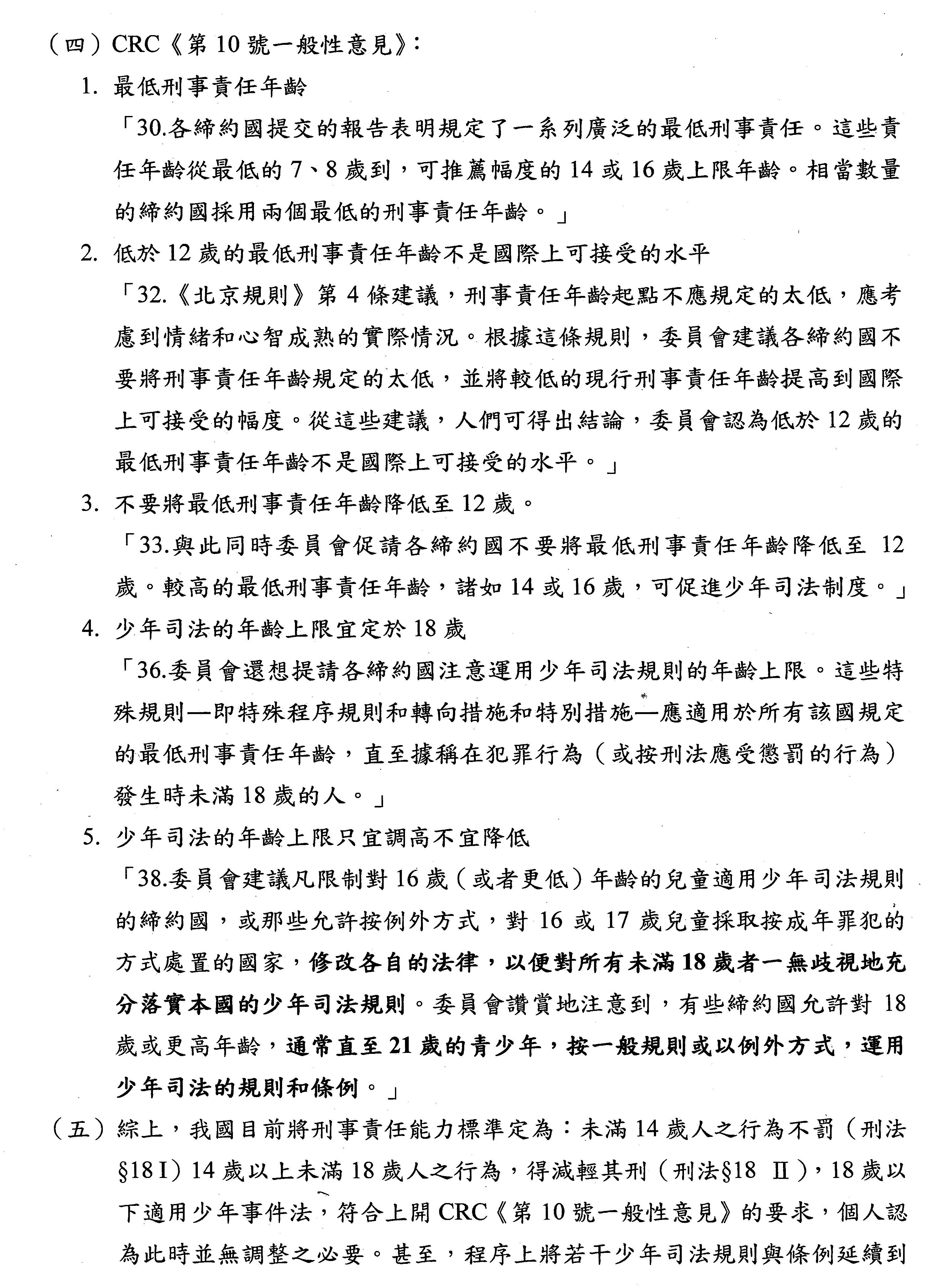 我要講的是,你可以看到聯合國兒童公約在1985年的北京規則之後,其實到CRC第10號意見的時候,對於最低刑事責任的年齡有做了一些說明,認為最低刑事責任年齡不應該再往下降了,建議是14歲到16歲,其實在英國甚至於10歲就可能會進法院負刑事責任,因而在國內遭到很嚴重的批評。例如我們臺灣是14歲以下者不罰,年滿18歲者負完全刑事責任。其實CRC也認為適用少年司法程序的年齡可以調高,而不宜降低。而且也不要以為臺灣是18歲以後就沒有少年事件處理法適用的餘地,我想法務部的長官應該都很清楚,其實有很多保護措施是延續到21歲、甚至23歲,我們可以看到,這樣的設計比較符合年齡適性的設計。所以我認為今天如果民法修了,後續我們可能要修更多的法,或是用更多的設計做到逐步的保護,因為我們的現行法裡面已經存在很多逐步保護,只是大家平常沒有去注意而已。