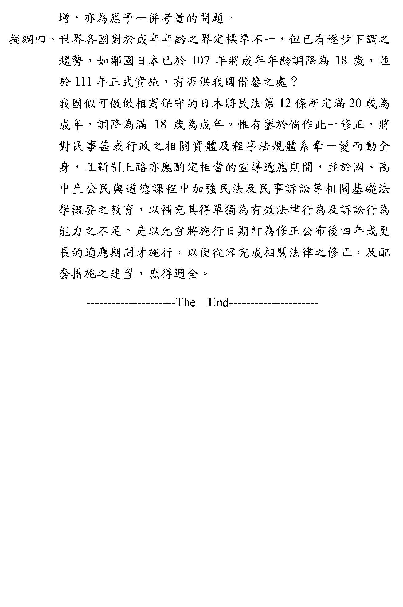 最後,我再強調,我覺得這是一個非常值得慎重思考、茲事體大的修改工程。首先,法條規範的複雜度、涉及不同的法規非常多;第二,我覺得它跟我們整個社會價值的通念有很大的關係,而18與20不應該是單一的劃分標準,而是18歲的年輕人究竟準備好為自己所有的行為負責了嗎?我覺得這才是我們真的應該要去思考的問題,謝謝。