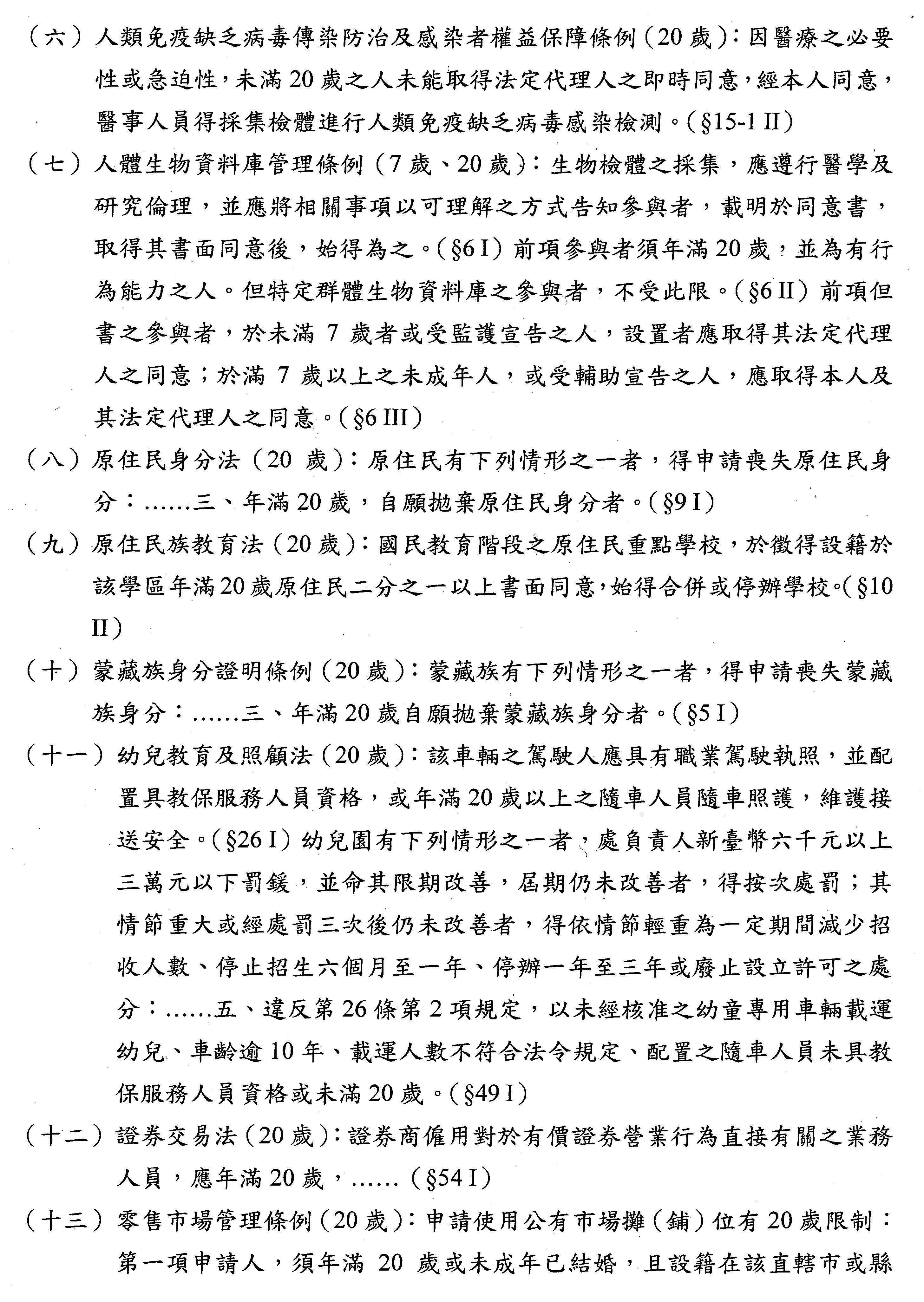 關於不需要修正的部分,我必須要說公司法非常優秀,因為它直接規定有行為能力或無行為能力,所以公司法基本不需要修正。問題在於許多法律都有訂定絕對年齡標準,這真的有點頭痛,我認為合作社法必須稍微修正一下。至於一定要修正的法律則有以下幾項:一、釋字第七百四十八號解釋施行法:如果我們要把結婚年齡及成年年齡變成18歲的話,那麼釋字第七百四十八號解釋施行法第三條第二項「未成年人成立前條關係,應得法定代理人之同意」的部分就可以拿掉了。如果我們要修正法定結婚年齡的話,第七百四十八號解釋施行法一定要馬上修正。二、人體器官移植條例:因為18歲和20歲是非常重要的門檻,如果成年年齡要修正的話,那麼這部分一定要跟著修正,因為條文當中寫的是「絕對年齡」,所以這部分可能要請衛生主管機關研議一下。三、病人自主權利法及安寧緩和醫療條例的相關規範都是20歲,因為當初立法時認為20歲就是成年年齡,所以就直接寫上20歲。四、愛滋病感染者權益保障條例的相關規範是20歲。五、人體生物資料庫管理條例的相關規範也是20歲。六、原住民身分法:原住民身分必須年滿20歲才能自願拋棄。七、原住民族教育法:如果學區當中的原住民重點學校要停辦的話,必須經過年滿20歲原住民二分之一以上書面同意,這部分是不是也應該予以調整?八、蒙藏族身分證明條例:自願拋棄蒙藏族身分也必須年滿20歲。九、幼兒教育及照顧法:娃娃車隨車人員年齡不能小於20歲,如果今天我們修正成年年齡,結果有一位18歲的人去當娃娃車隨車人員的話,那麼就會牽涉到罰則,根據第四十九條第一項的規定,可能會處罰六千元至三萬元,甚至會嚴重到命其停止招生,所以這部分也要跟著修正。十、證券交易法:第五十四條第一項也必須修正。