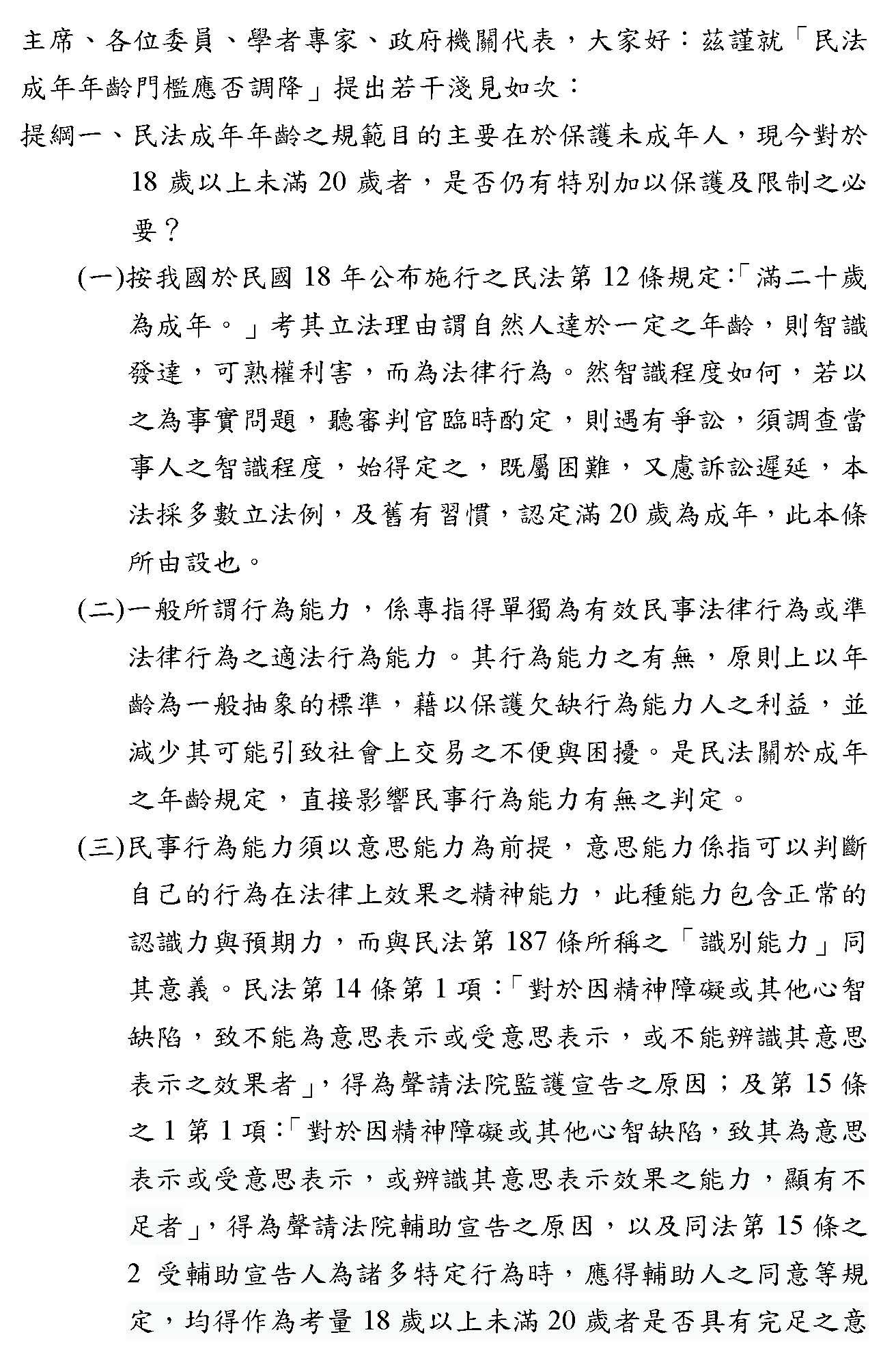 張代理處長富林:主席、各位委員。有關這個案子,站在國發會的立場,我們的看法是,現行民法有關成年年齡的規定是民國18年訂定的,屬於早期農業社會的考量;今天面對數位經濟時代來臨以及教育程度普及和提升的狀況,這個制度的調整和檢討是有必要的。這點我們要先予敘明。