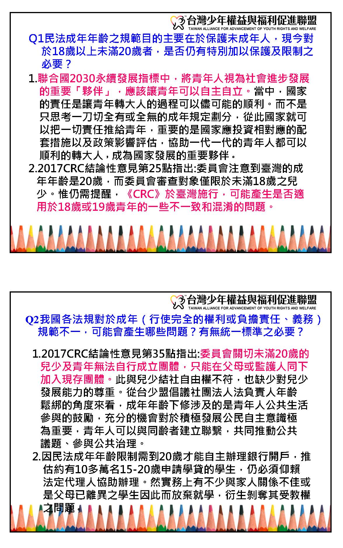 有關提綱的第三個部分,關於一些相關的配套措施,的確呼應第二個提綱有非常多的衝突點,但是我們認為如果從未成年人的角度來看,你認為他就是不成熟、判斷力不足,而加以保護,可是在有一些法條的規範上面,如果以兒童及少年福利與權益保障法來看,是只限定在18歲以下,超過18歲的又沒有特別作說明,包括剛才大家提到抽菸這件事情也是。坦白說,我也為人父母,站在我的角度,即便我的兒子超過25歲,我也認為他不應該抽菸,所以其實跟他是不是滿18歲沒有關係,我想這個考量的點可能是不太一樣的。