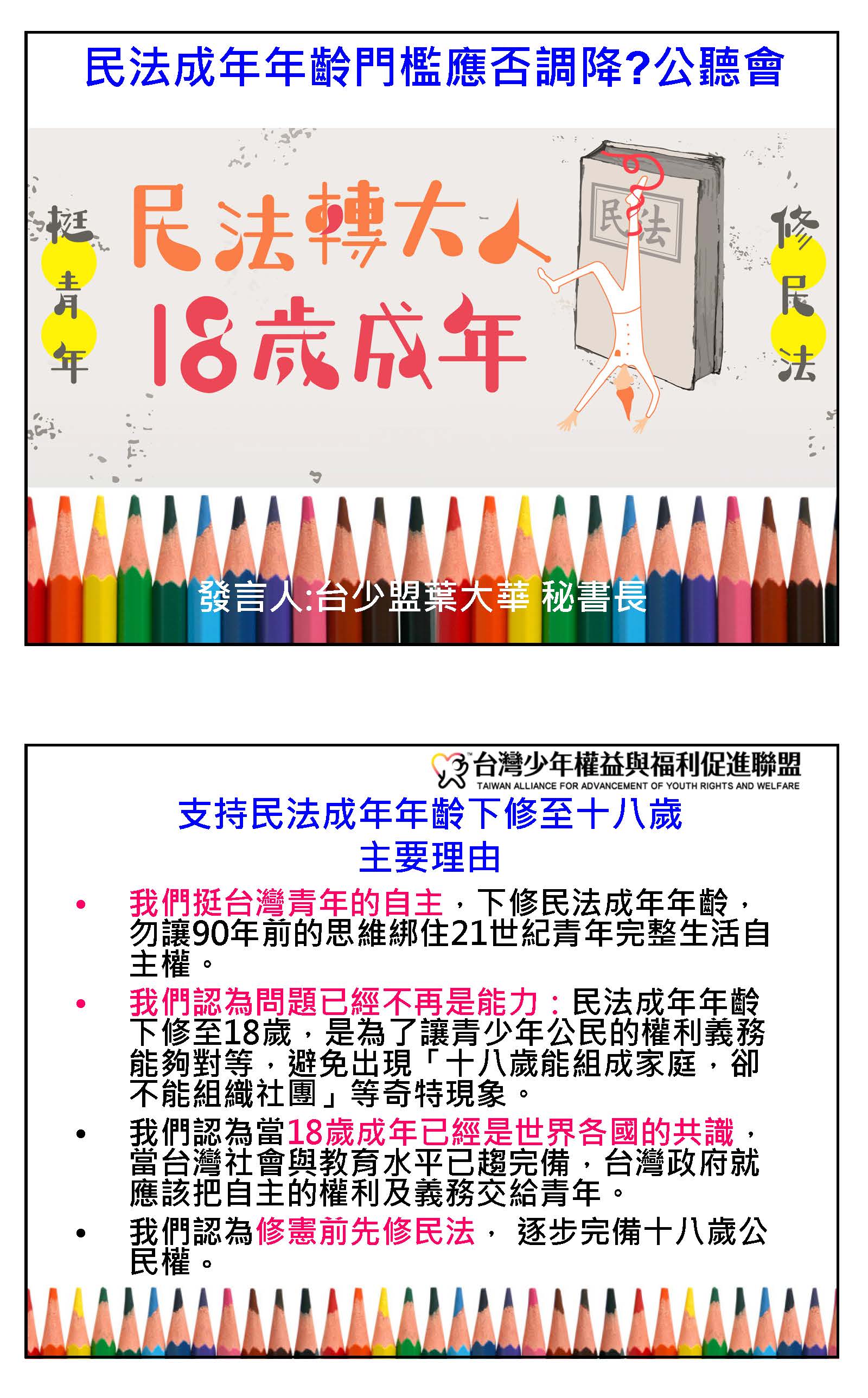 還有,尤其是在北部地區的學校,甚至很多學校的宿舍是不夠用的,在這樣的狀況下,學校通常會要求學生提供戶籍謄本,其實在沒有監護人相關證明的情況下,這部分的申請也是會有障礙的。還有一個部分是關於就學貸款,可能有的學生剛到大學,大一時就需要就學貸款,但是也是因為目前的法源針對完全行為能力人是20歲,在程序上會因為這樣的限制造成很多手續上的不便。而且,我們可以說,在90年前這樣的法律出現時沒有那個問題,但是如今在現行社會的情況下,很多學生不管是面對升學或者是面對就業,這是一個很大的趨勢,很多很多的青年會想要使用這個權利,並非只是少數人需要,所以身為臺科大學生會學生議會幹部,我在這邊懇請呼籲,建議民法成年年齡門檻應予調降。