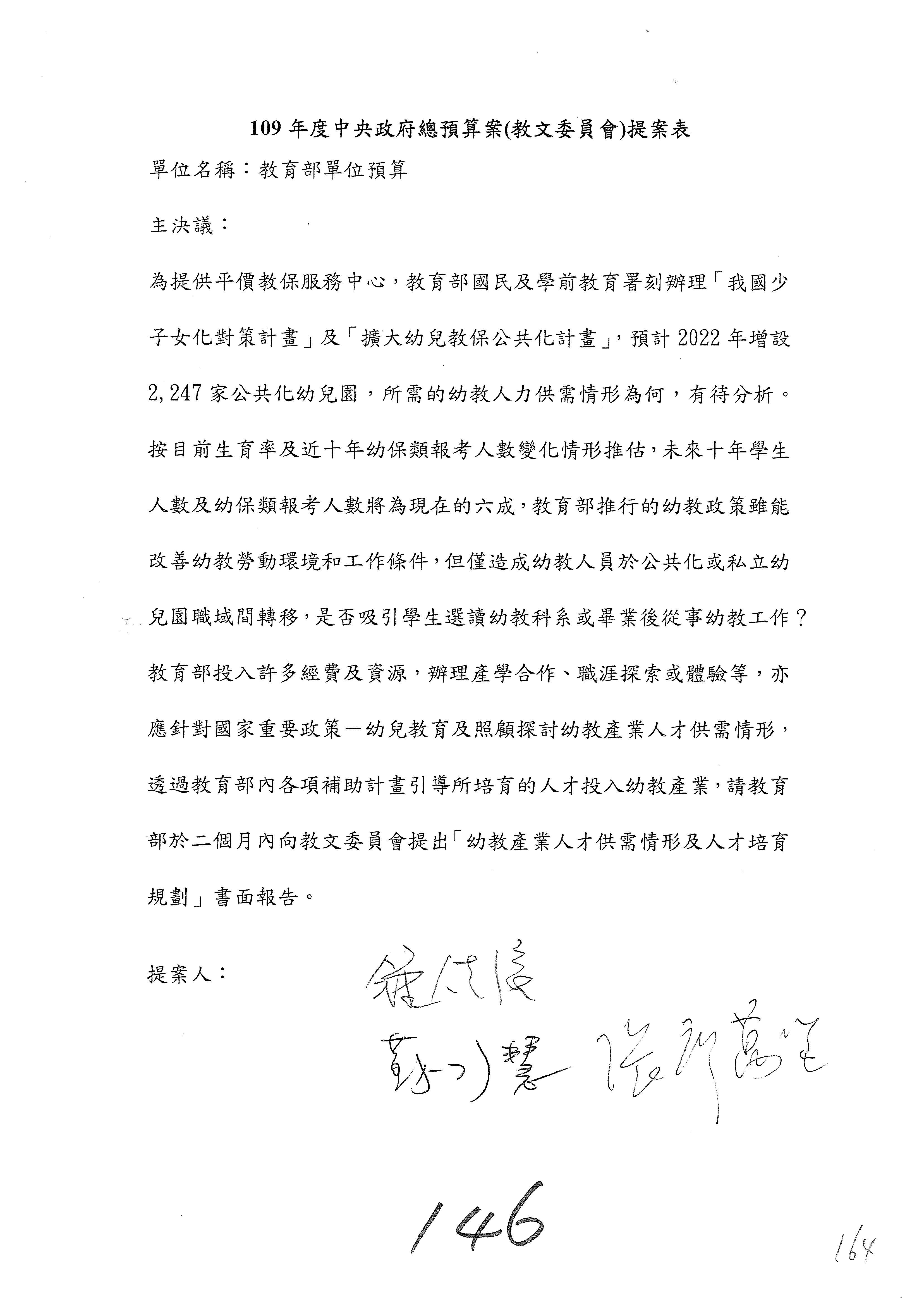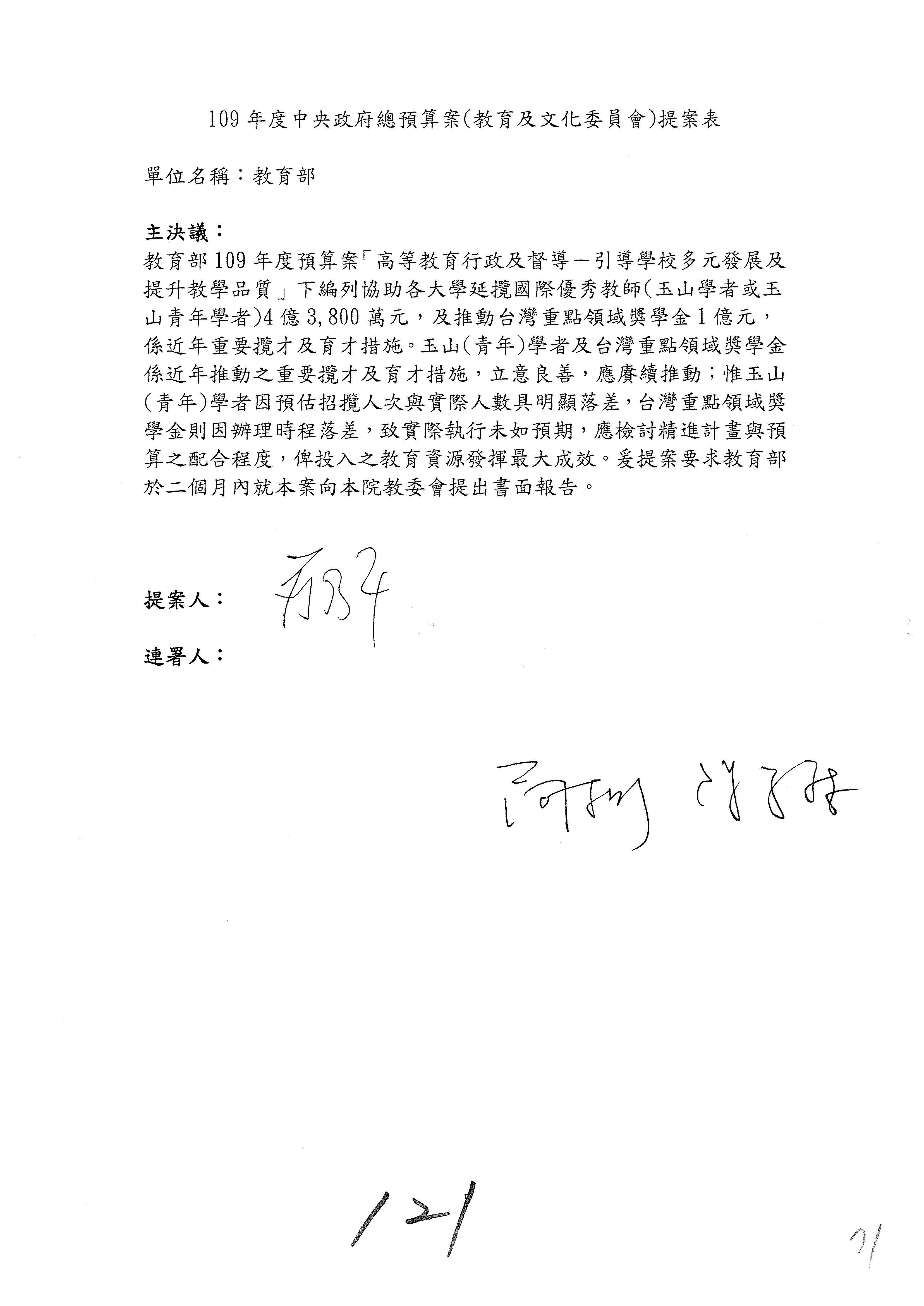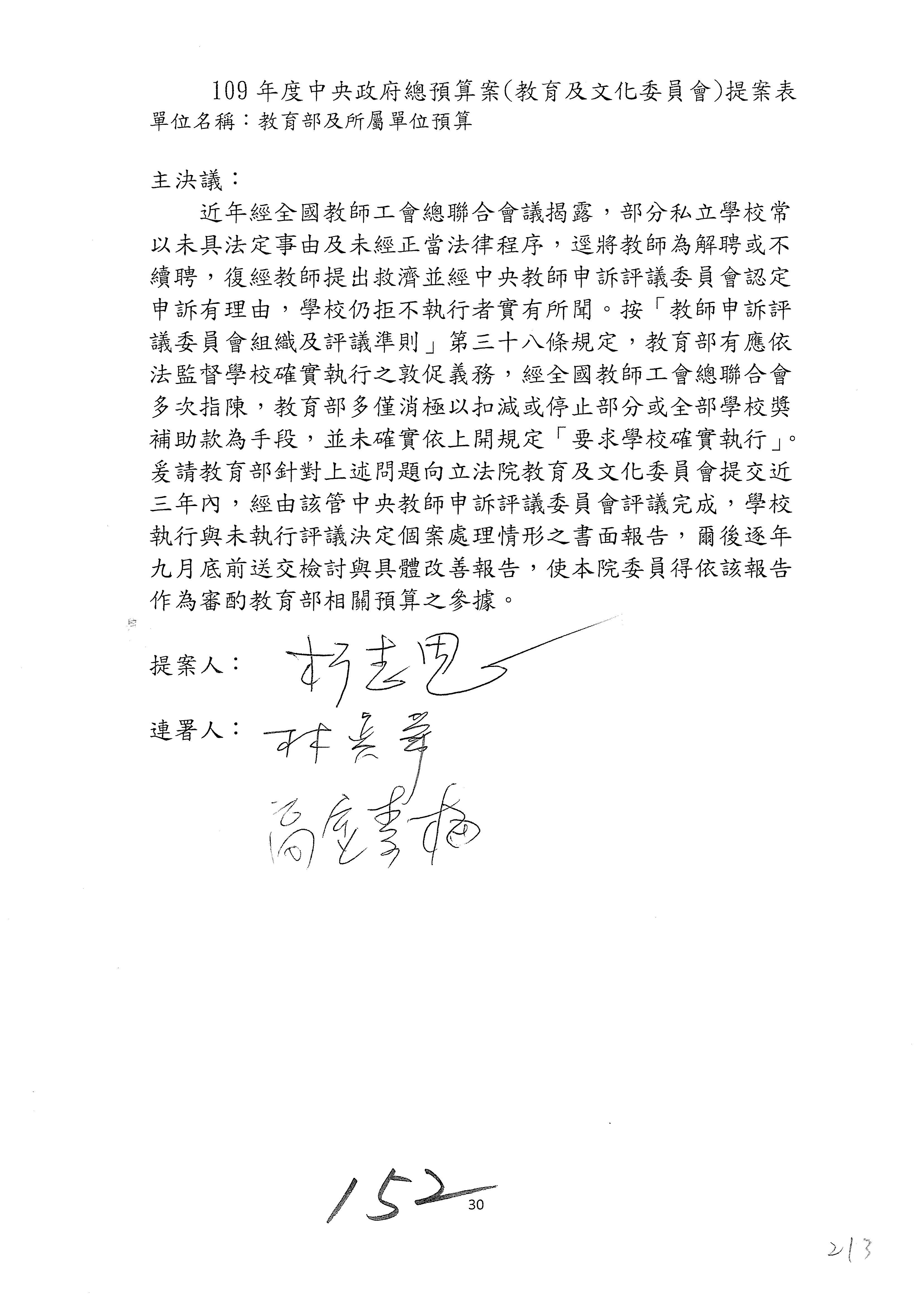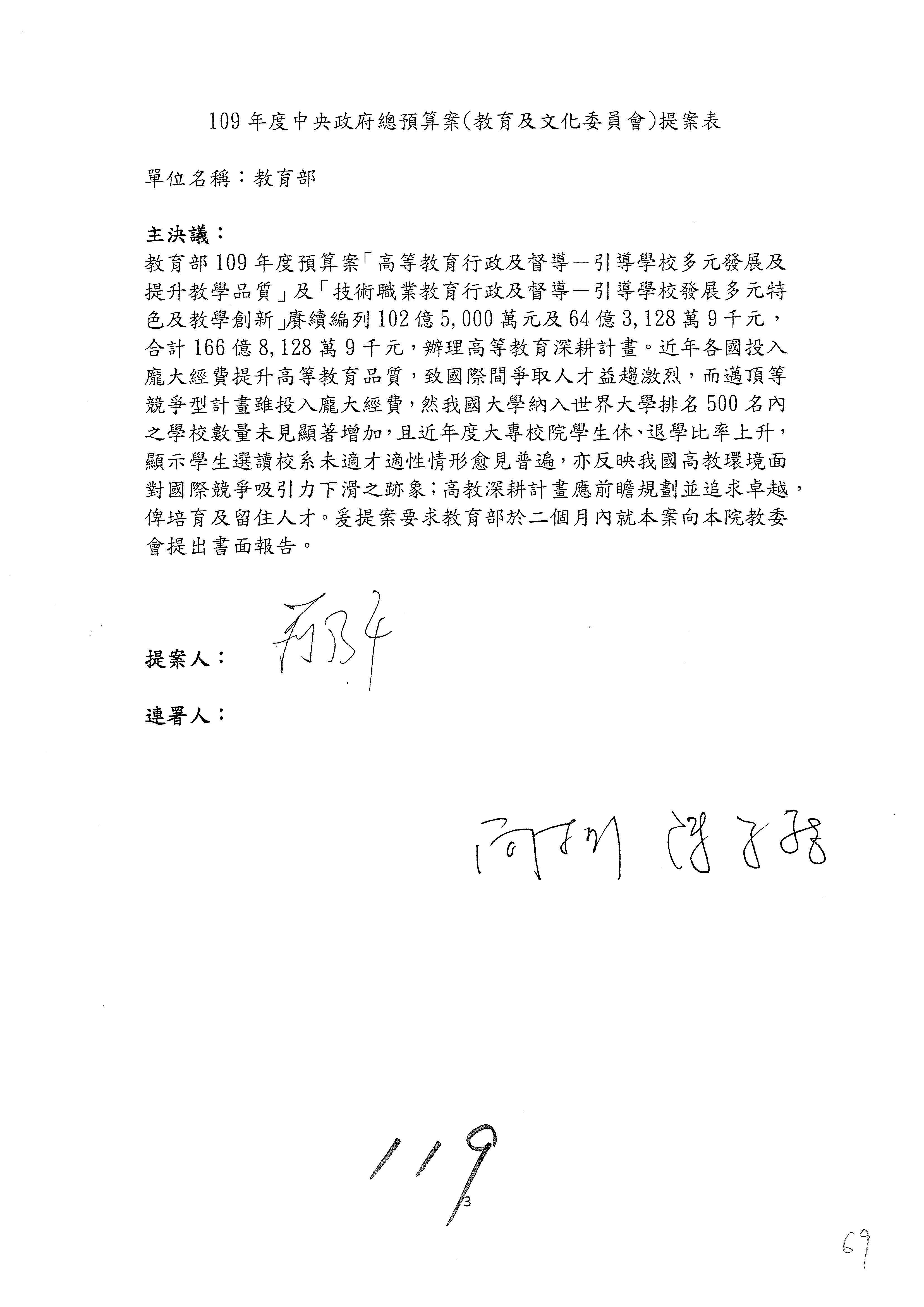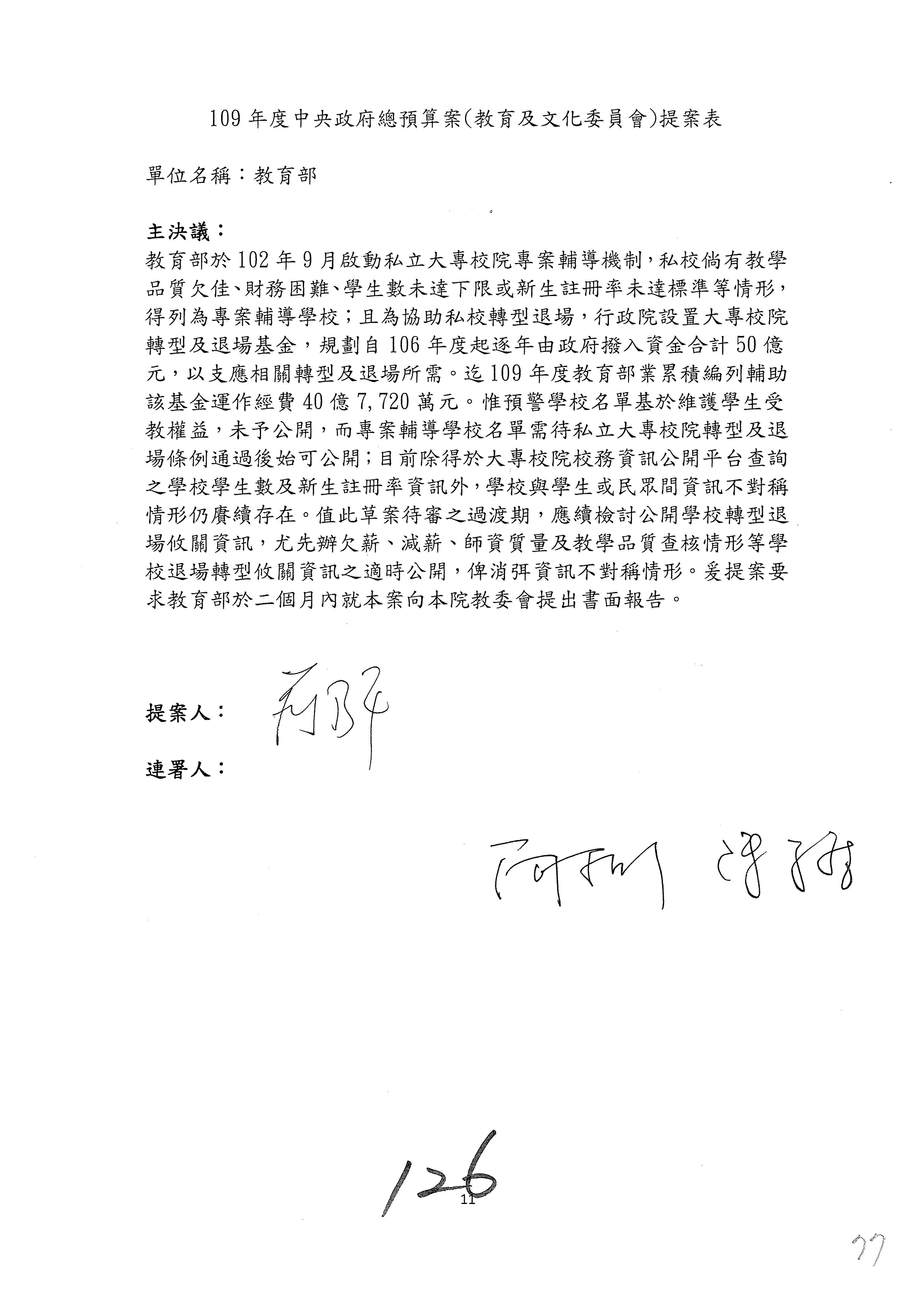 主席:好,最後一句修改為「爰提案要求教育部於三個月內向本院教委會提出書面報告」,修正通過。