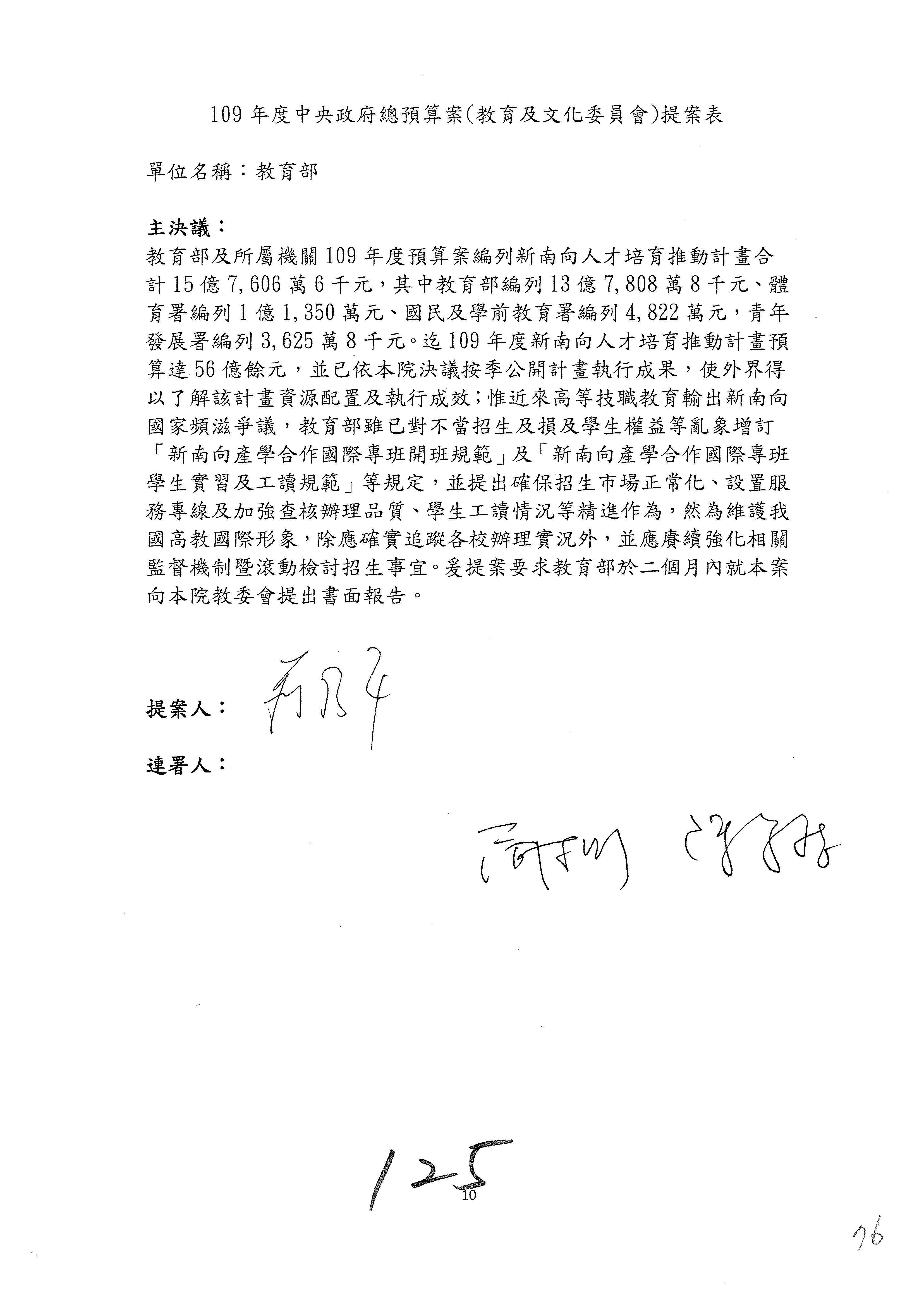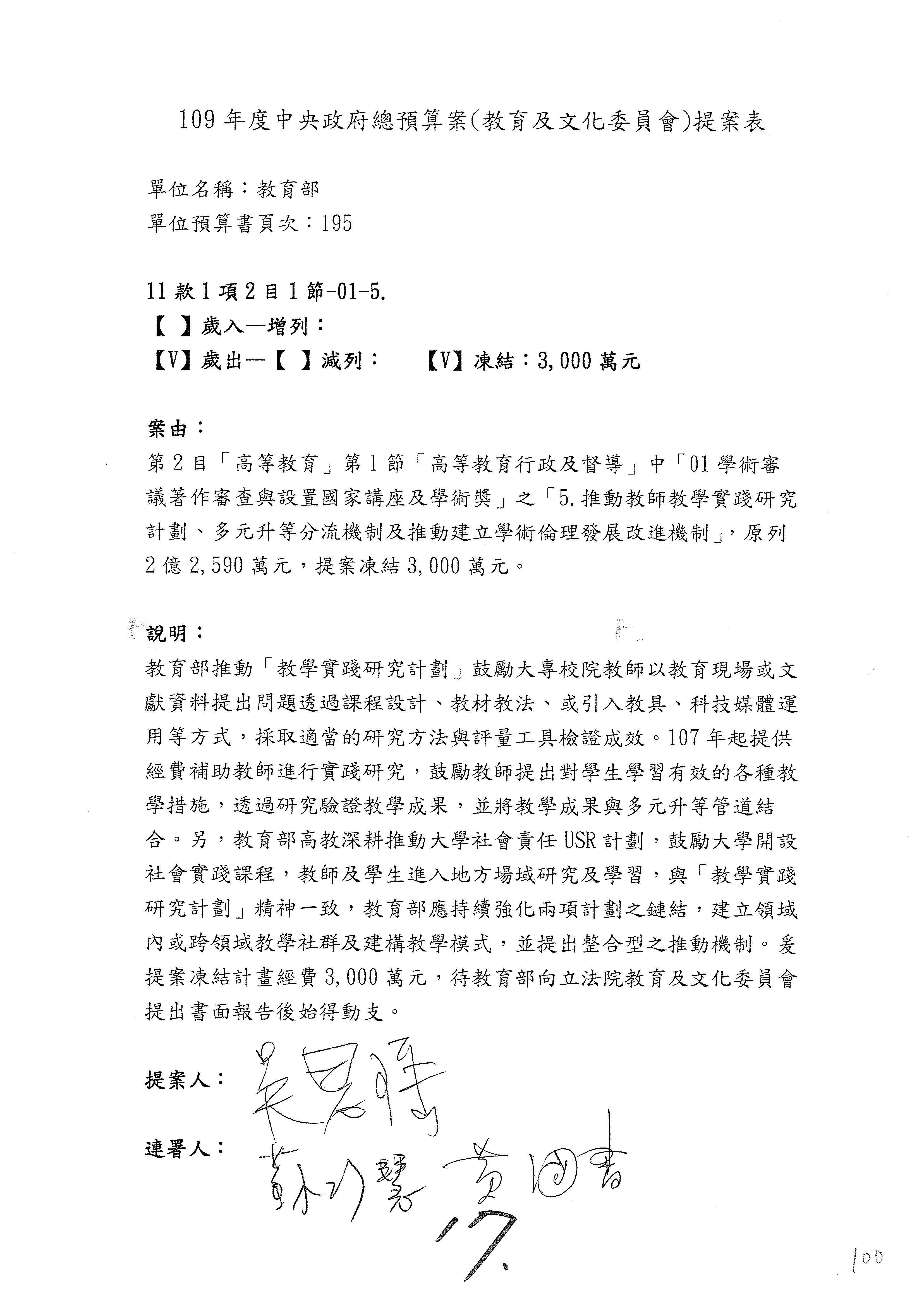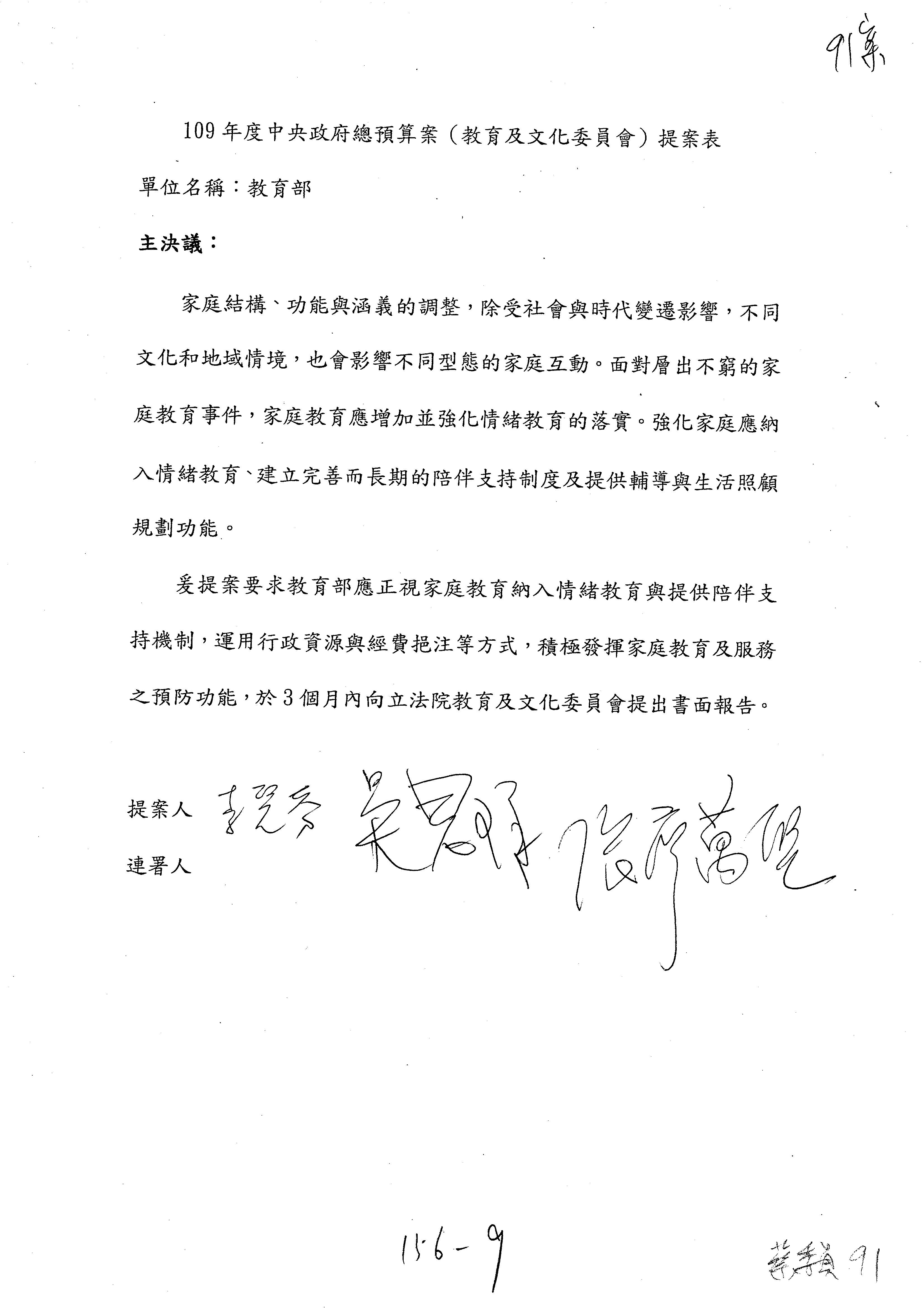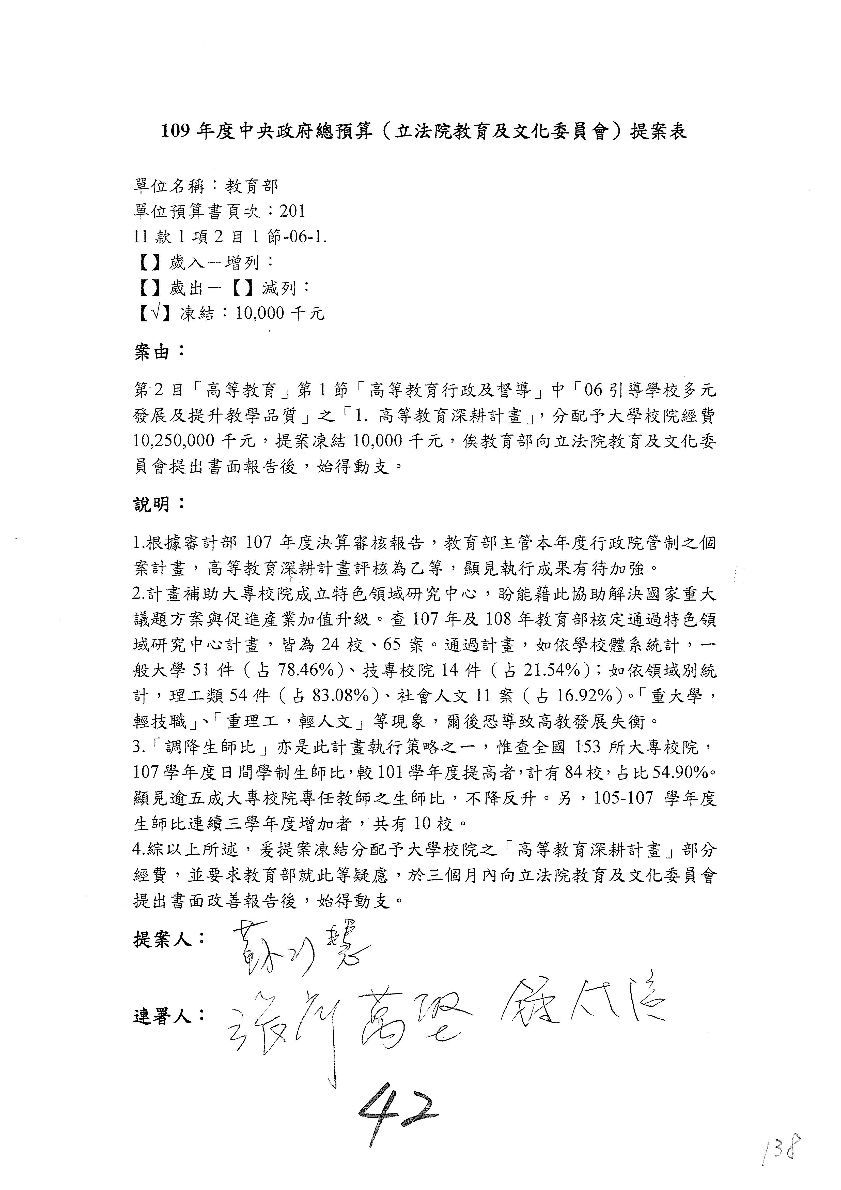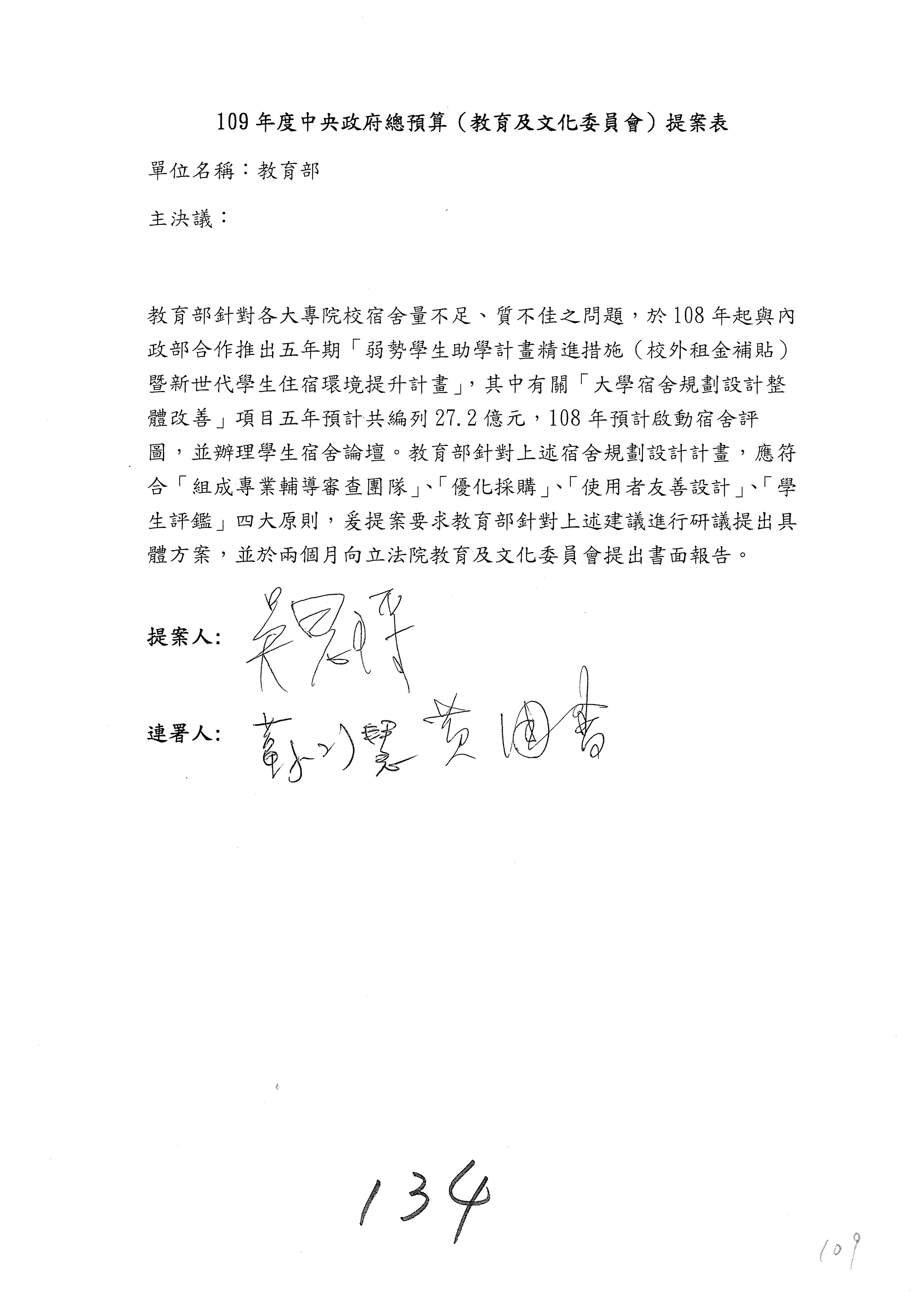主席:好,最後一句修改為「爰提案要求教育部於三個月內向本院教委會提出書面報告」,修正通過。