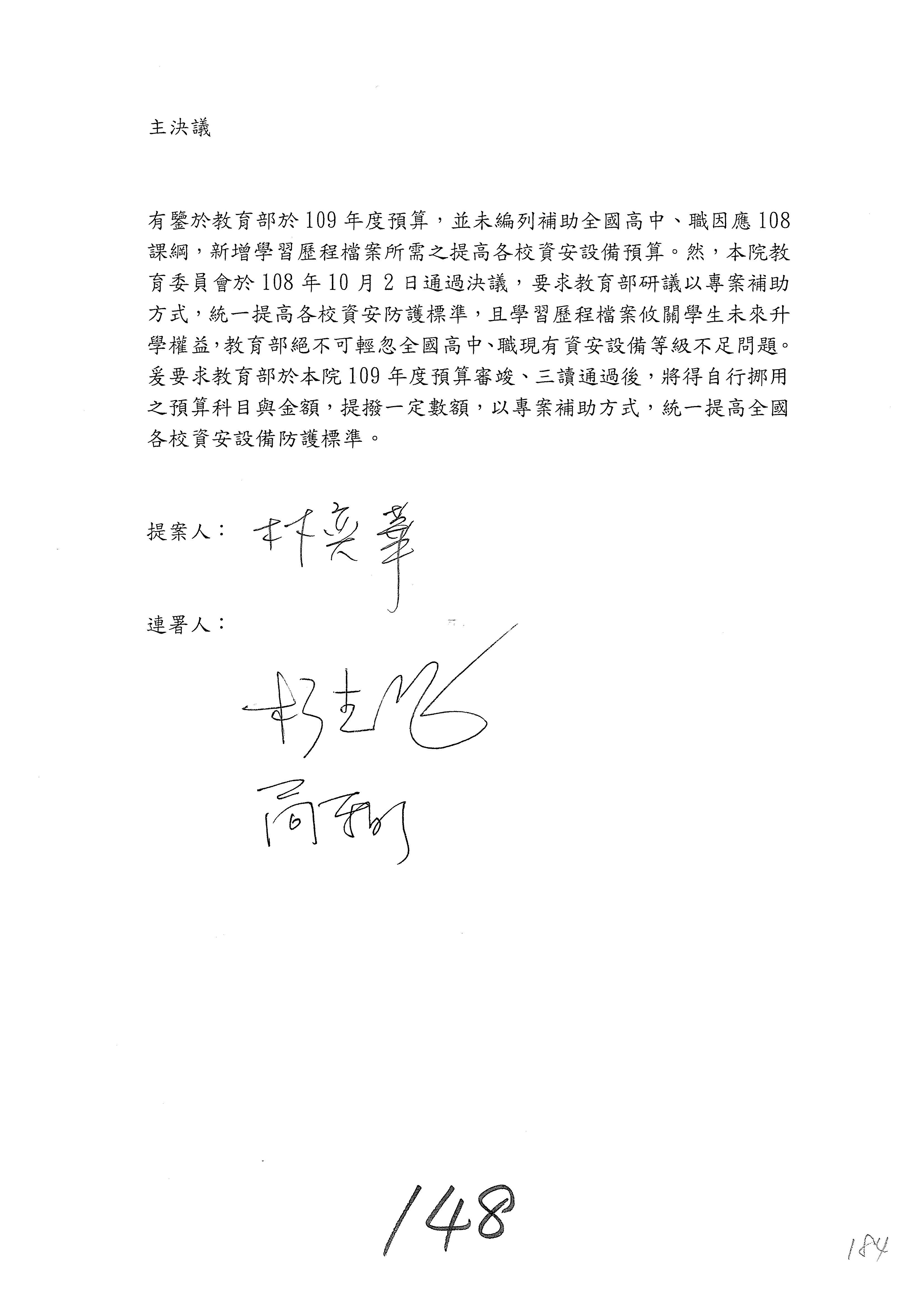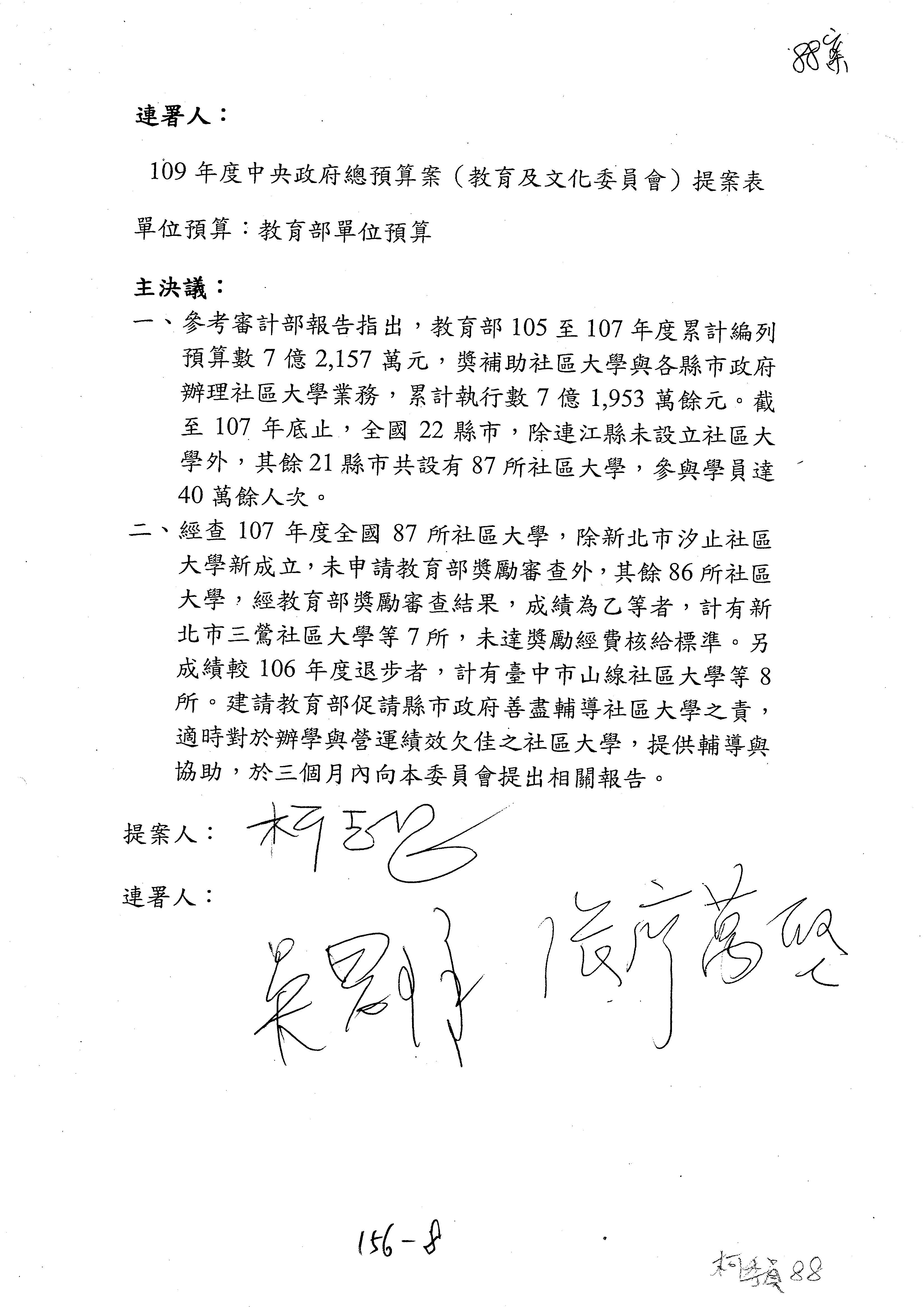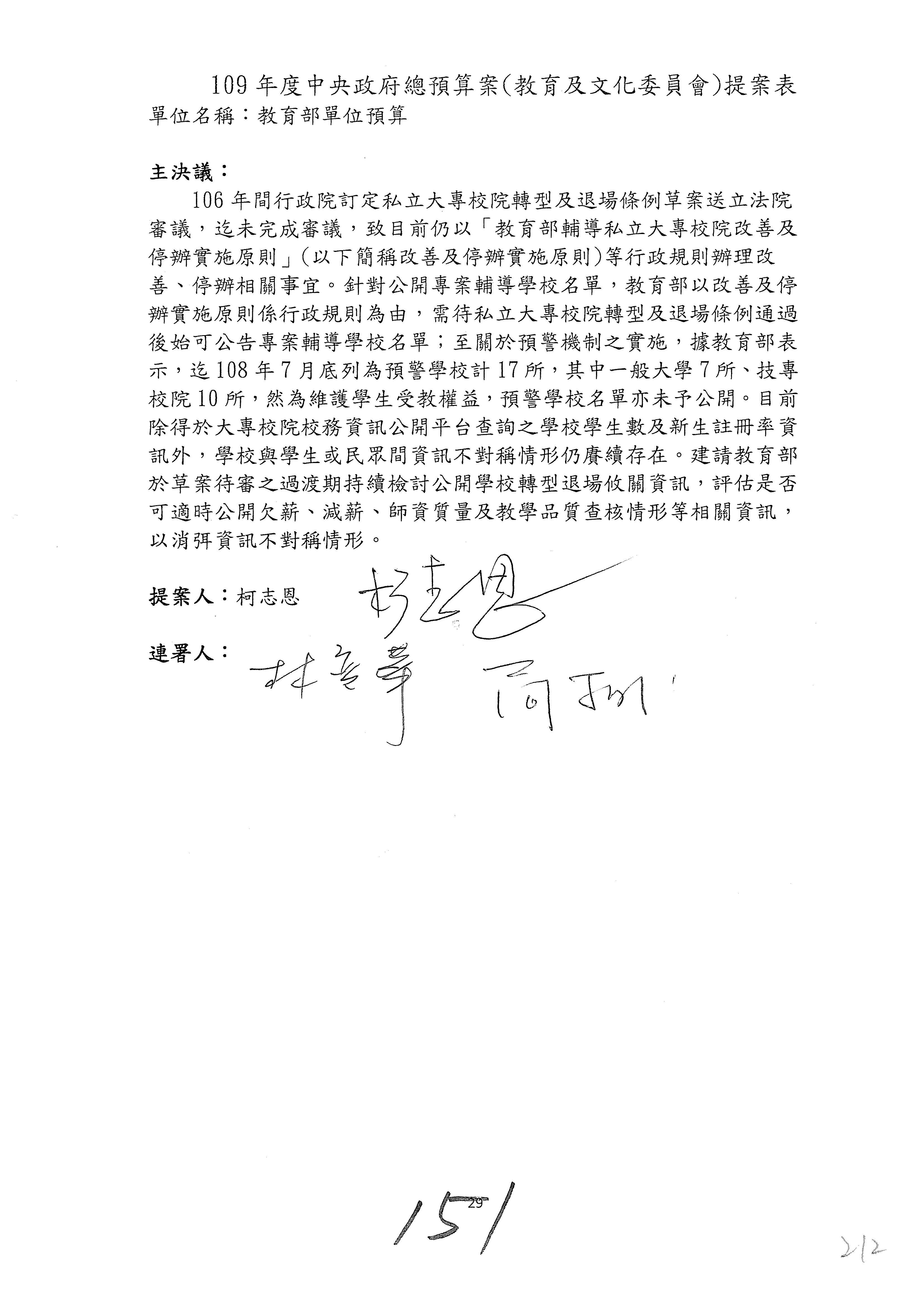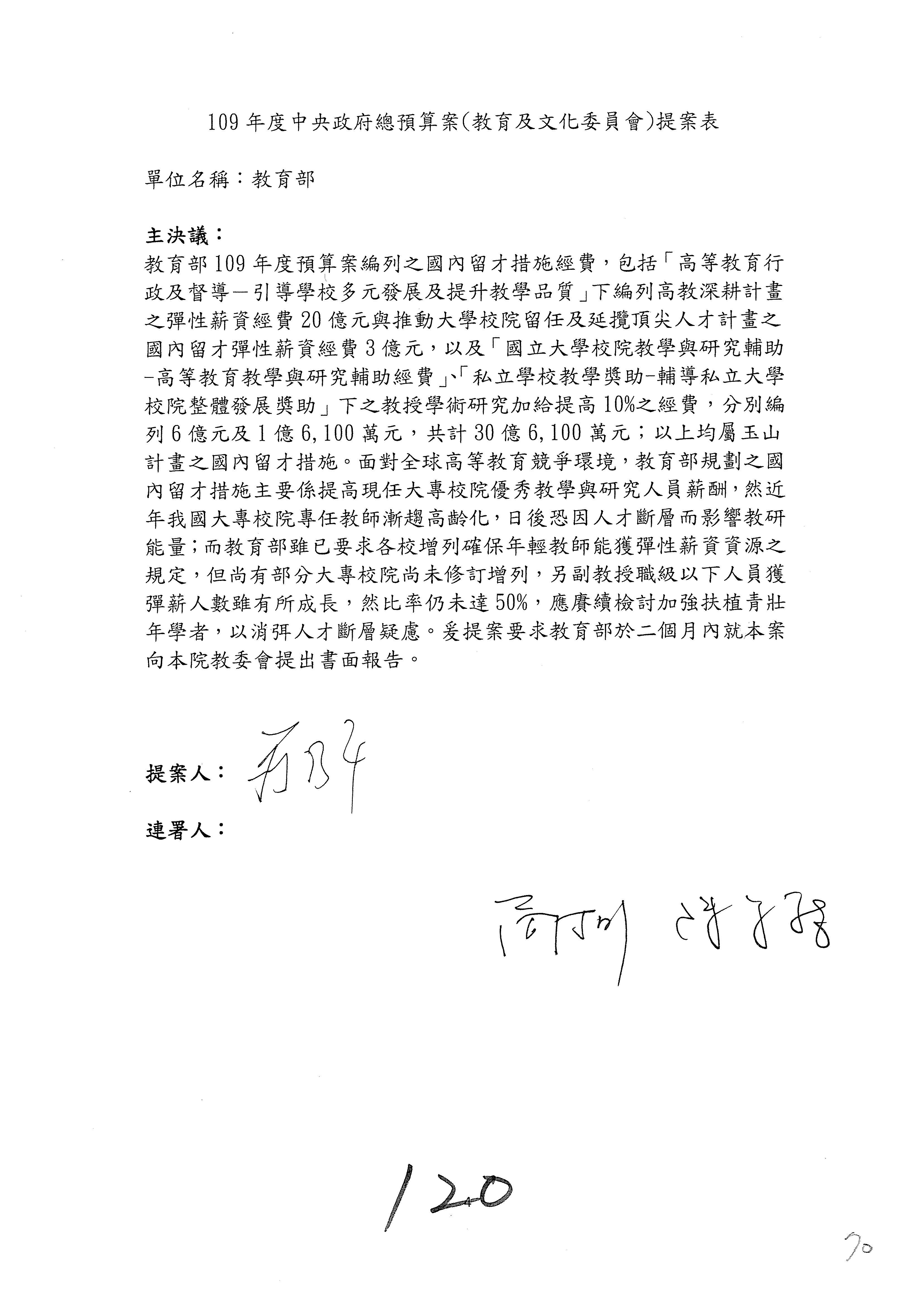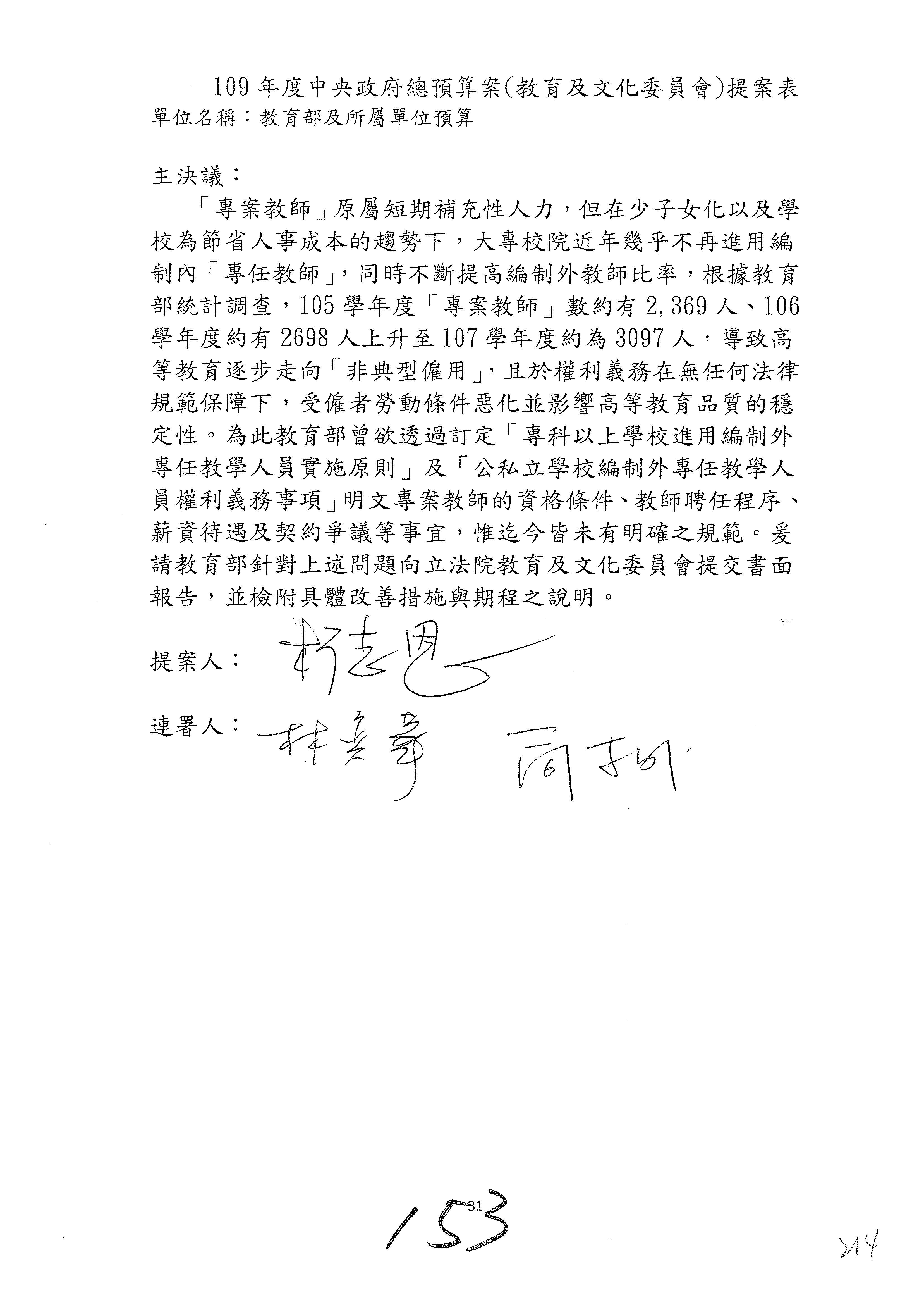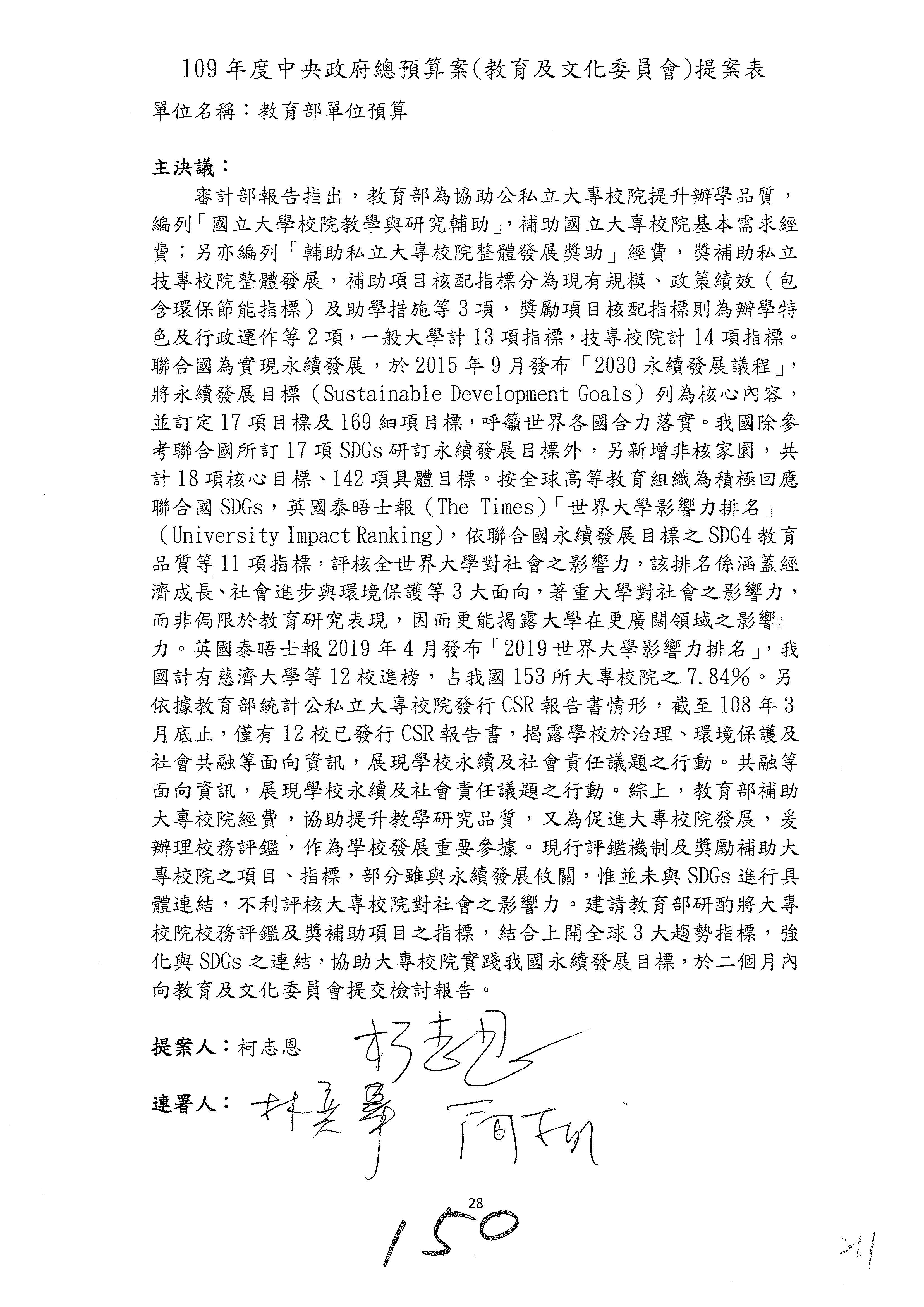 主席:好,最後一句修改為「爰提案要求教育部於三個月內向本院教委會提出書面報告」,修正通過。
