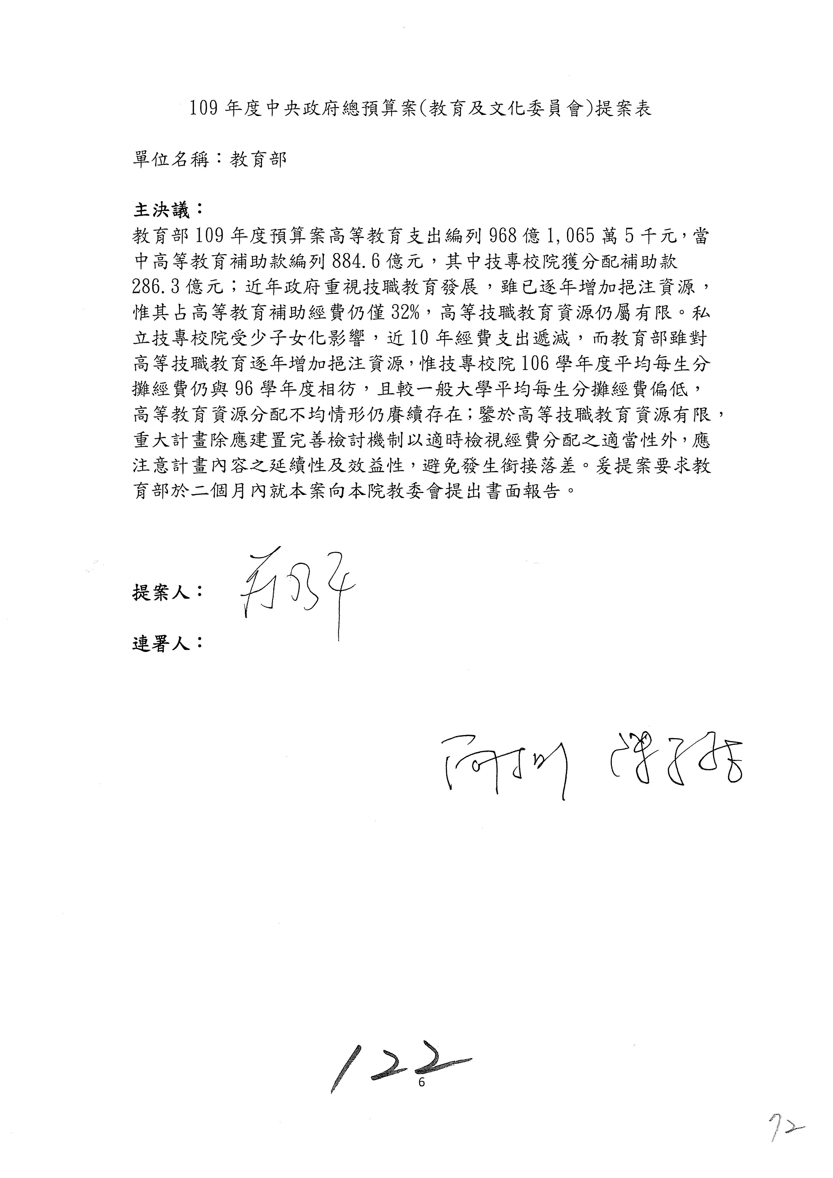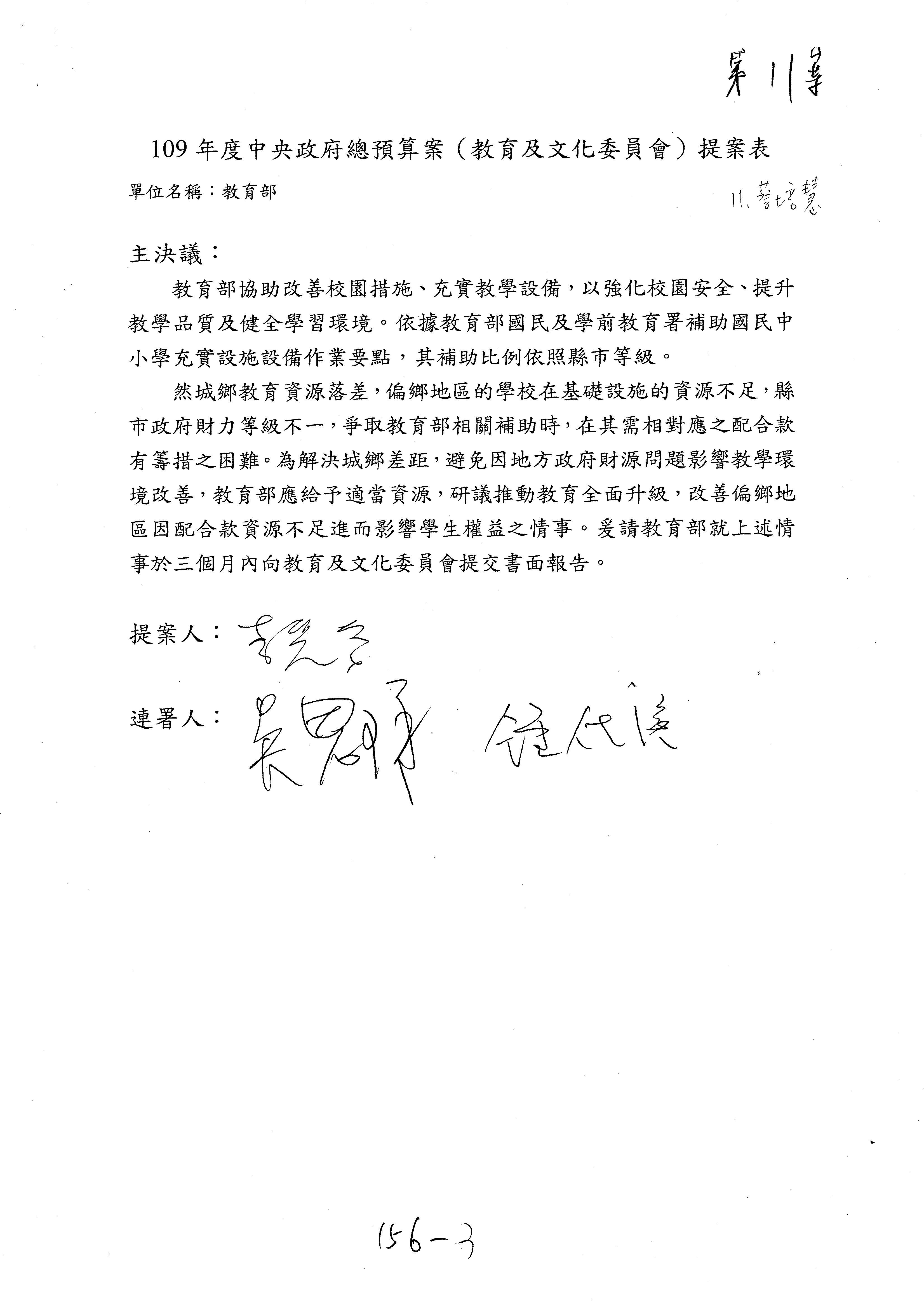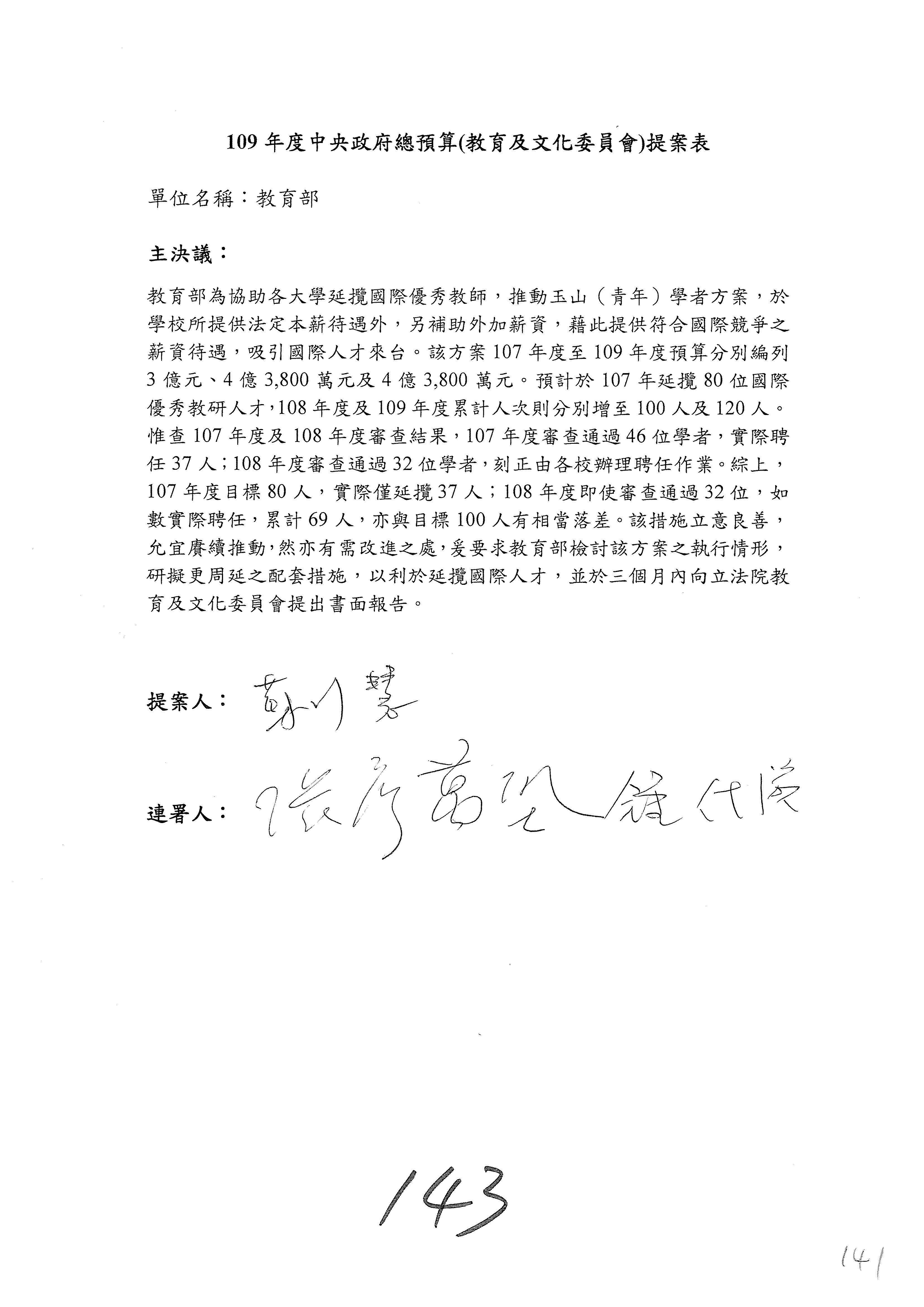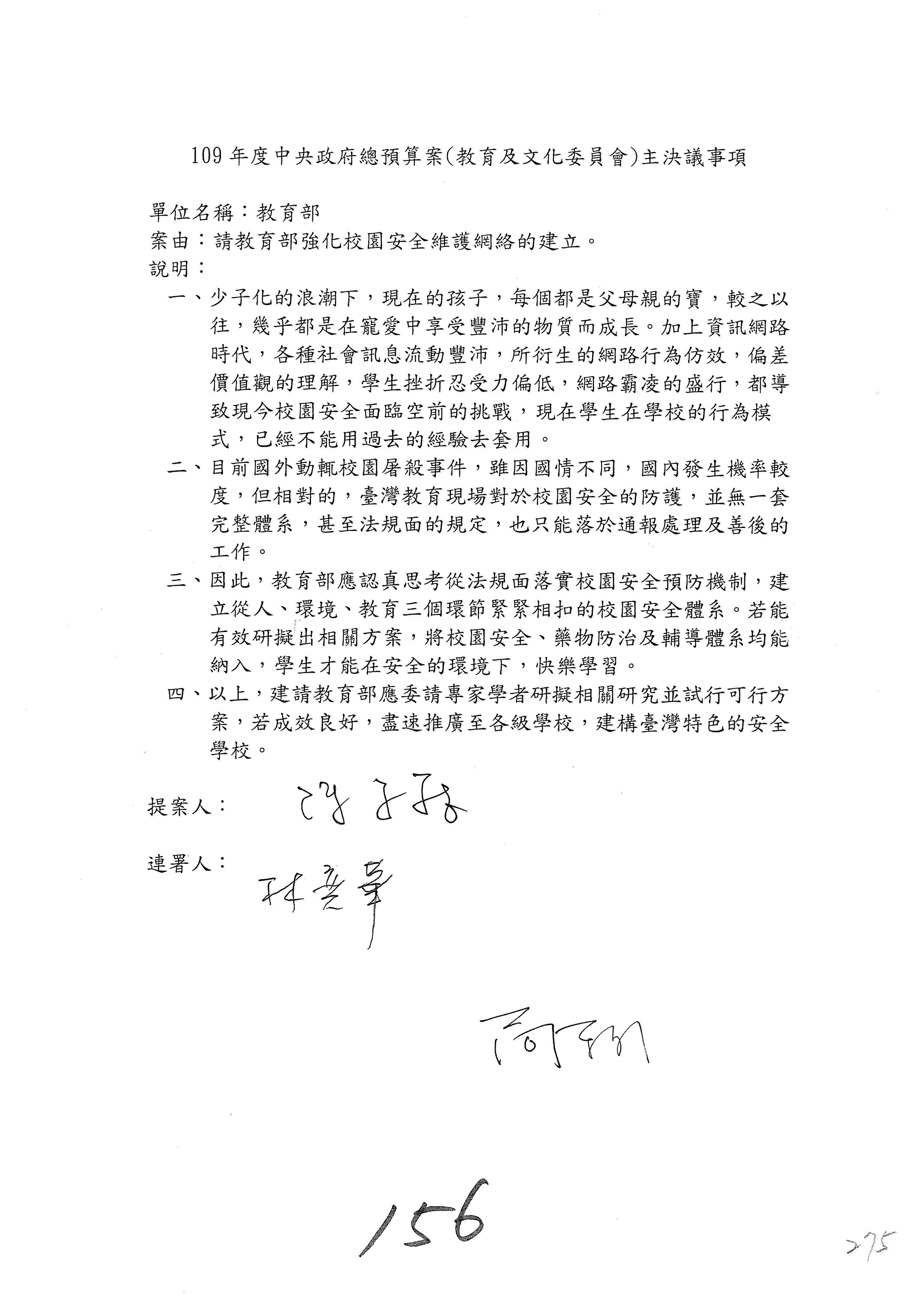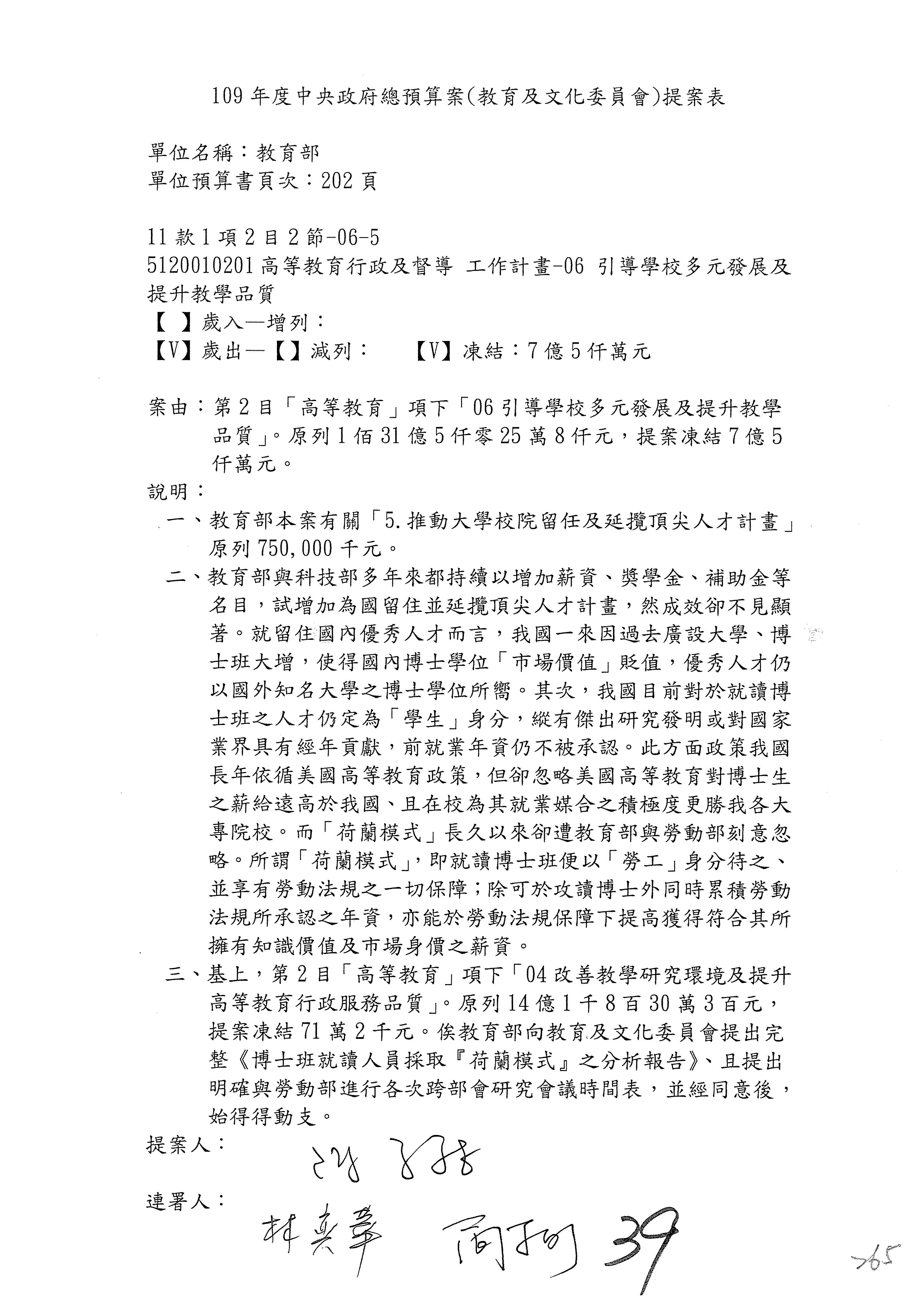 主席:好,最後一句修改為「爰提案要求教育部於三個月內向本院教委會提出書面報告」,修正通過。