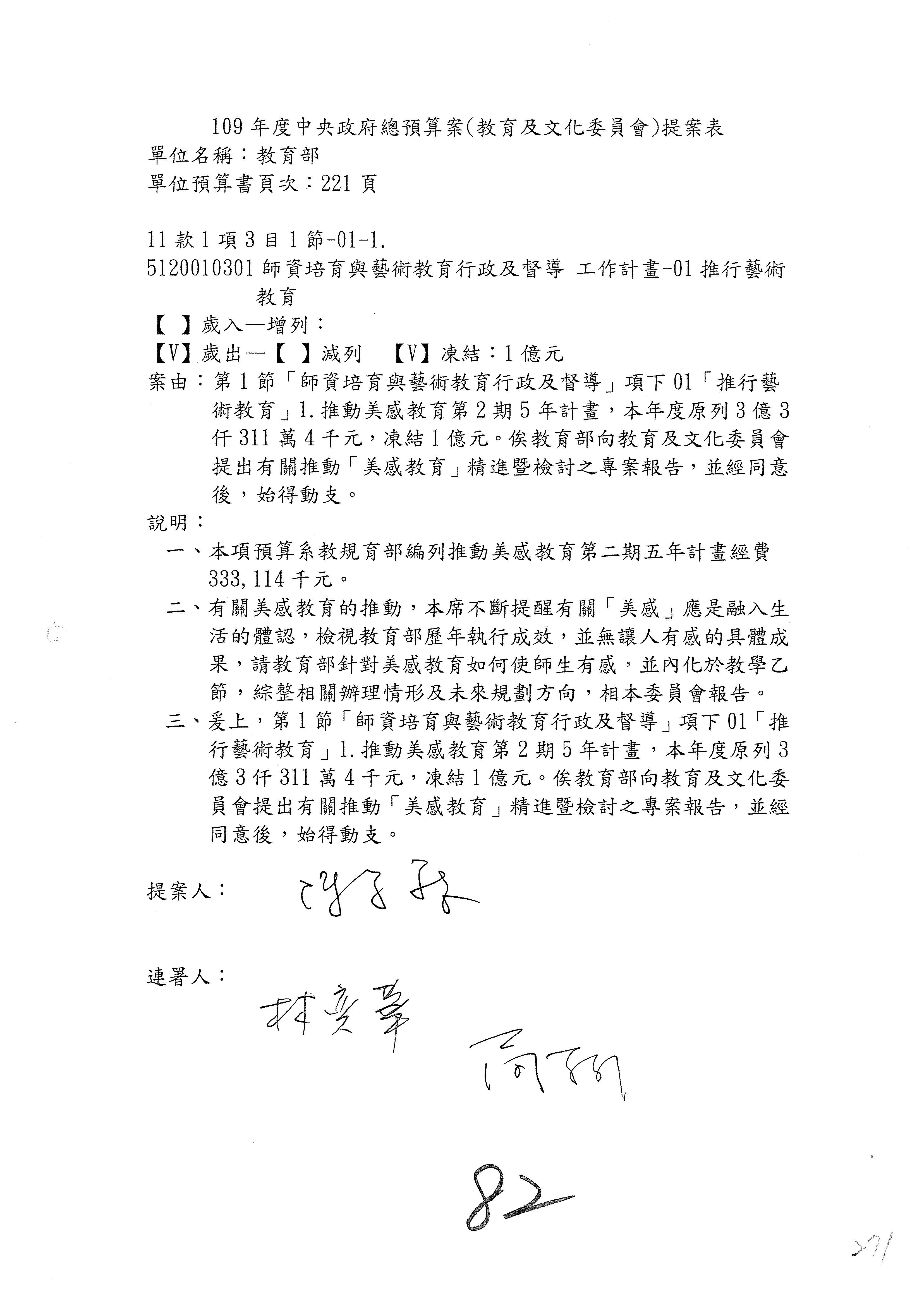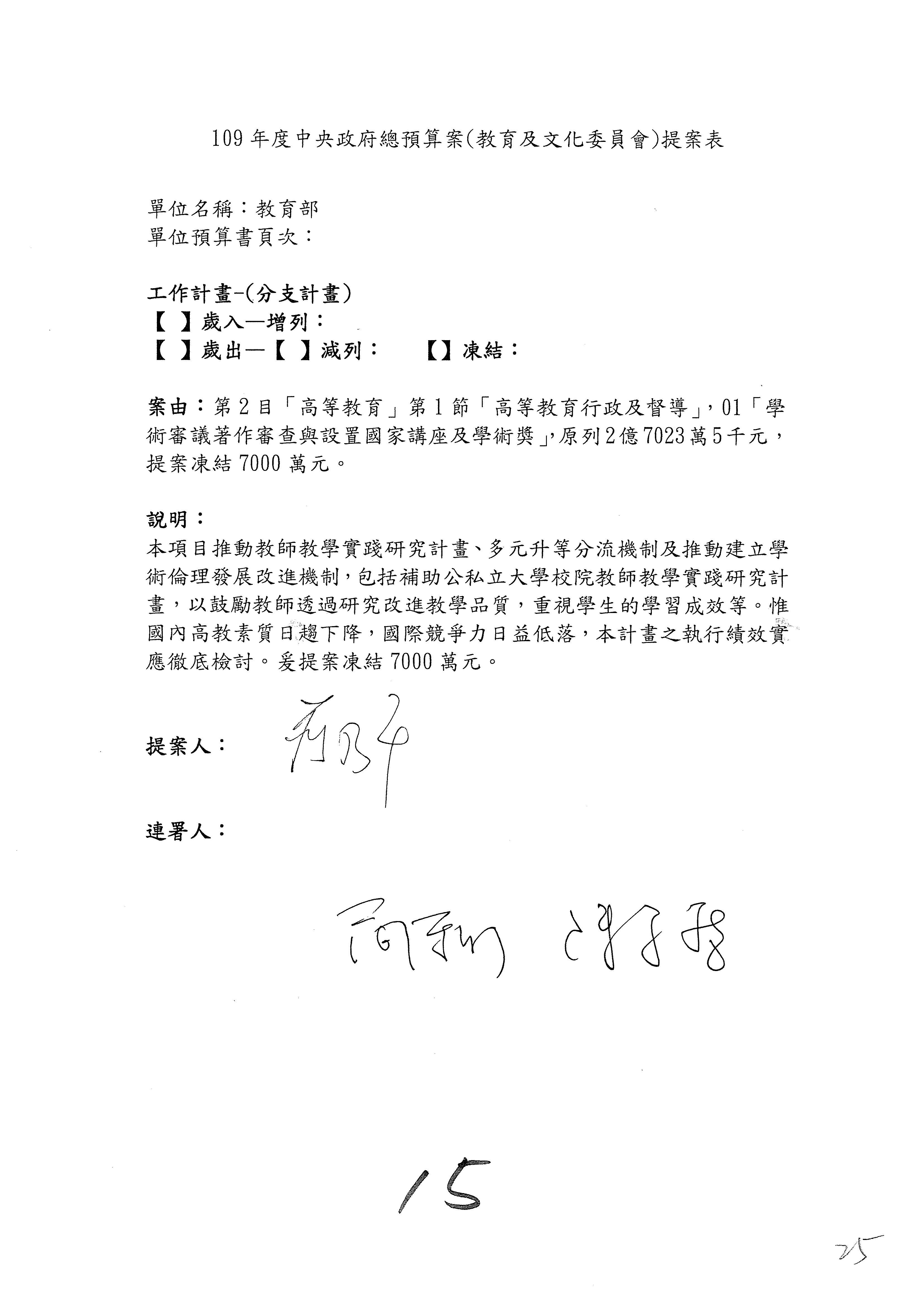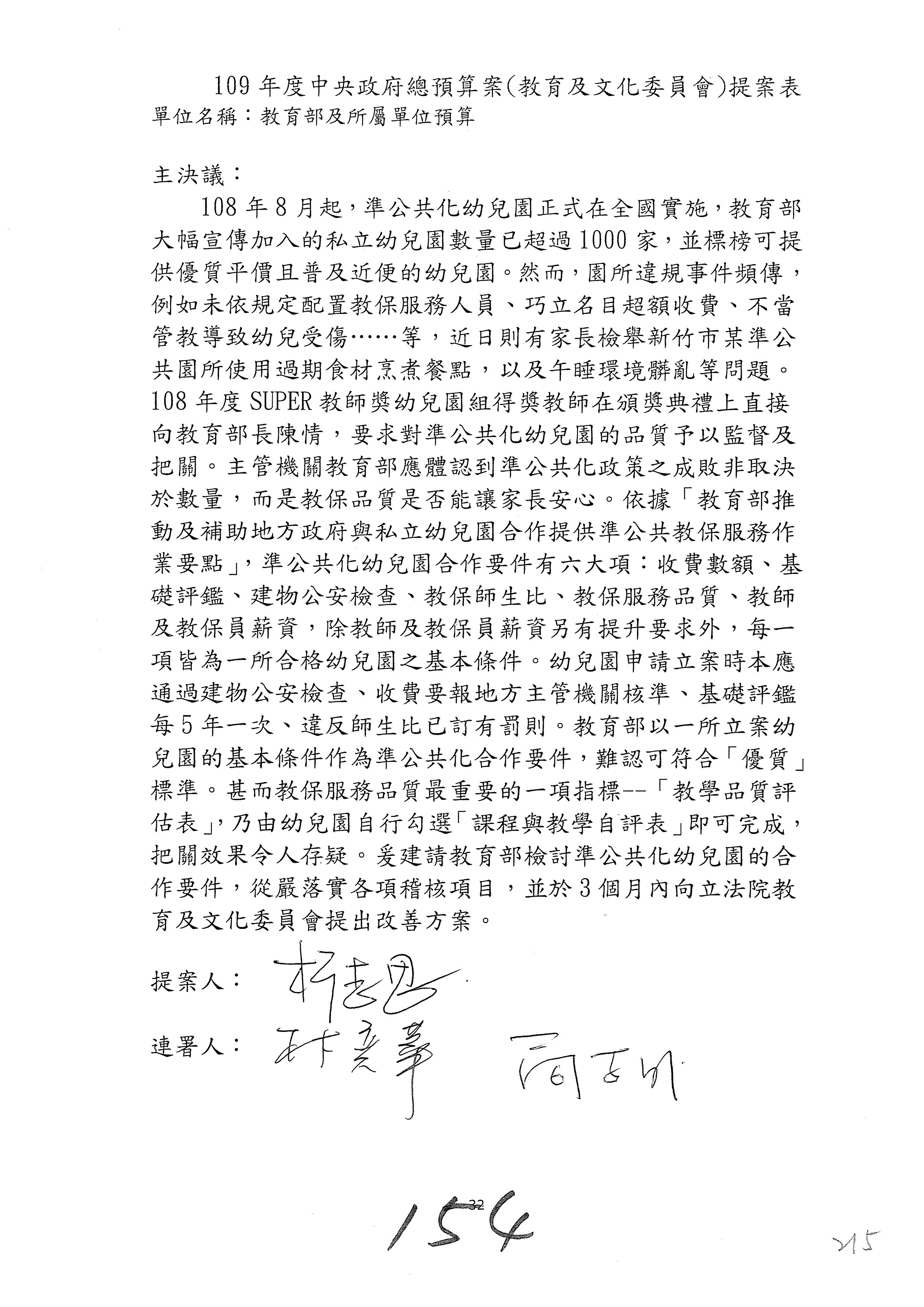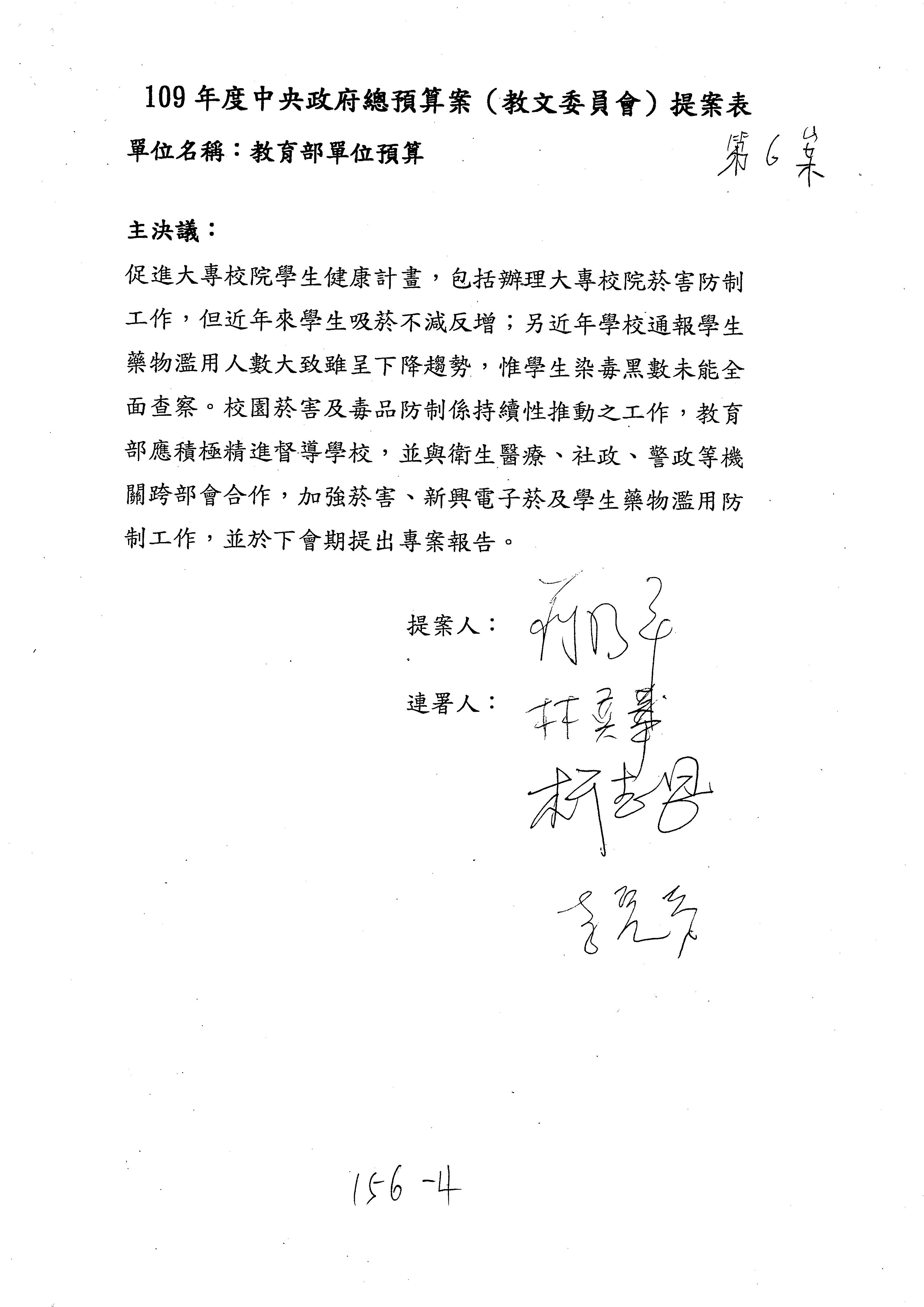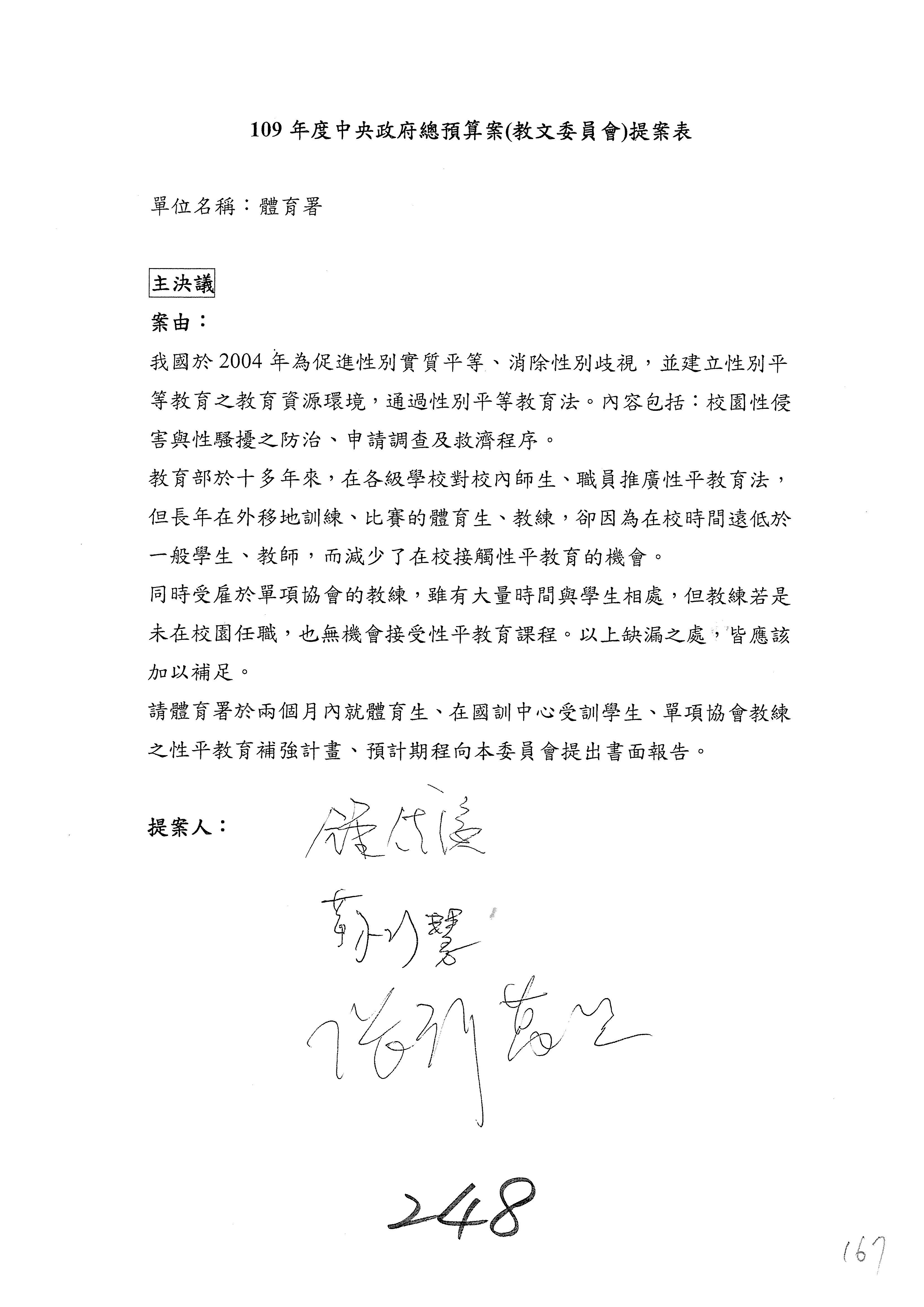 主席:好,最後一句修改為「爰提案要求教育部於三個月內向本院教委會提出書面報告」,修正通過。