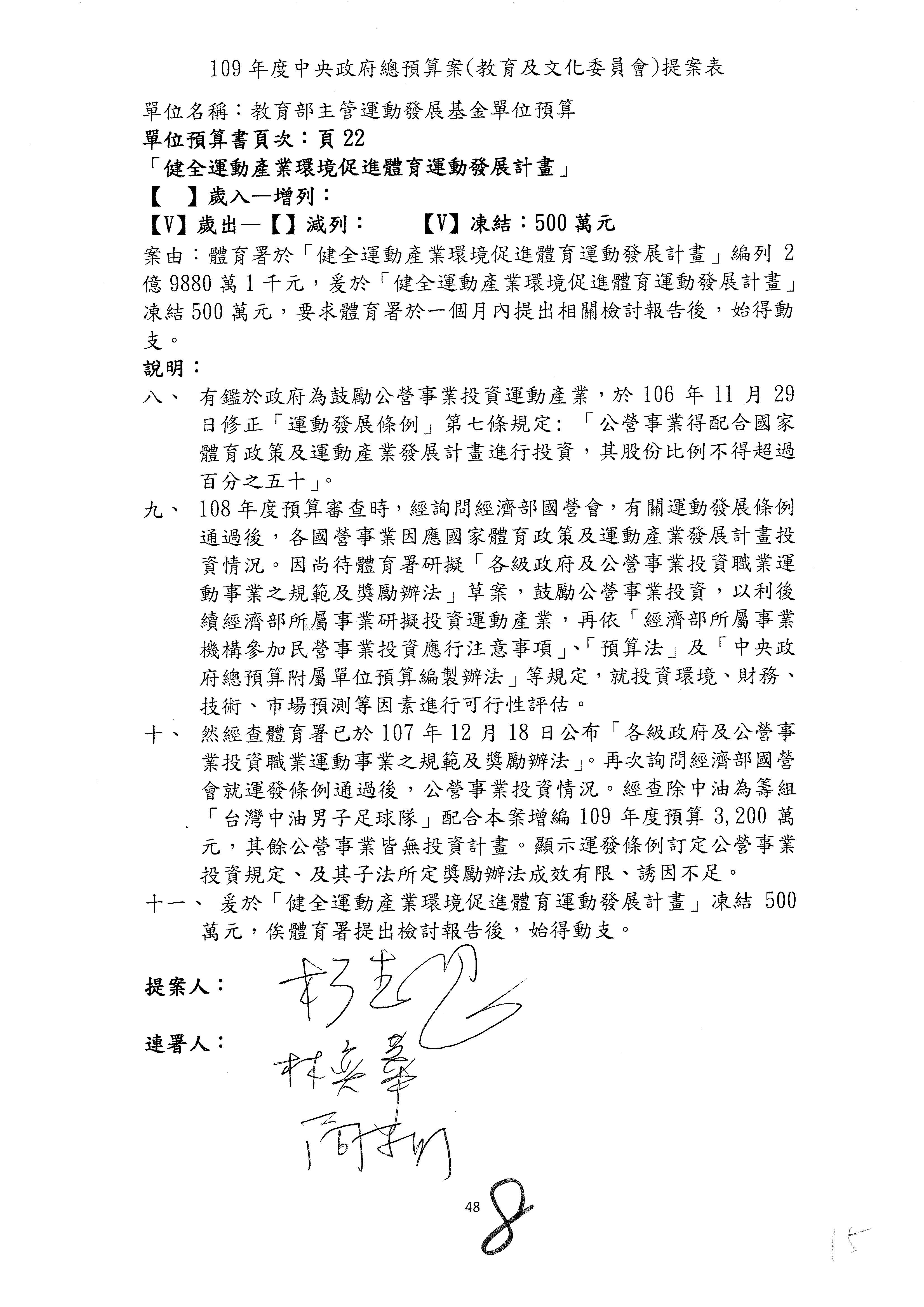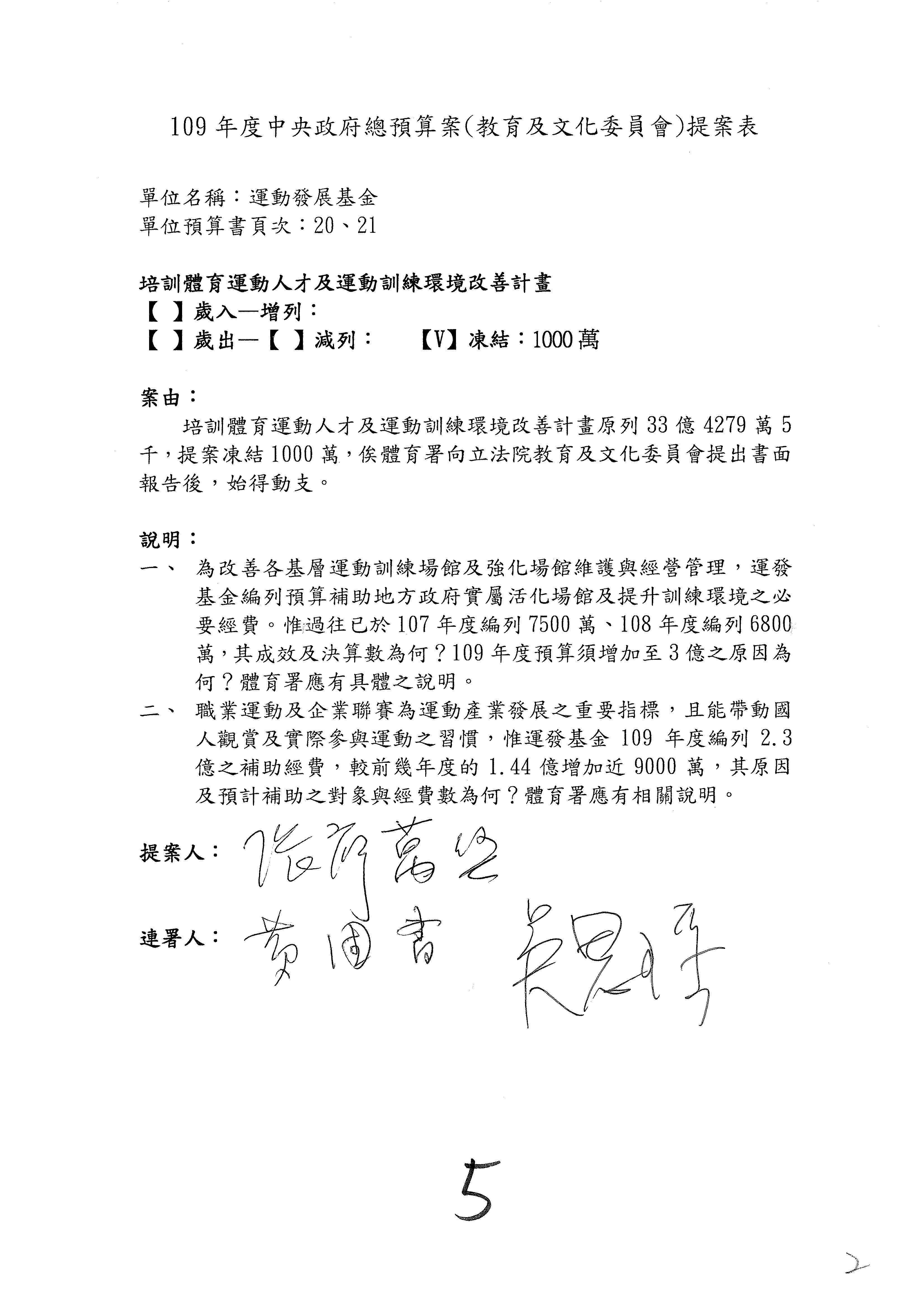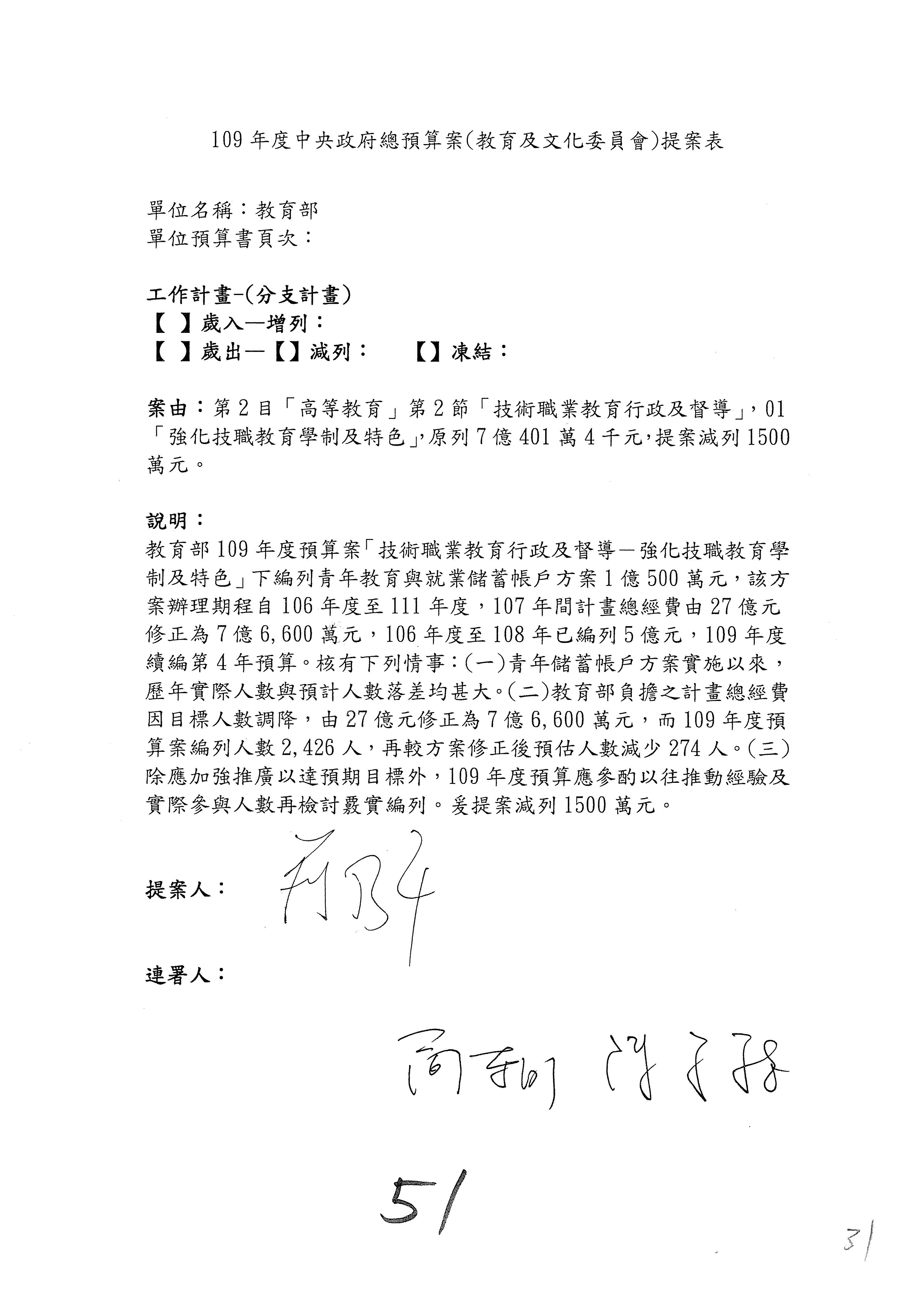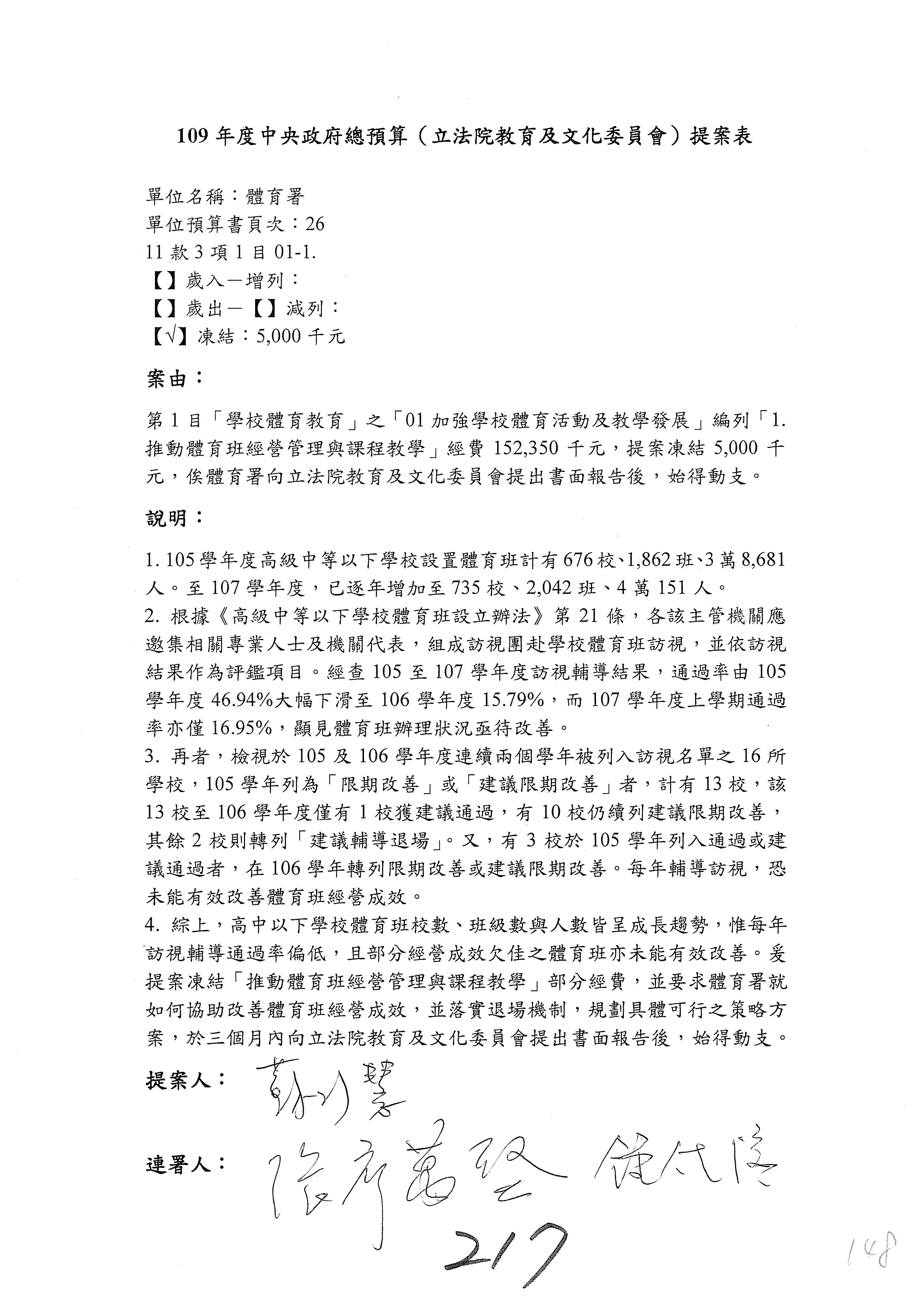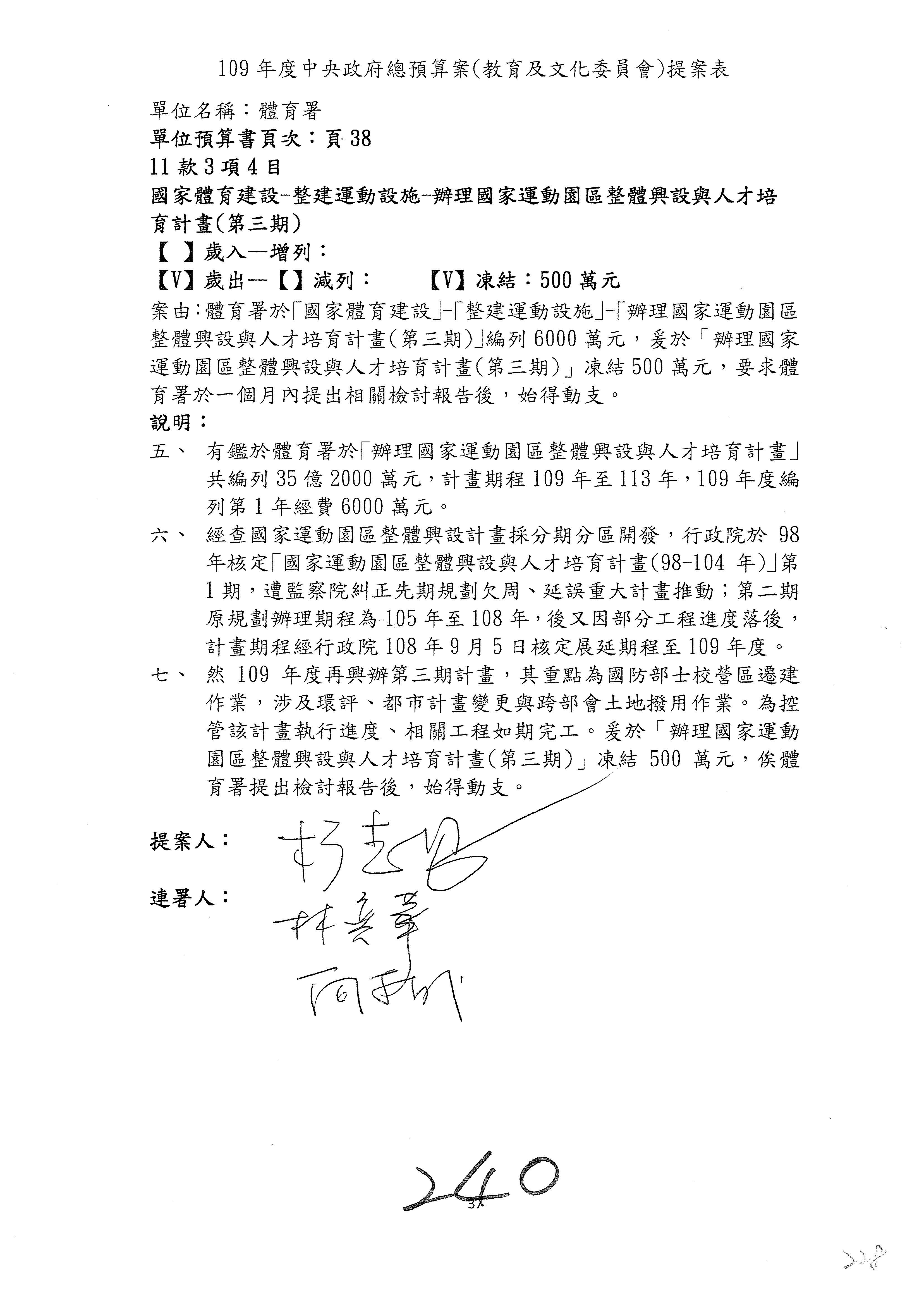 早上原本保留第31案,決議減列500萬元,凍結500萬元,提出書面報告後解凍。