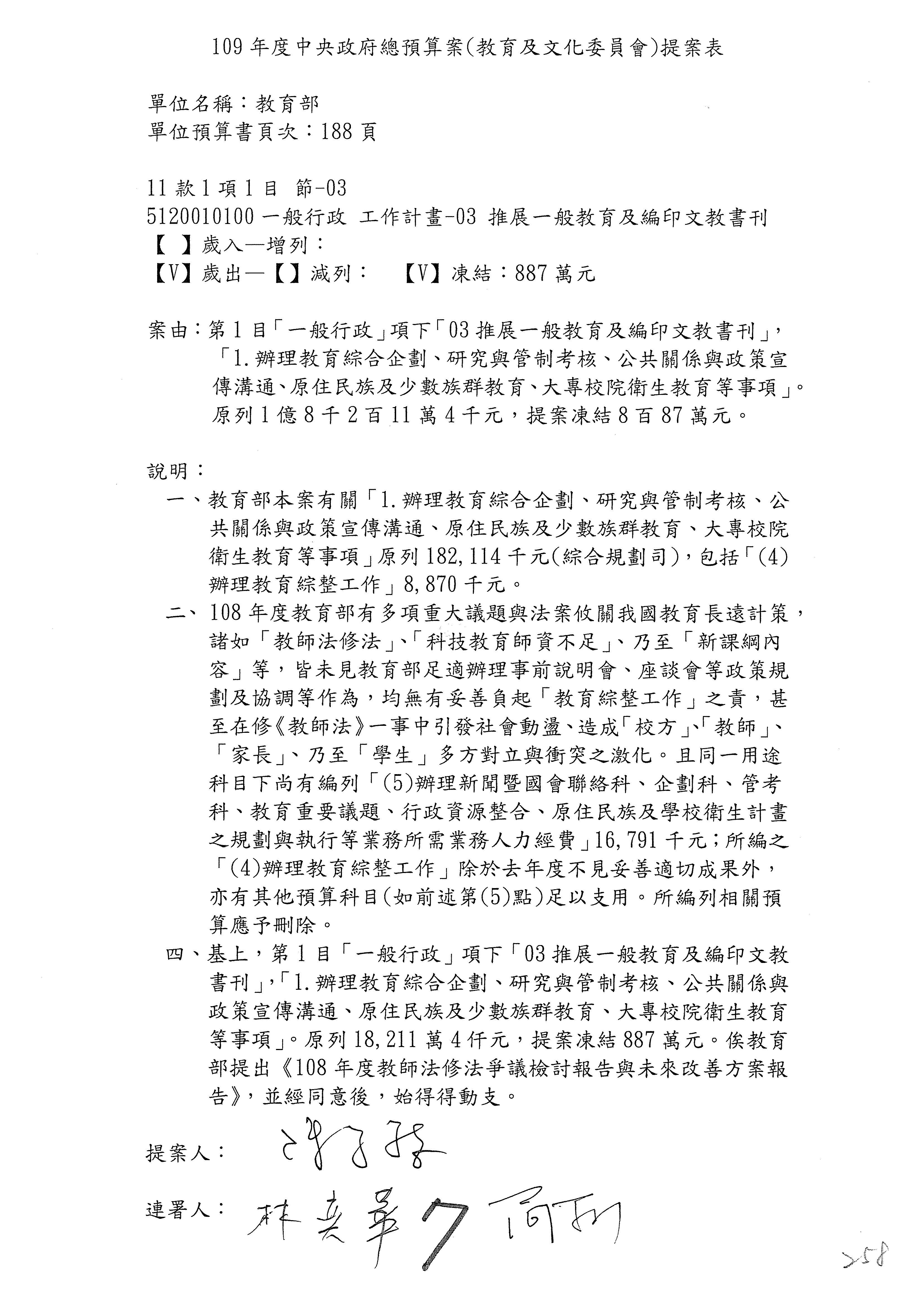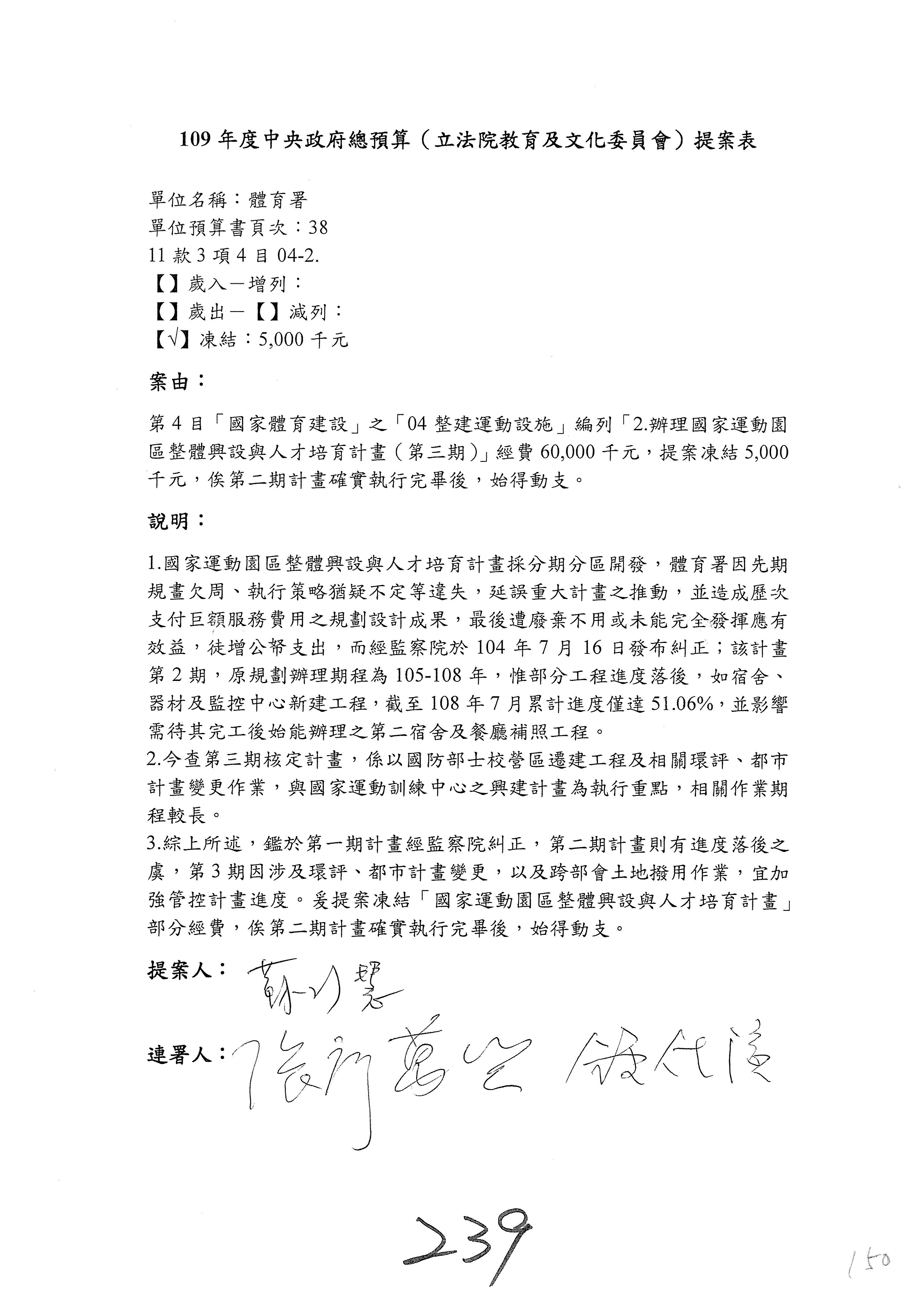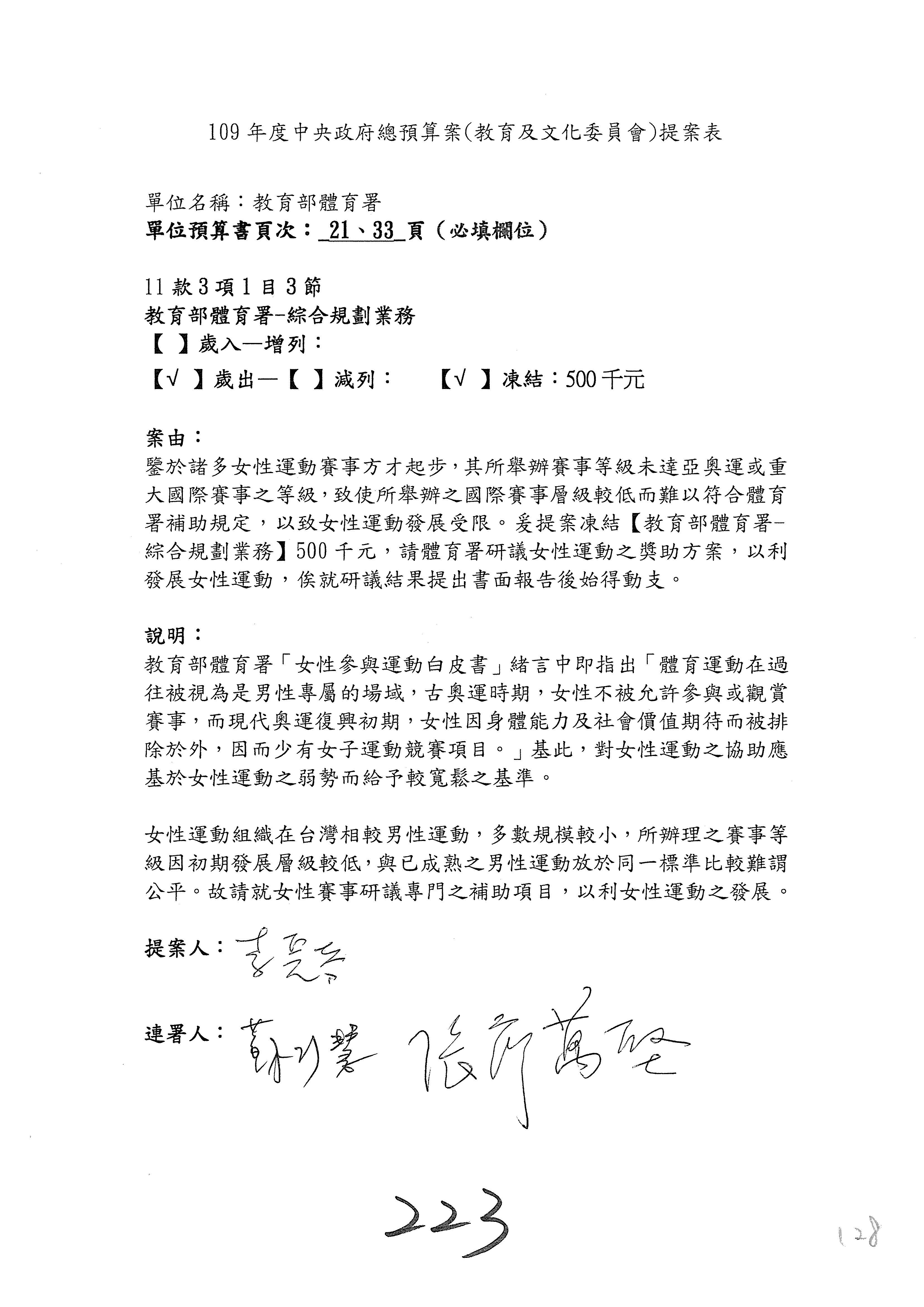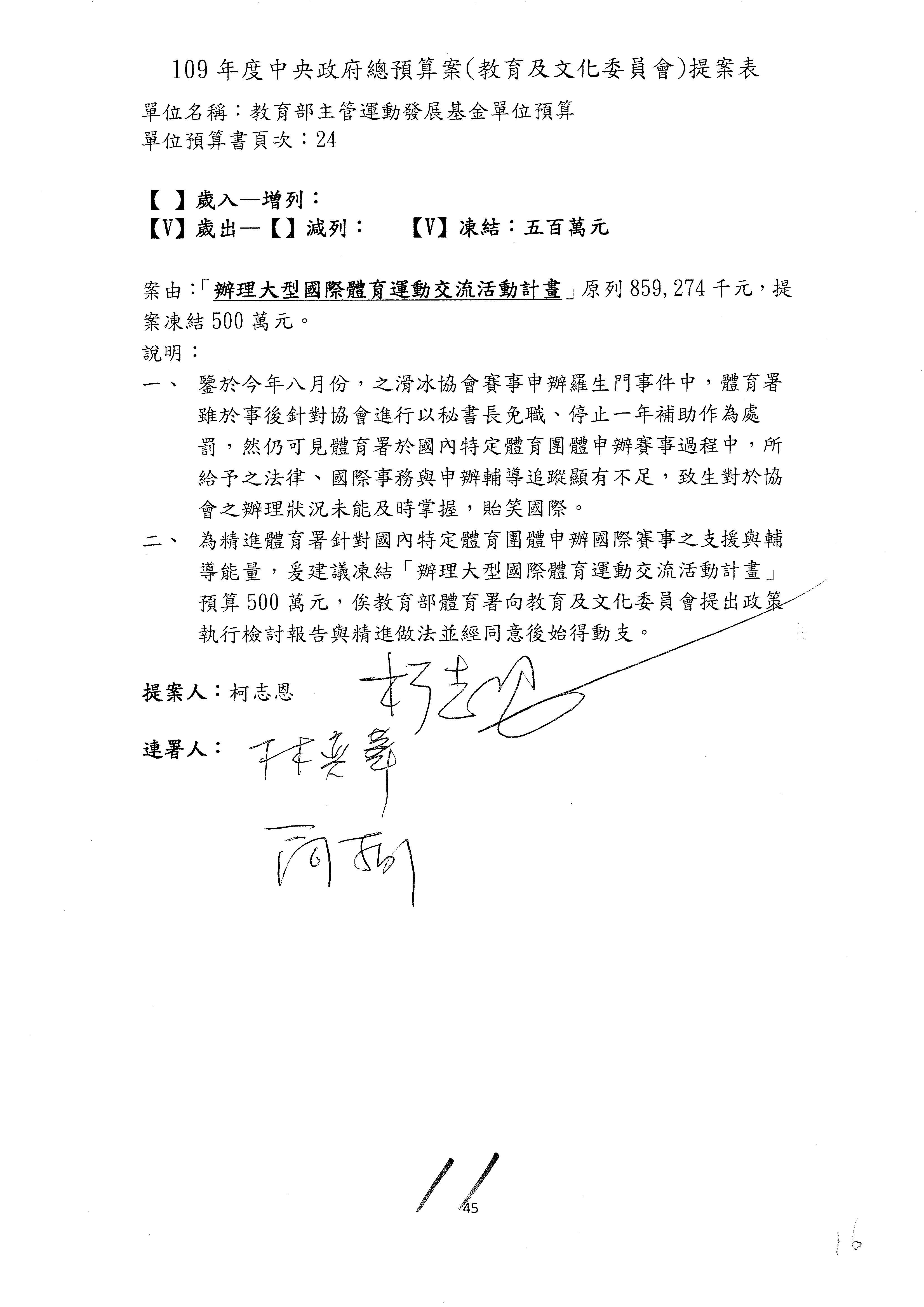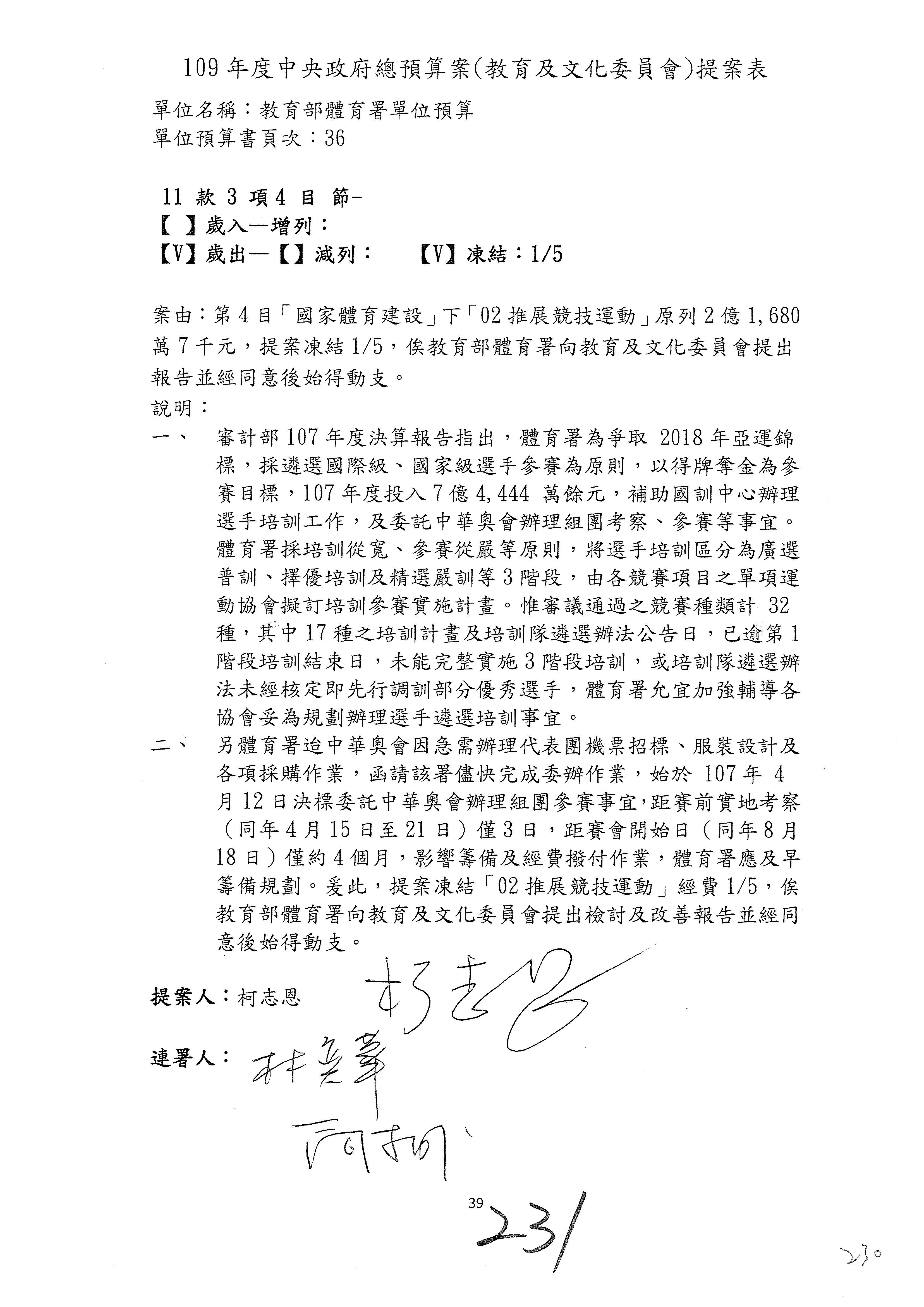早上原本保留第31案,決議減列500萬元,凍結500萬元,提出書面報告後解凍。