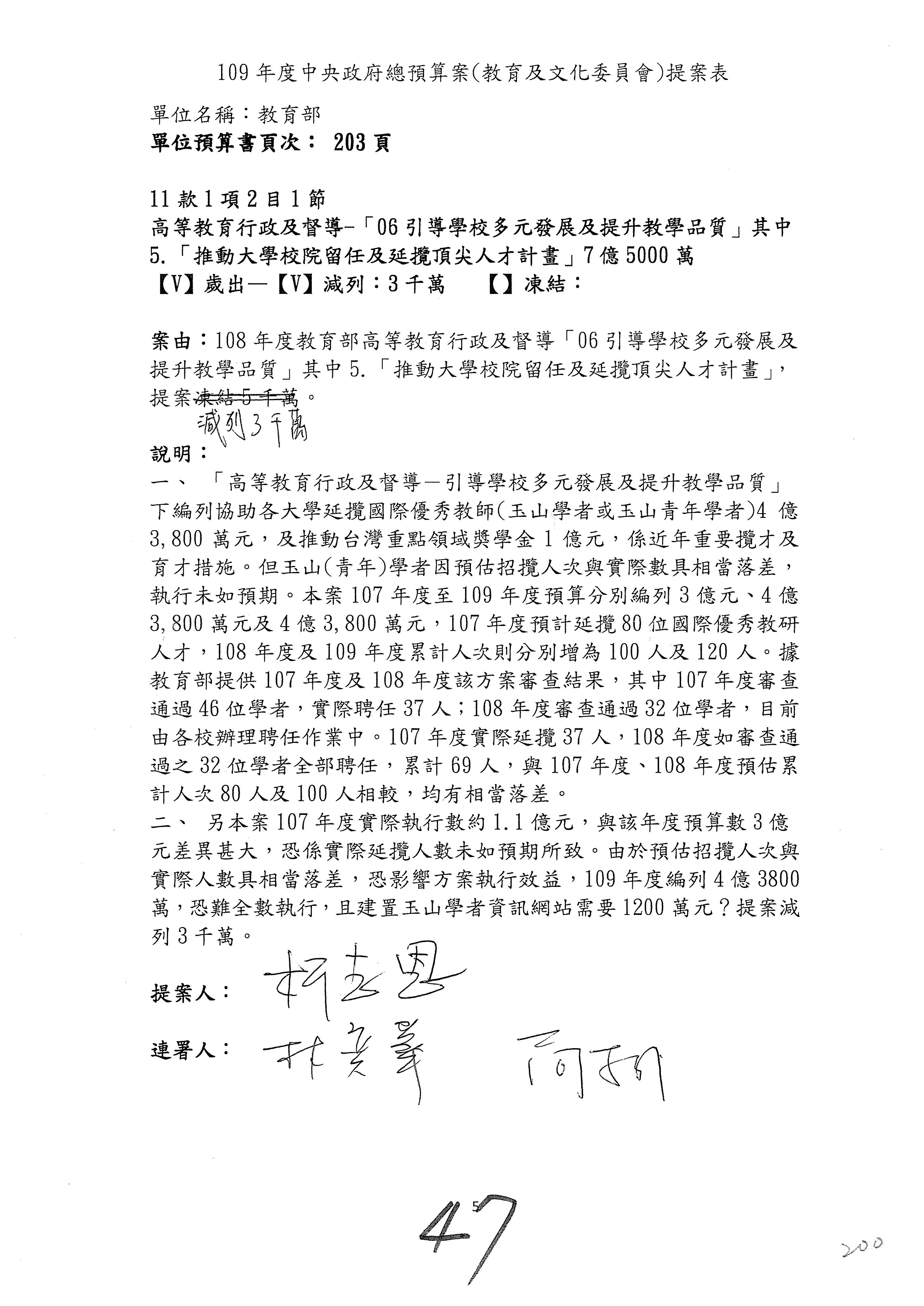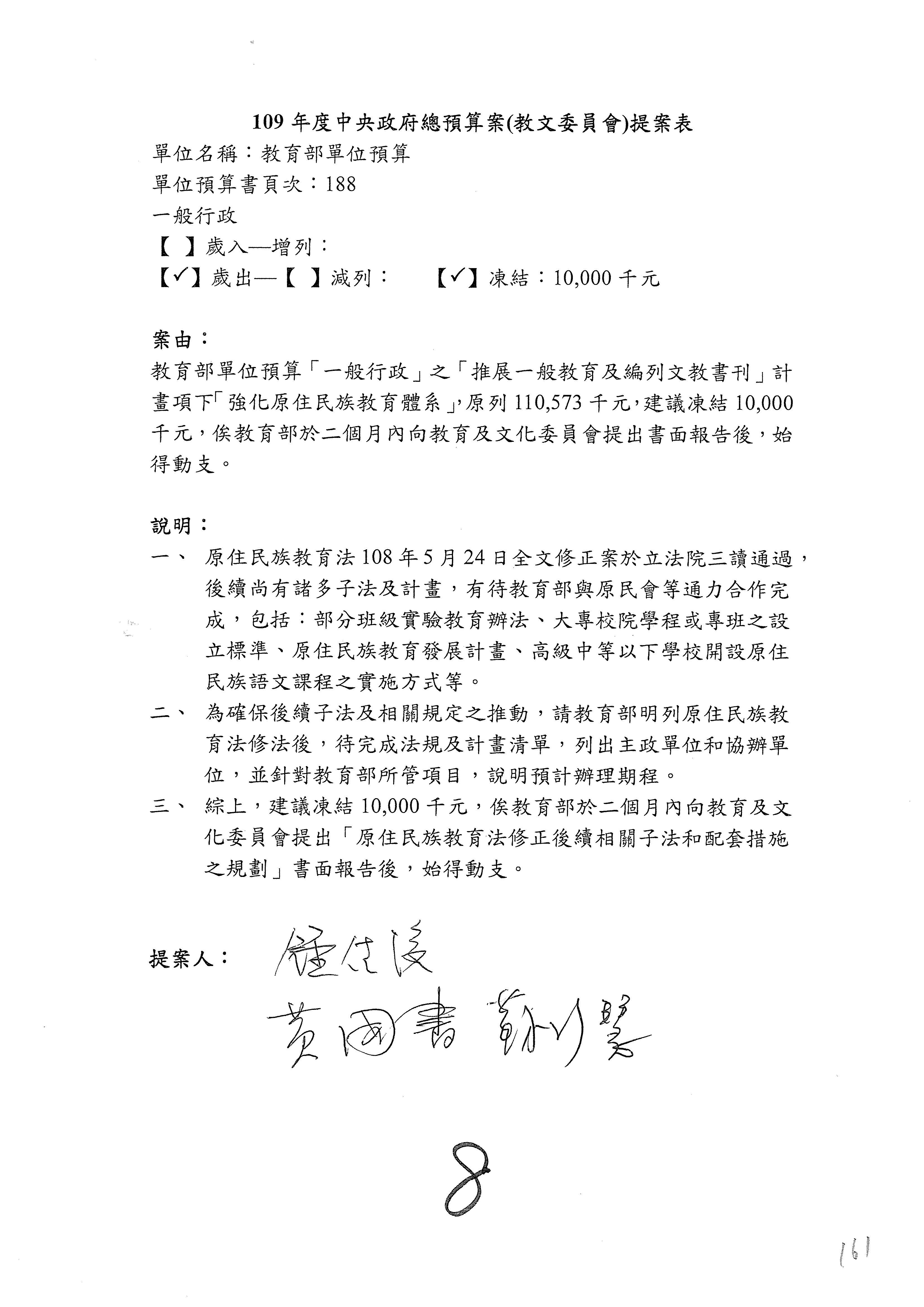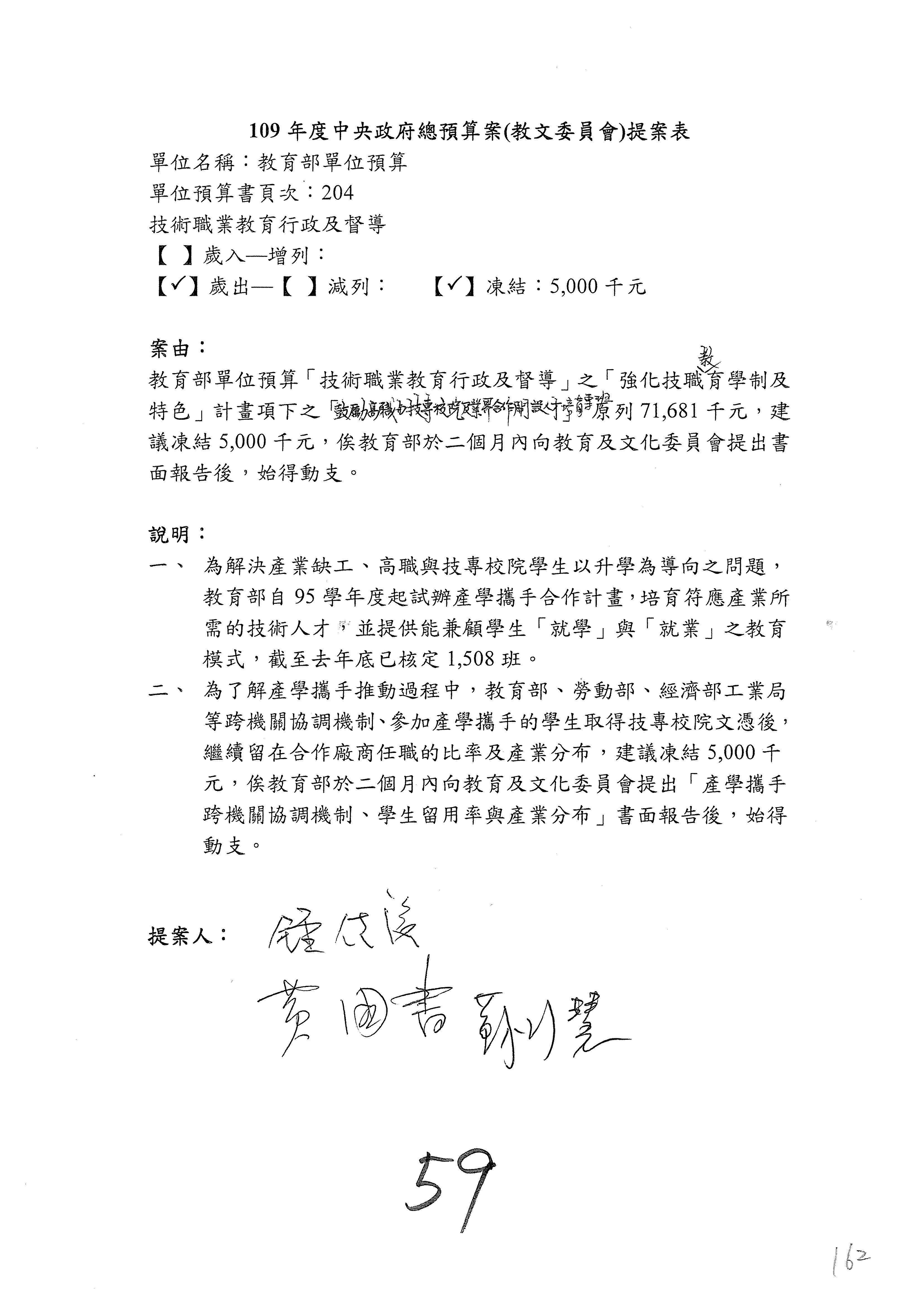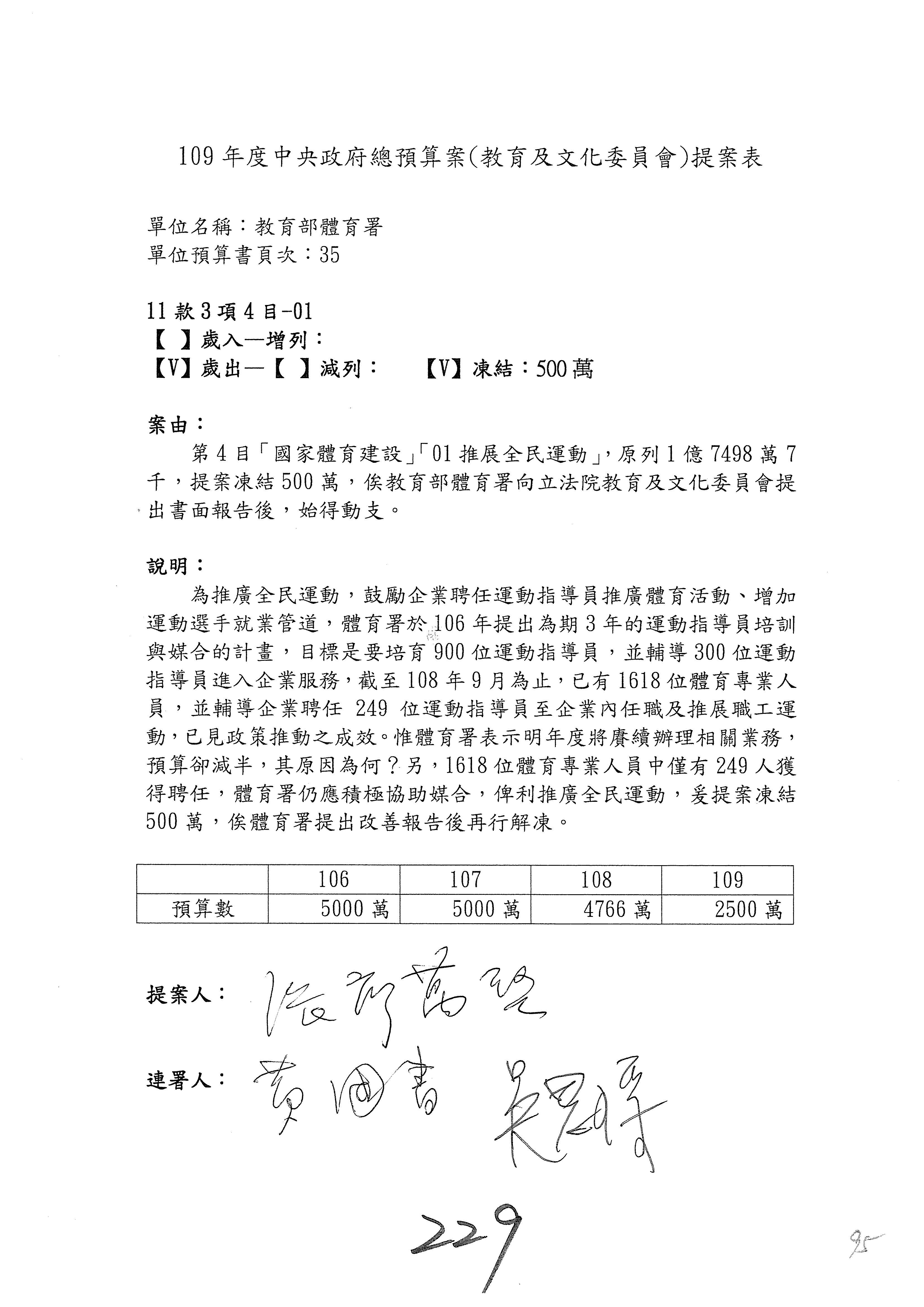 早上原本保留第31案,決議減列500萬元,凍結500萬元,提出書面報告後解凍。
