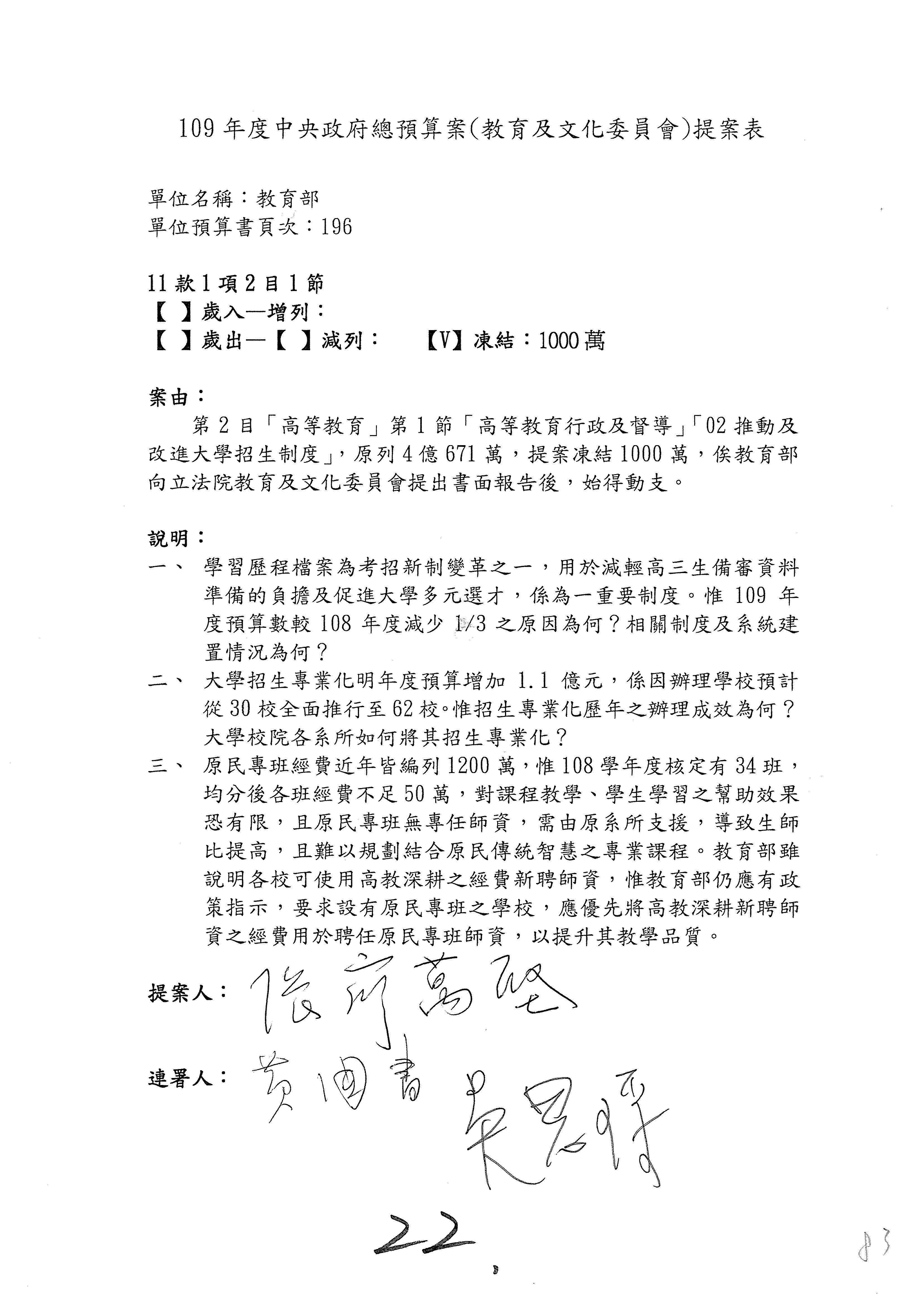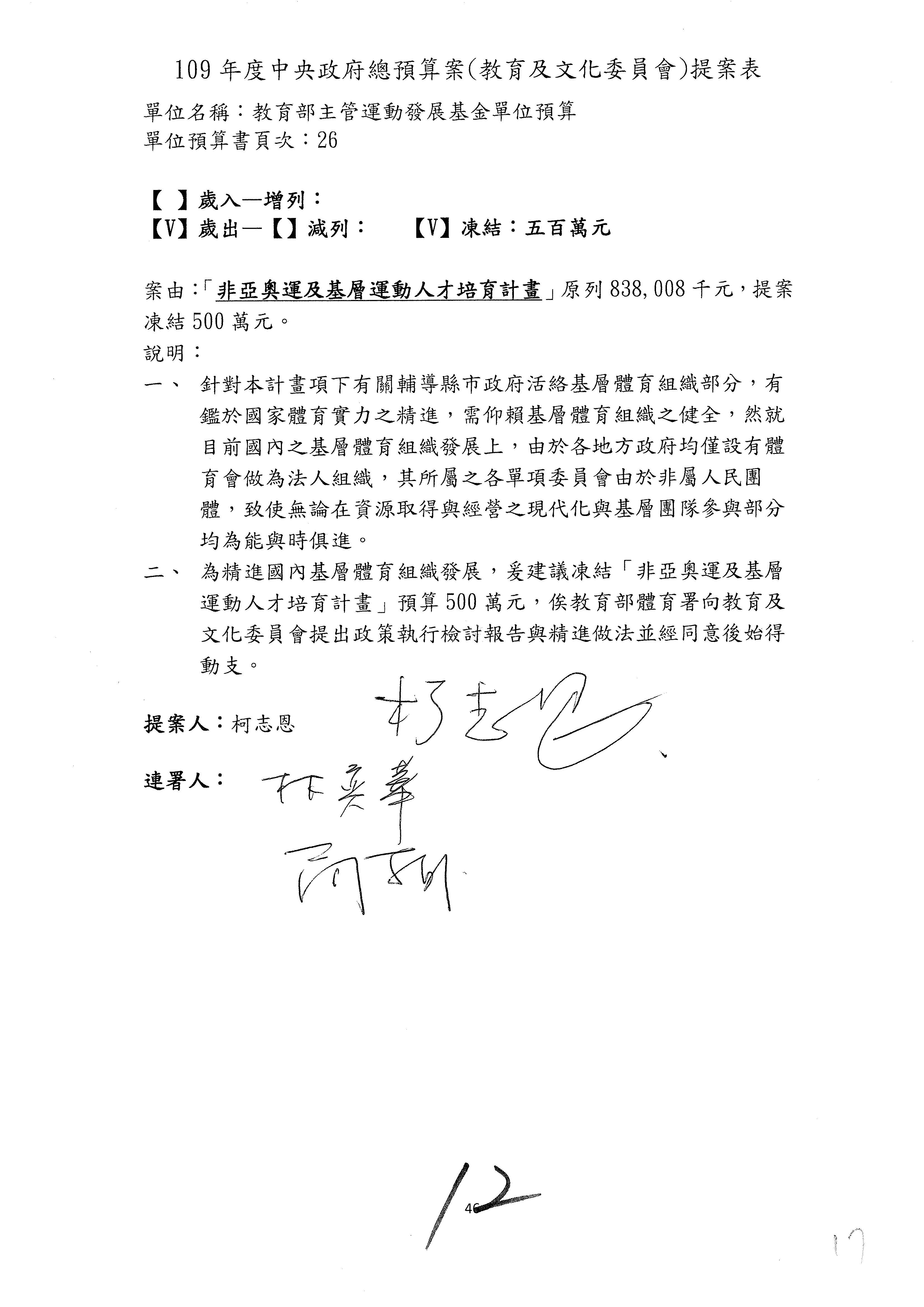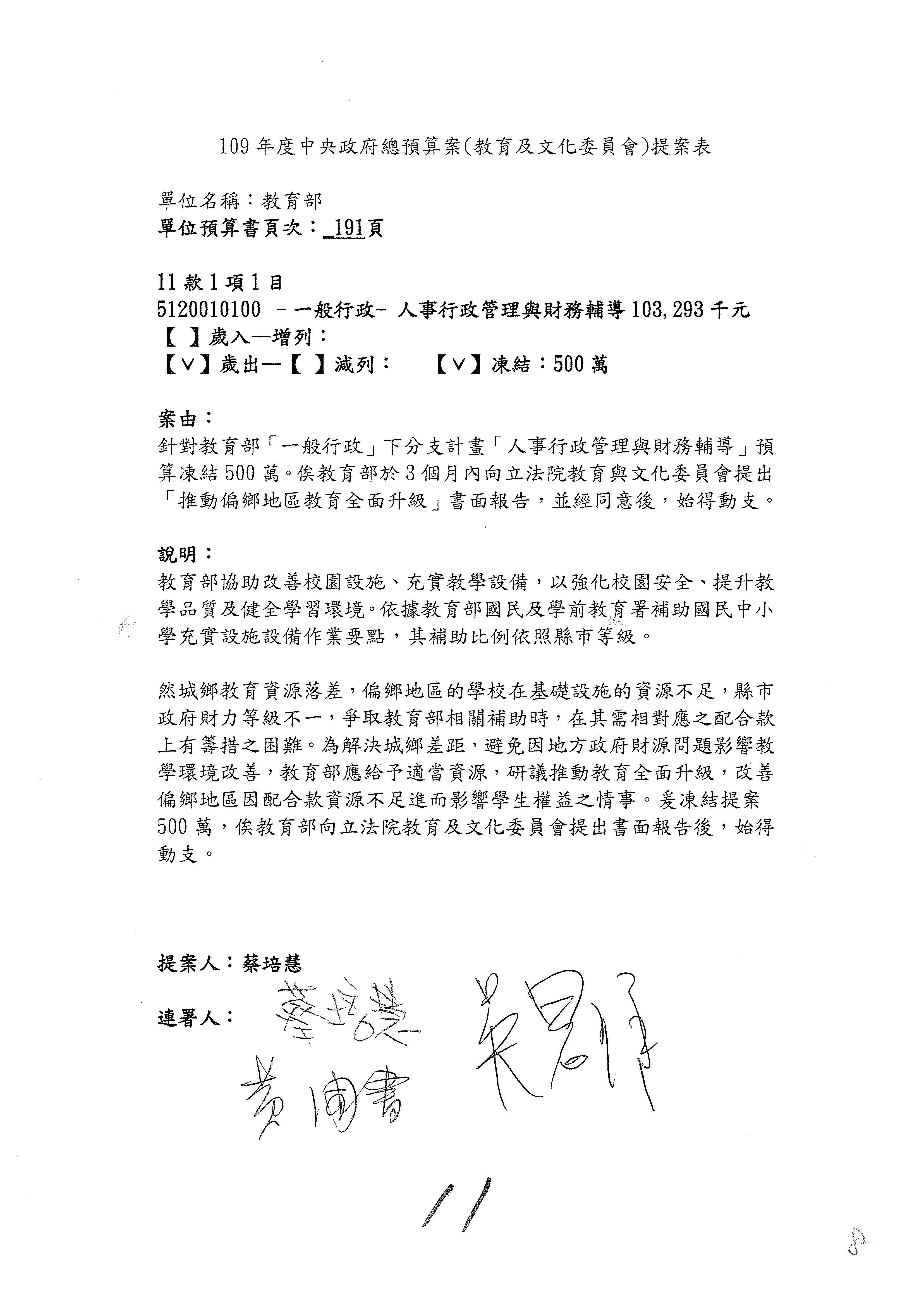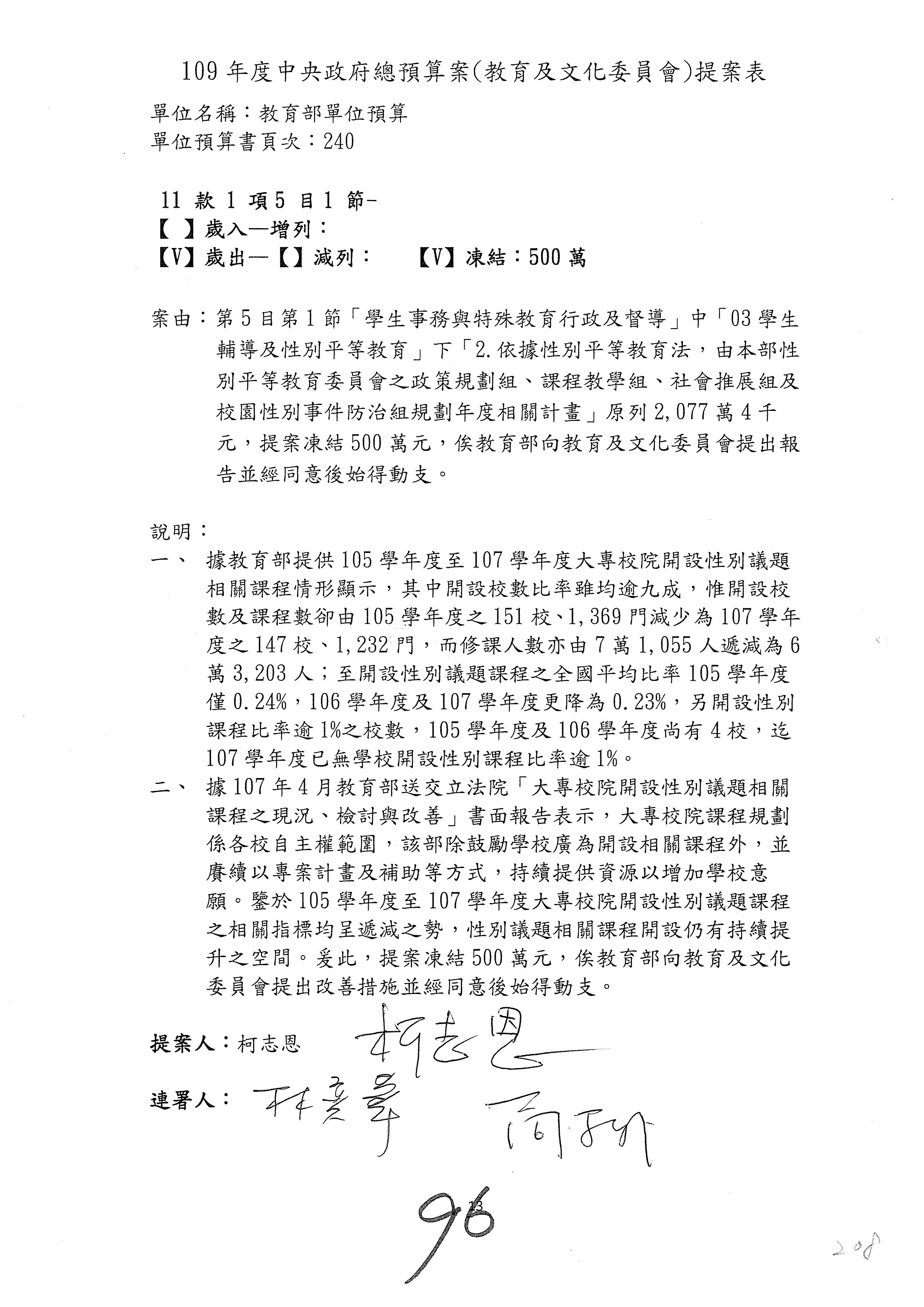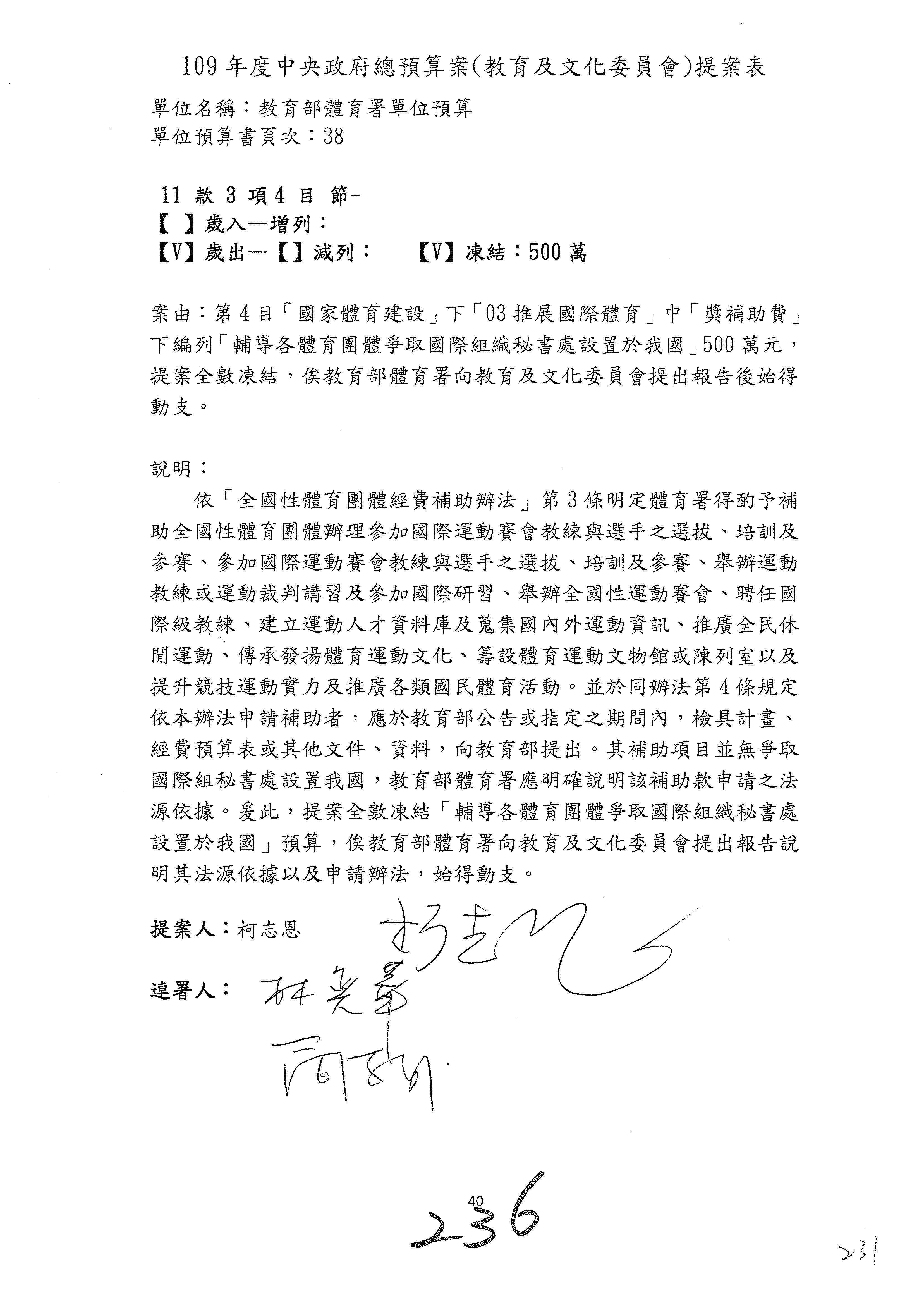 早上原本保留第31案,決議減列500萬元,凍結500萬元,提出書面報告後解凍。