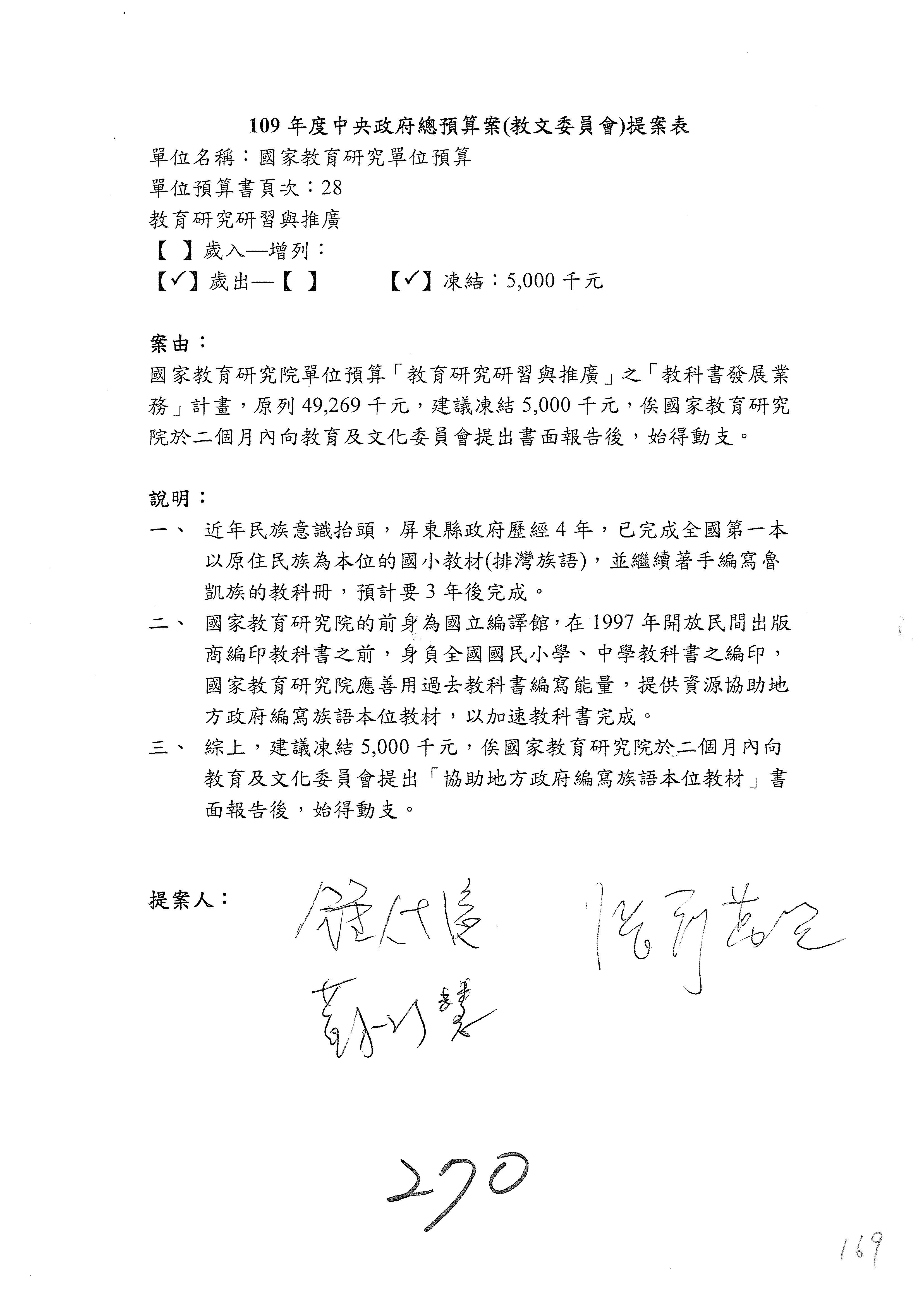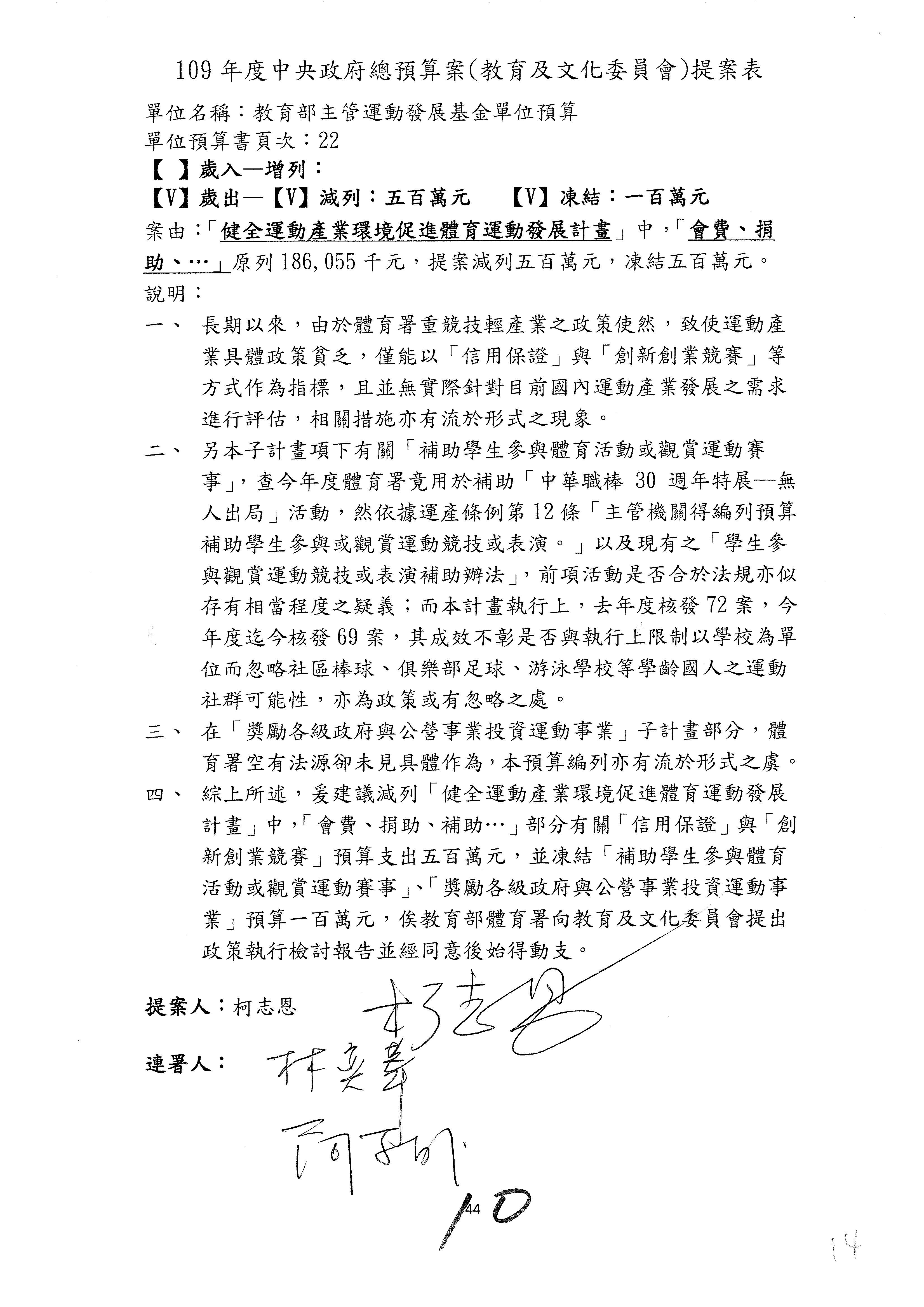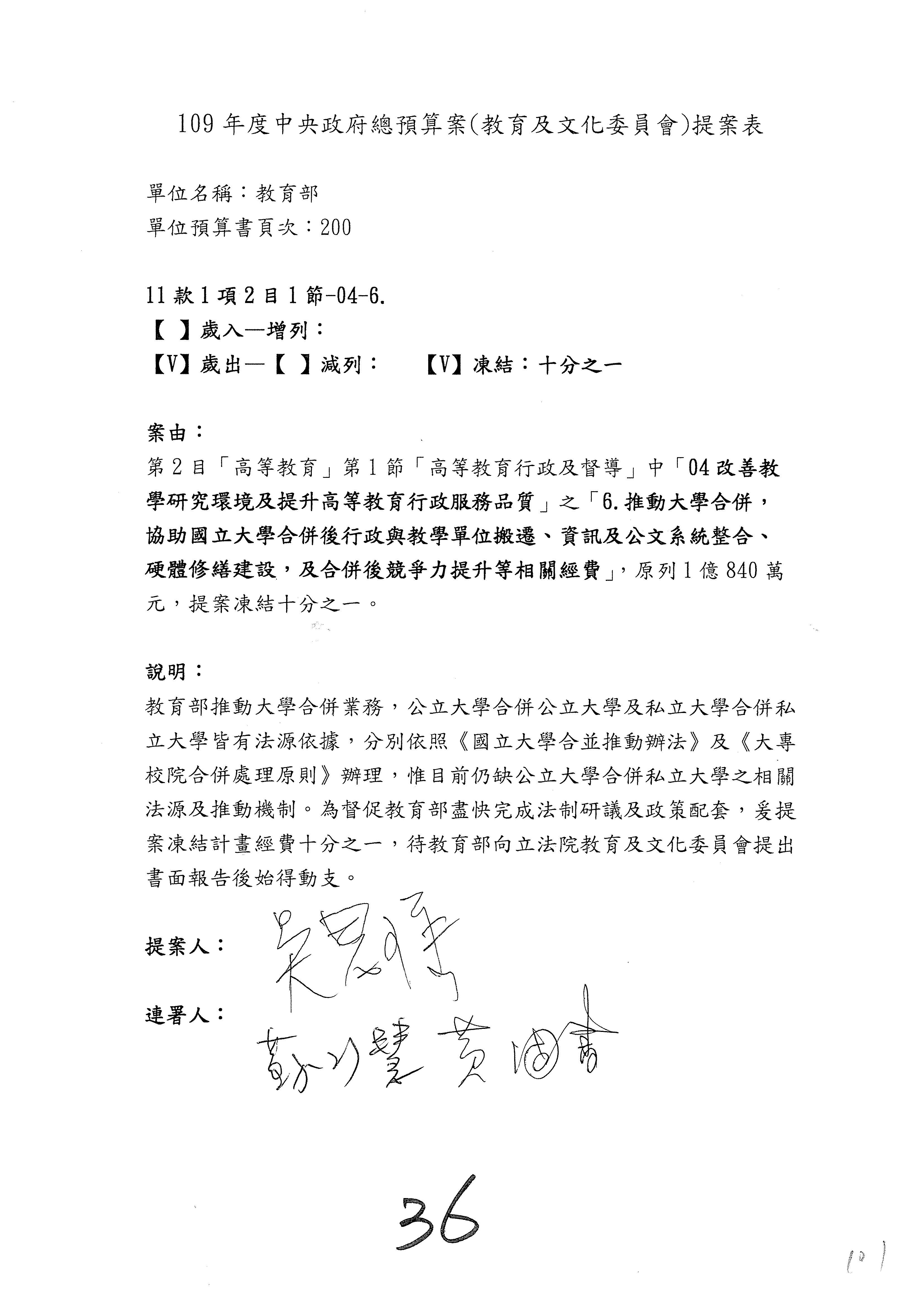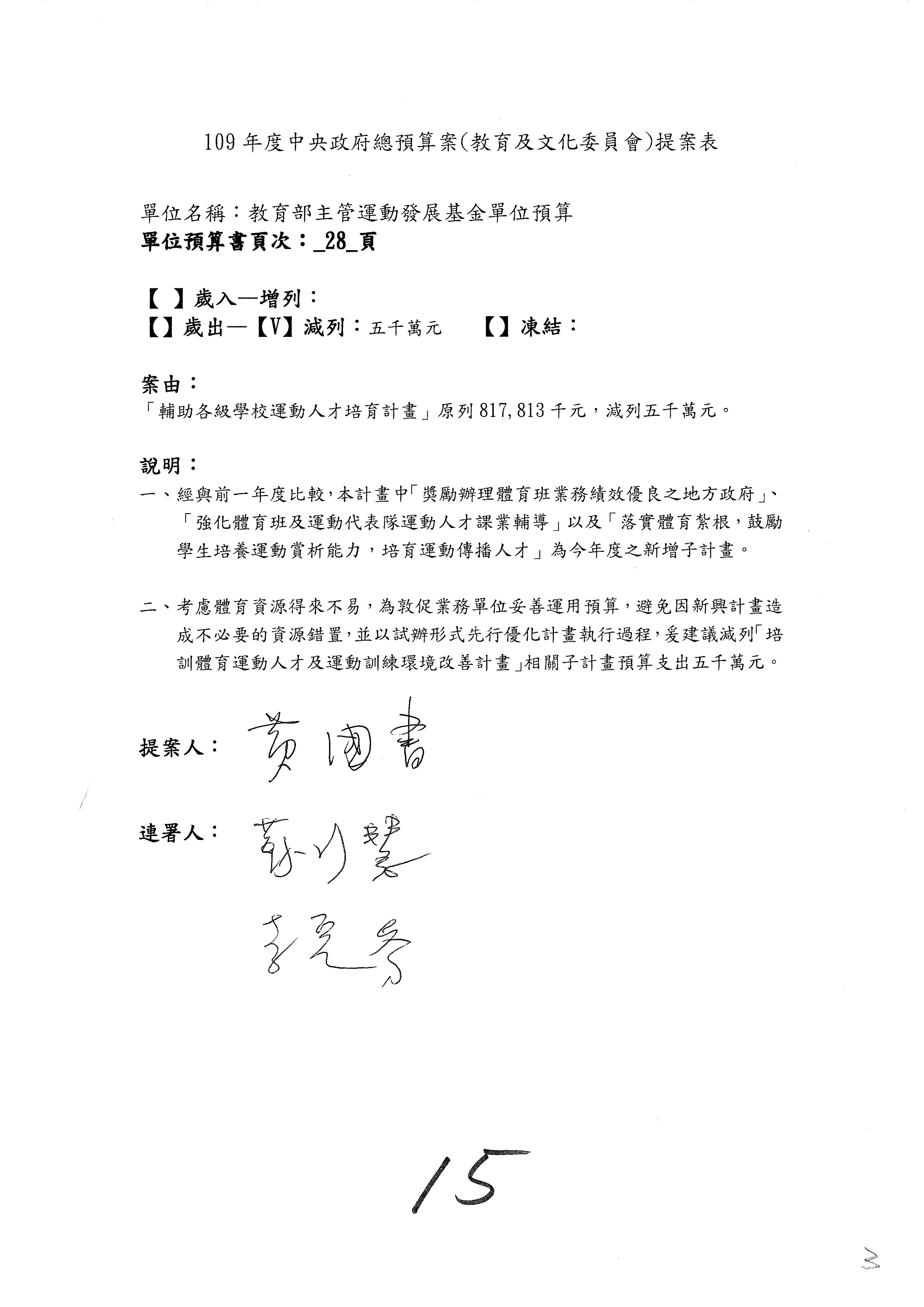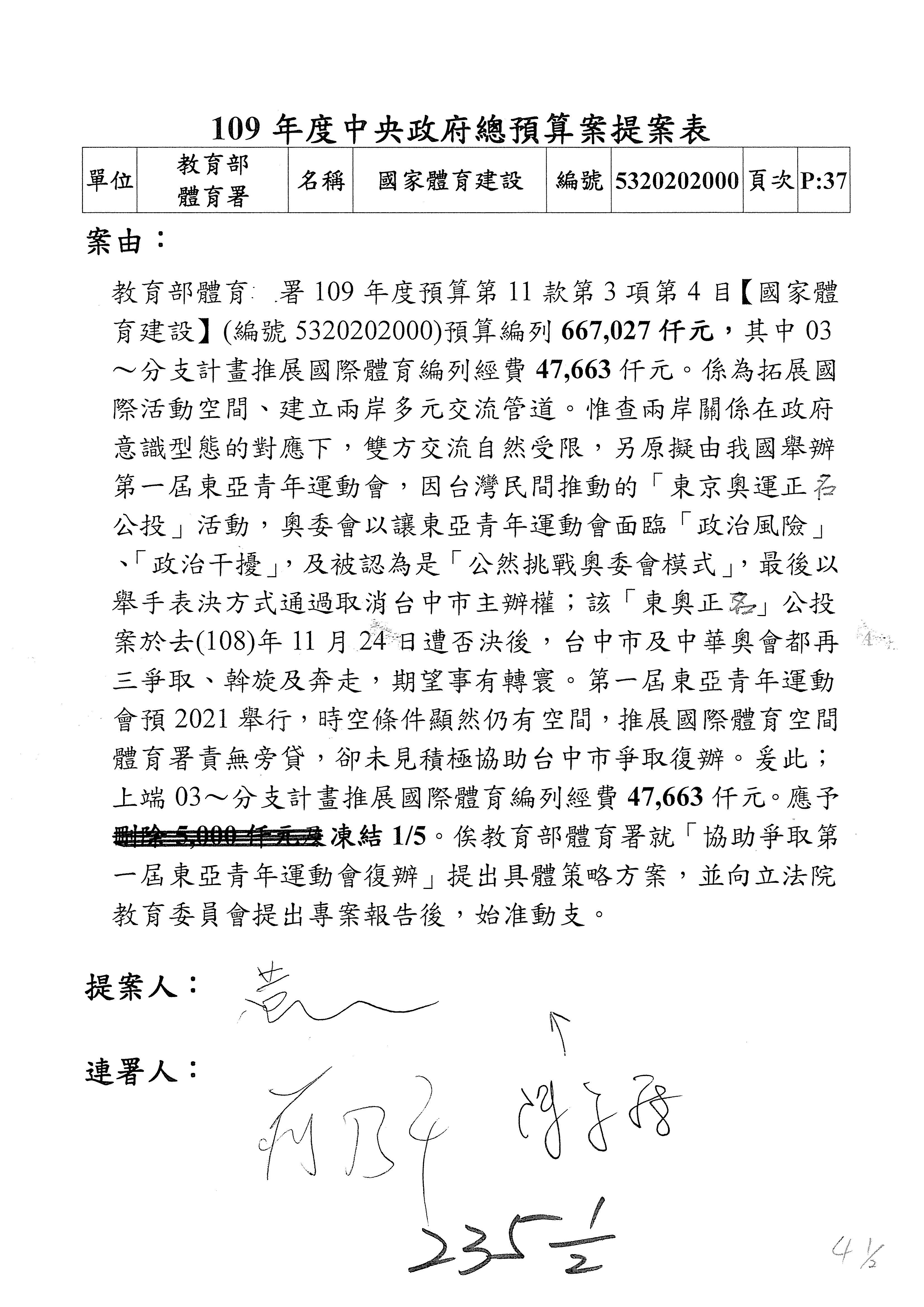 早上原本保留第31案,決議減列500萬元,凍結500萬元,提出書面報告後解凍。